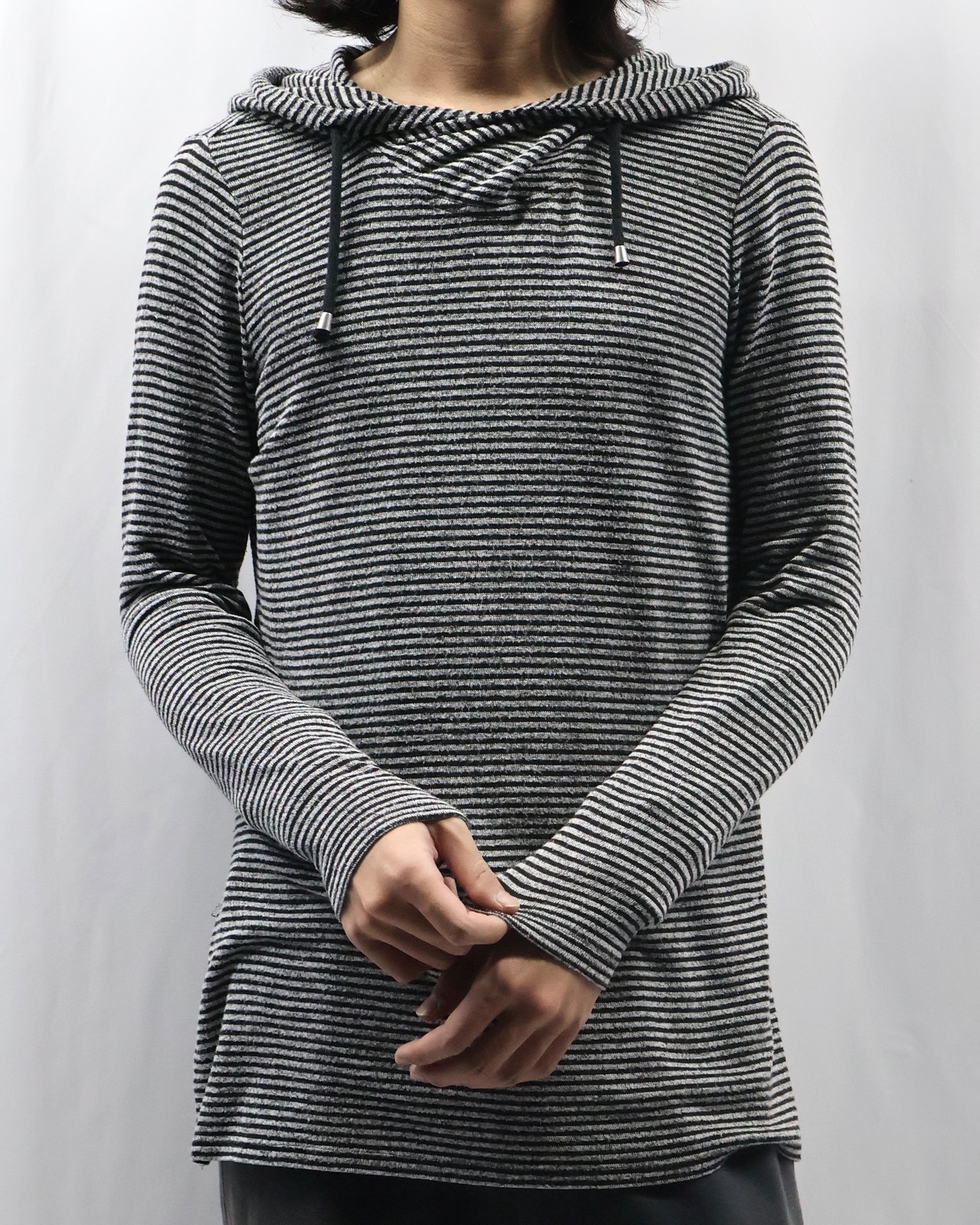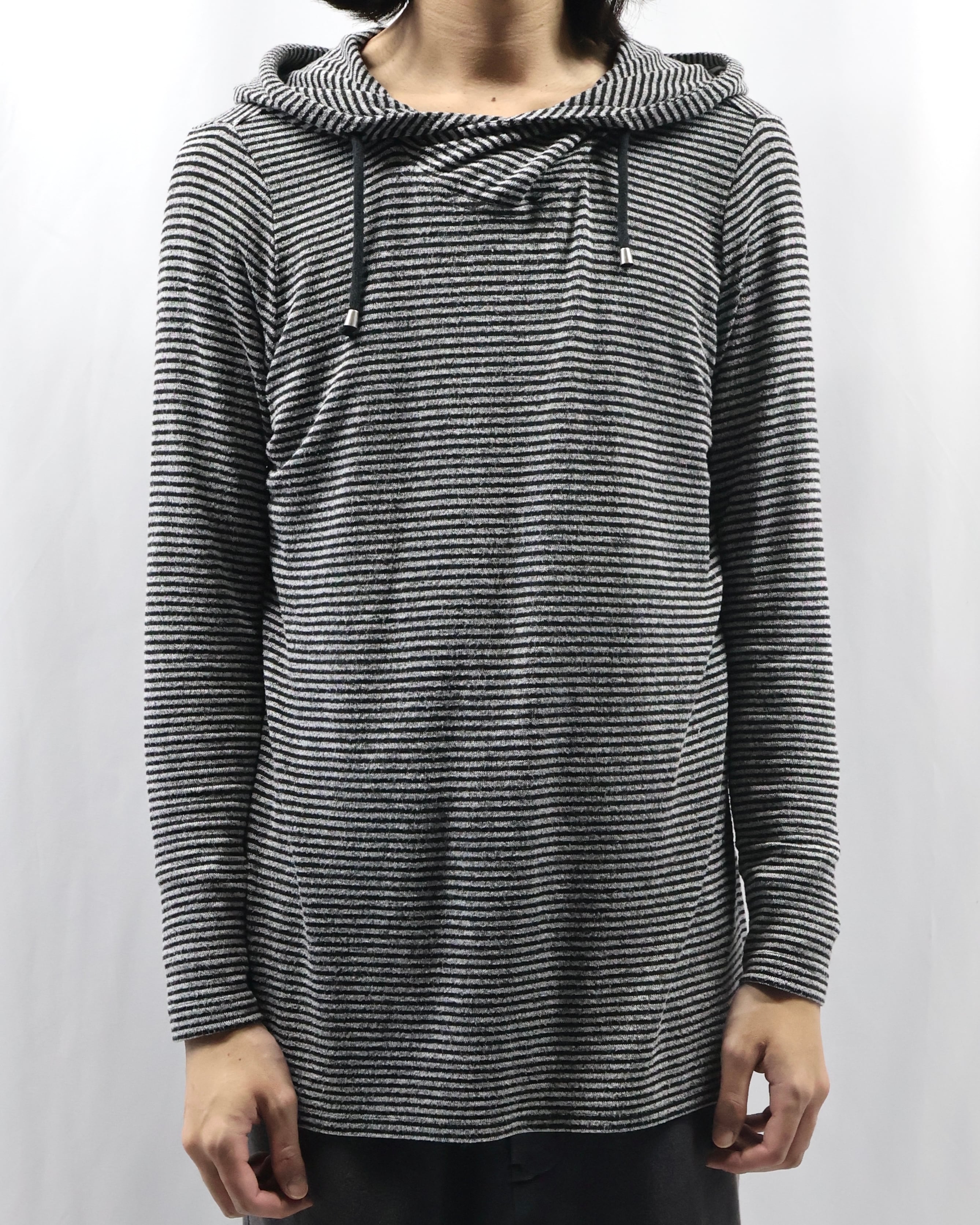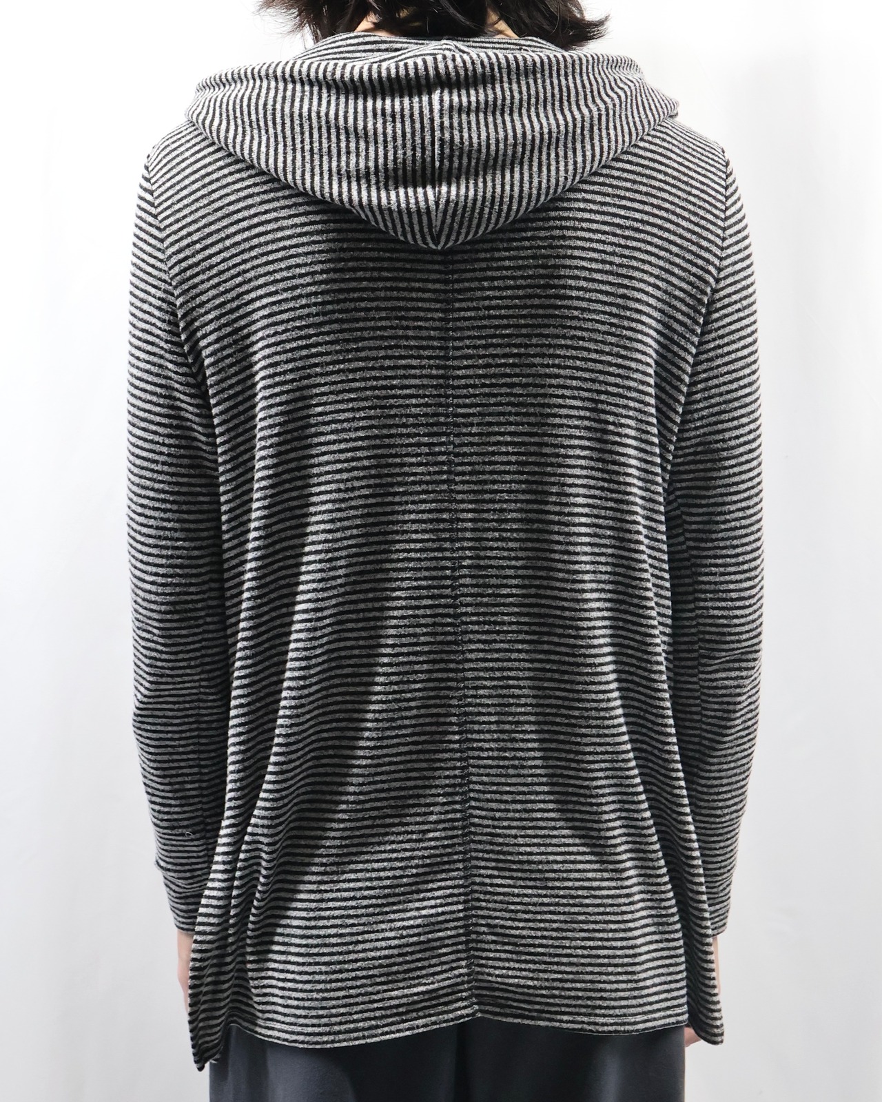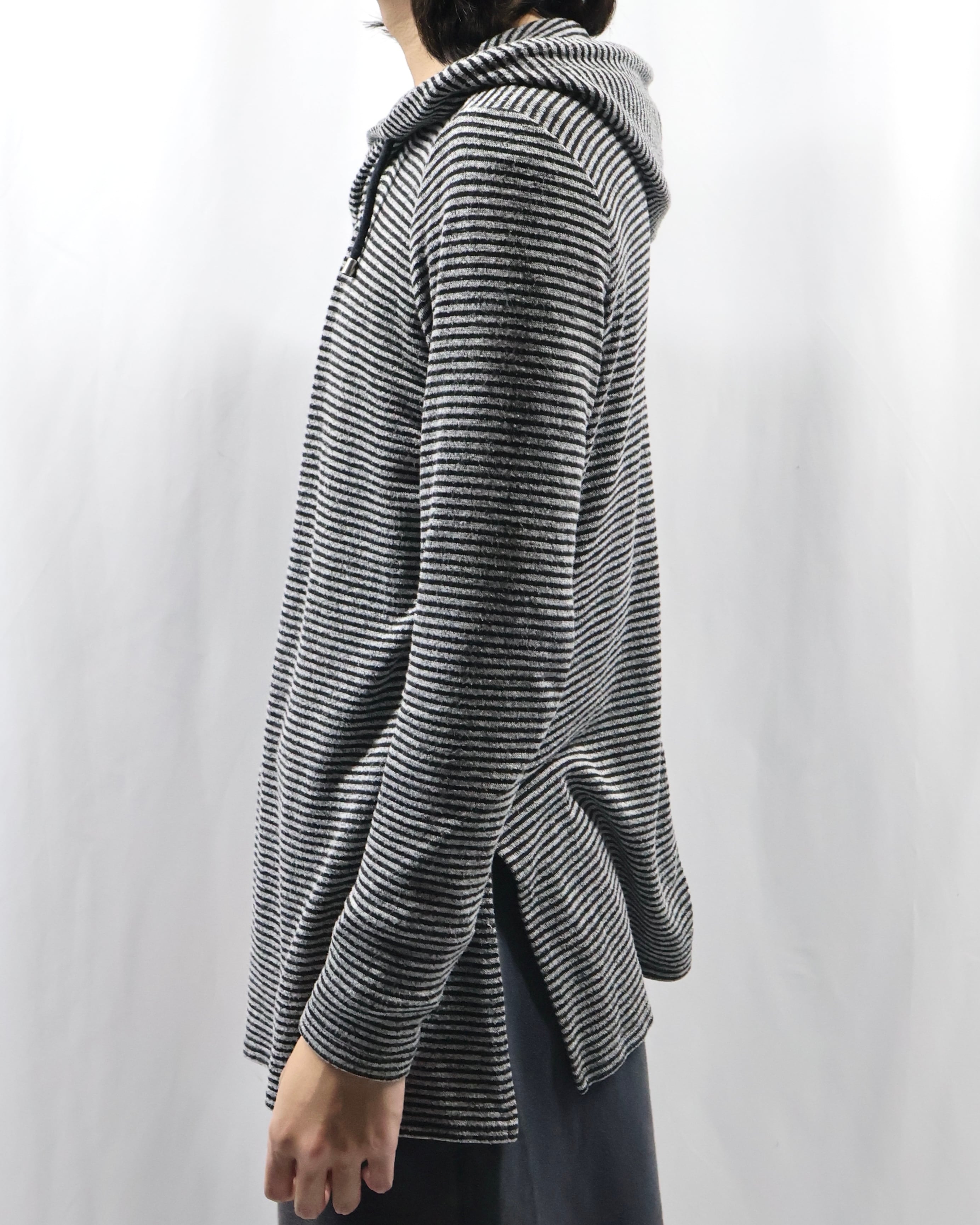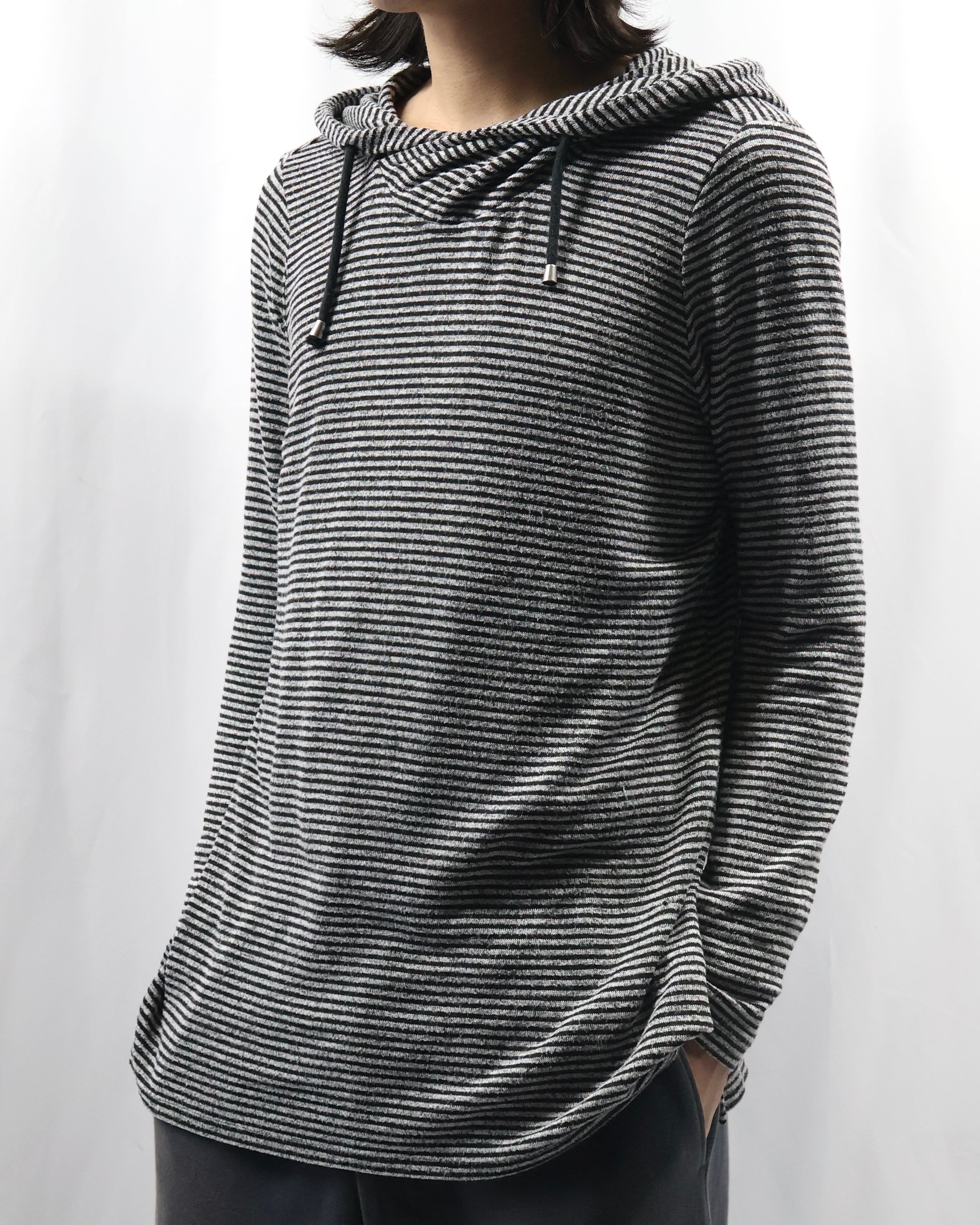 細かなボーダーパターンとライトウェイトな生地感が特徴のニットフーディ