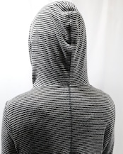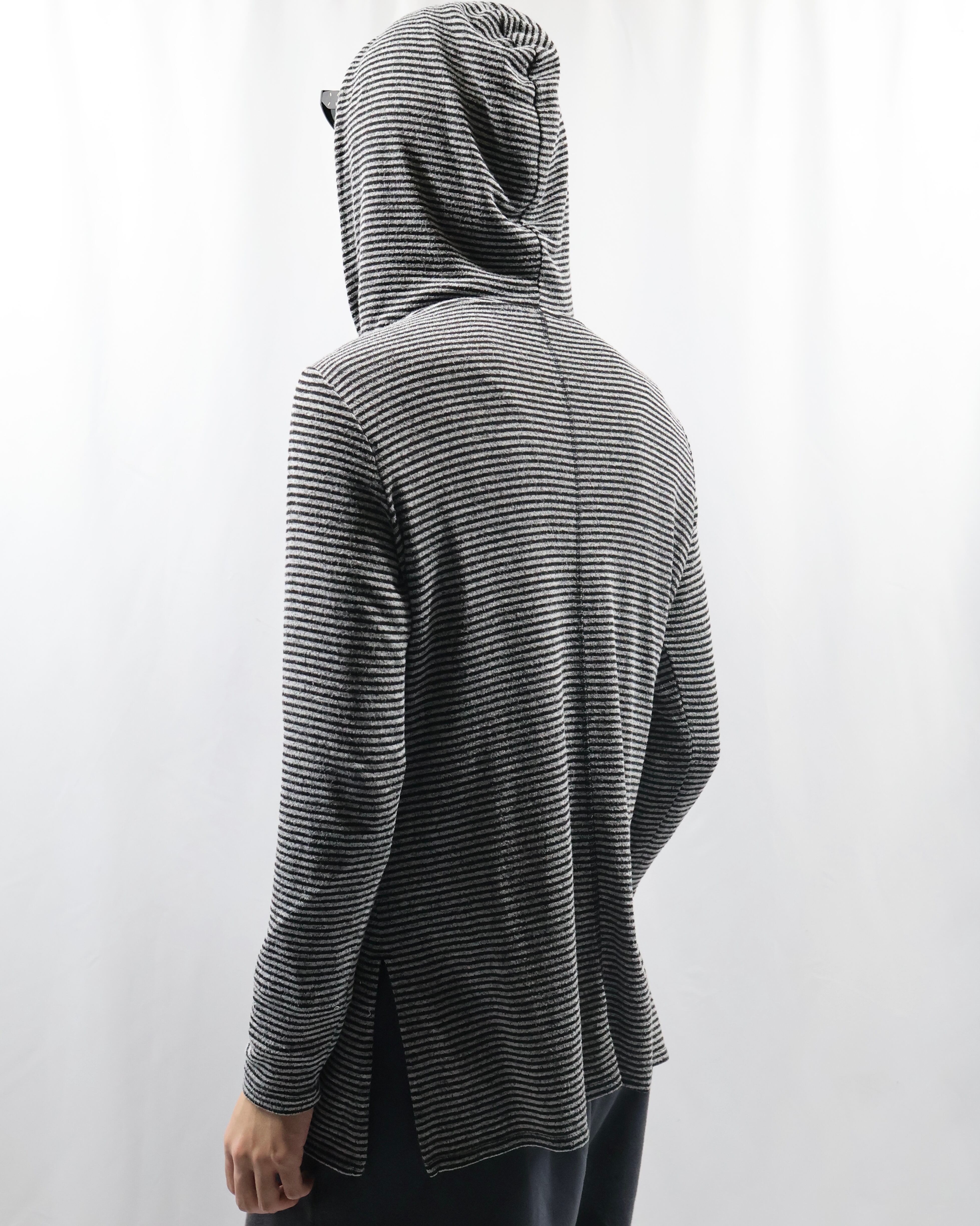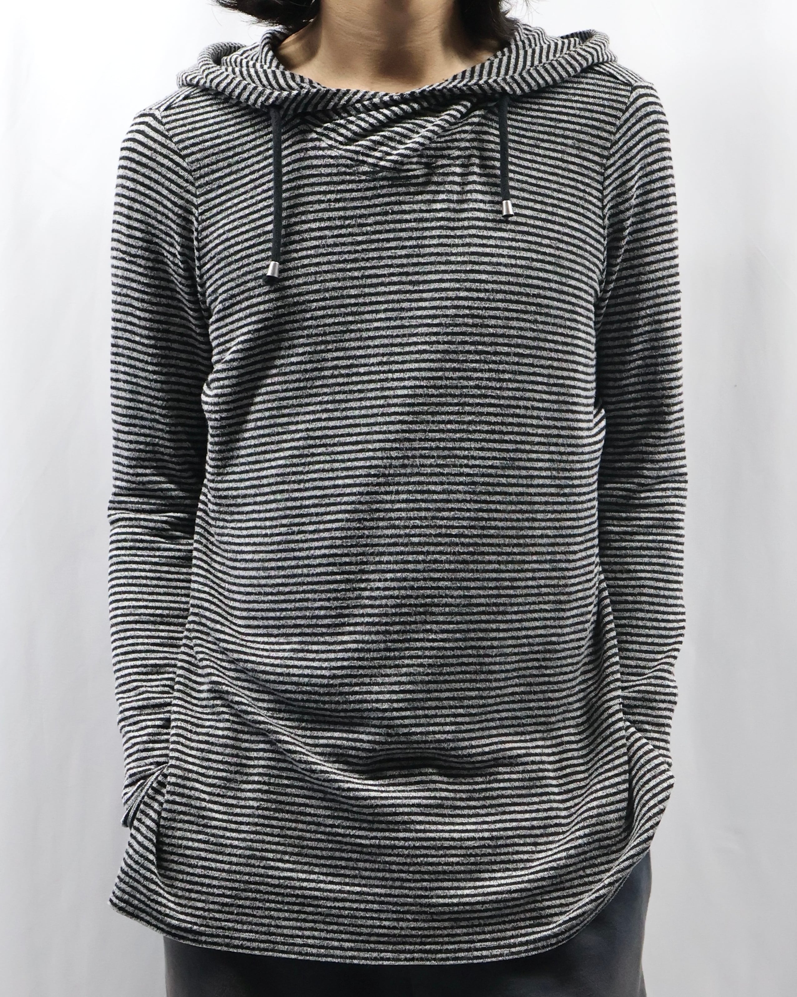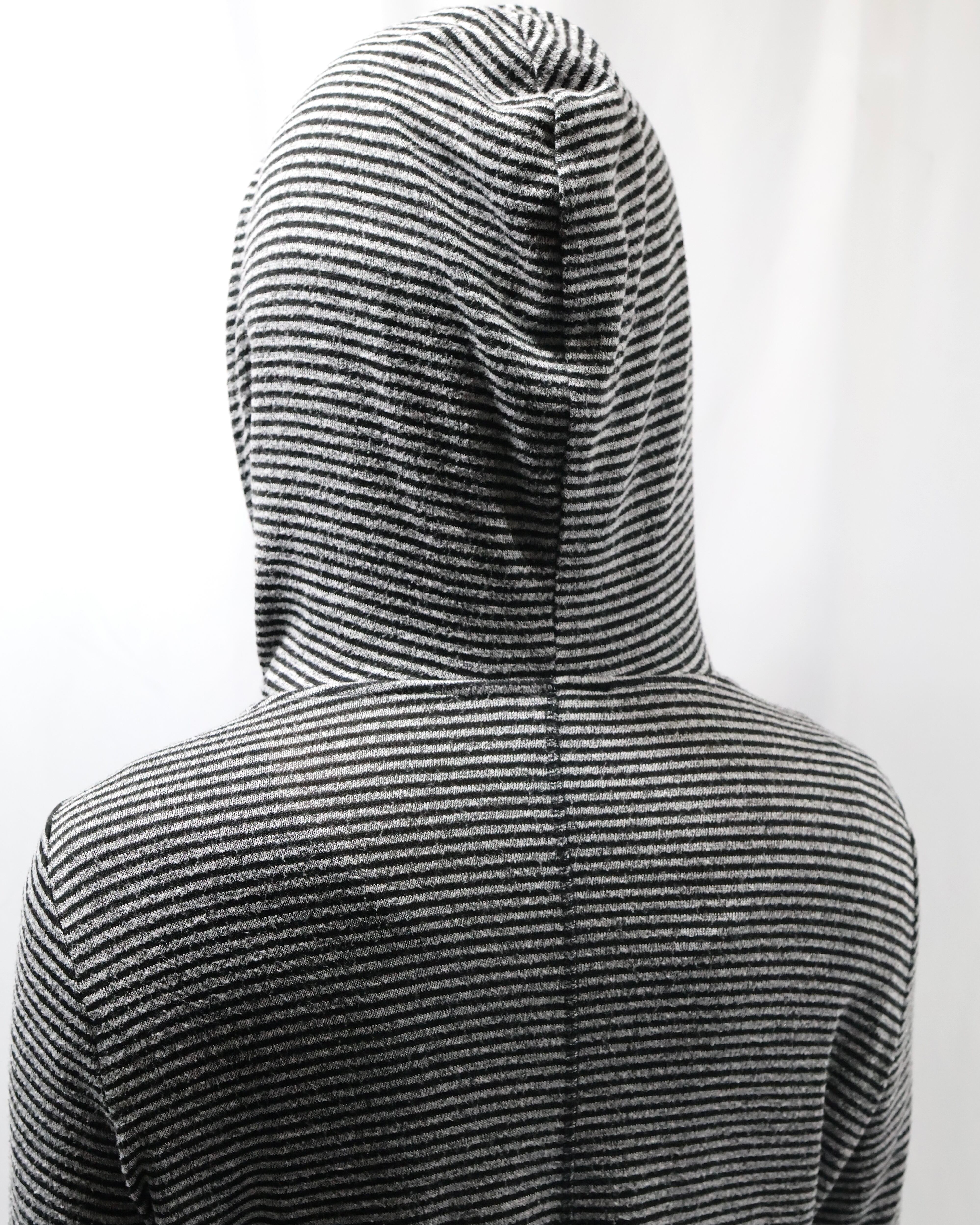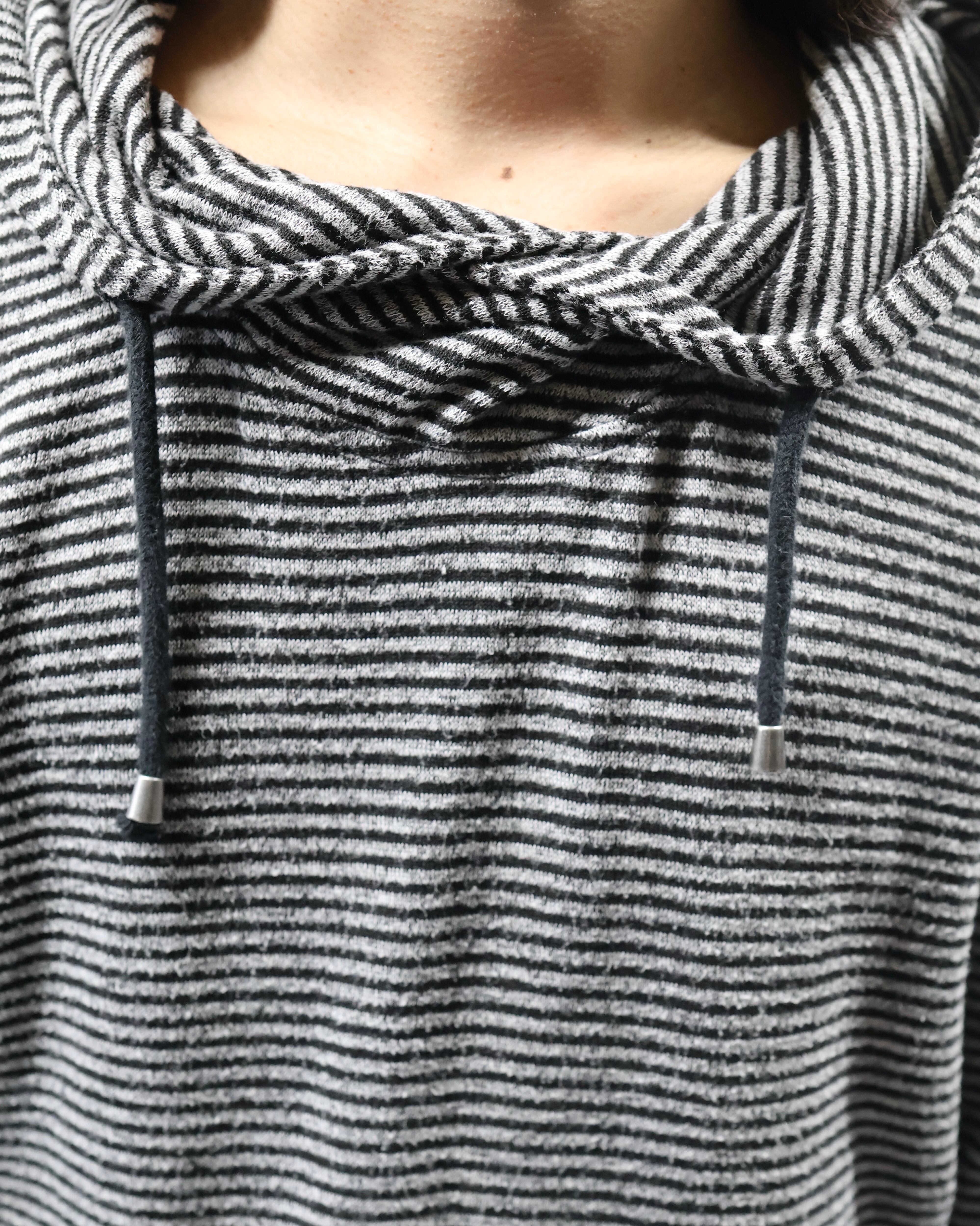 細かなボーダーパターンとライトウェイトな生地感が特徴のニットフーディ