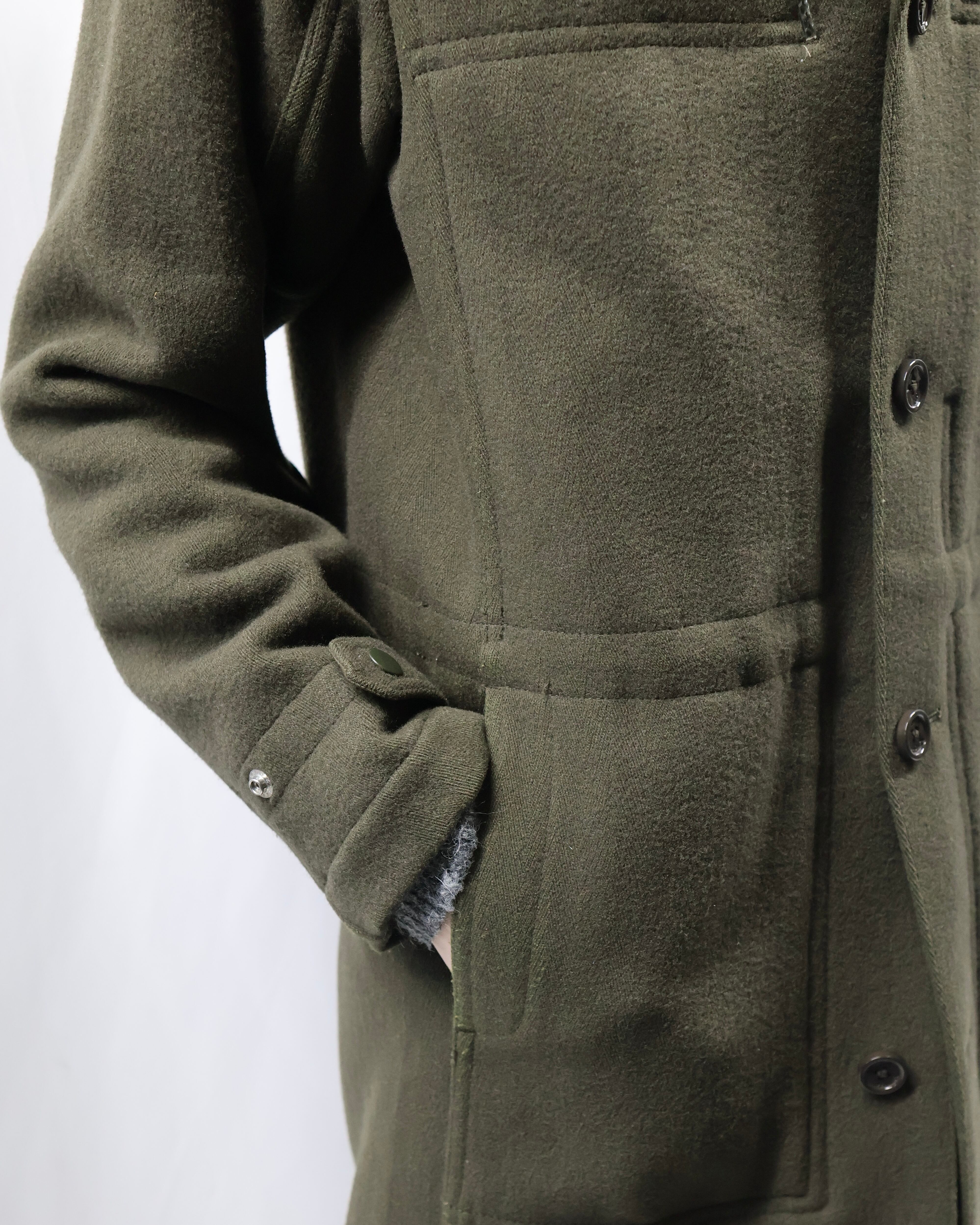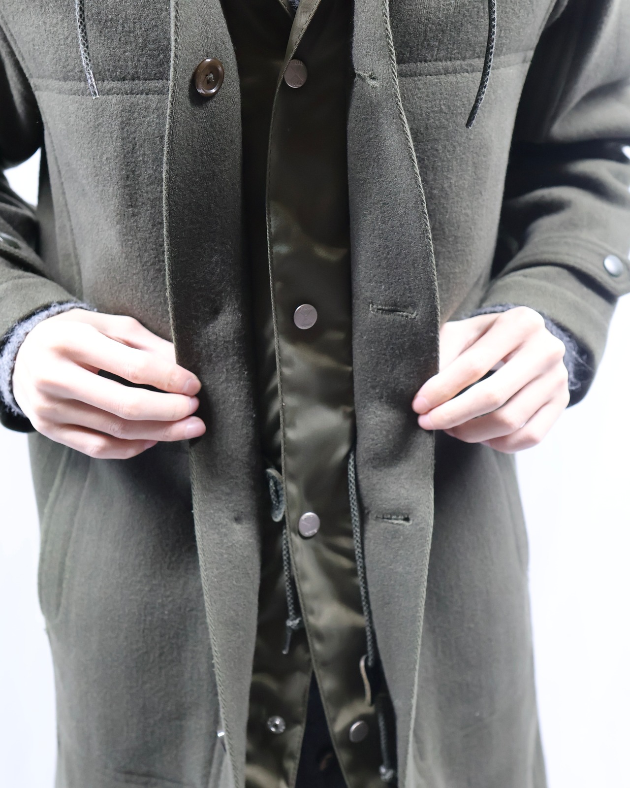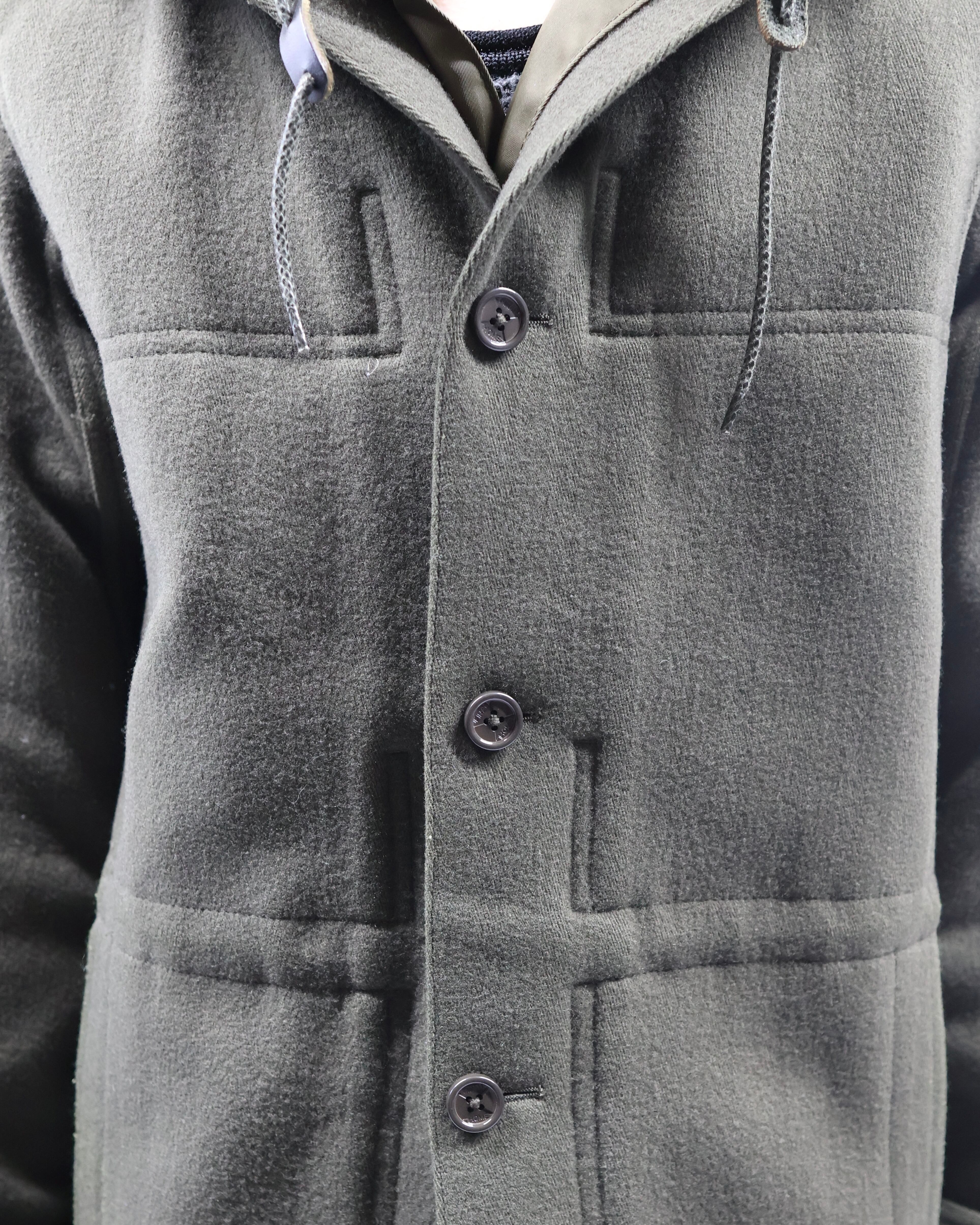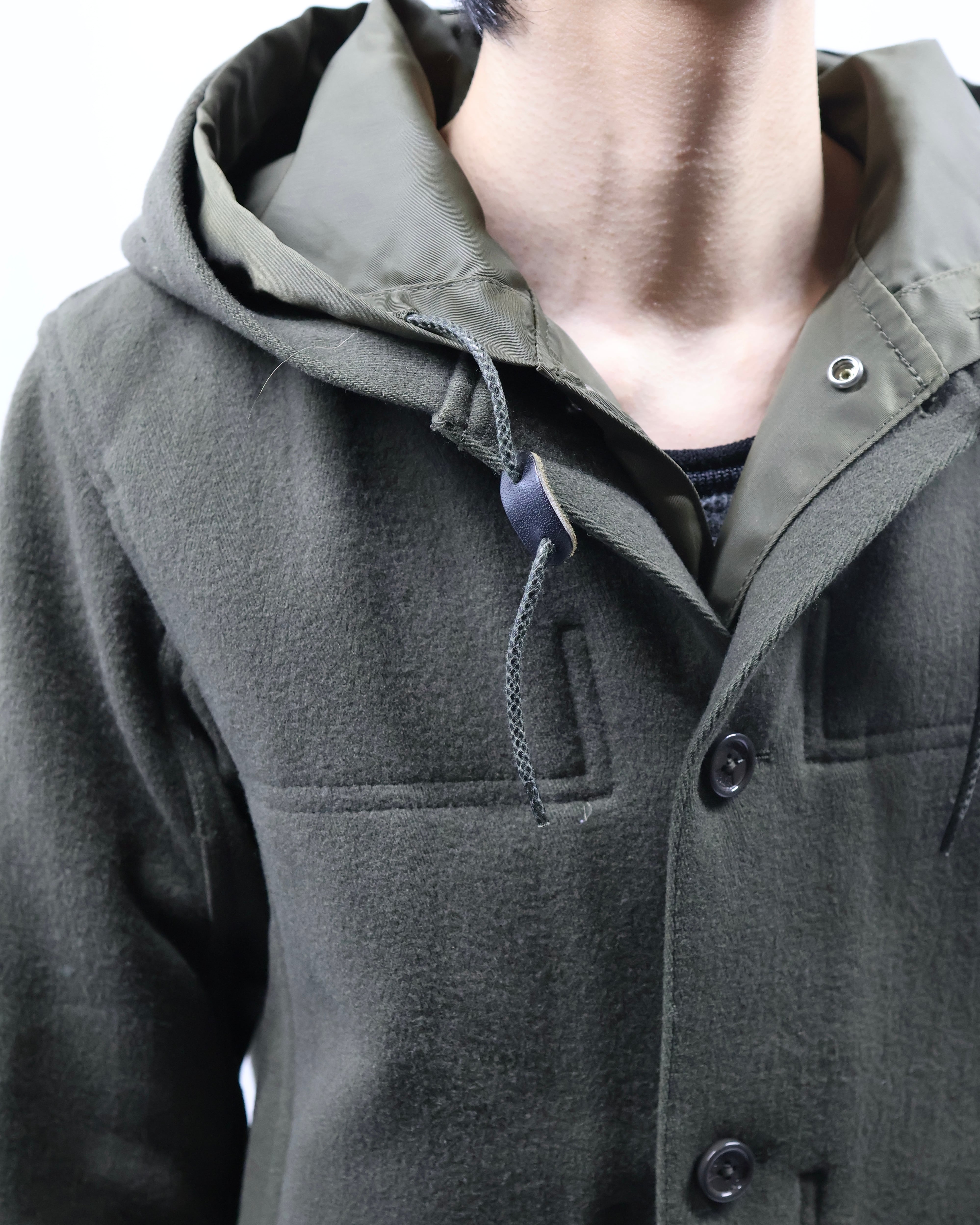 FINAL HOMEらしい、ミリタリーテイストとデザイン性を兼ね備えたフーデッドウールコート