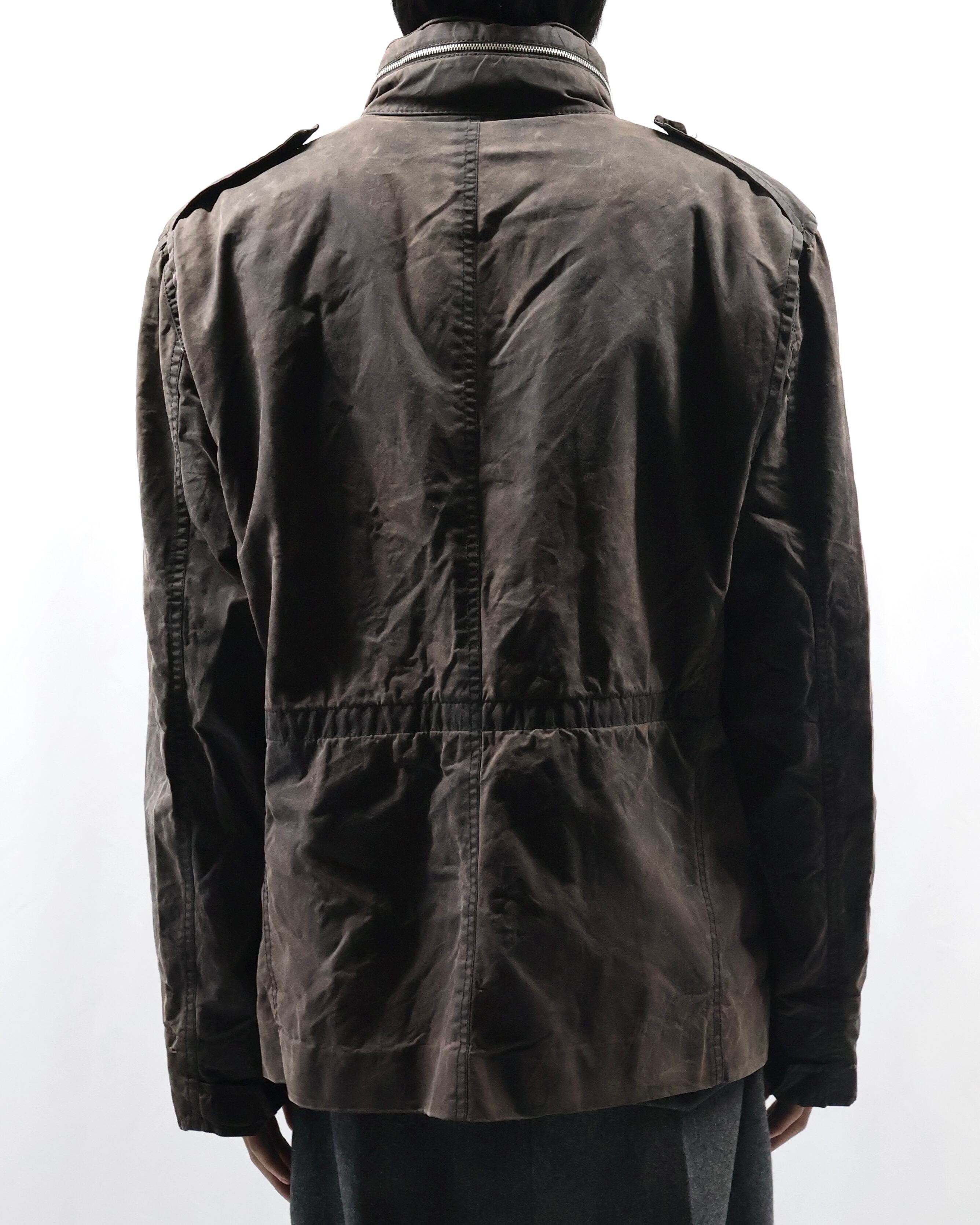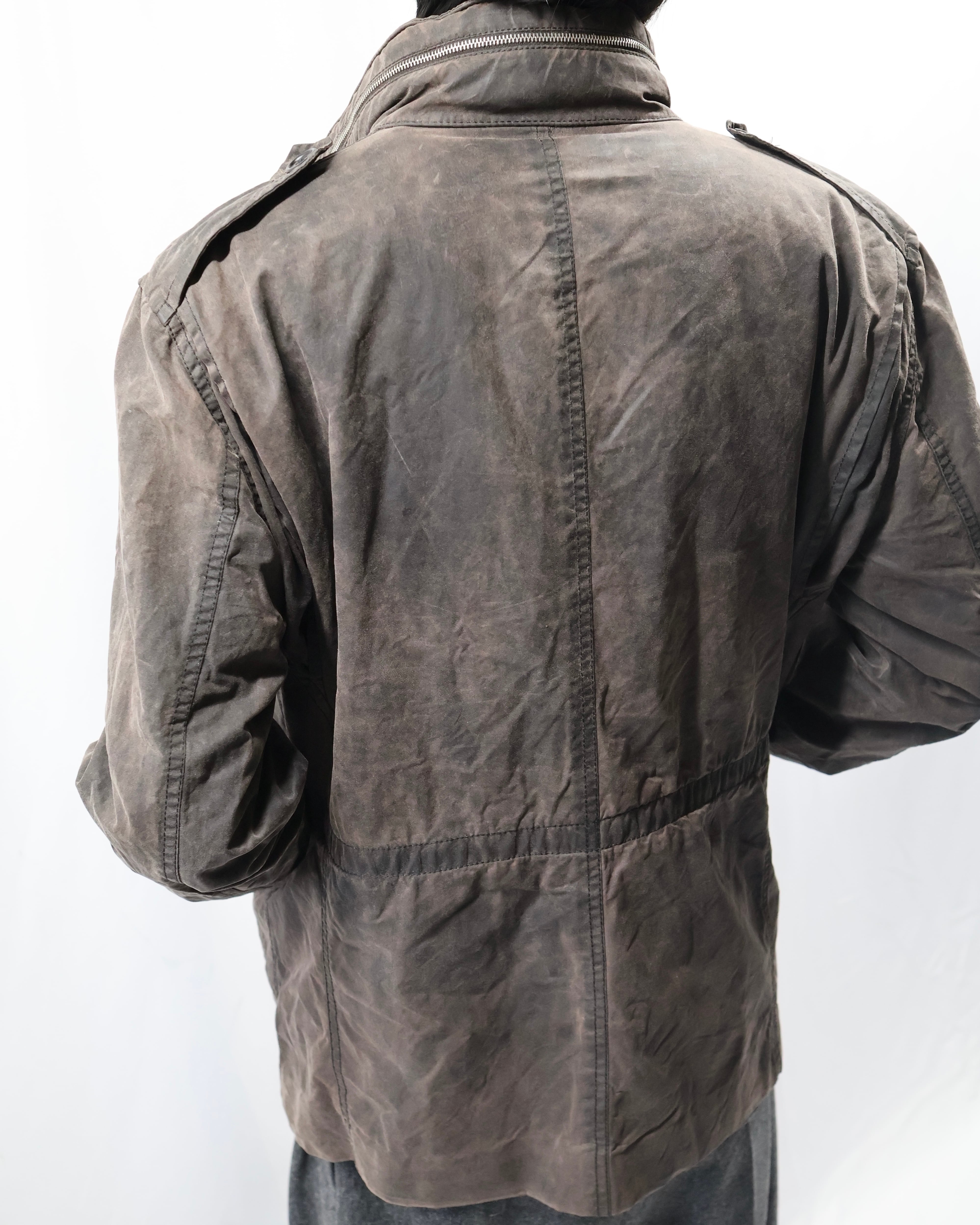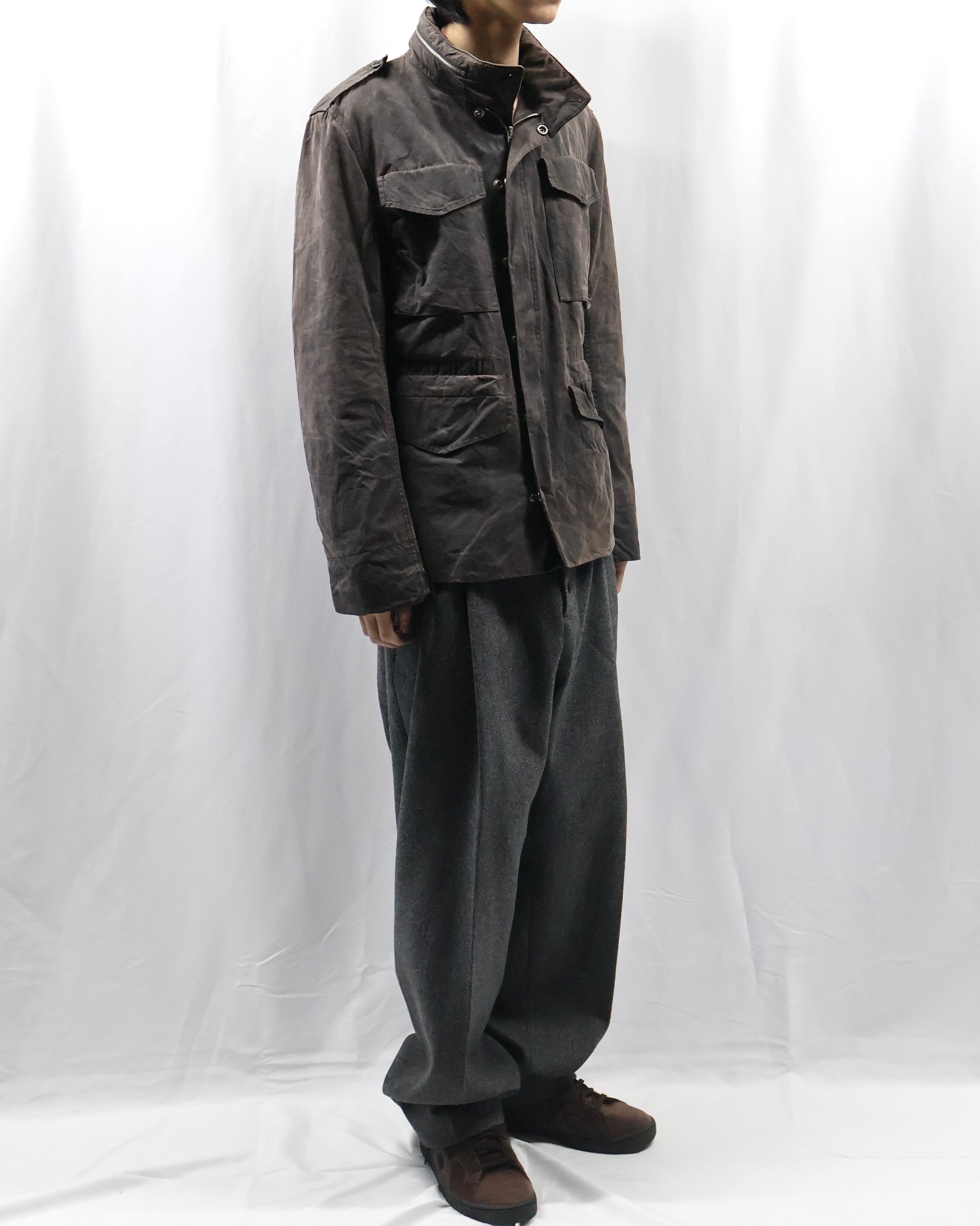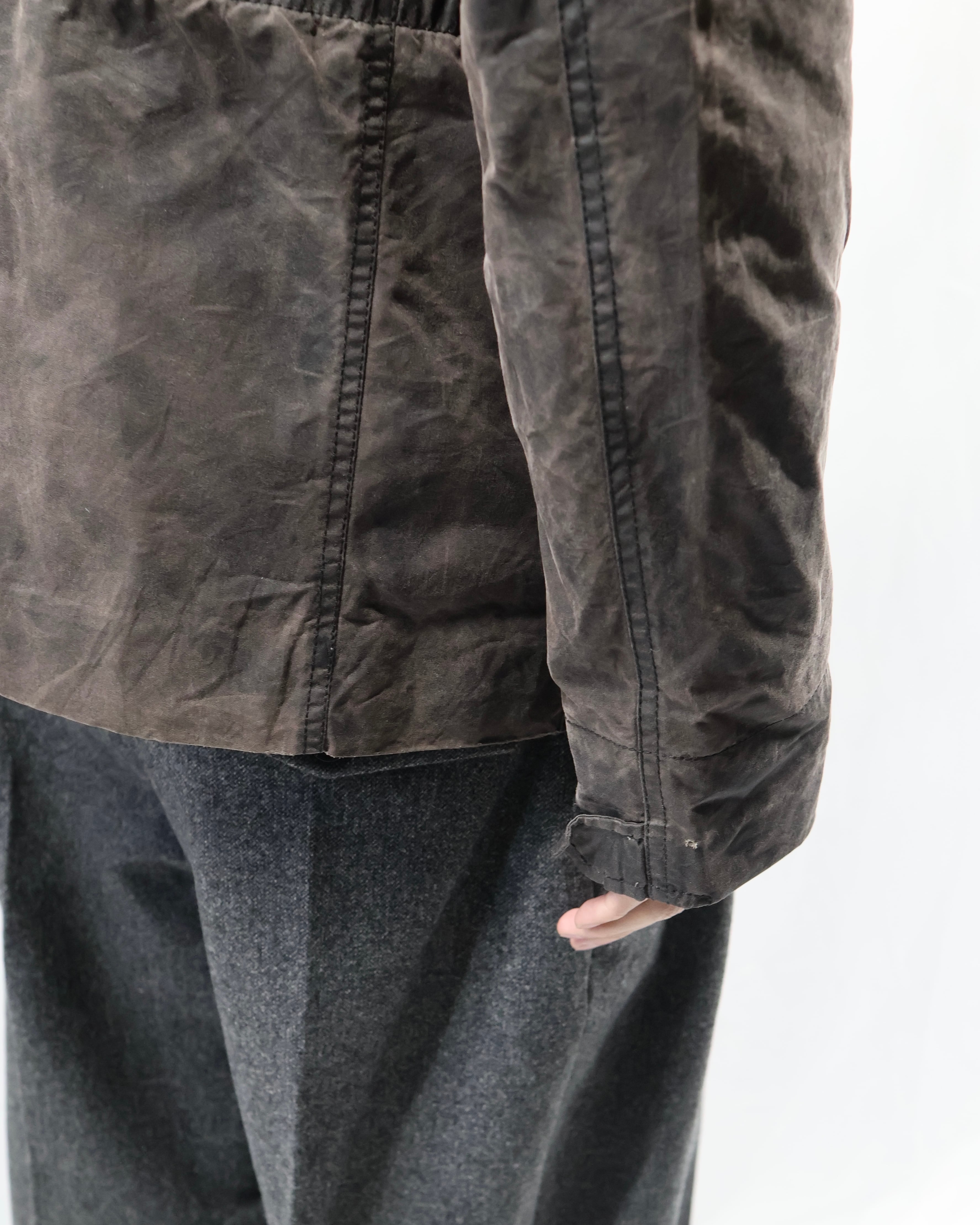 オイルドのコットン生地と洗い加工によって生まれた独特のシワ感と色ムラが、ヴィンテージのような深みを演出。細身すぎないシルエットで、ニットなどのインナーとのレイヤード可能。カジュアルはもちろん、都会的スタイリングにも馴染む、使い勝手の良い一着。