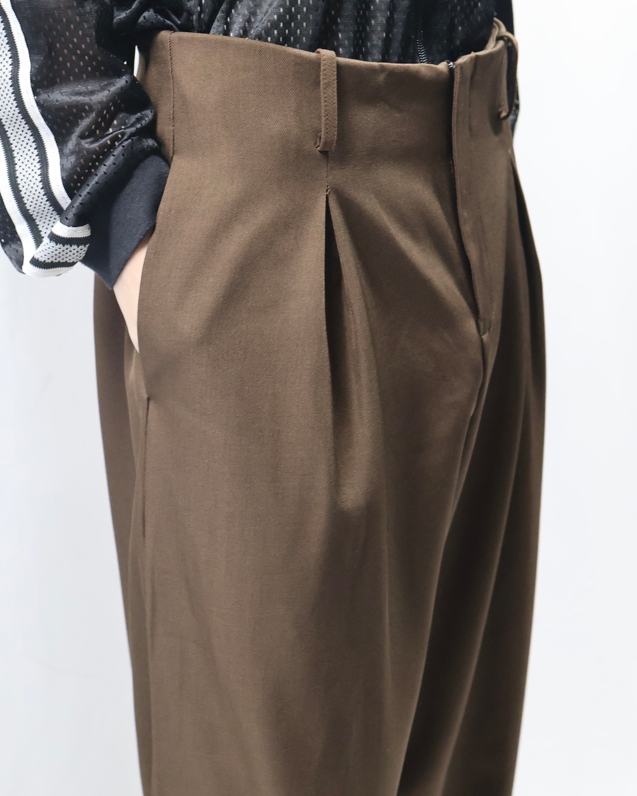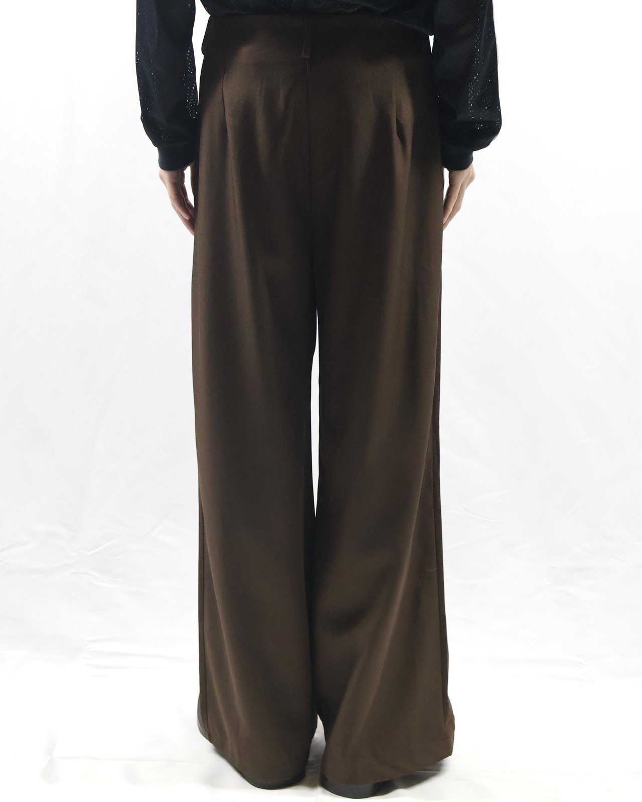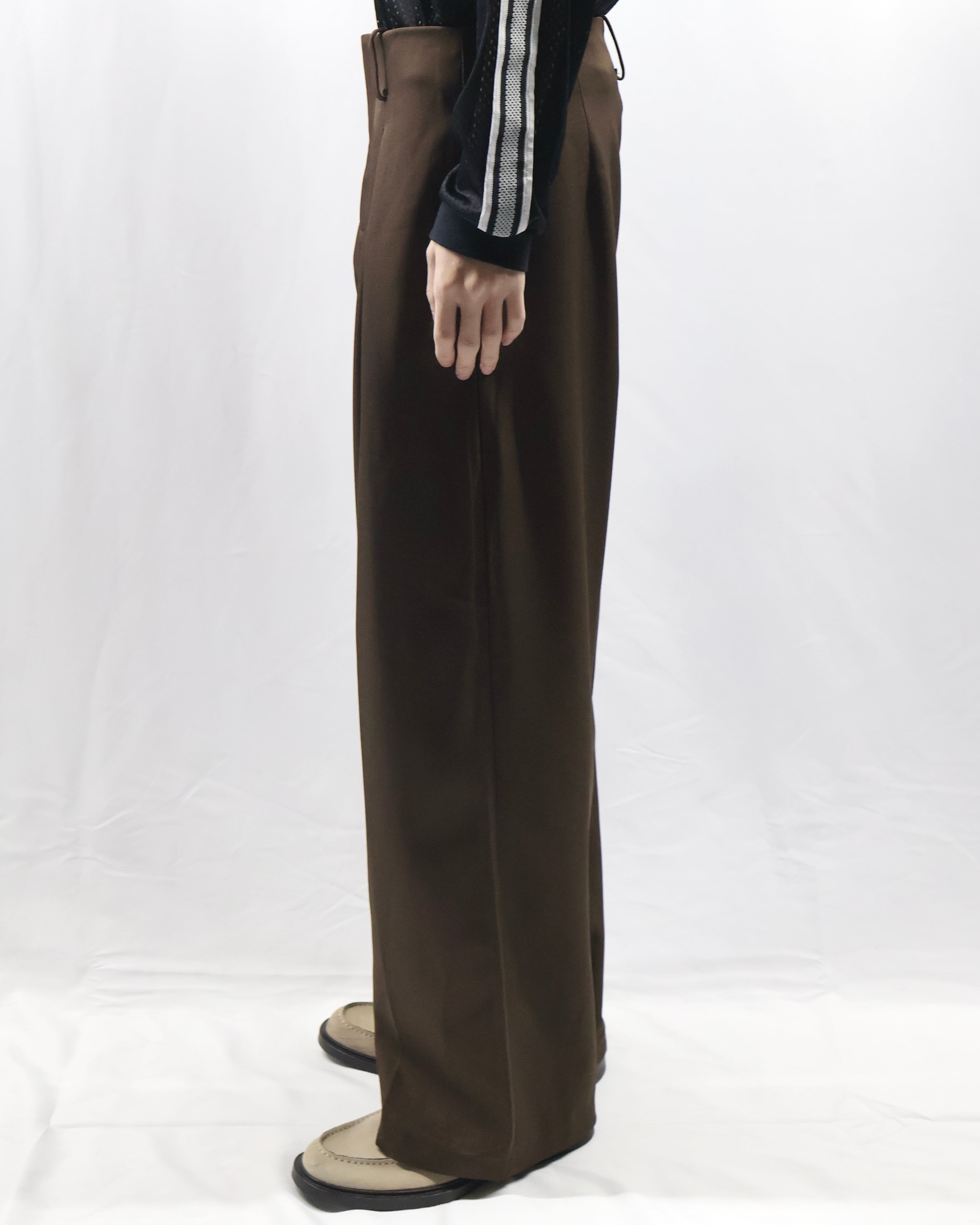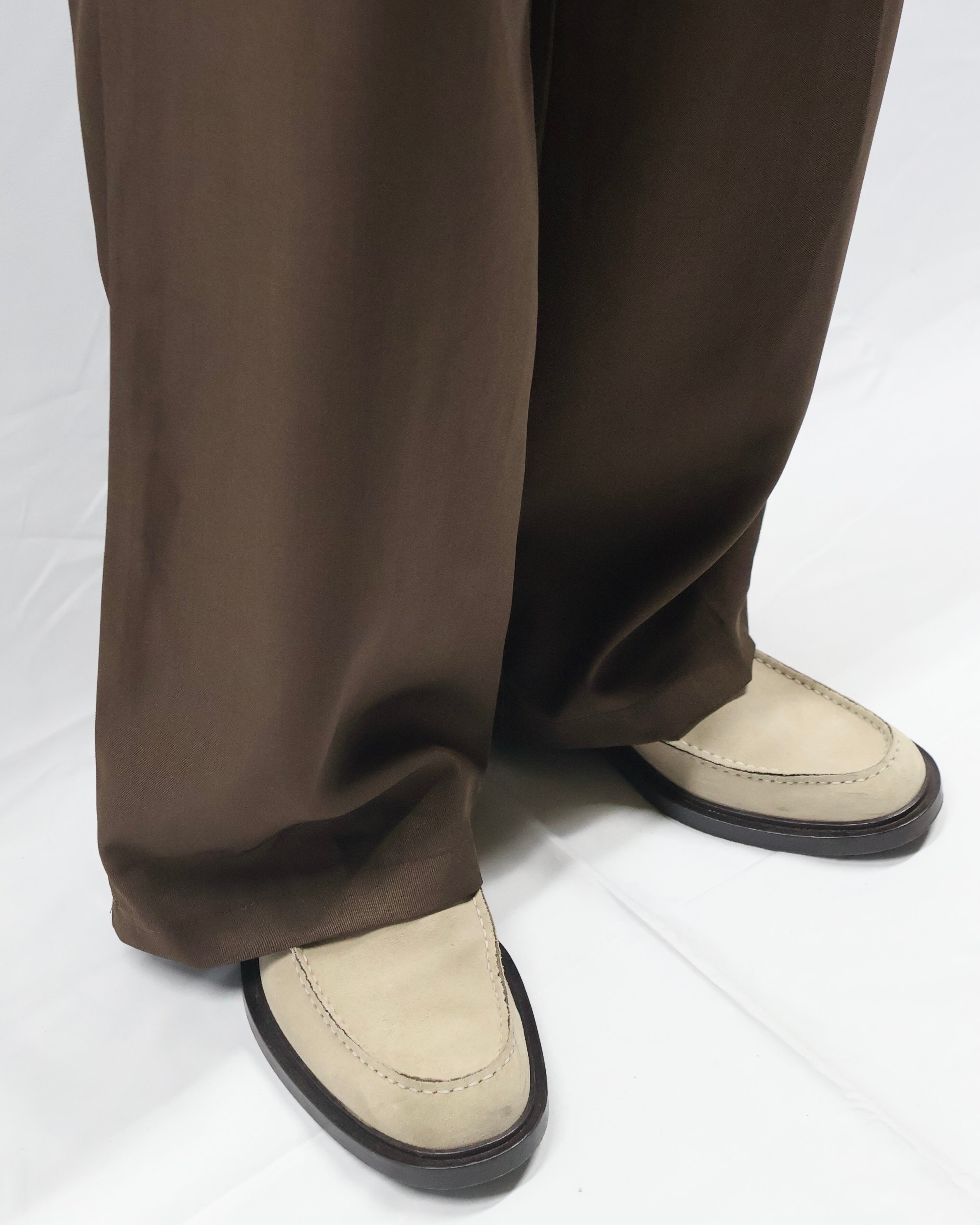 歩くたびに揺れる落ち感が、上品さとモードな存在感を演出。ブラウンの柔らかい色味がスタイリングに深みを与え、ニットからシャツまで幅広く対応可能。