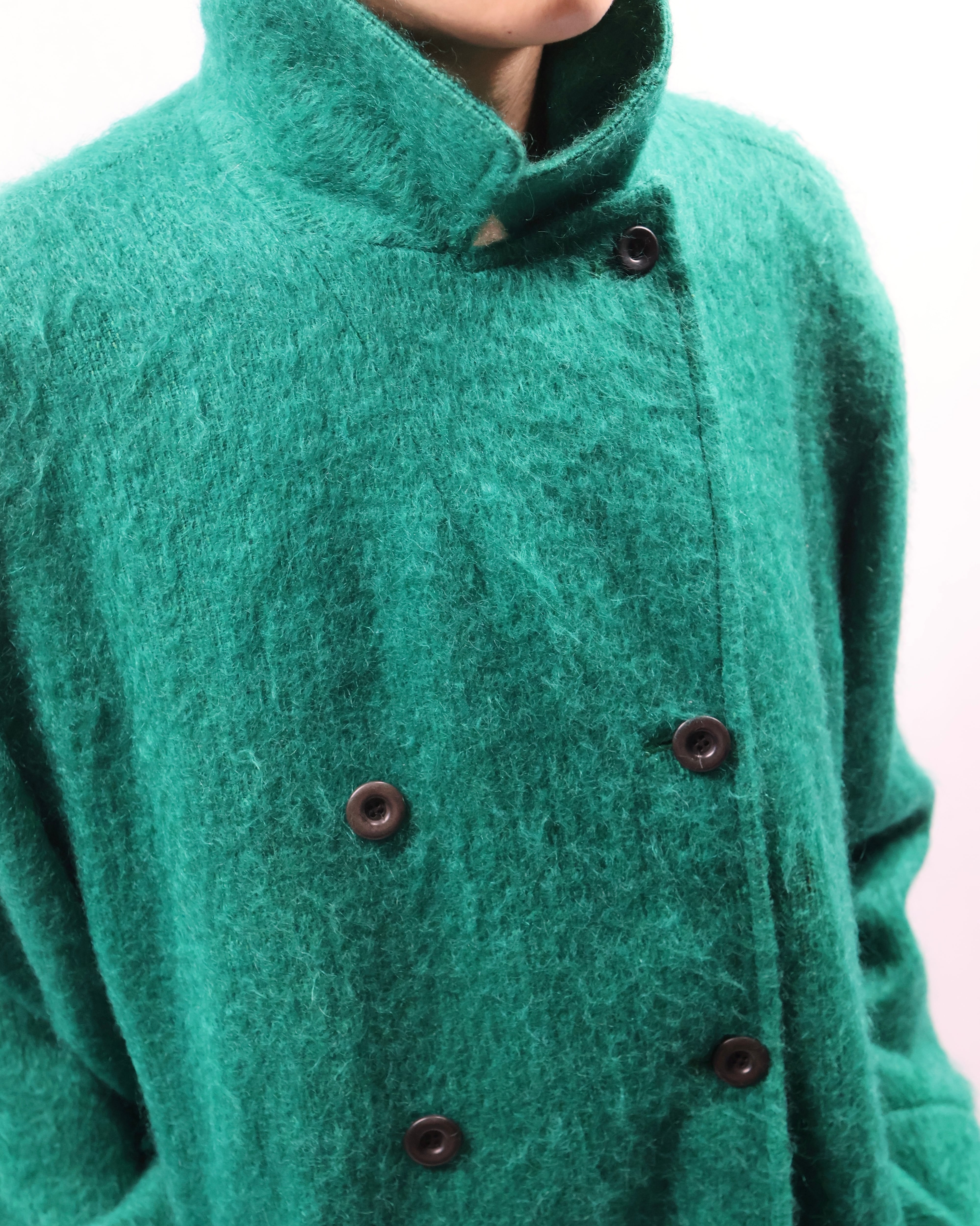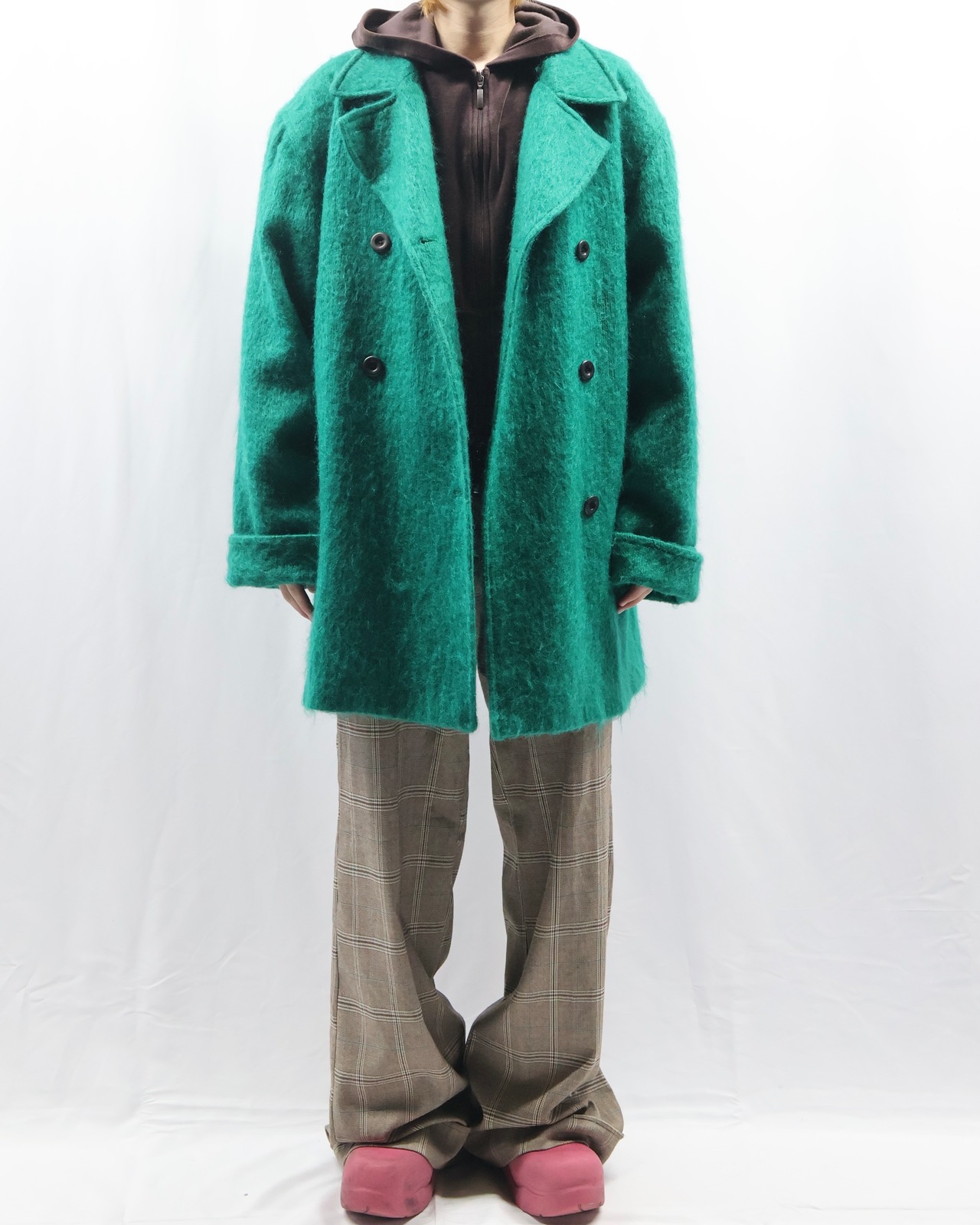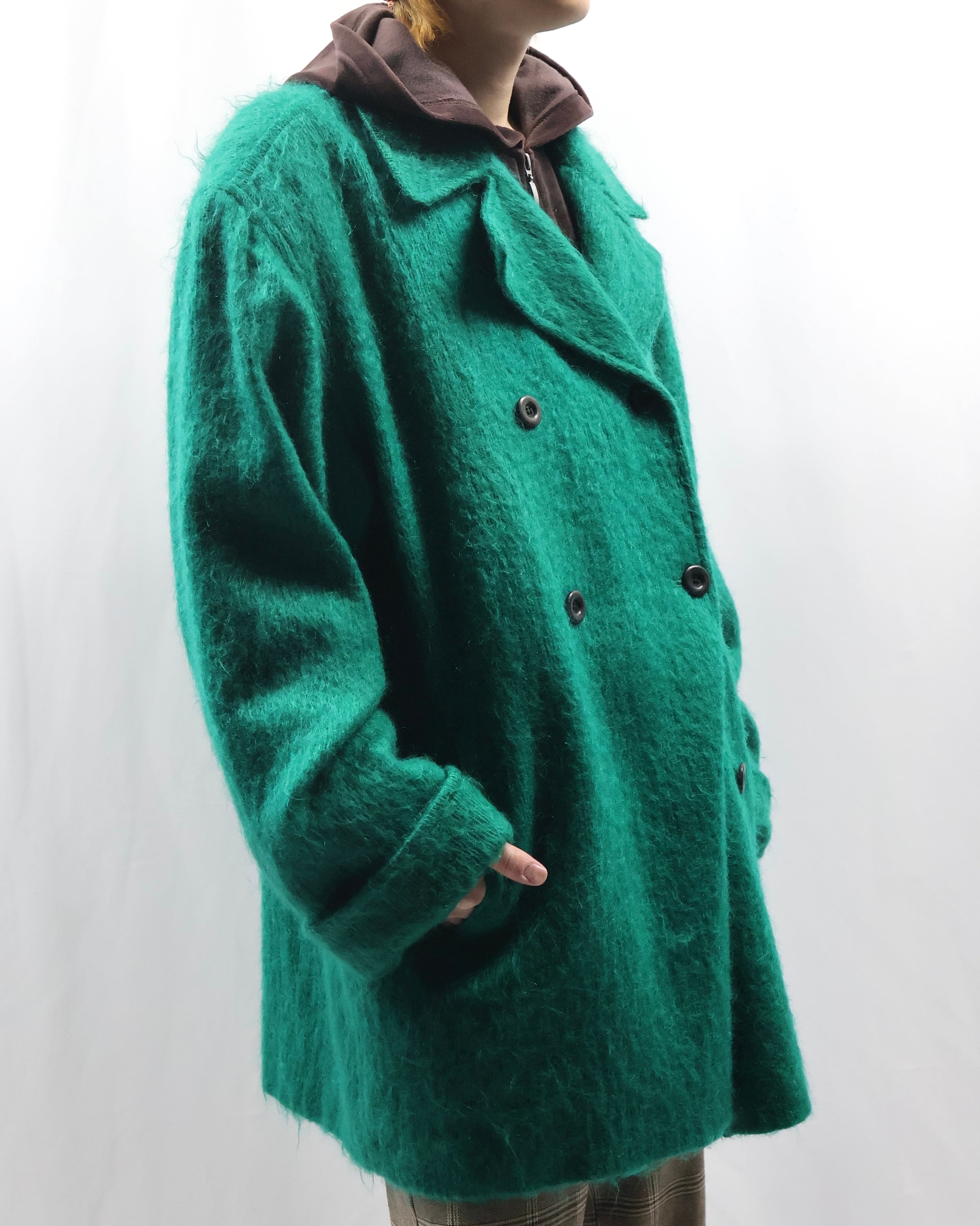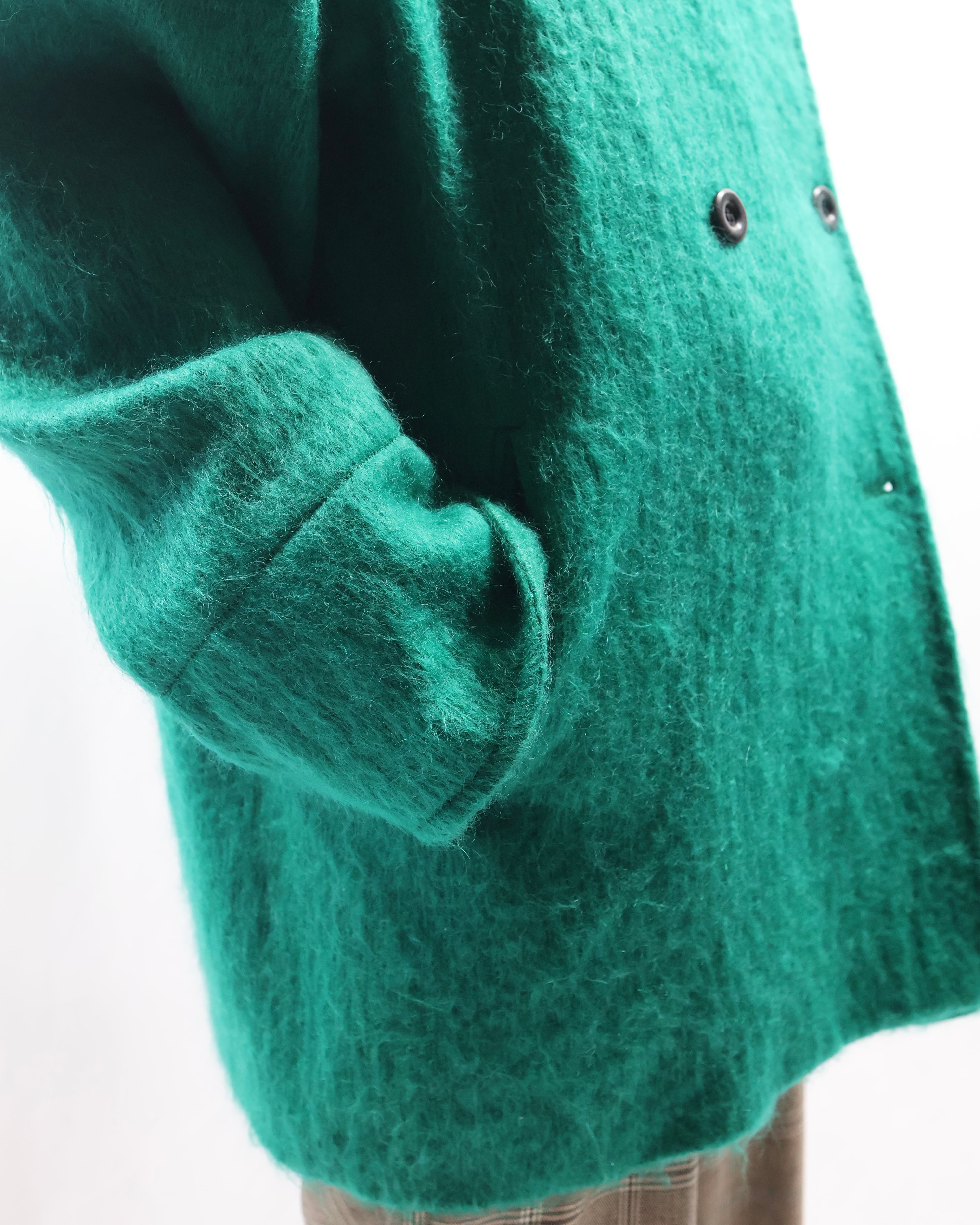 存在感のあるエメラルドグリーンのカラーが特徴のモヘアPコート