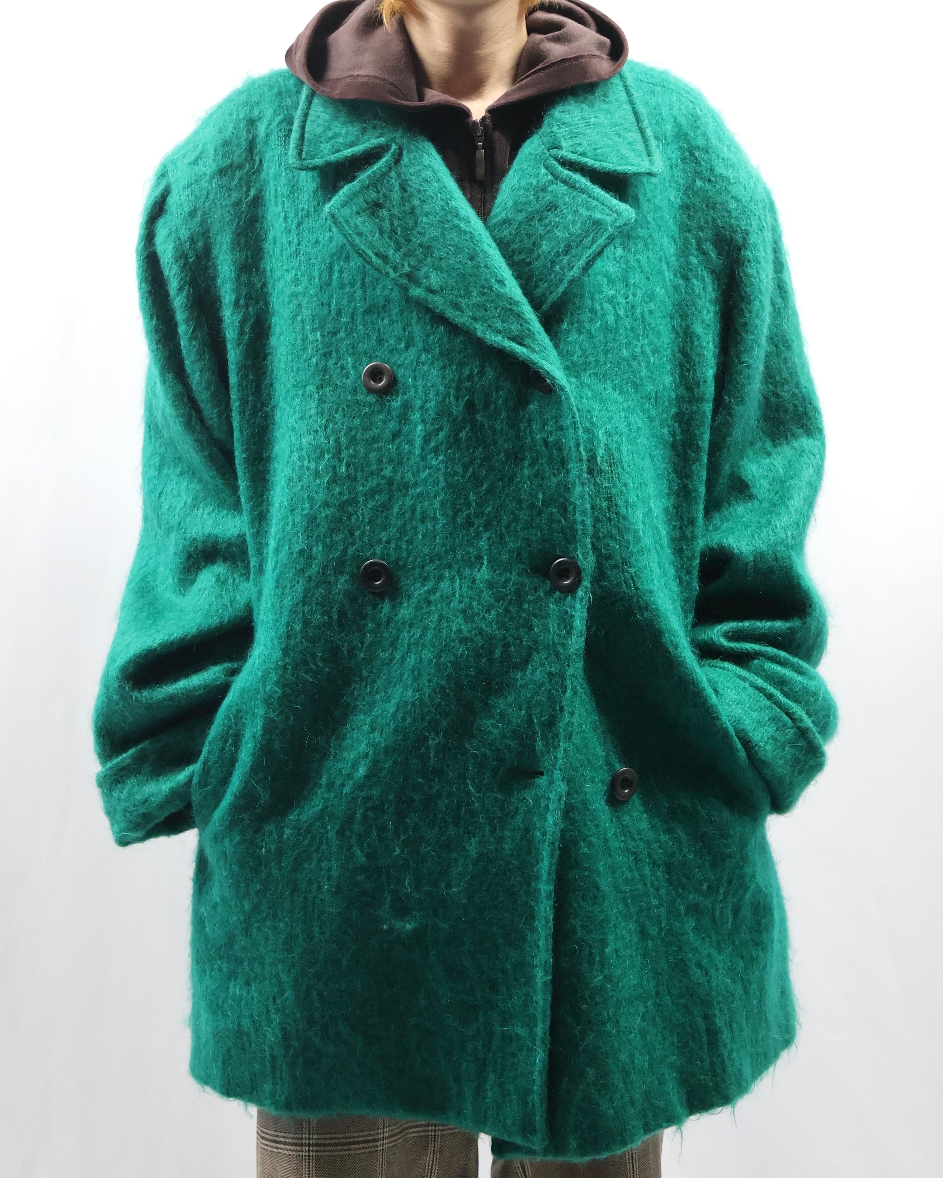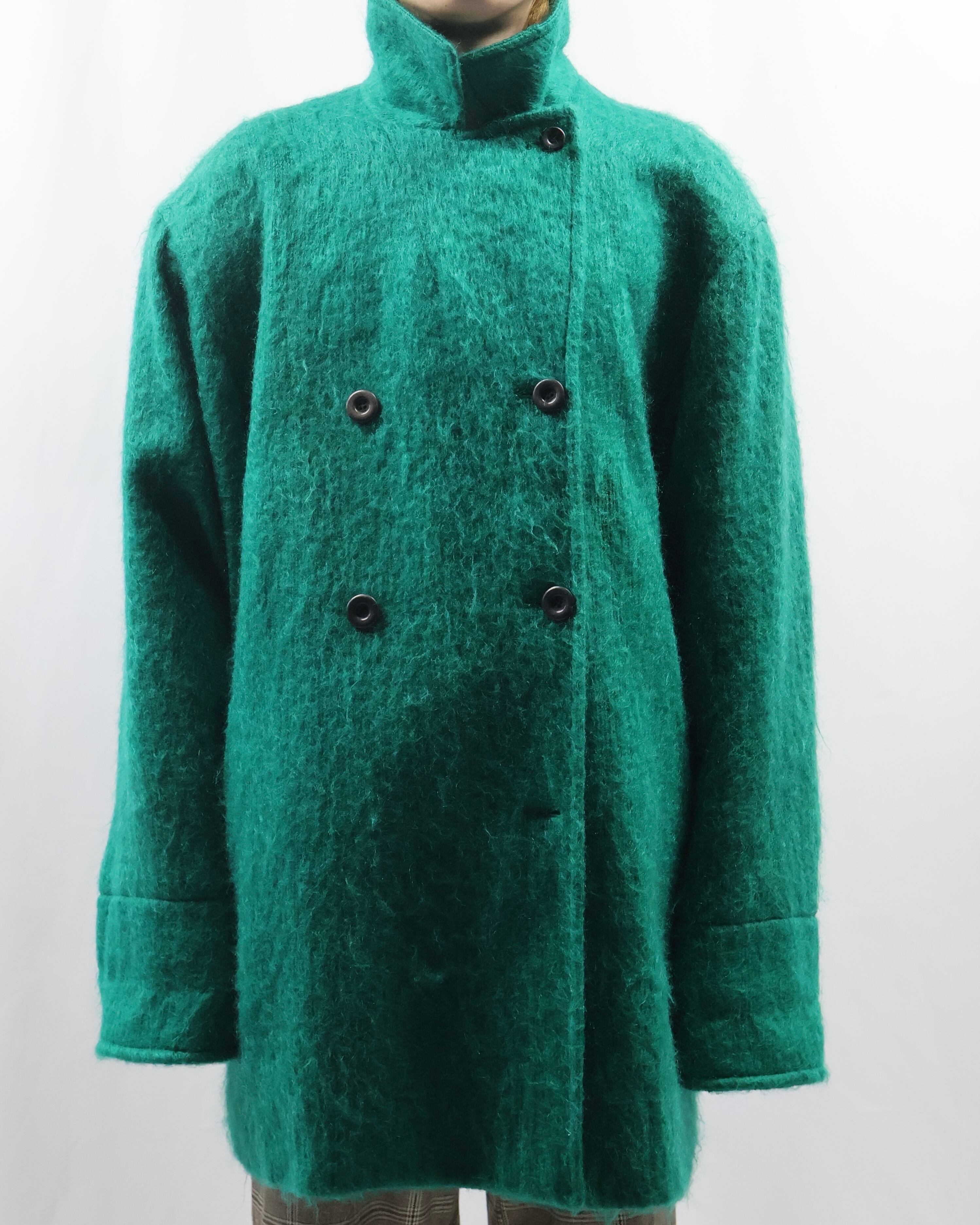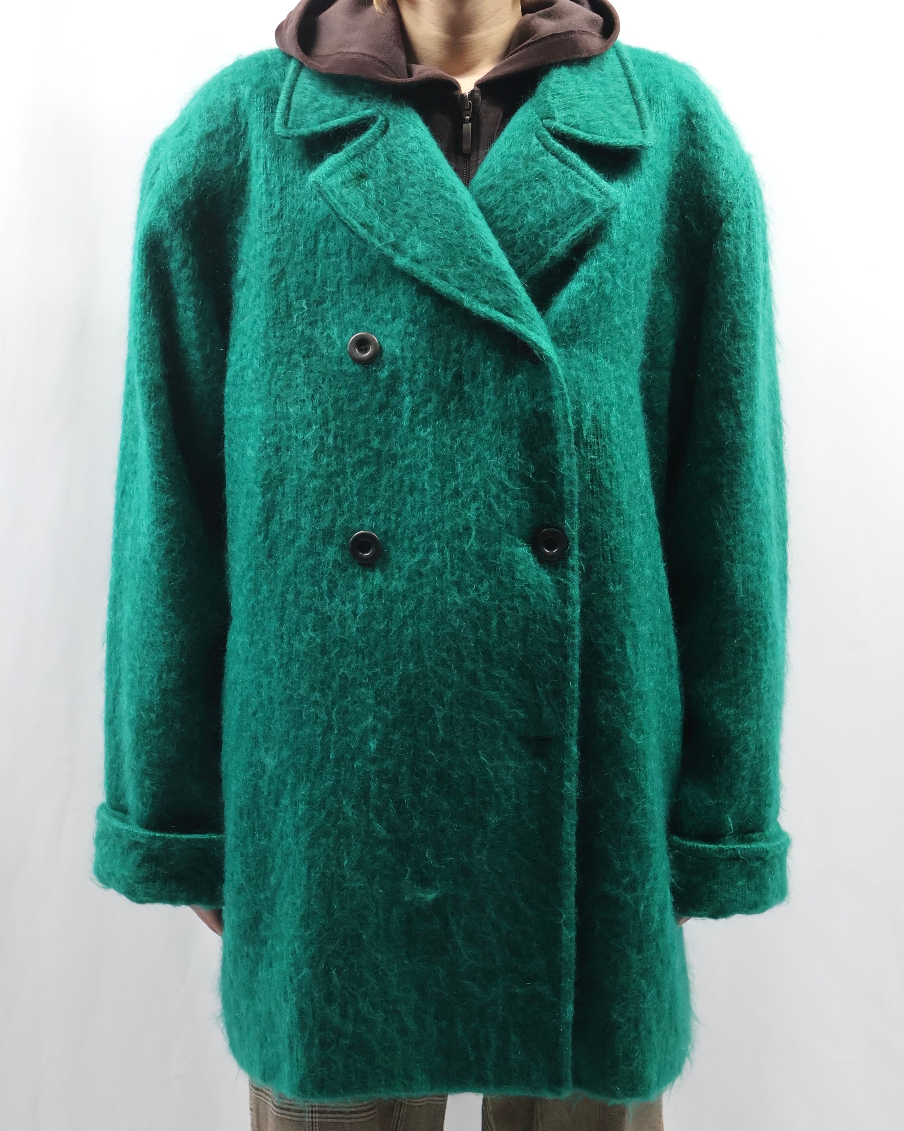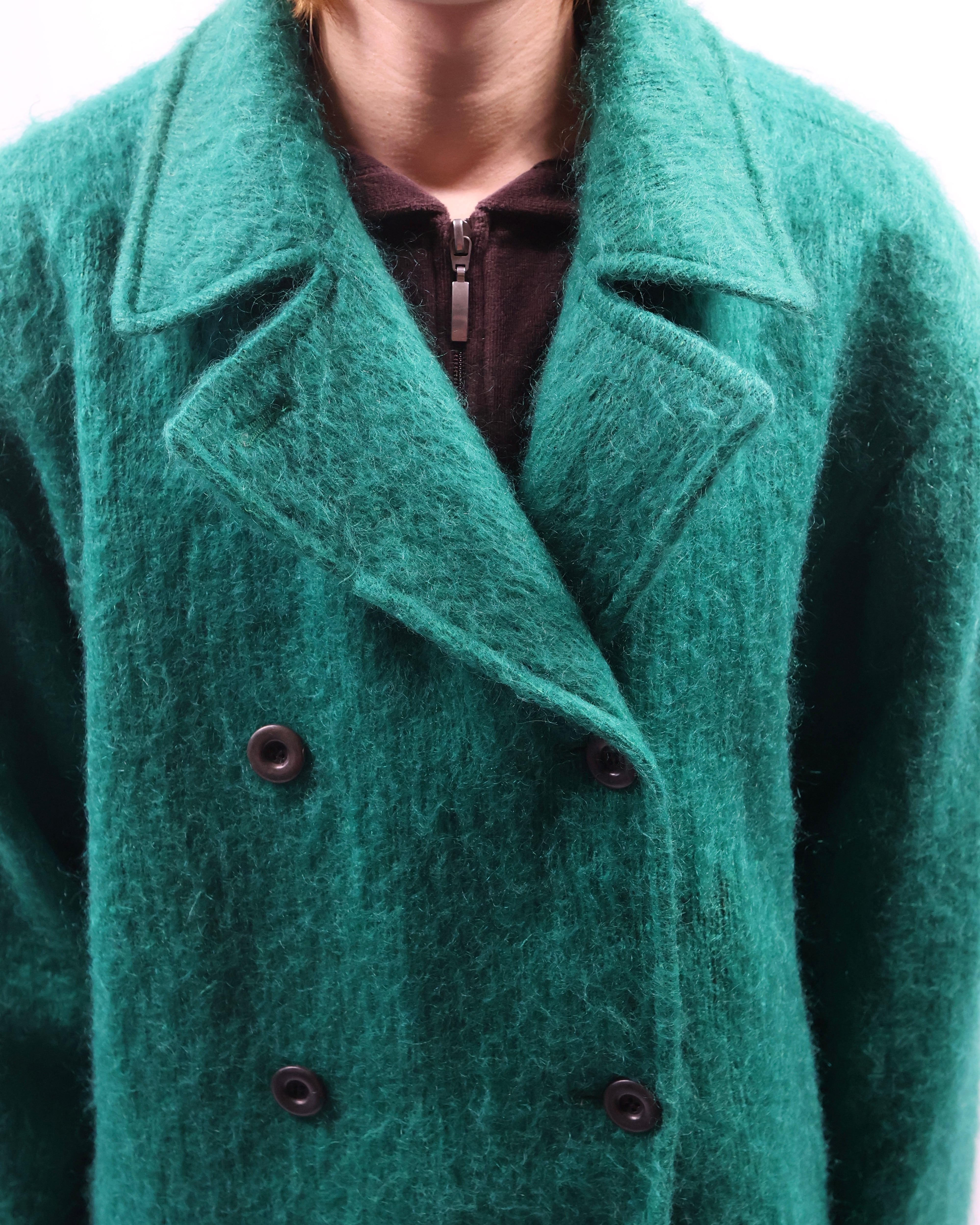 存在感のあるエメラルドグリーンのカラーが特徴のモヘアPコート