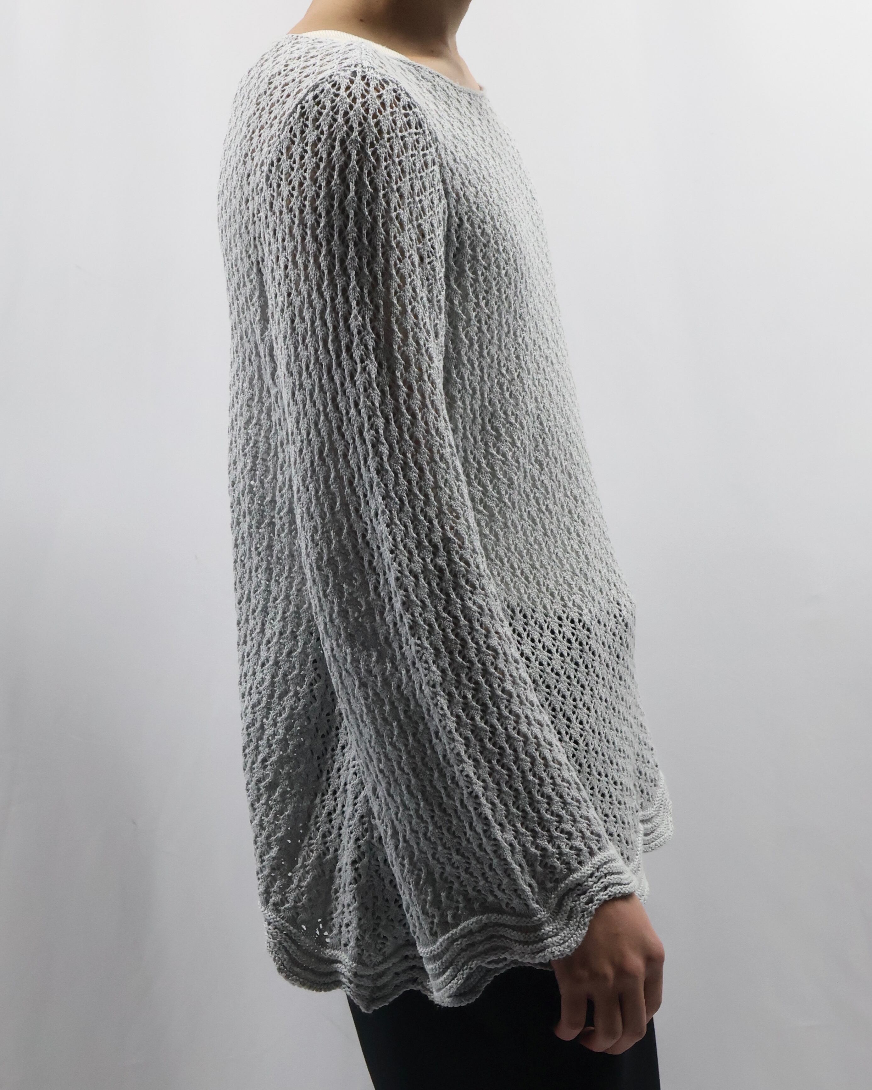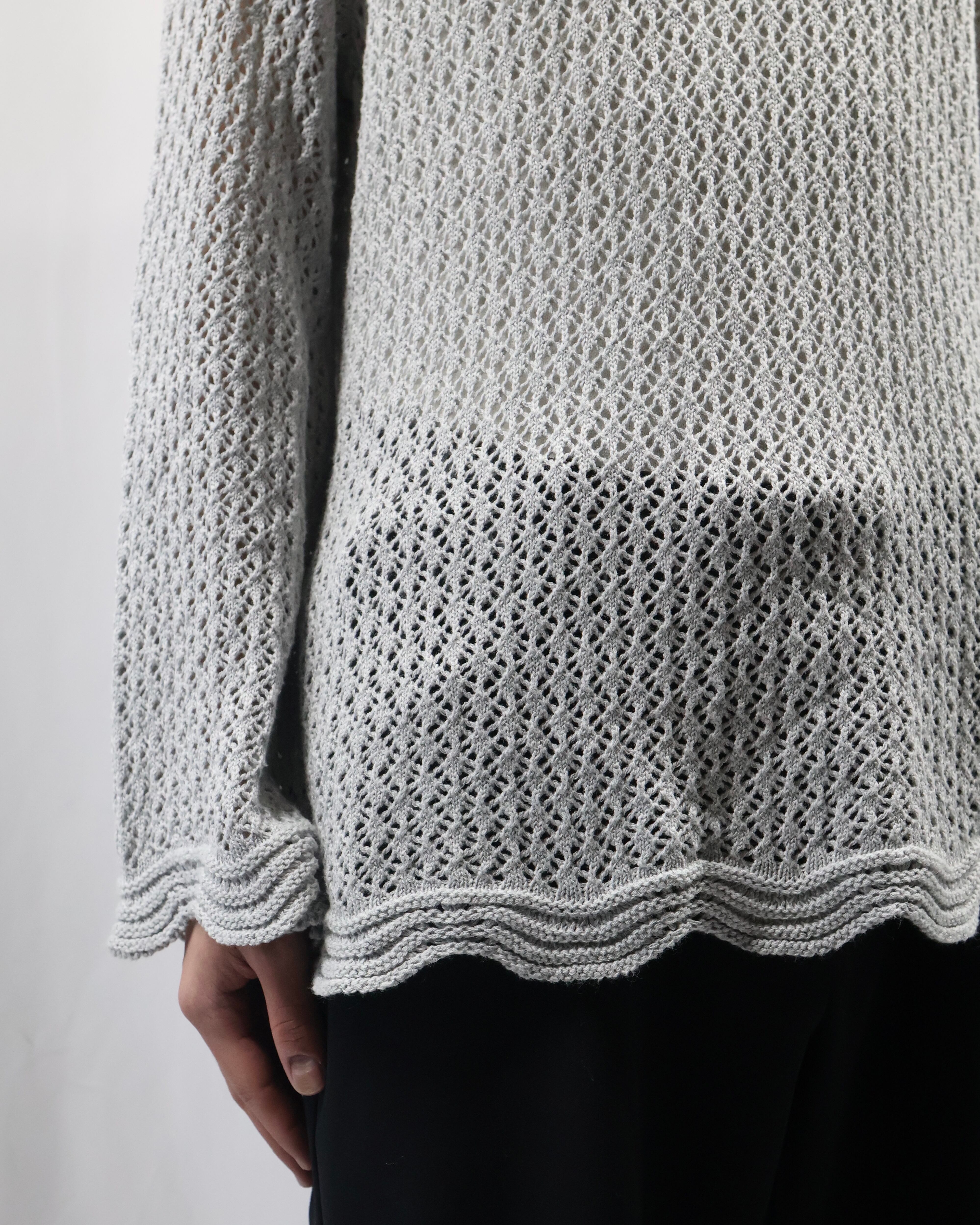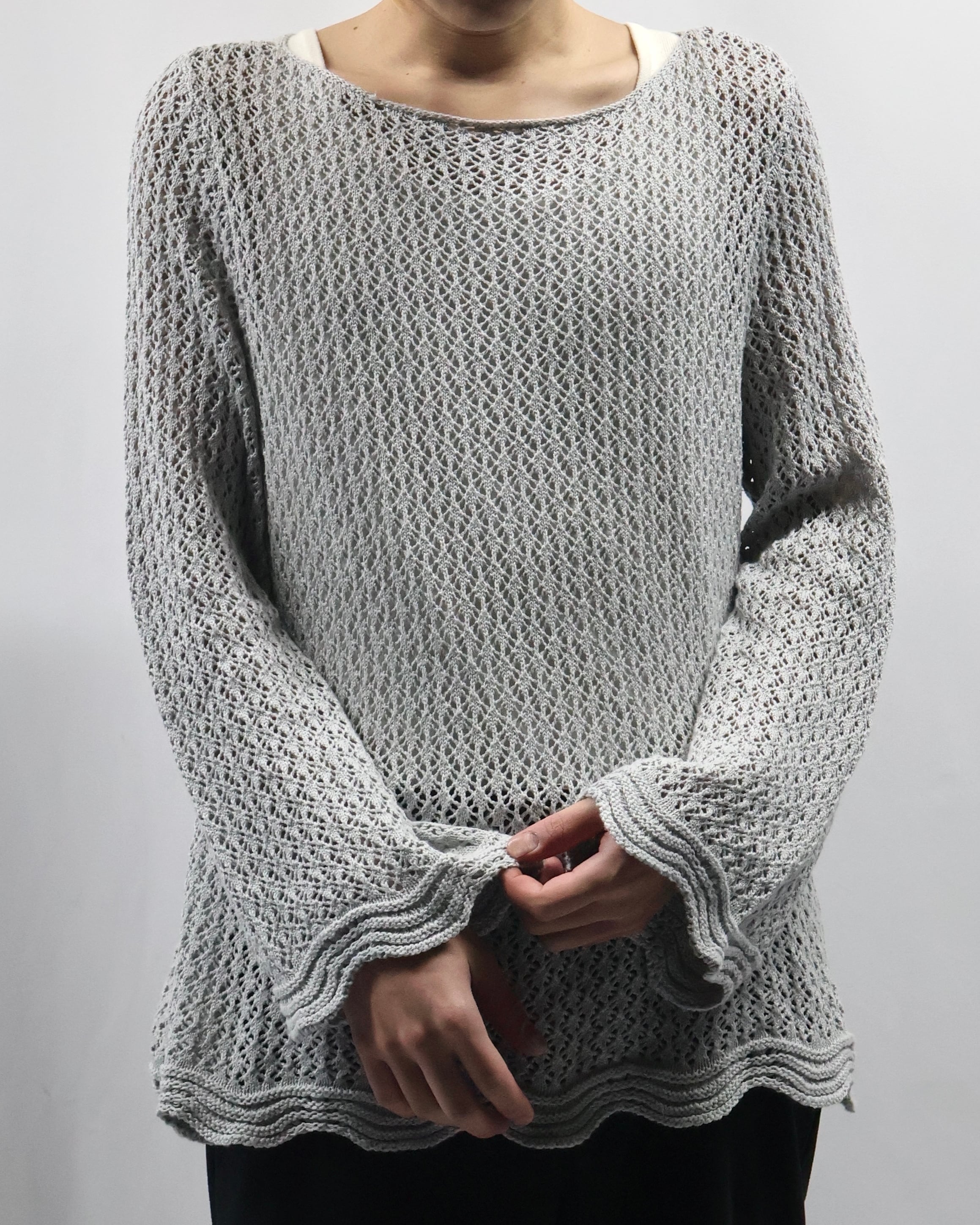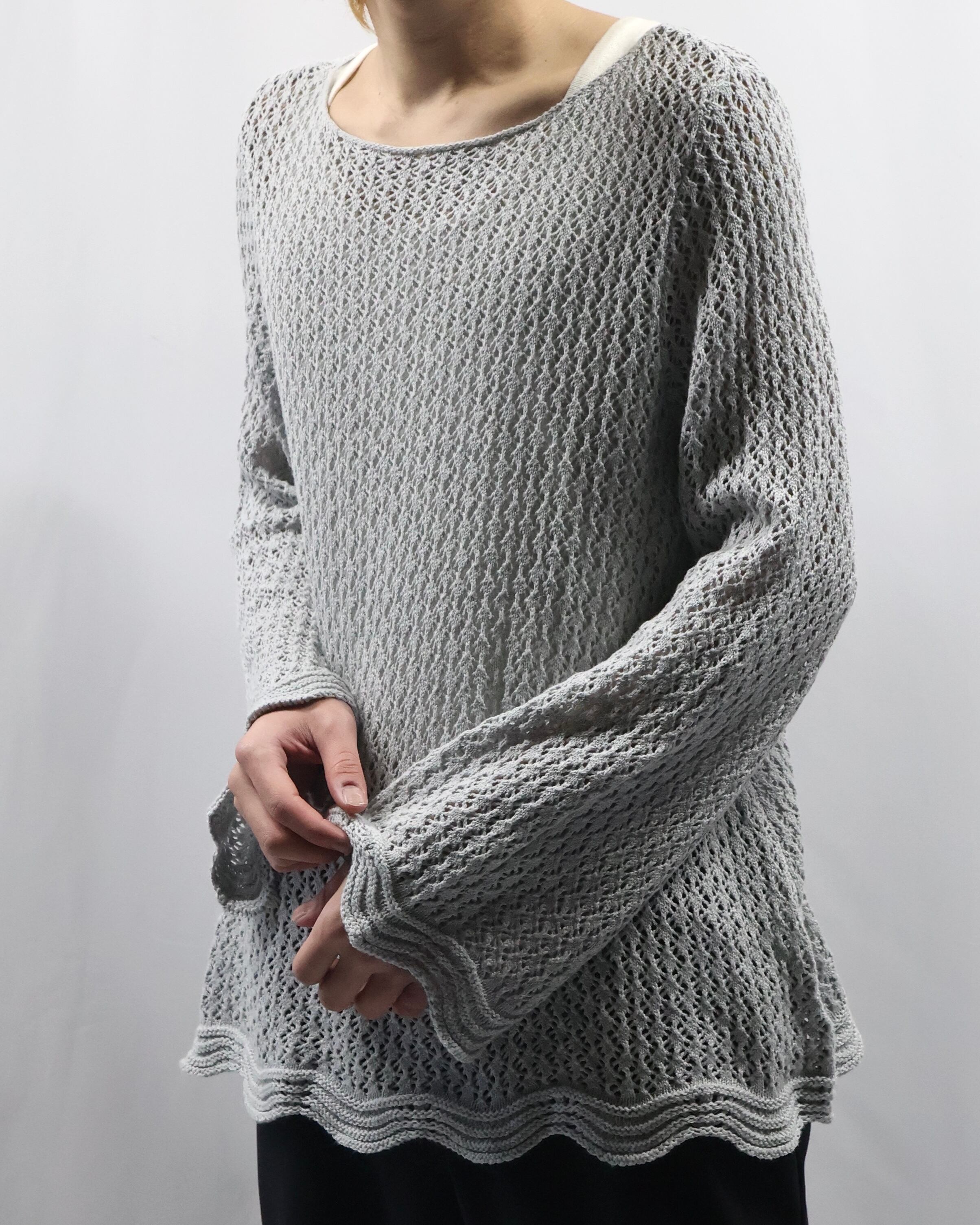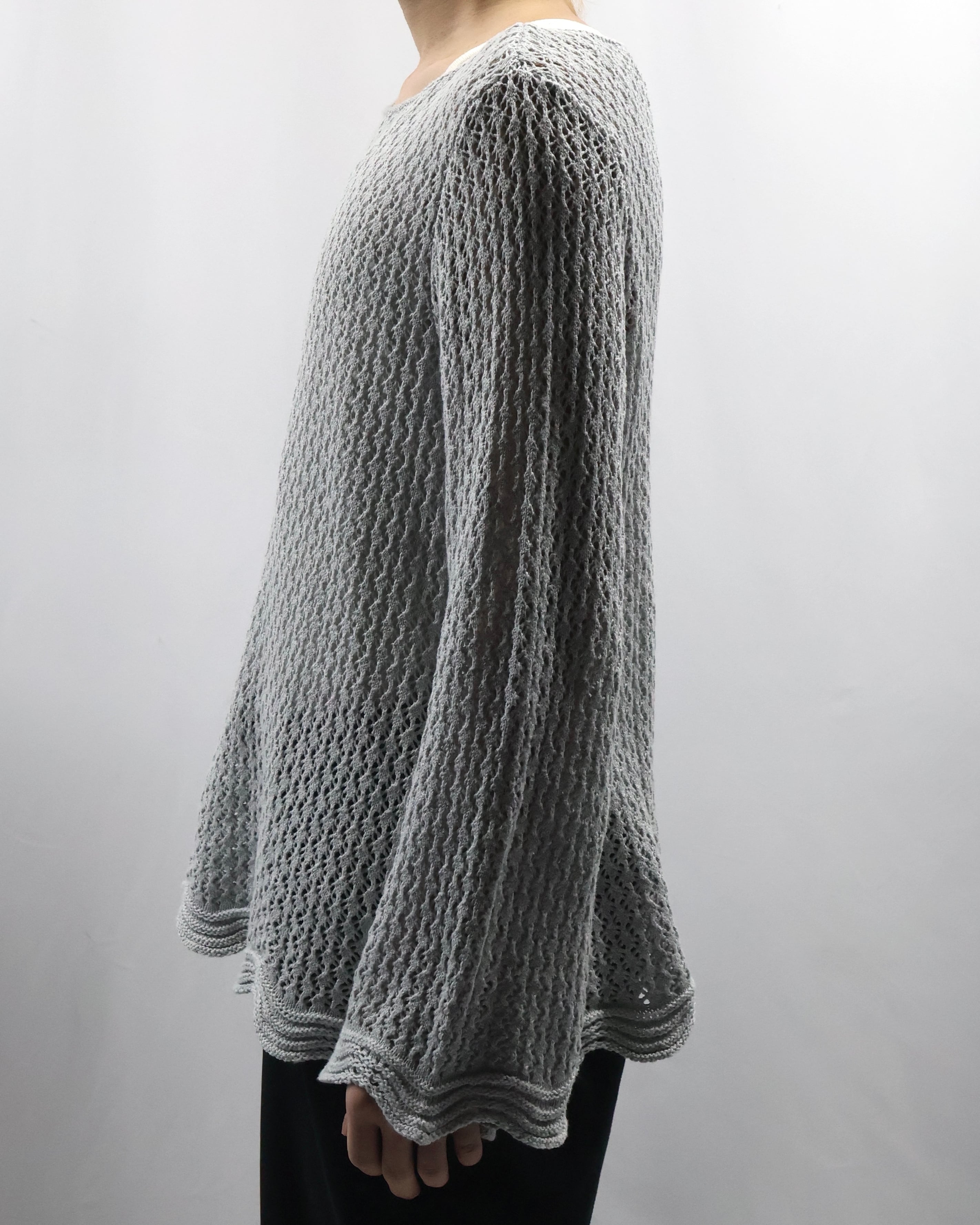 シンプルながら存在感のある一枚。淡いグレーのトーンが柔らかく、上品でクリーンな印象。裾と袖口の波打つデザインがさりげないアクセントになっていてレイヤードスタイルもしやすいアイテム。