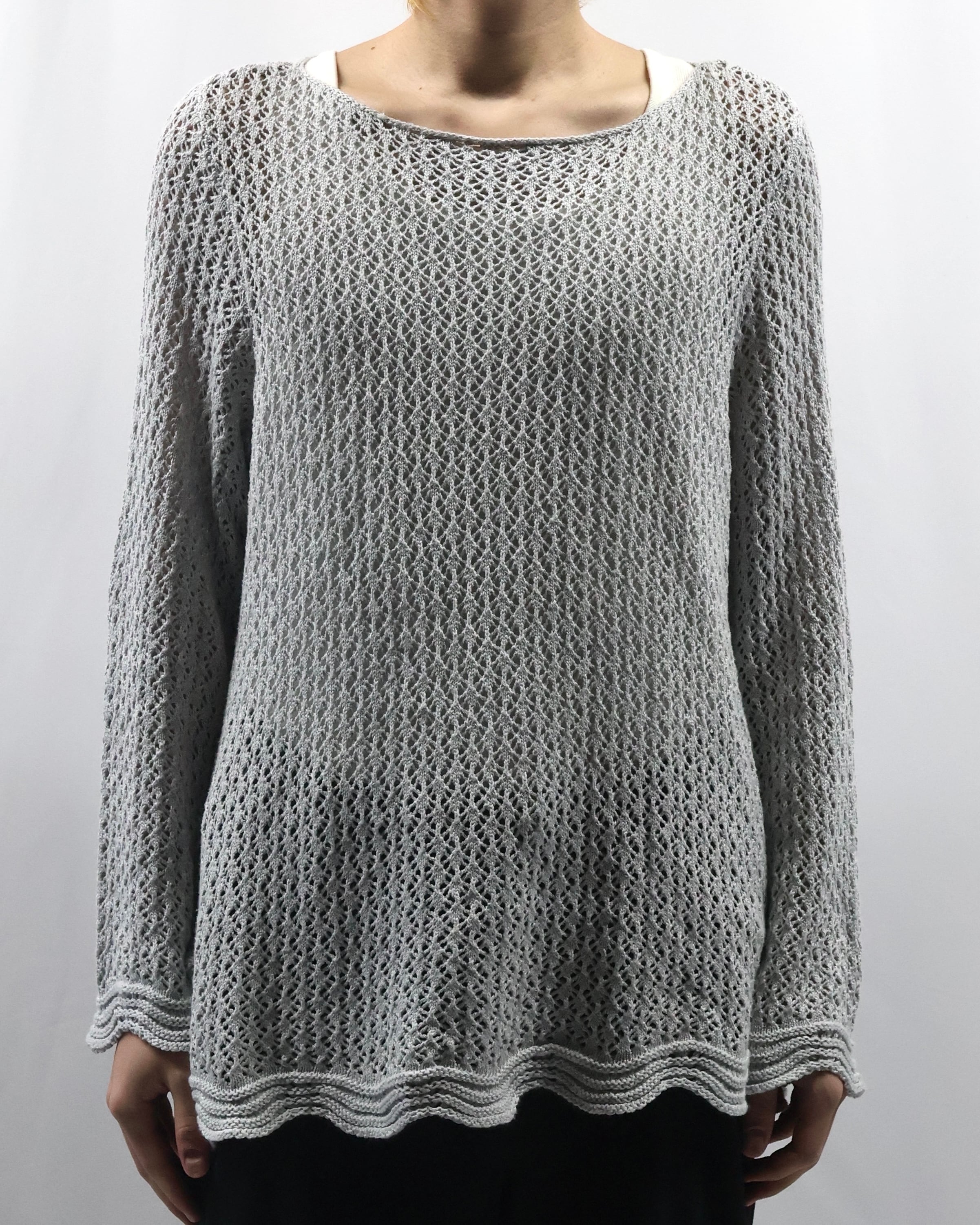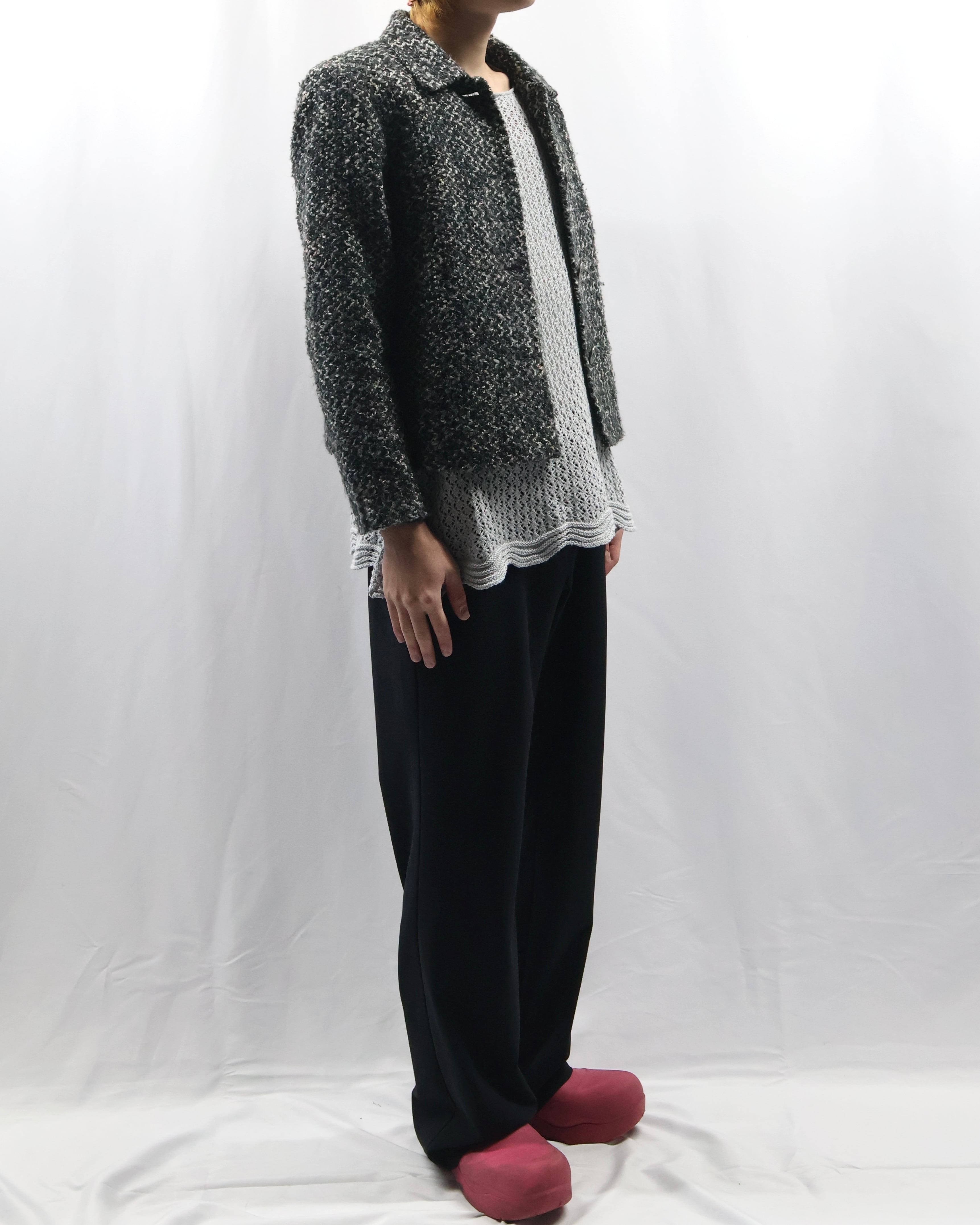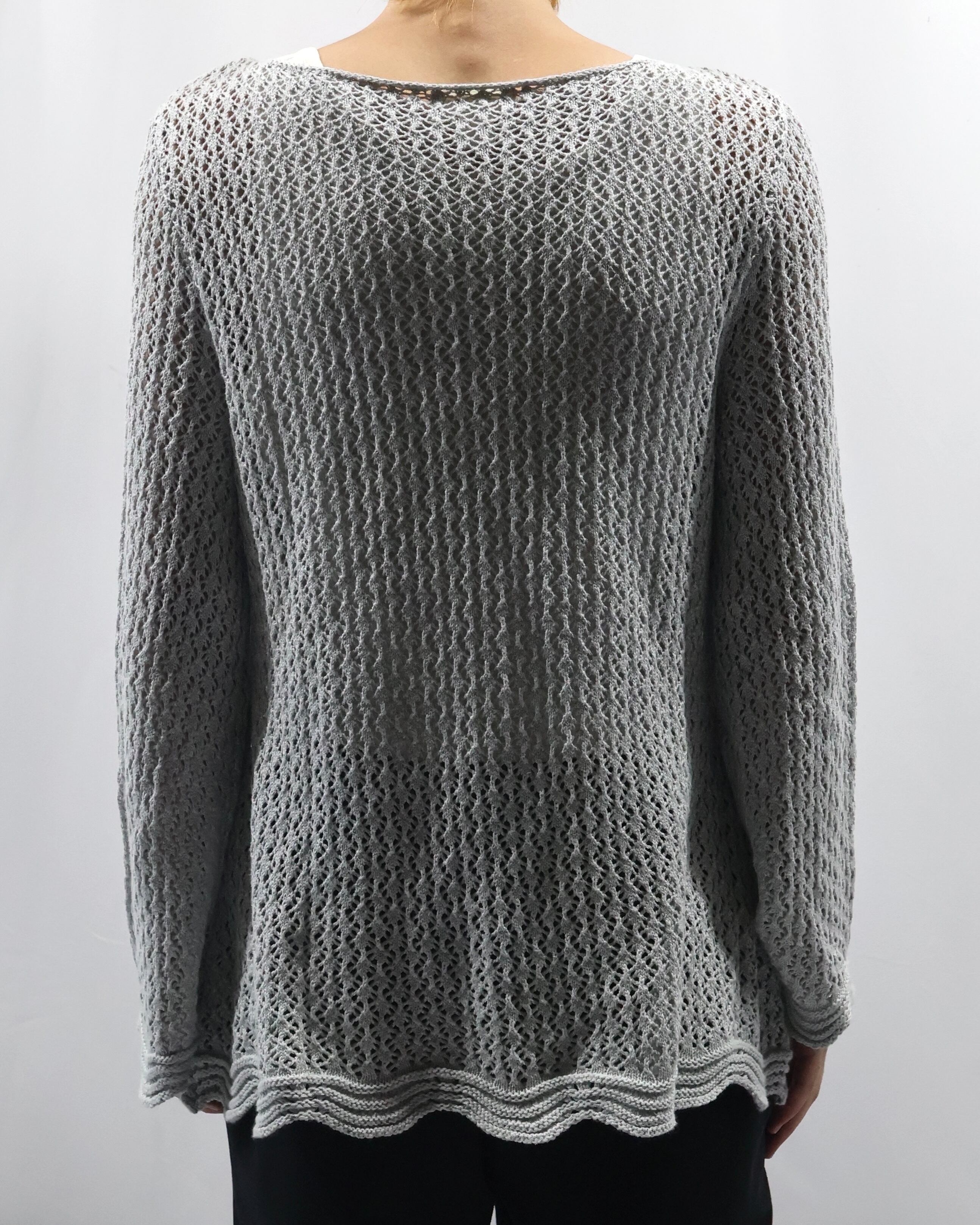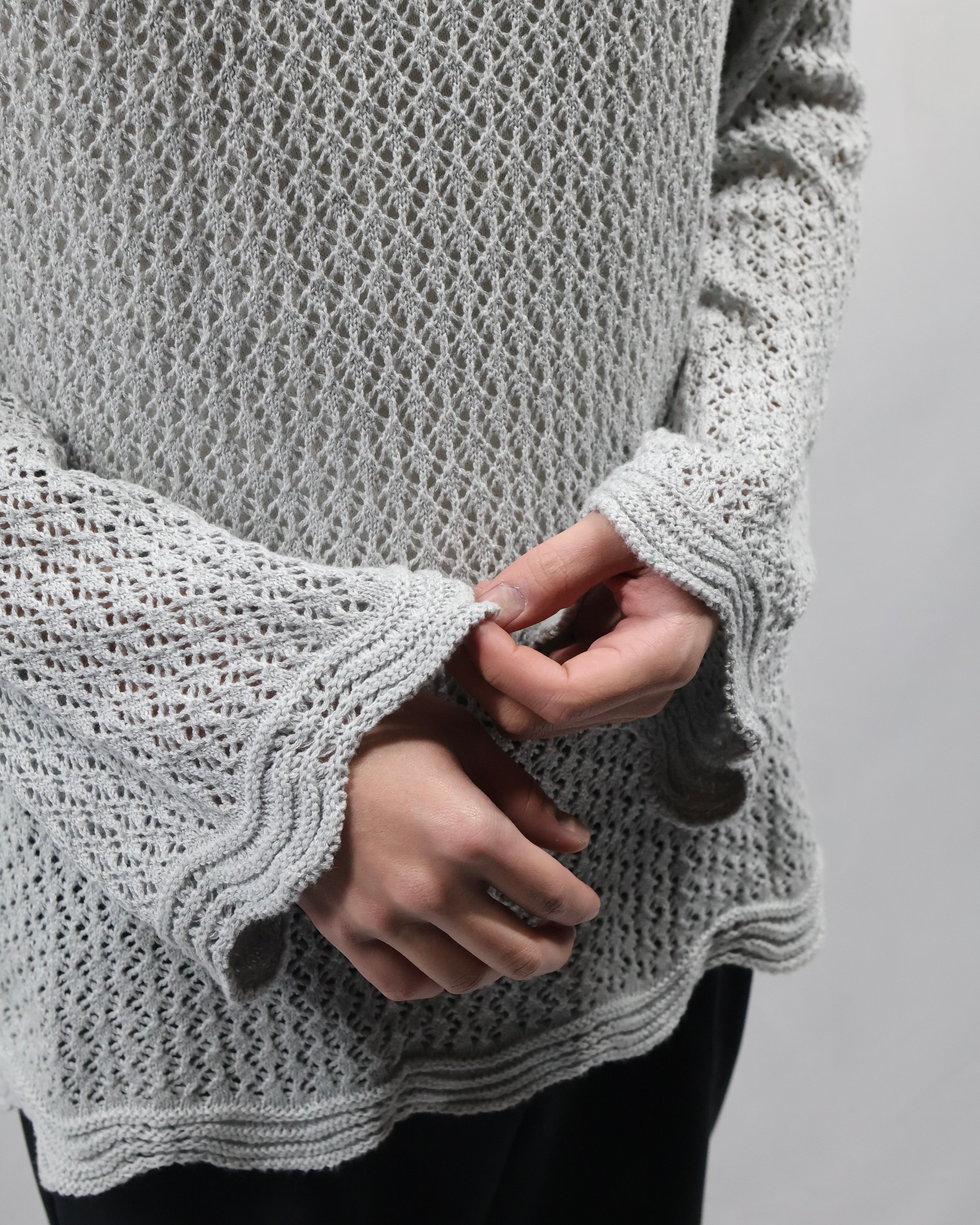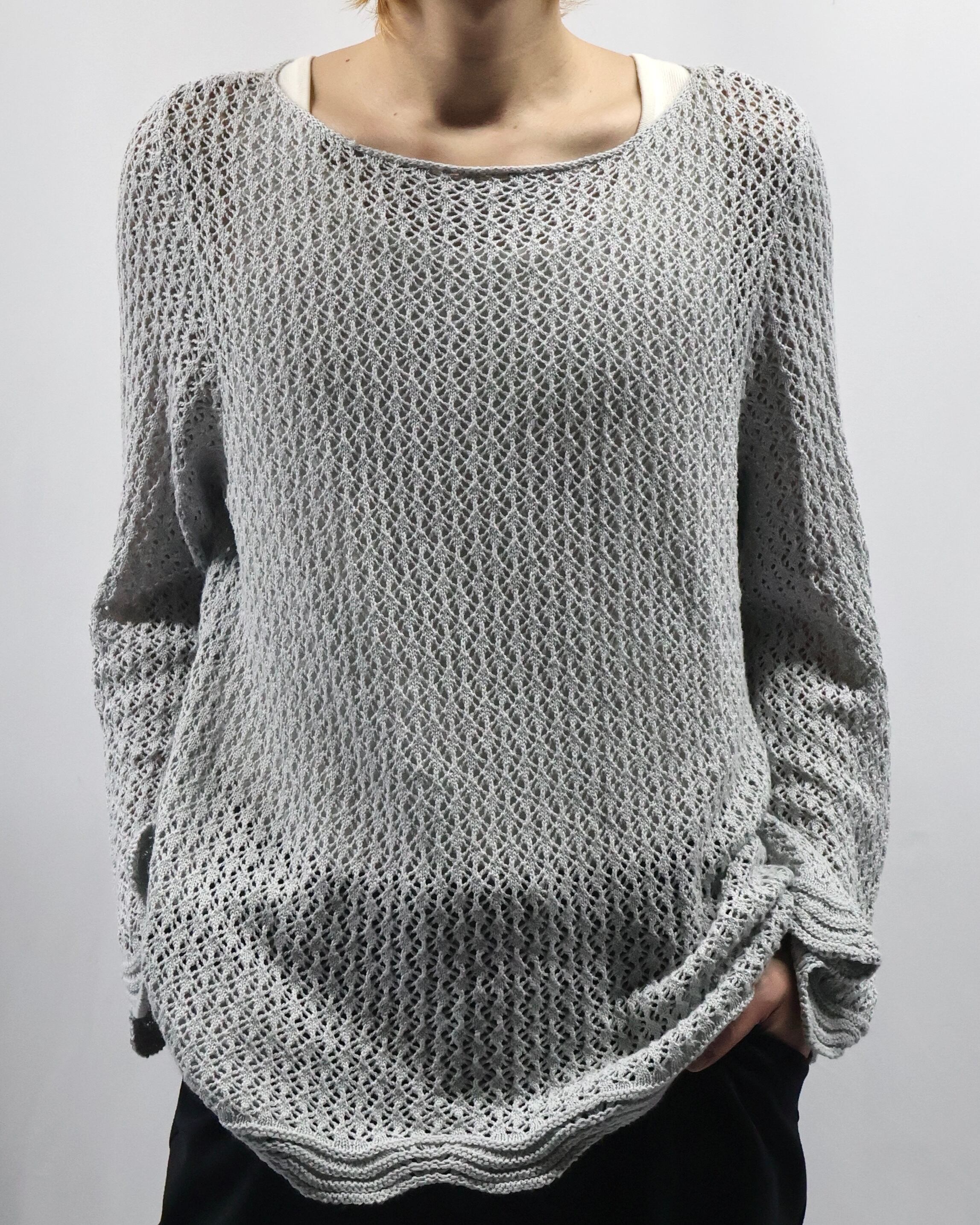 シンプルながら存在感のある一枚。淡いグレーのトーンが柔らかく、上品でクリーンな印象。裾と袖口の波打つデザインがさりげないアクセントになっていてレイヤードスタイルもしやすいアイテム。