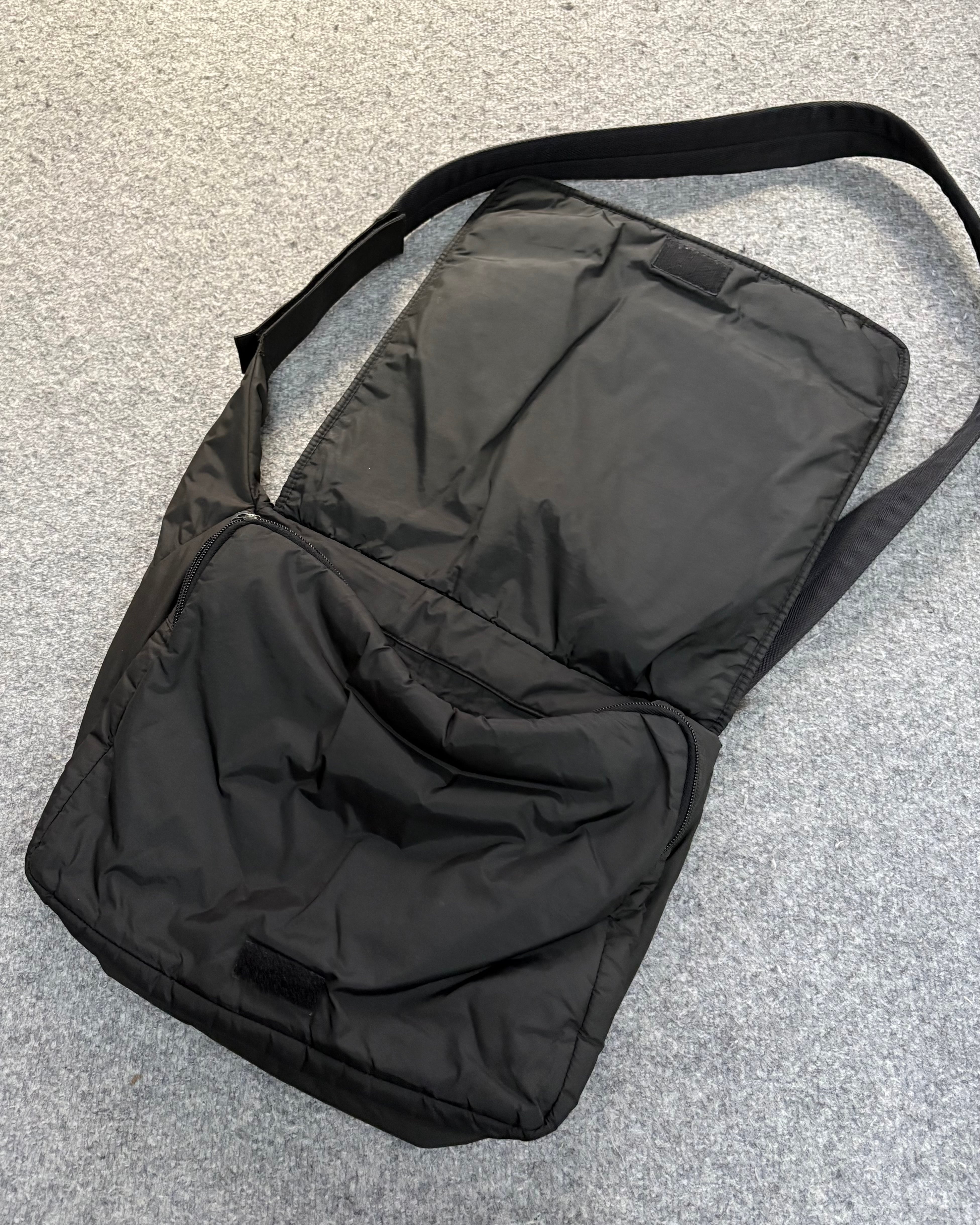 軽量で肩掛けしやすいストラップが実用性を高め、ミニマルながら存在感のあるデザインが引き立ちます