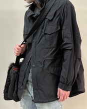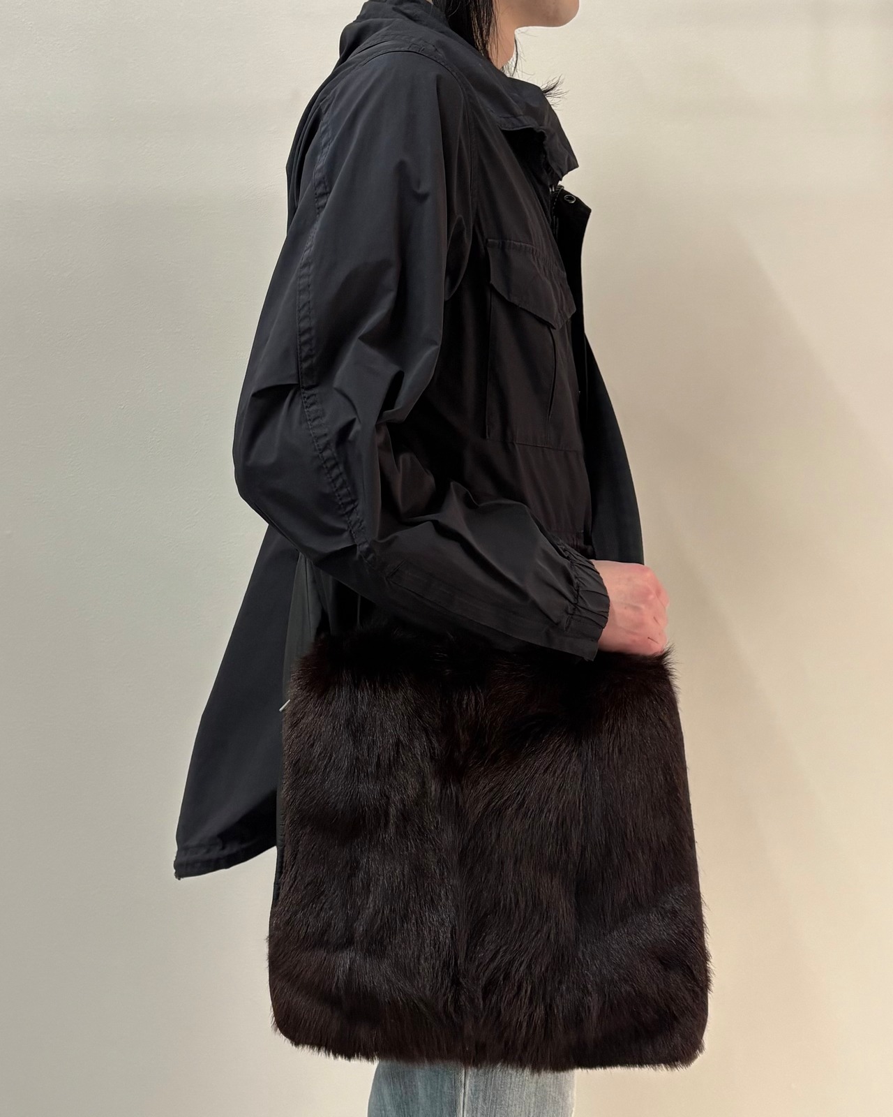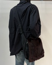 ダークブラウンの滑らかなフェイクファーを前面にあしらい、スポーティなナイロン素材とのコントラストが特徴。