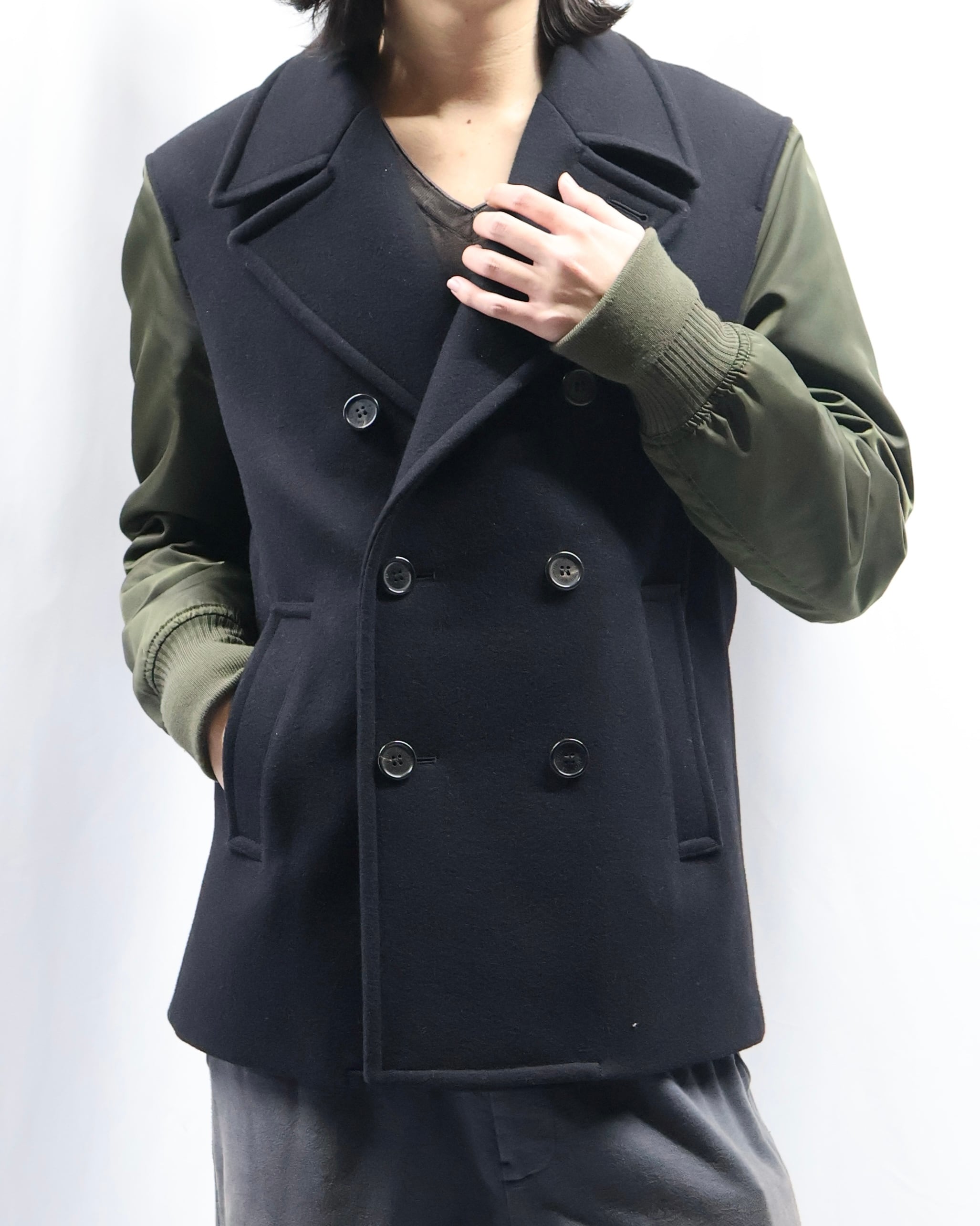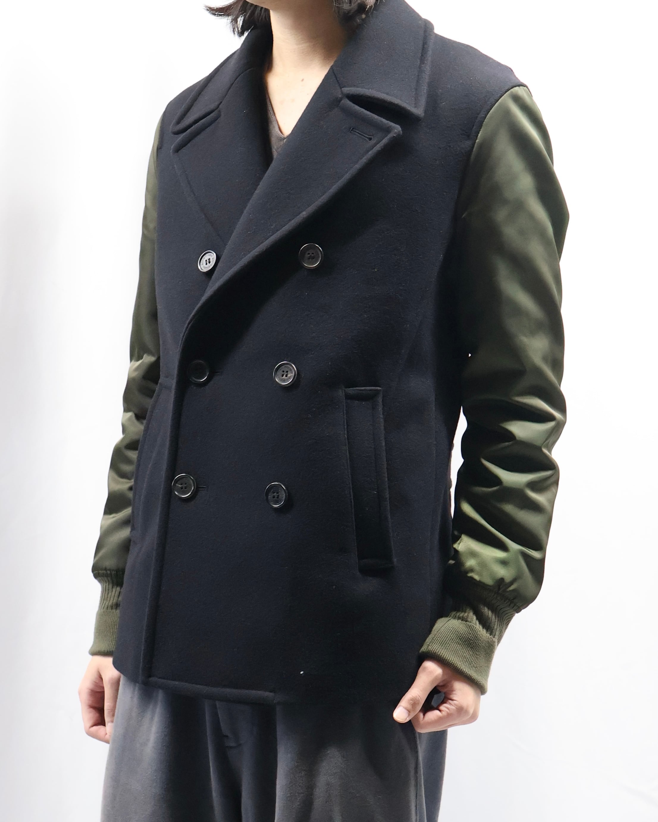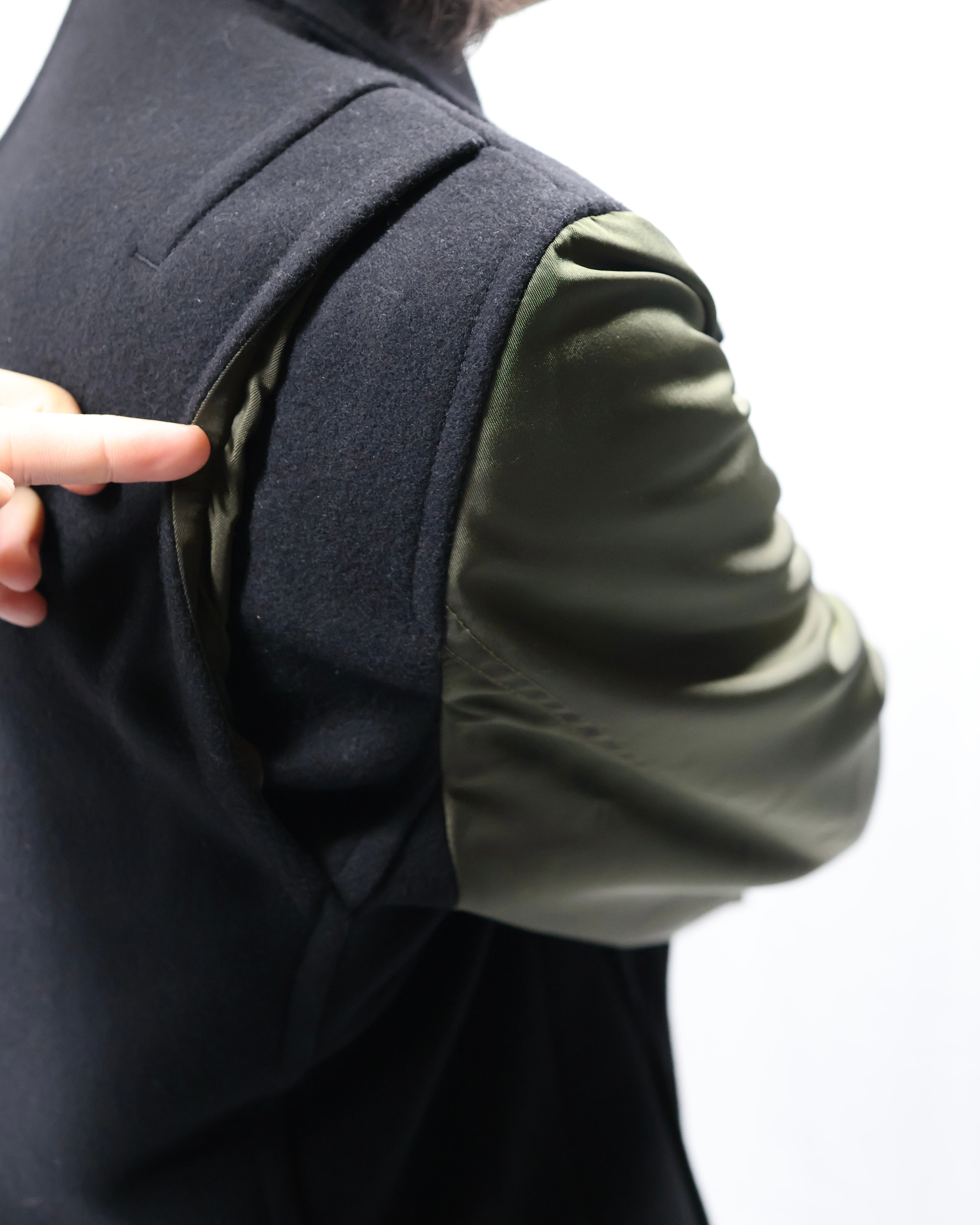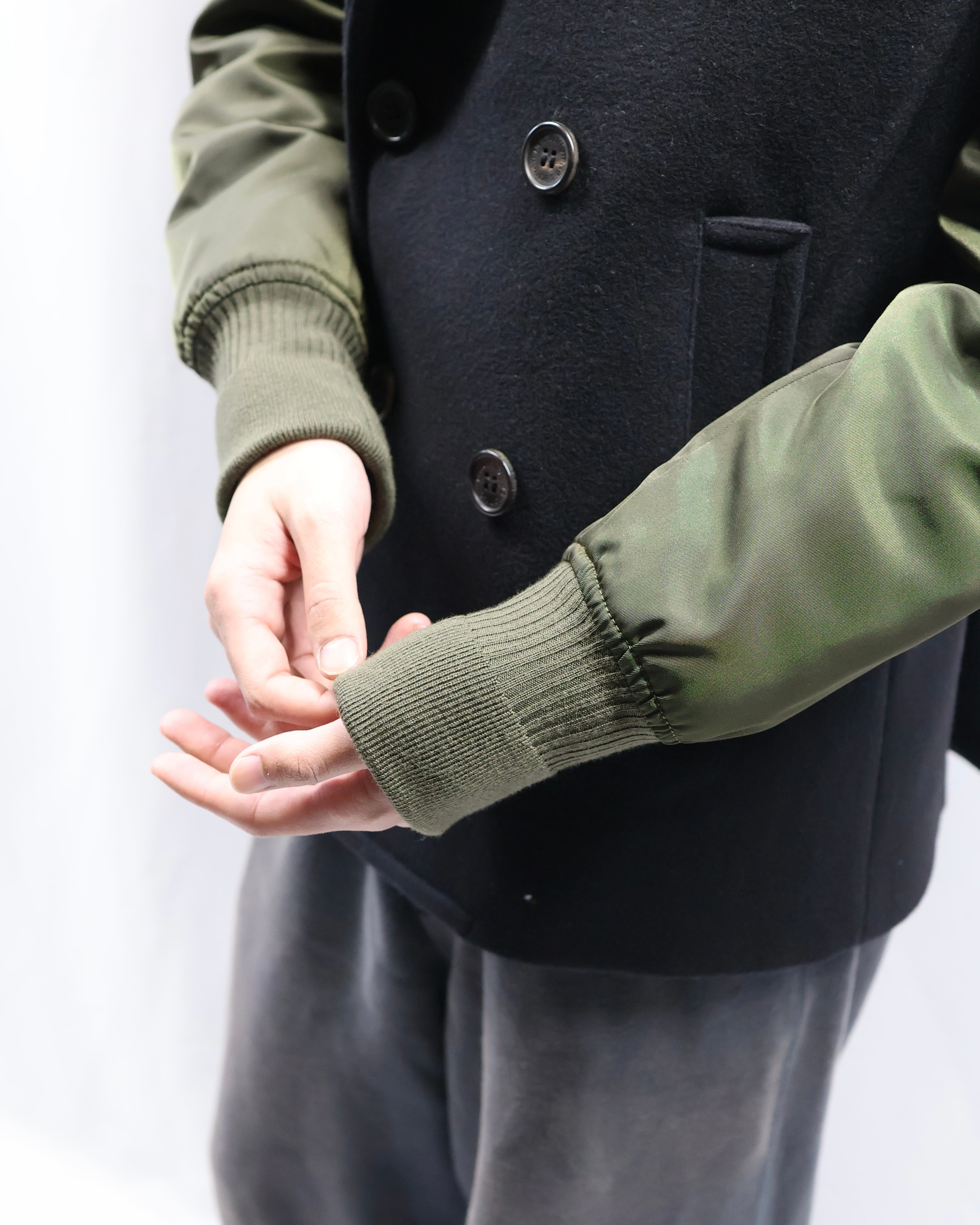 ウール素材でキレイな印象がありながらナイロン素材の袖切り替えがあるため多系統に着用できる汎用性のあるアイテム。