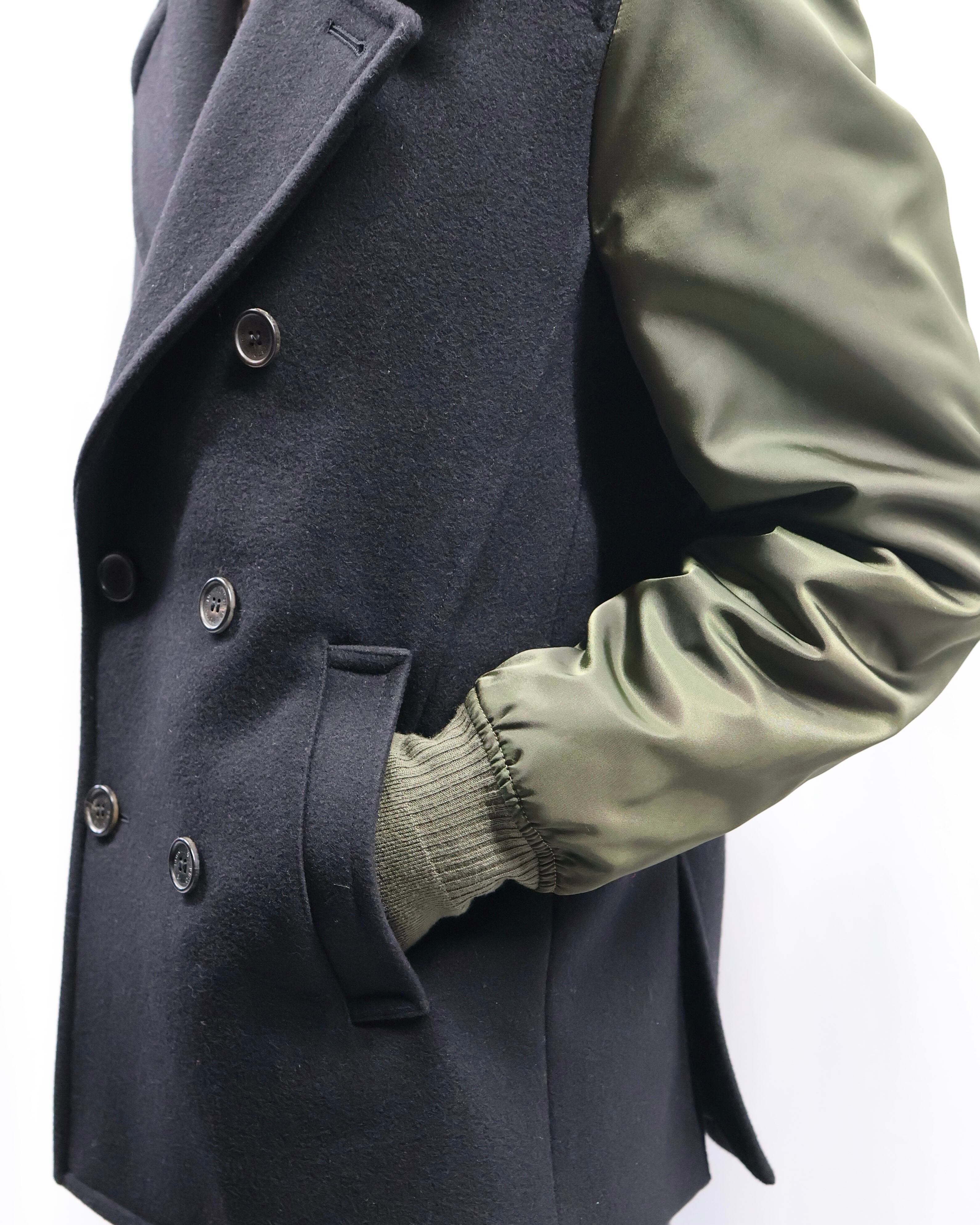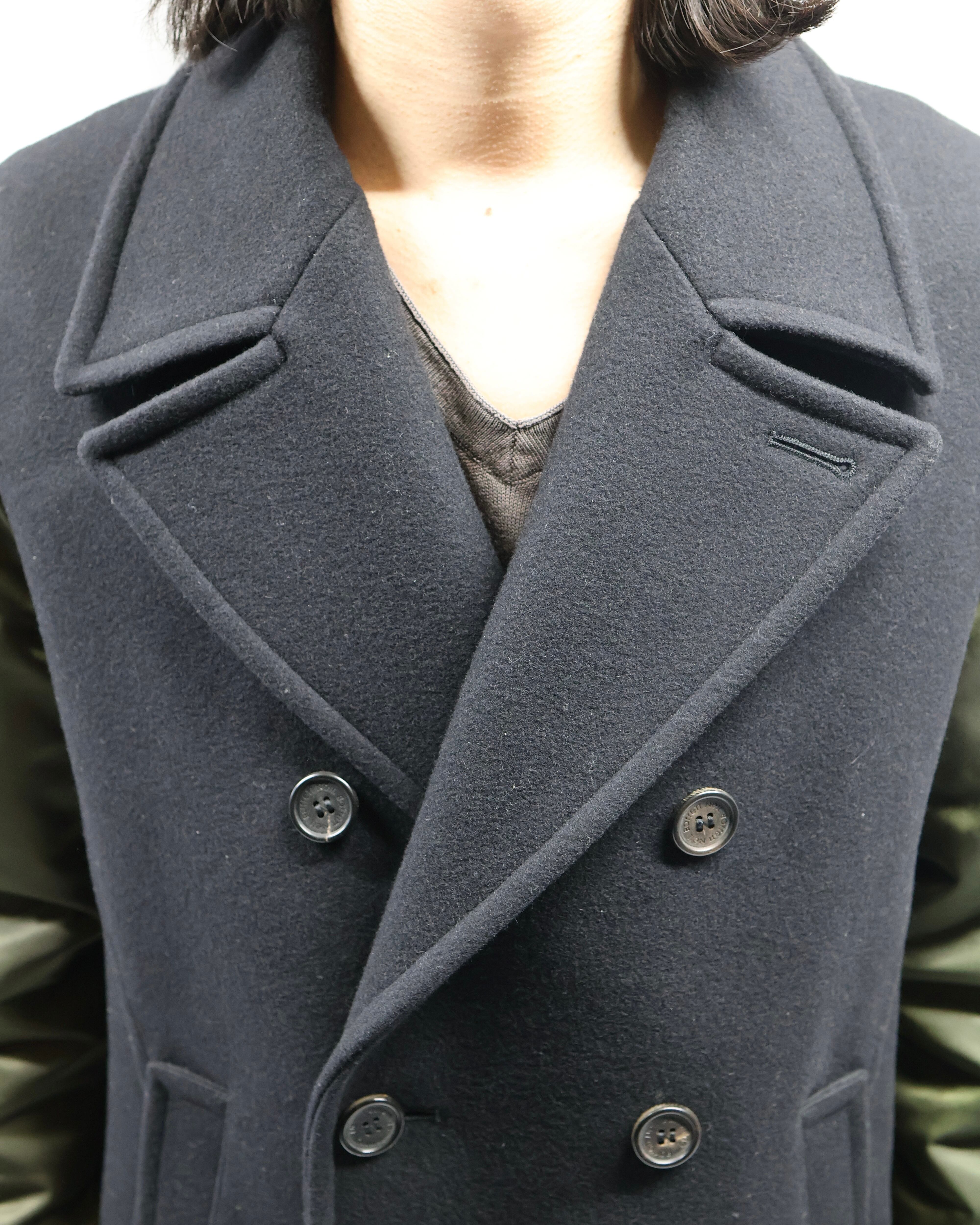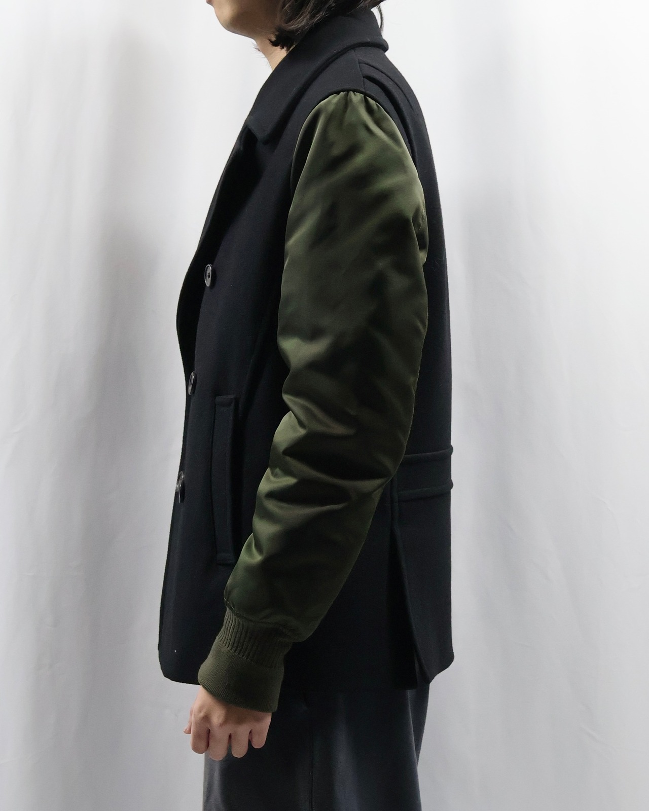 ウール素材でキレイな印象がありながらナイロン素材の袖切り替えがあるため多系統に着用できる汎用性のあるアイテム。