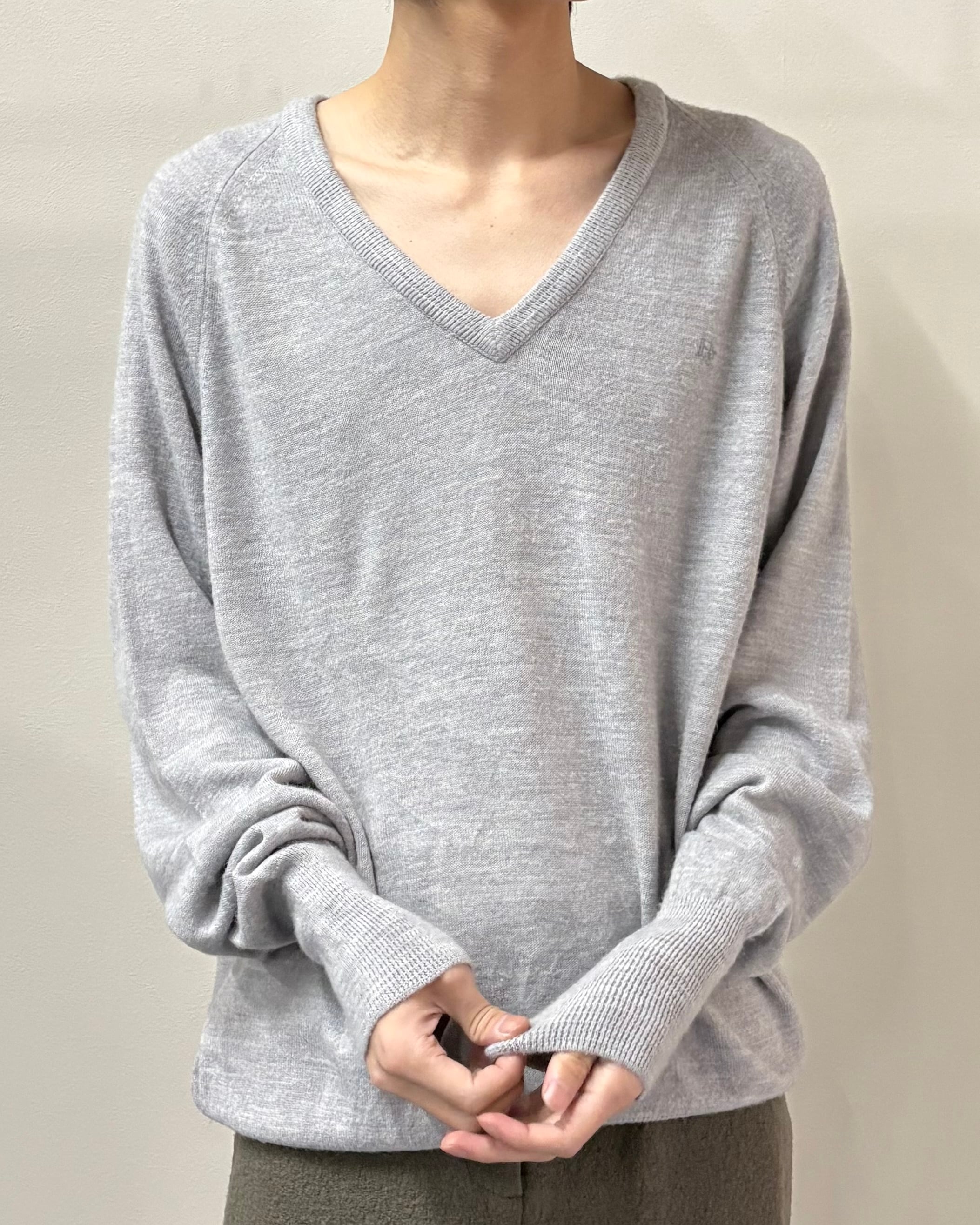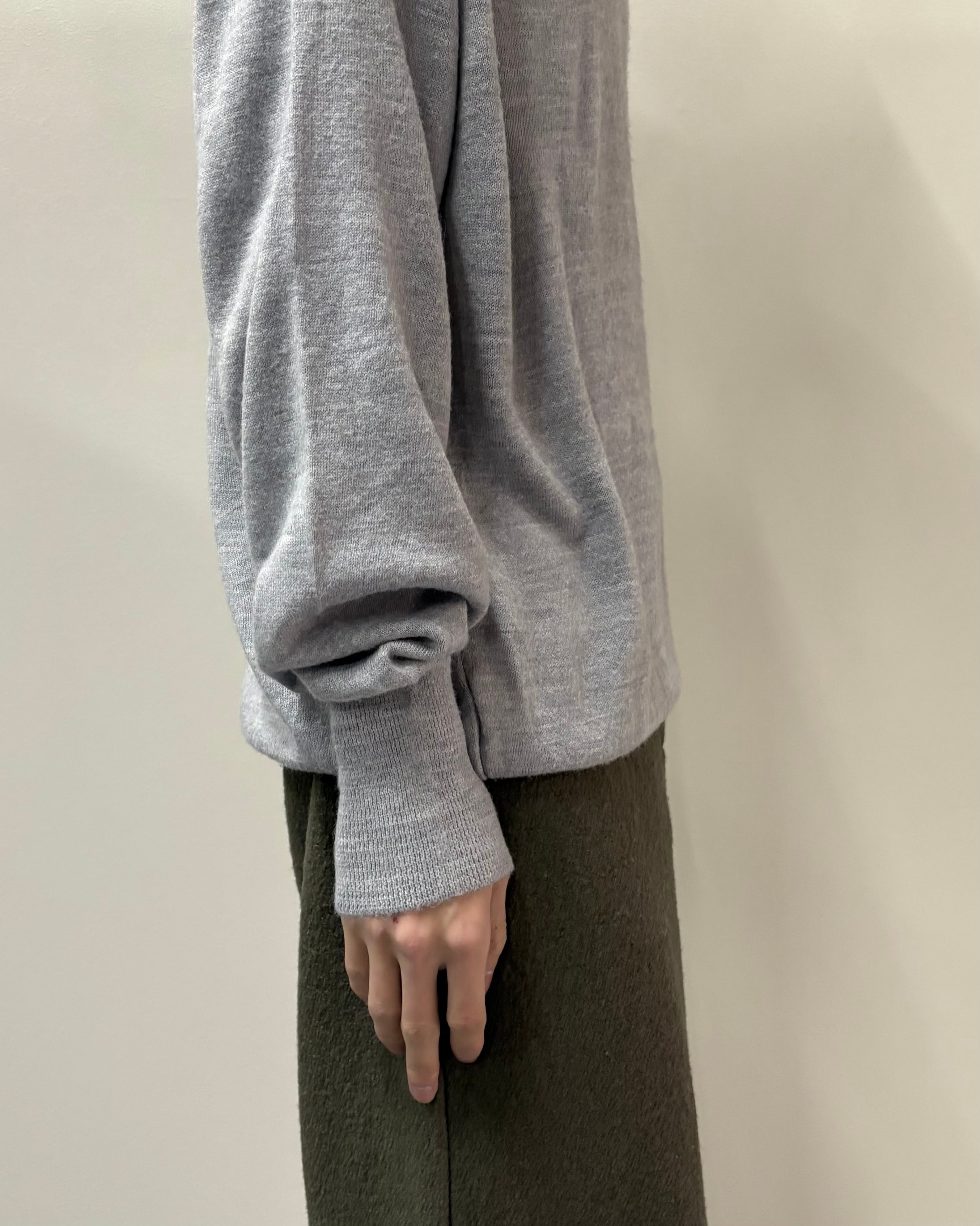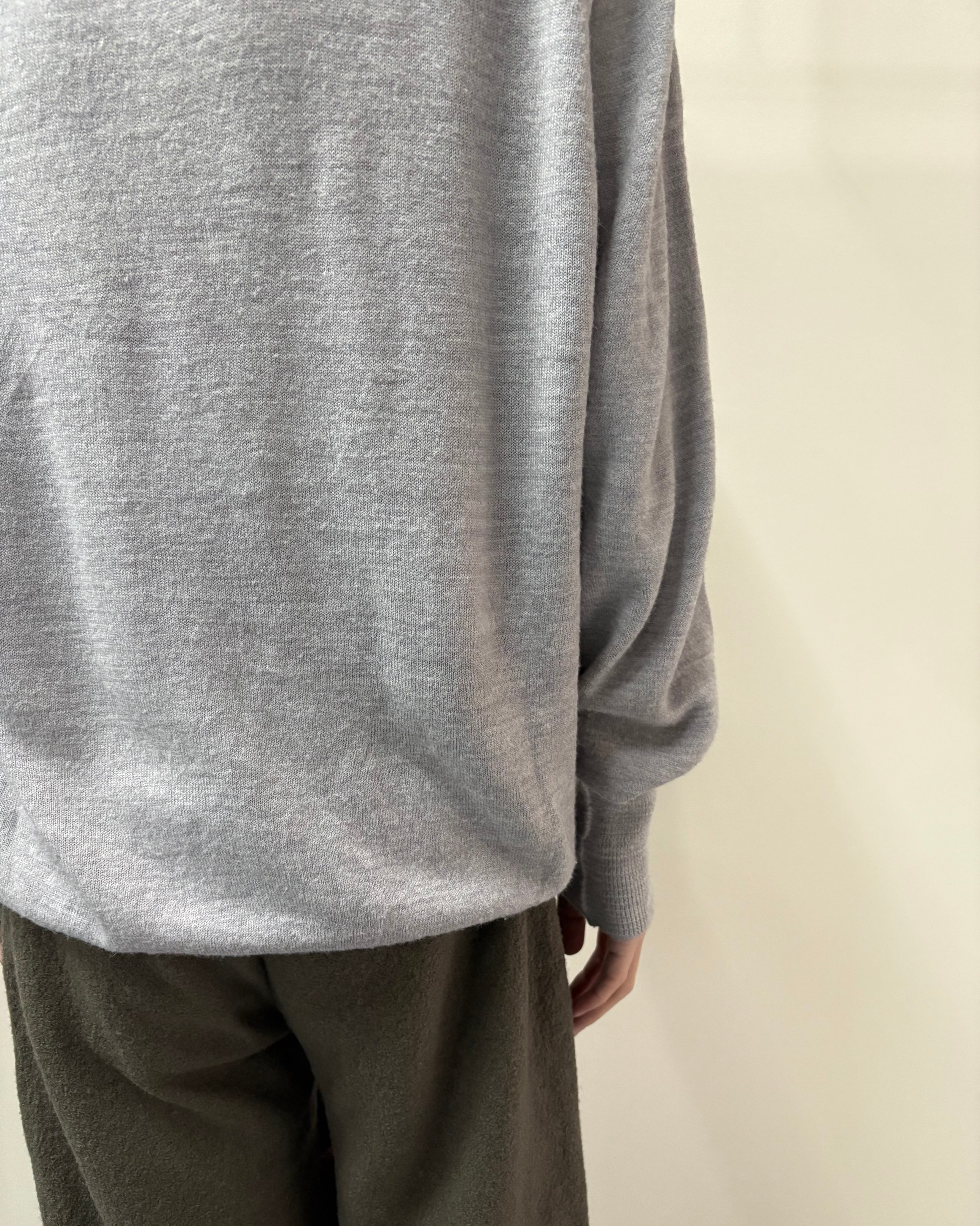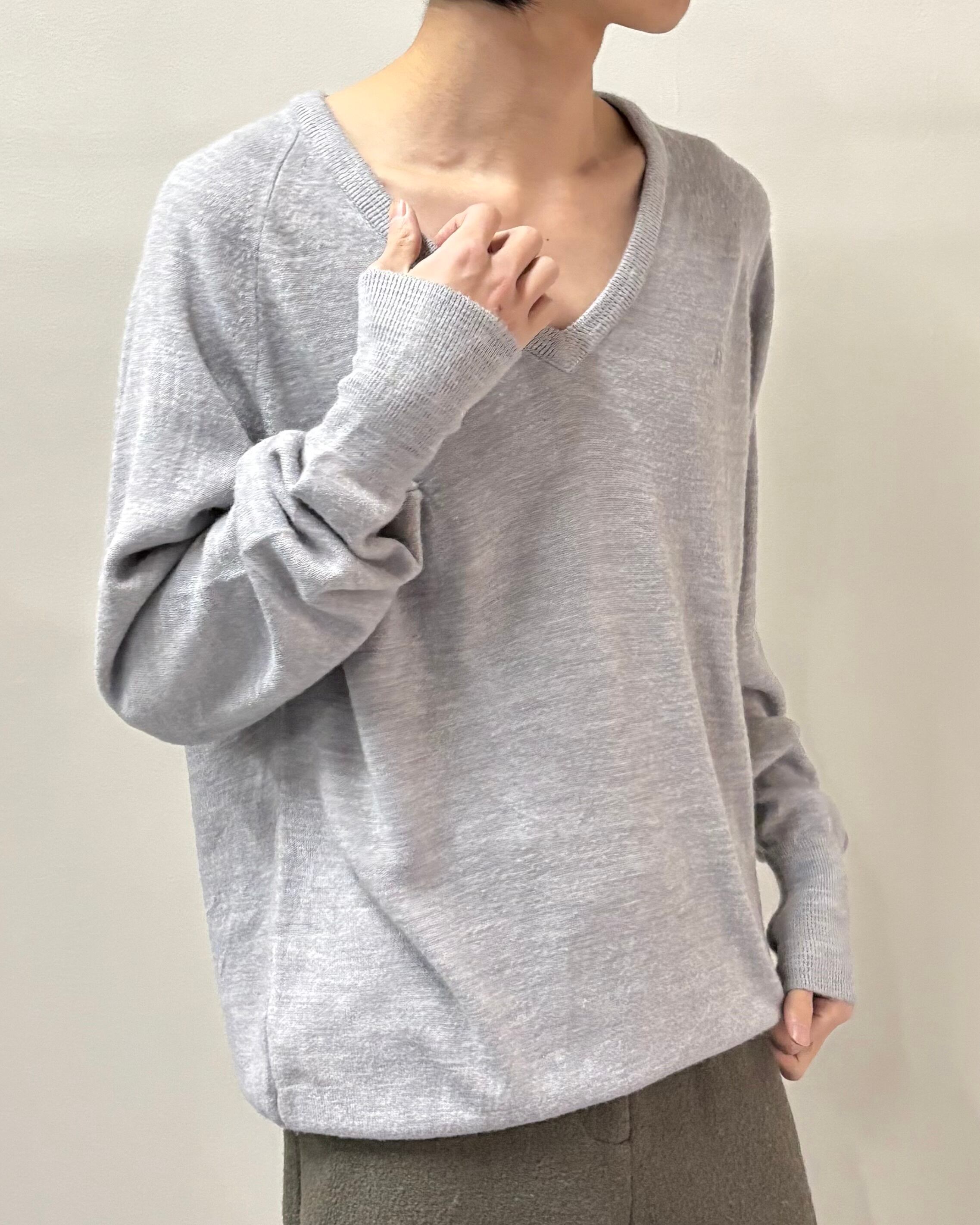 落ち着きのあるグレーカラーがモダンな表情を与え、深すぎないネックの開きによりどこか気品さをも感じられる、1枚でもインナーとしても活躍できる1着