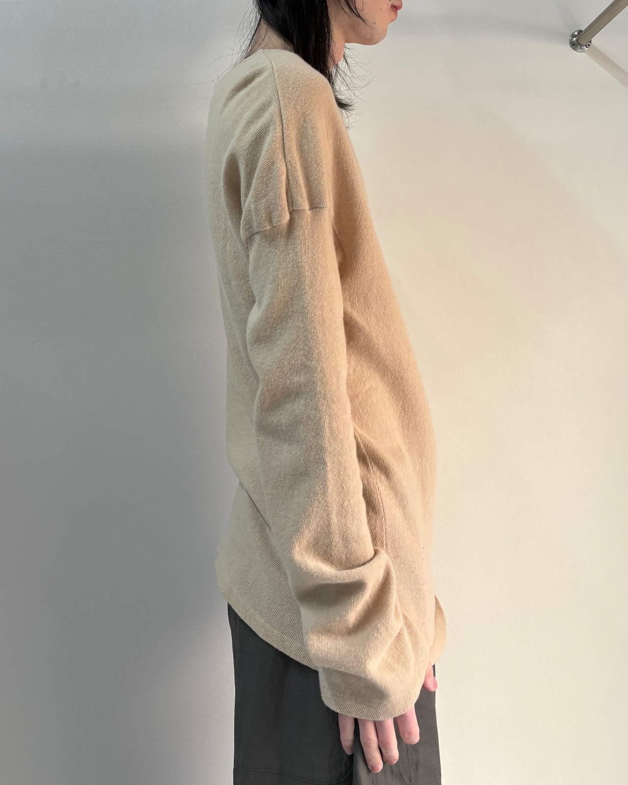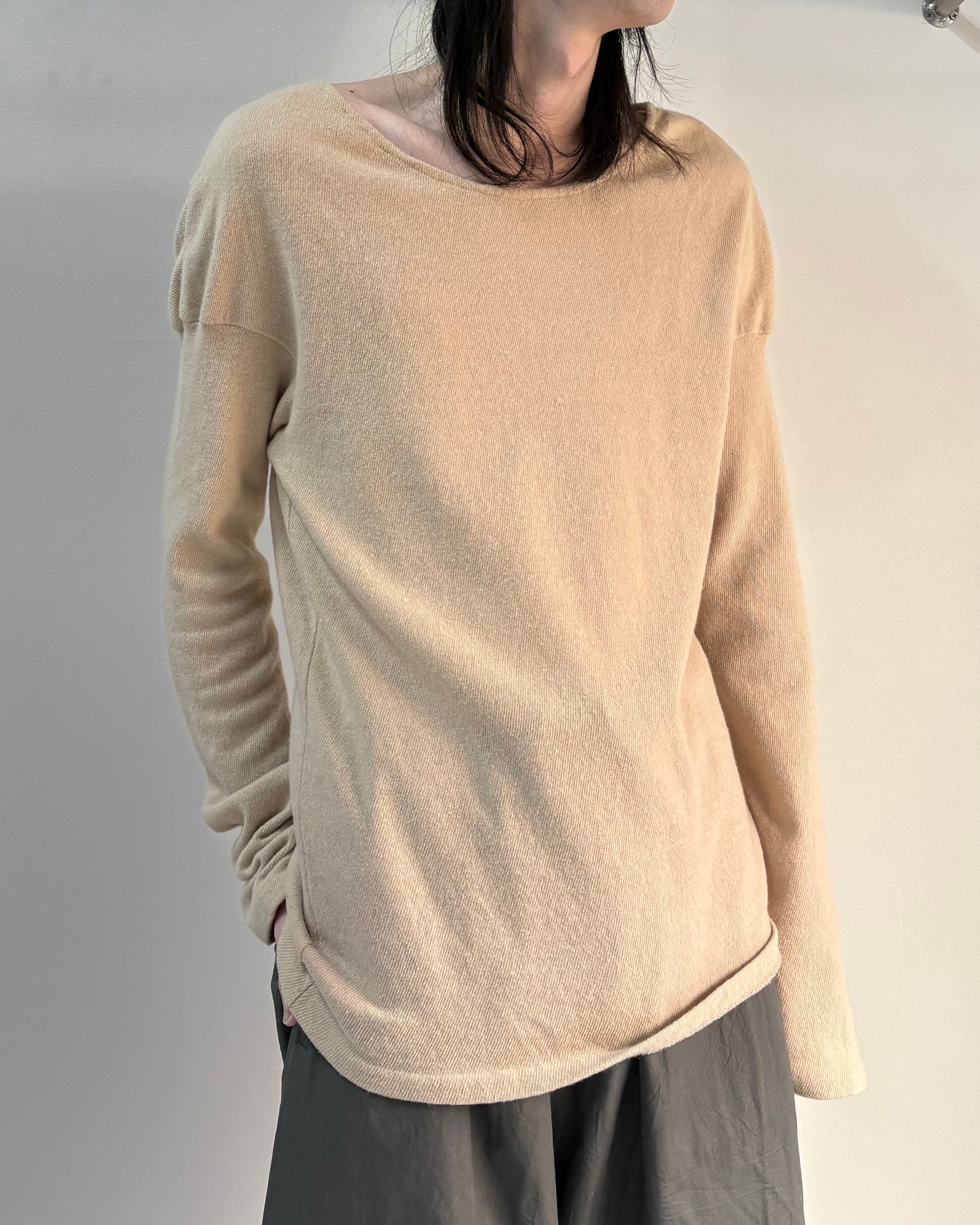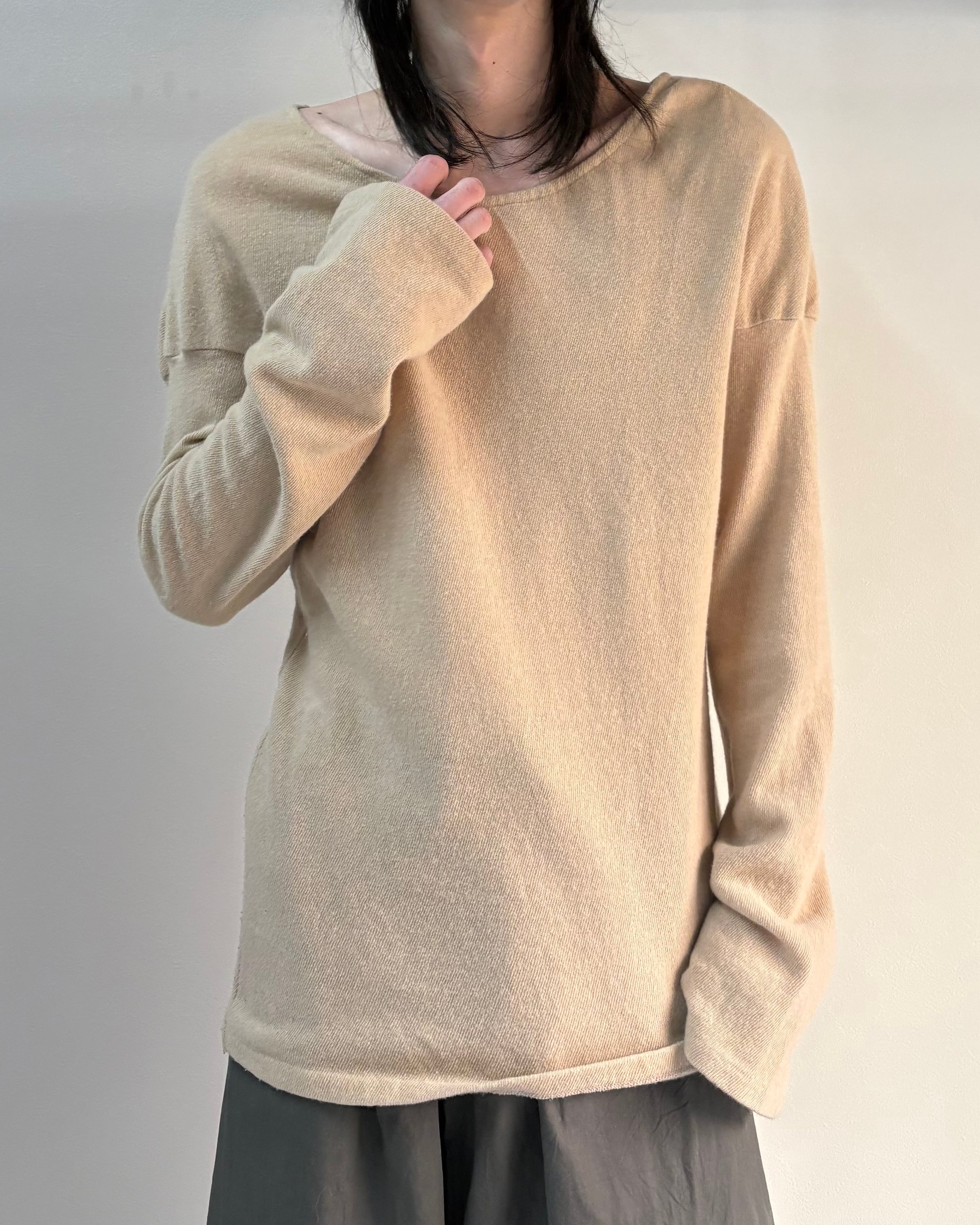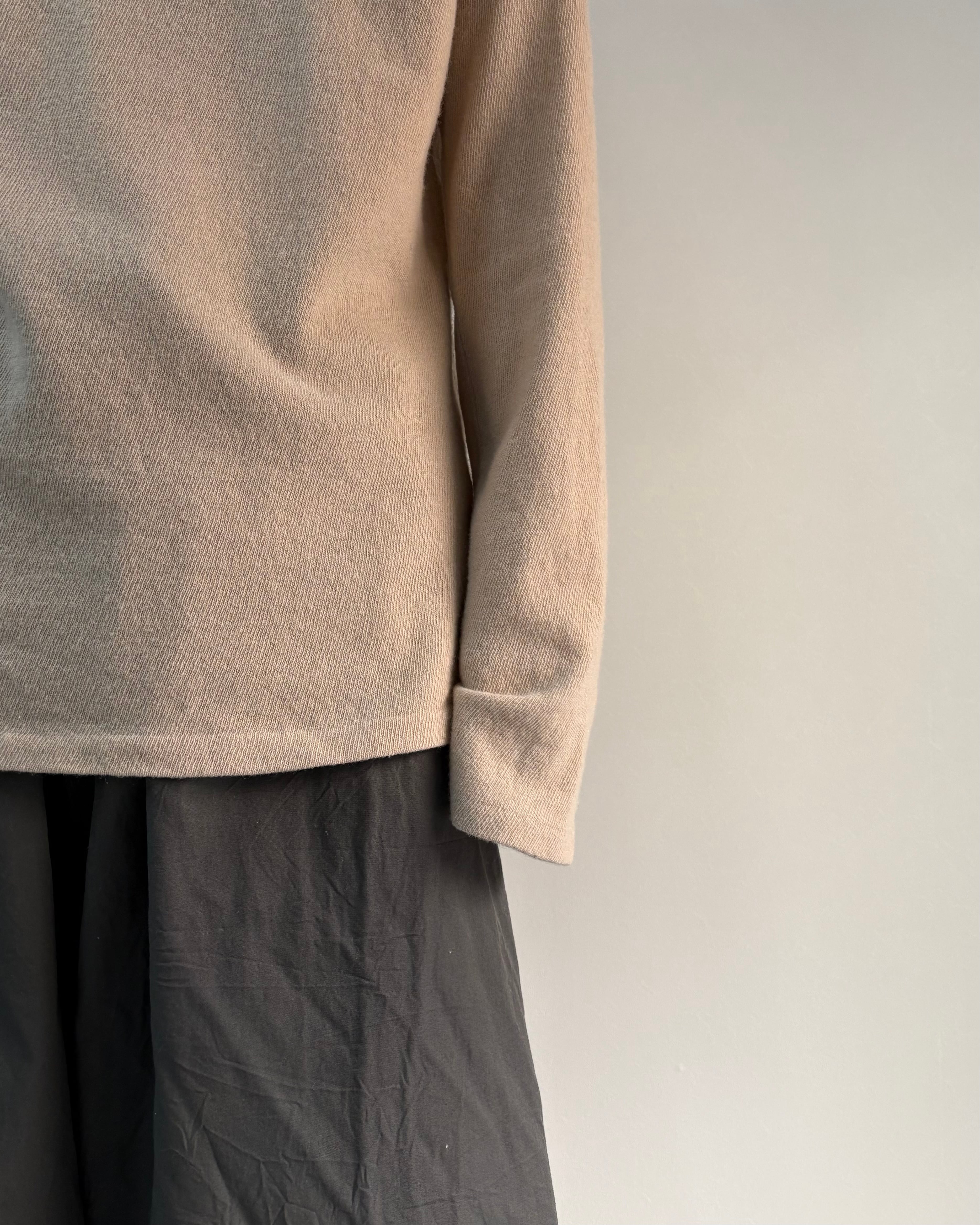 落ち着いたベージュのカラー、緩さのあるネックの開きによりシックな雰囲気を出しつつ程よい抜け感を演出できます