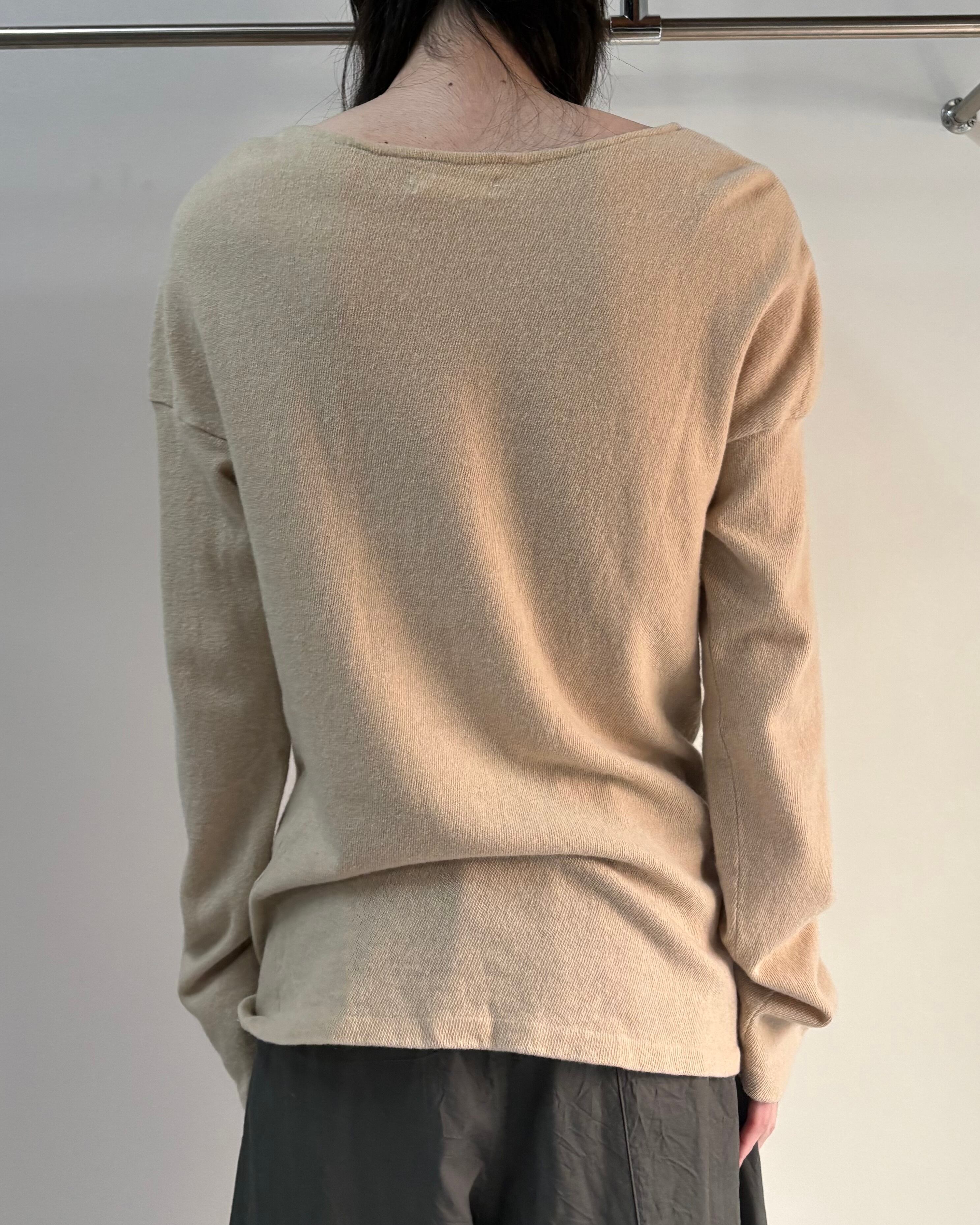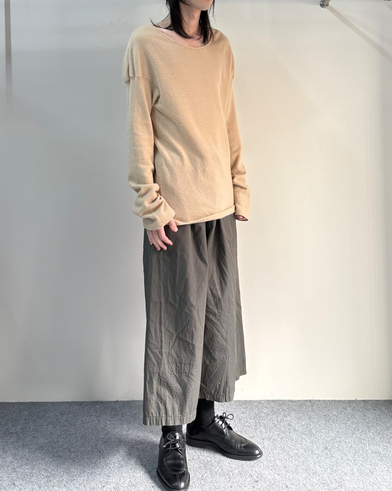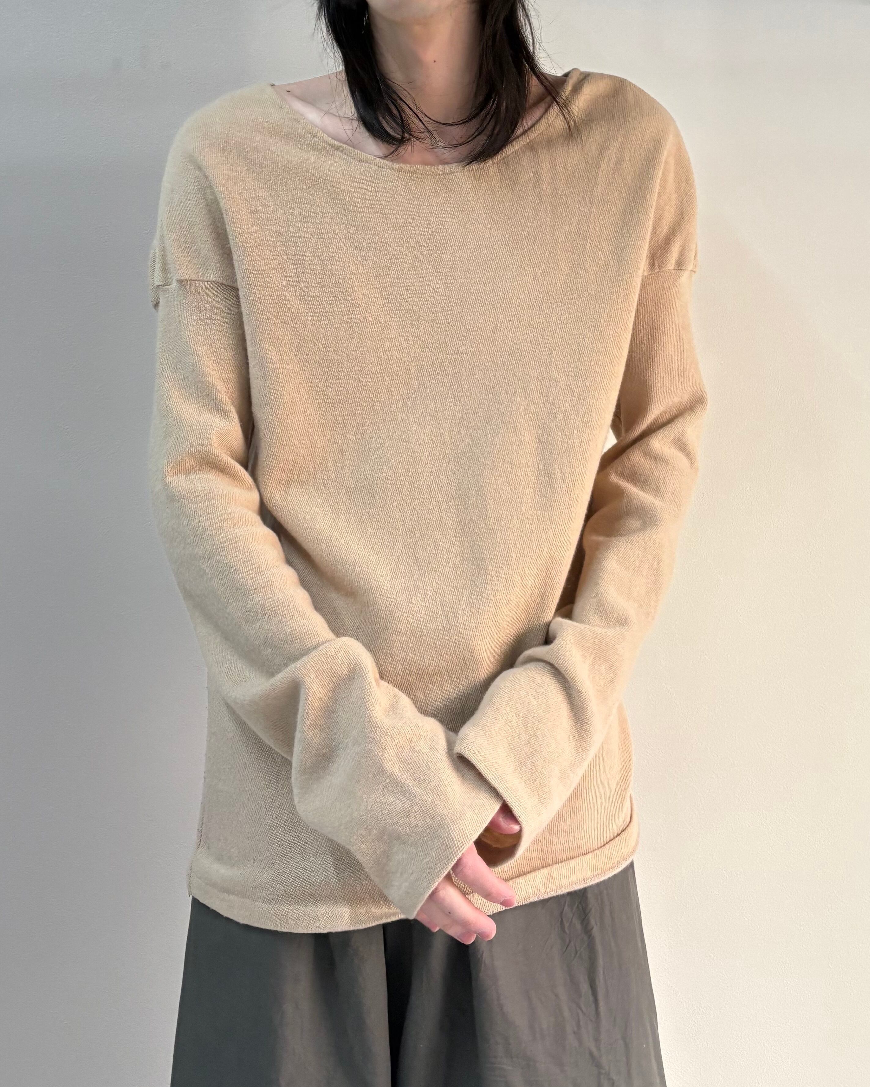 落ち着いたベージュのカラー、緩さのあるネックの開きによりシックな雰囲気を出しつつ程よい抜け感を演出できます