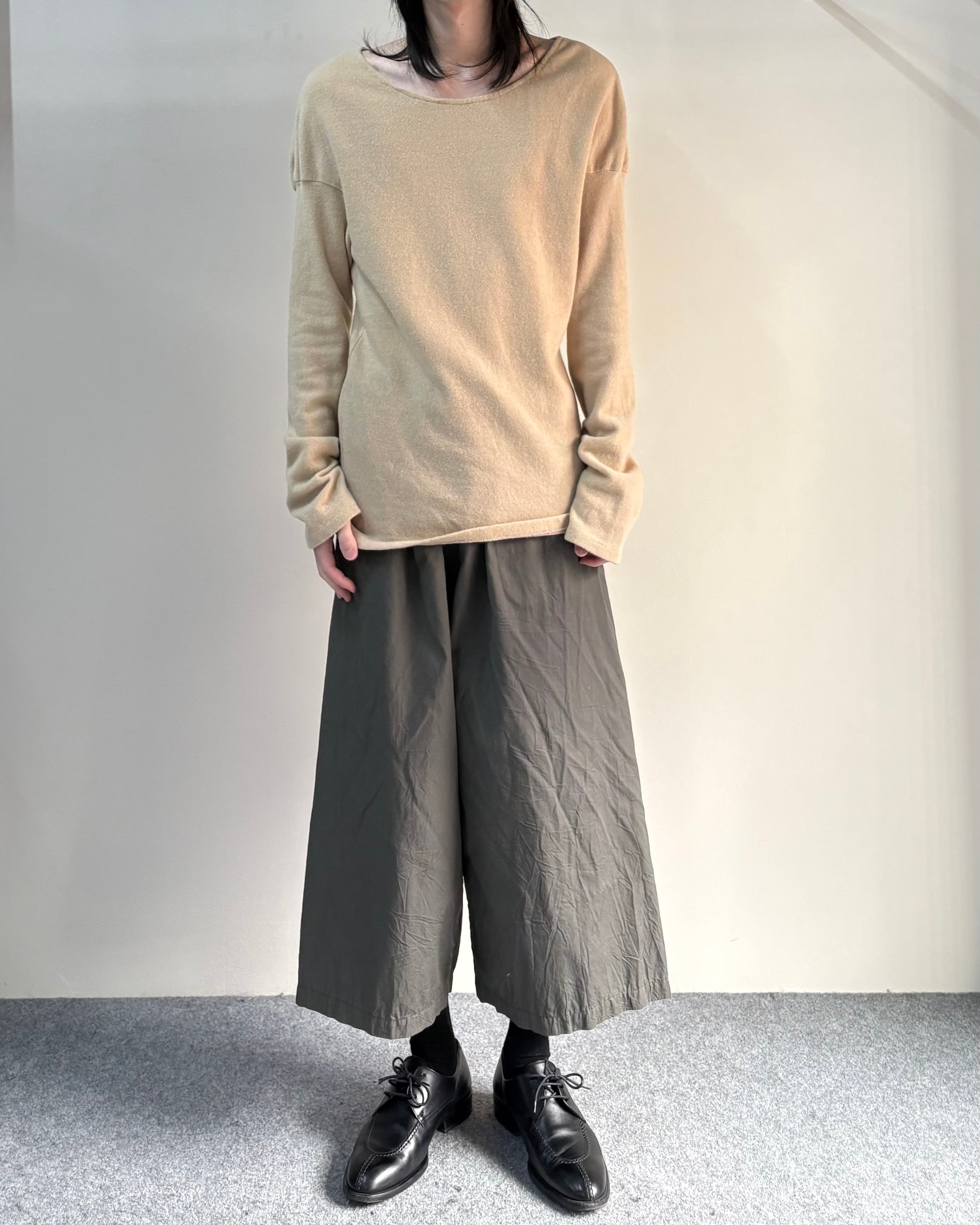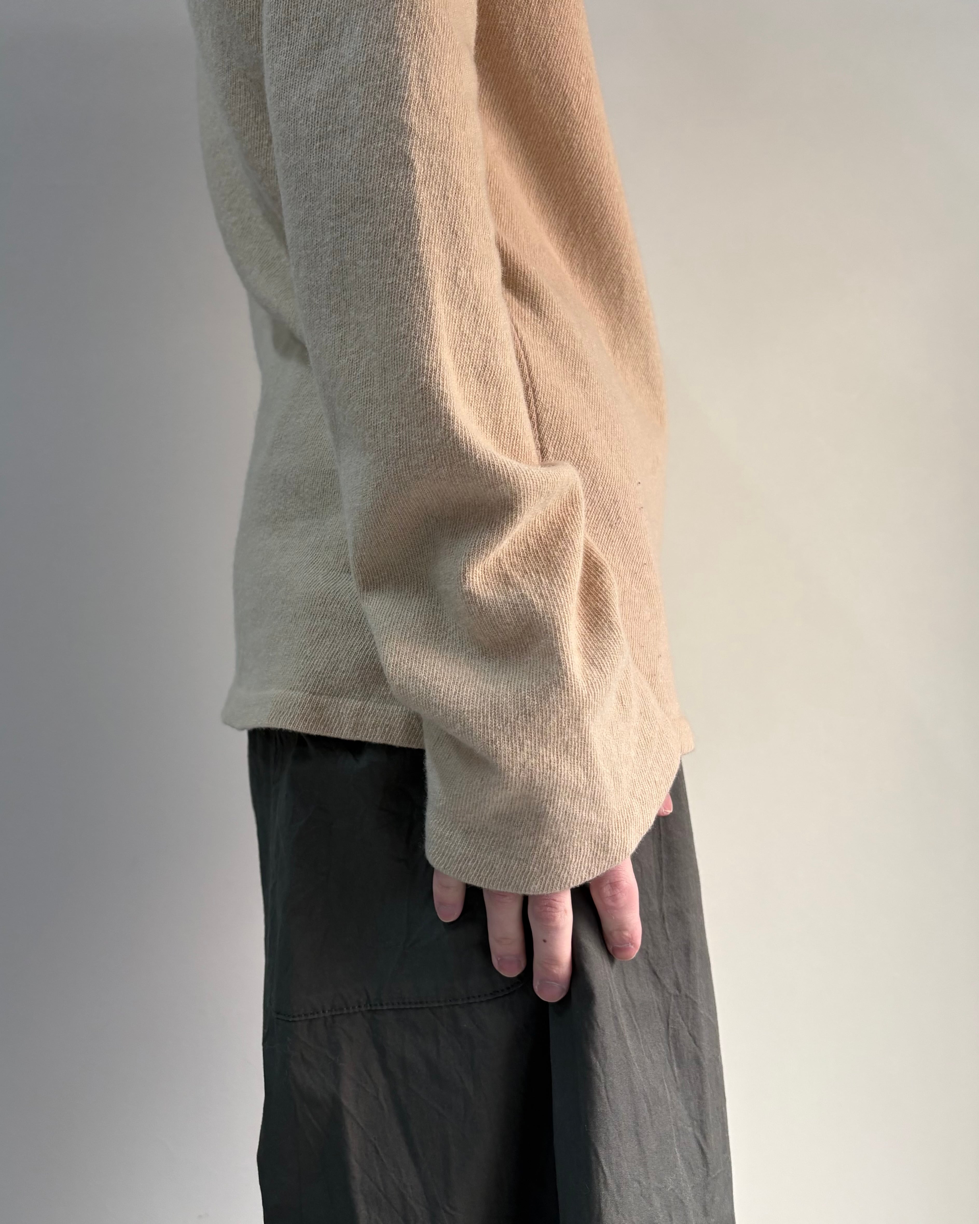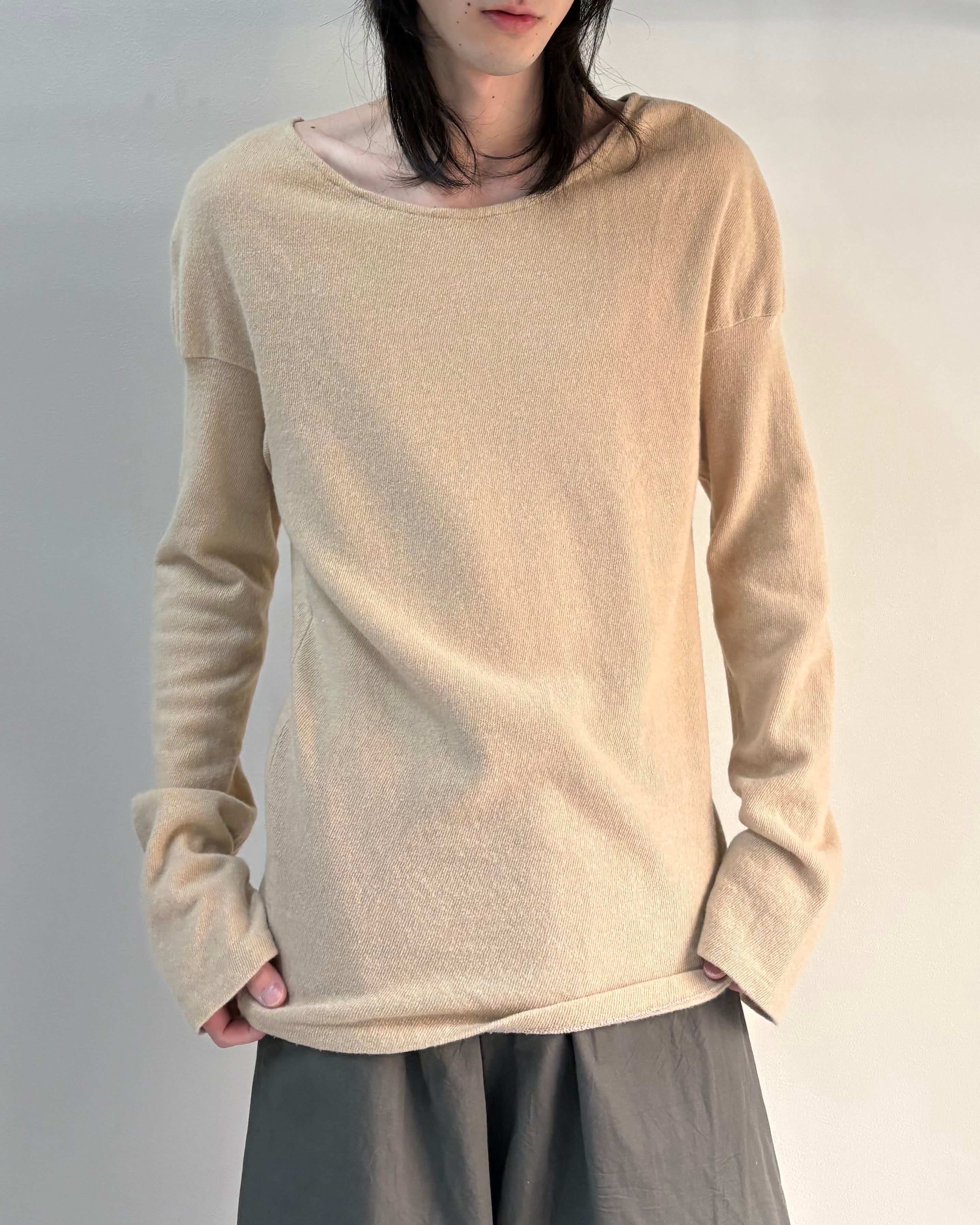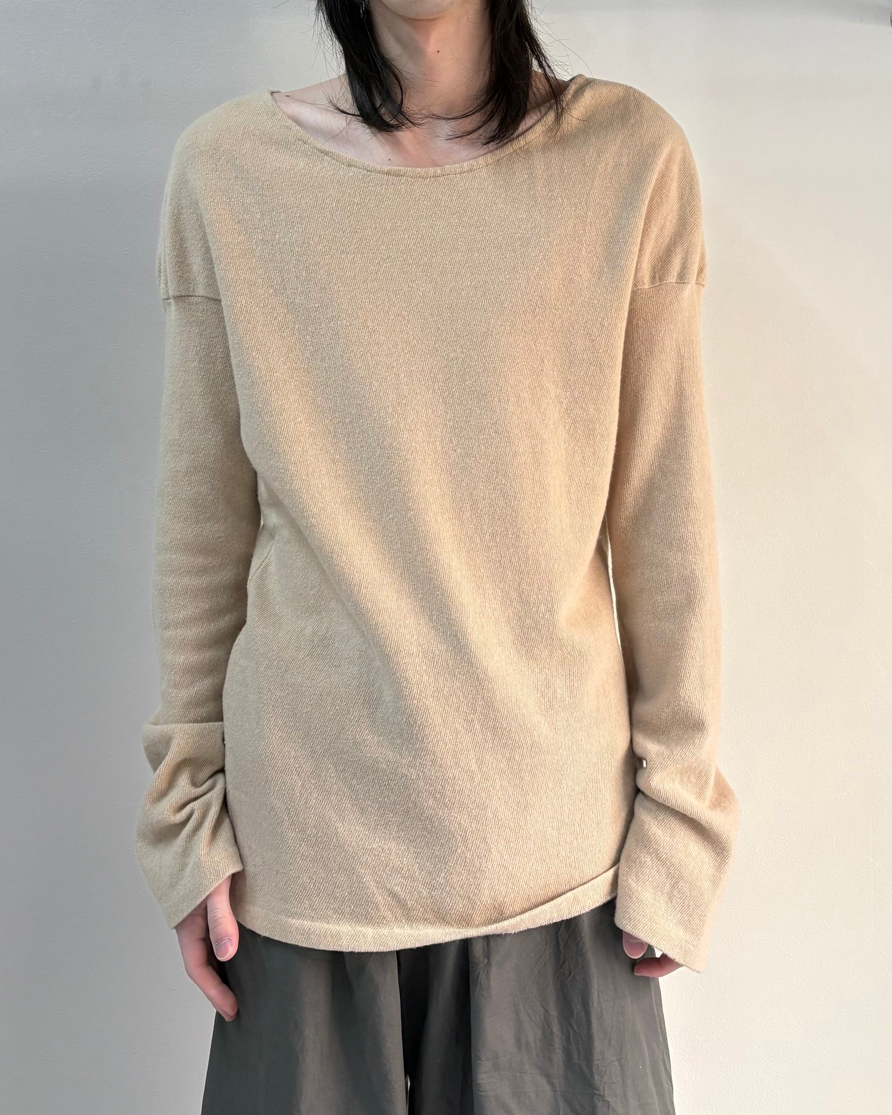 落ち着いたベージュのカラー、緩さのあるネックの開きによりシックな雰囲気を出しつつ程よい抜け感を演出できます