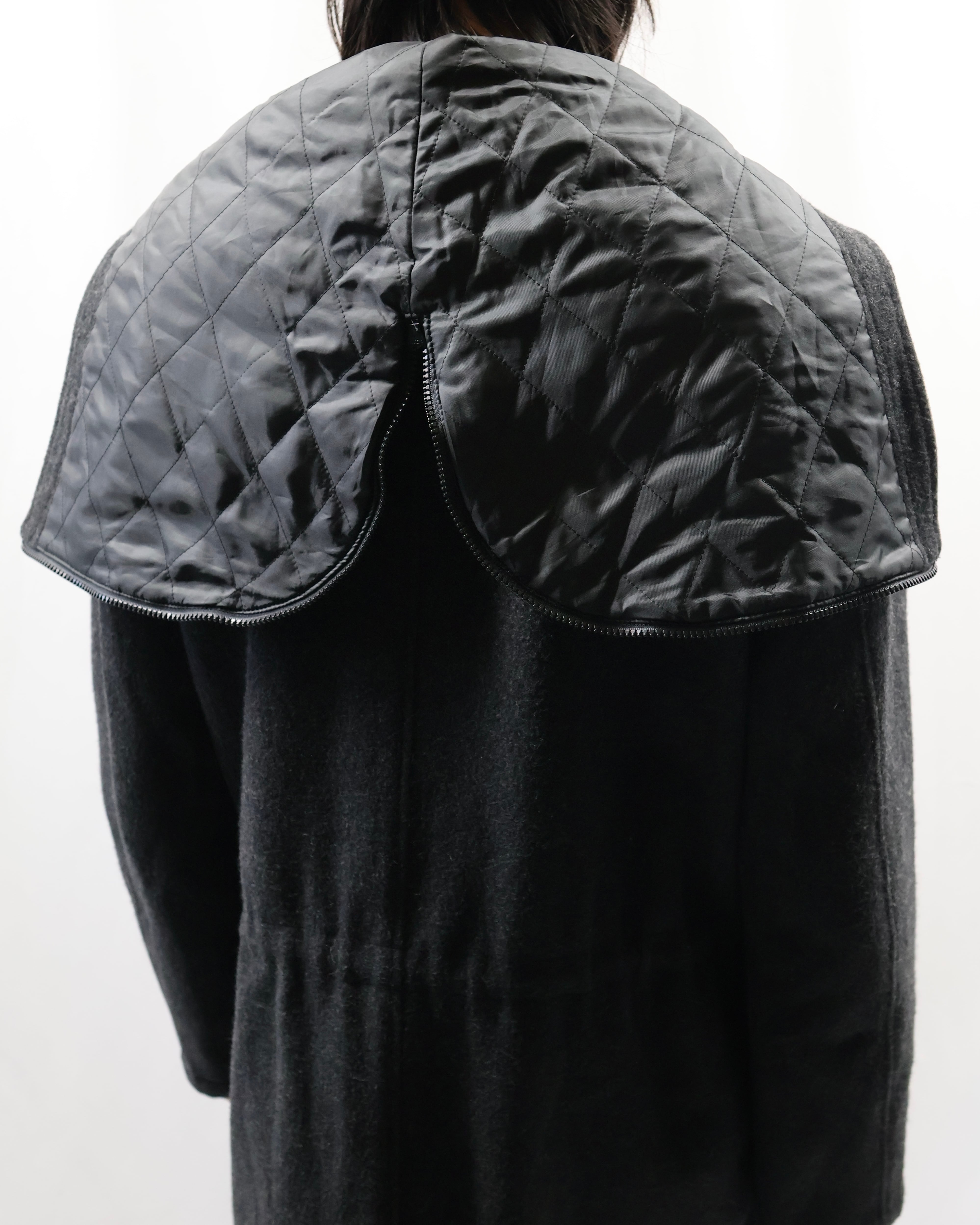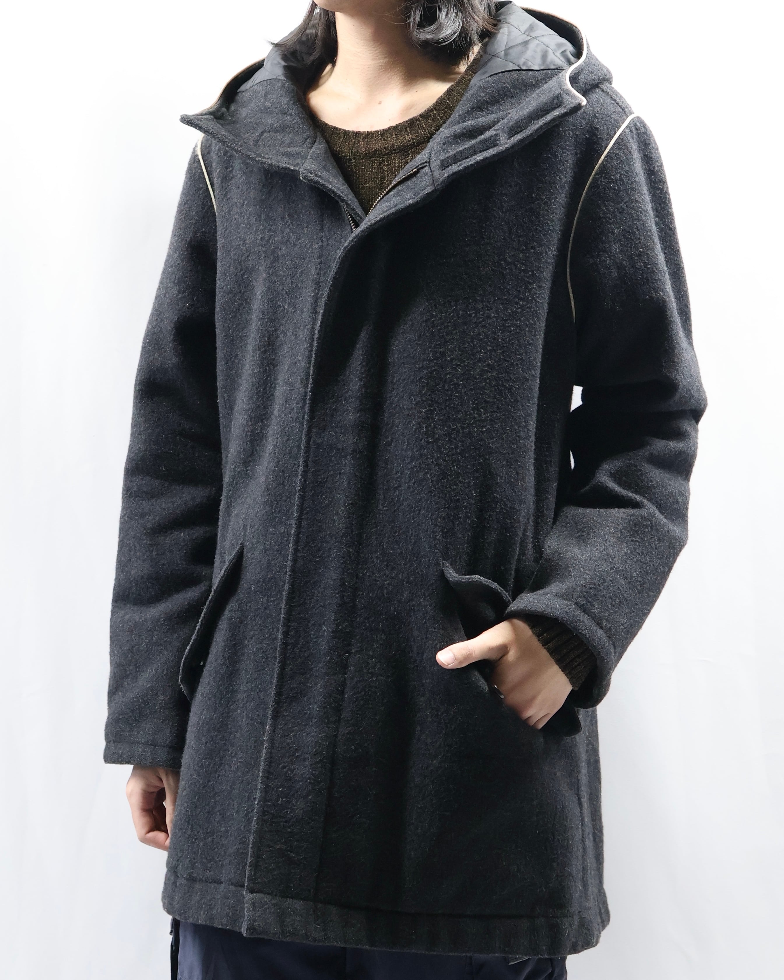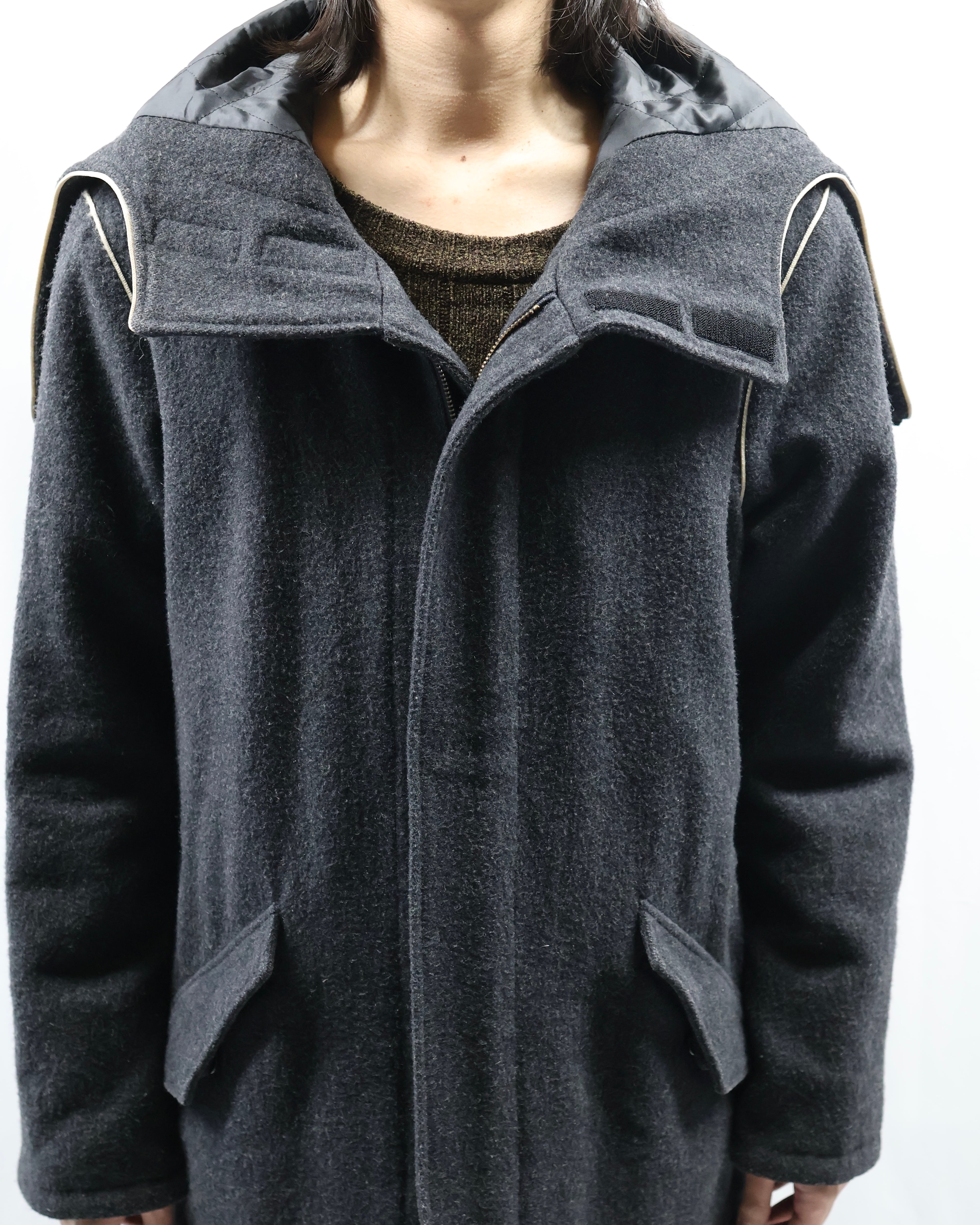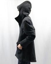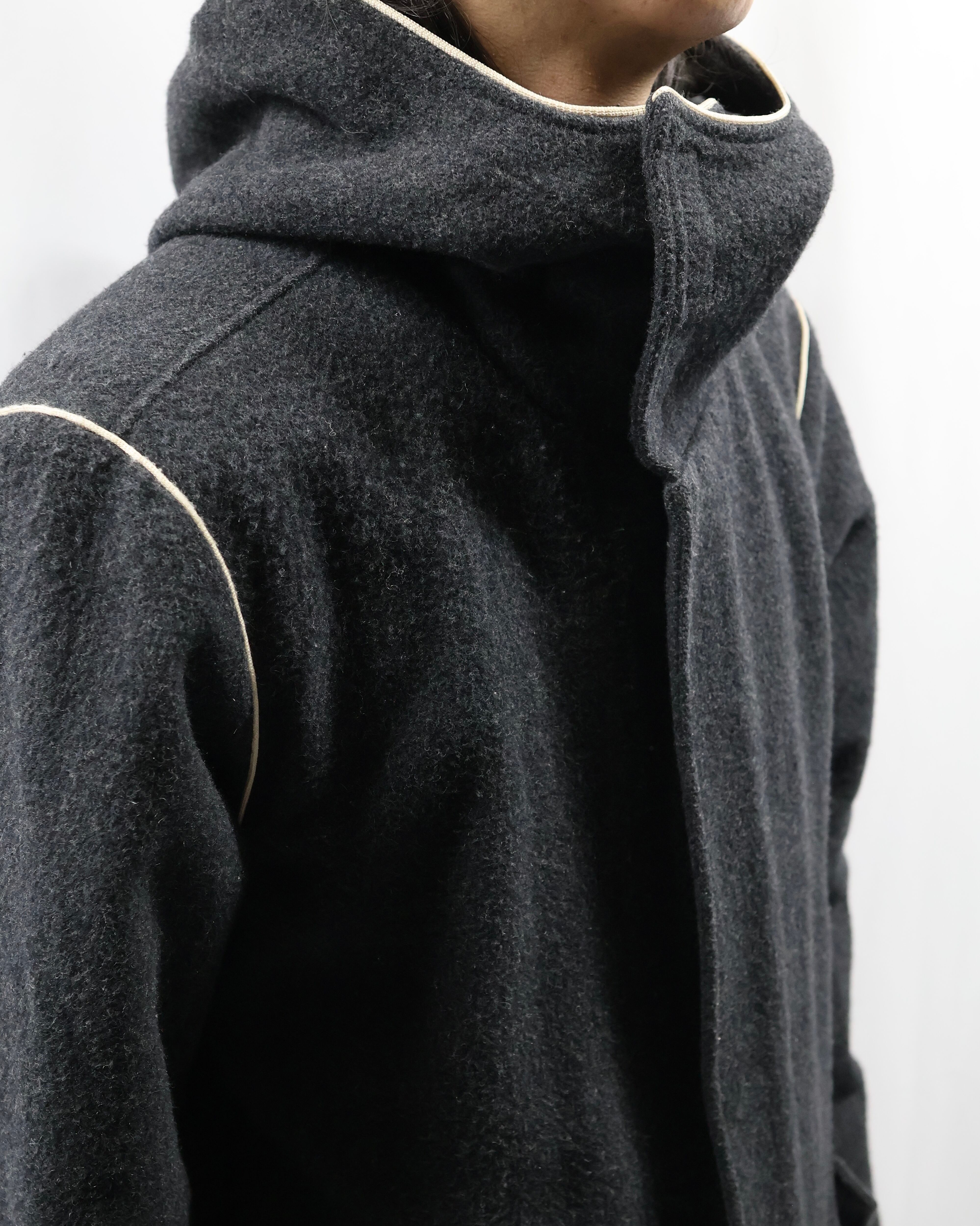 起毛感のある生地感と落ち着いたチャコールカラーが洗練された雰囲気。フードのジップを開けてセーラカラーでの着用も可能。