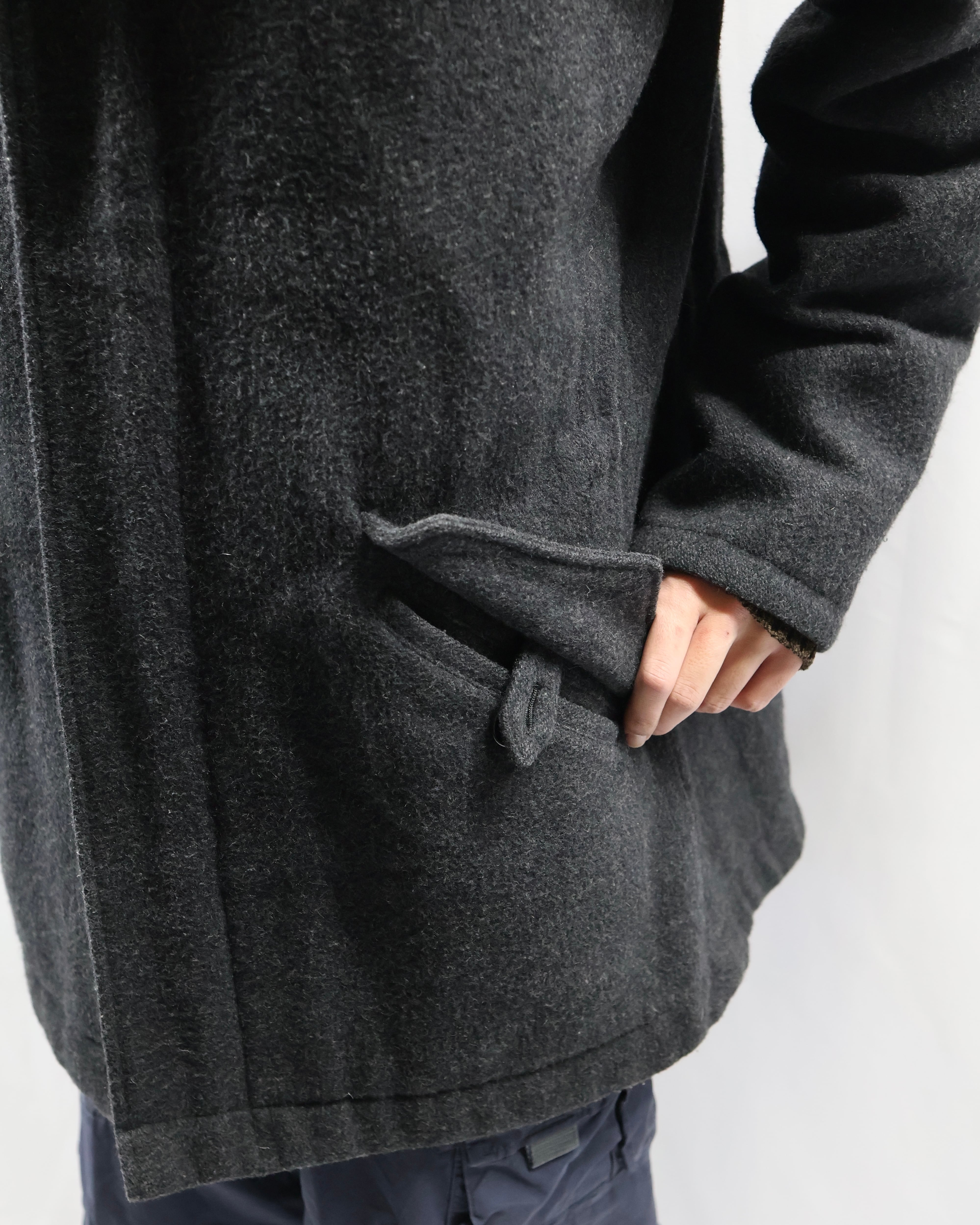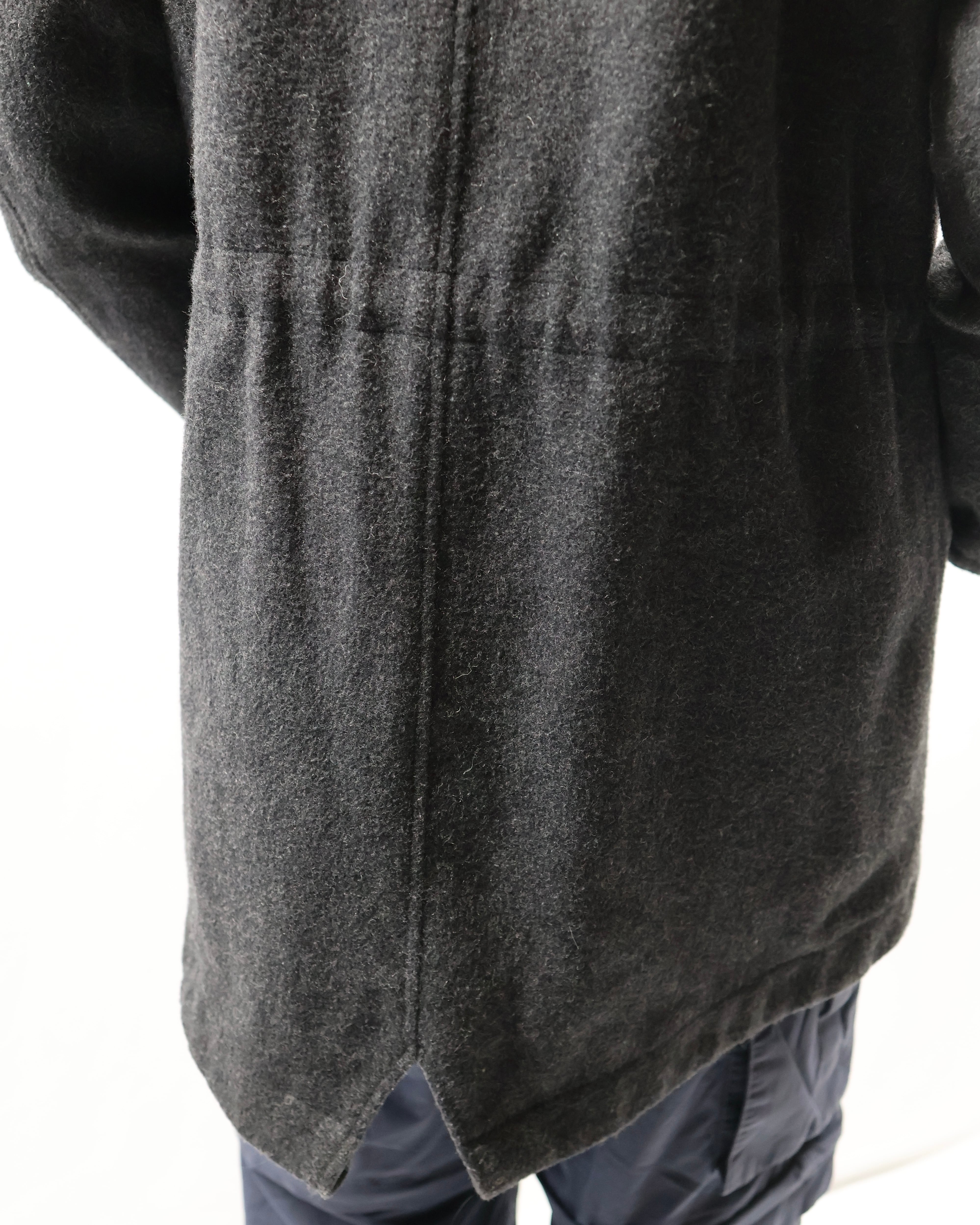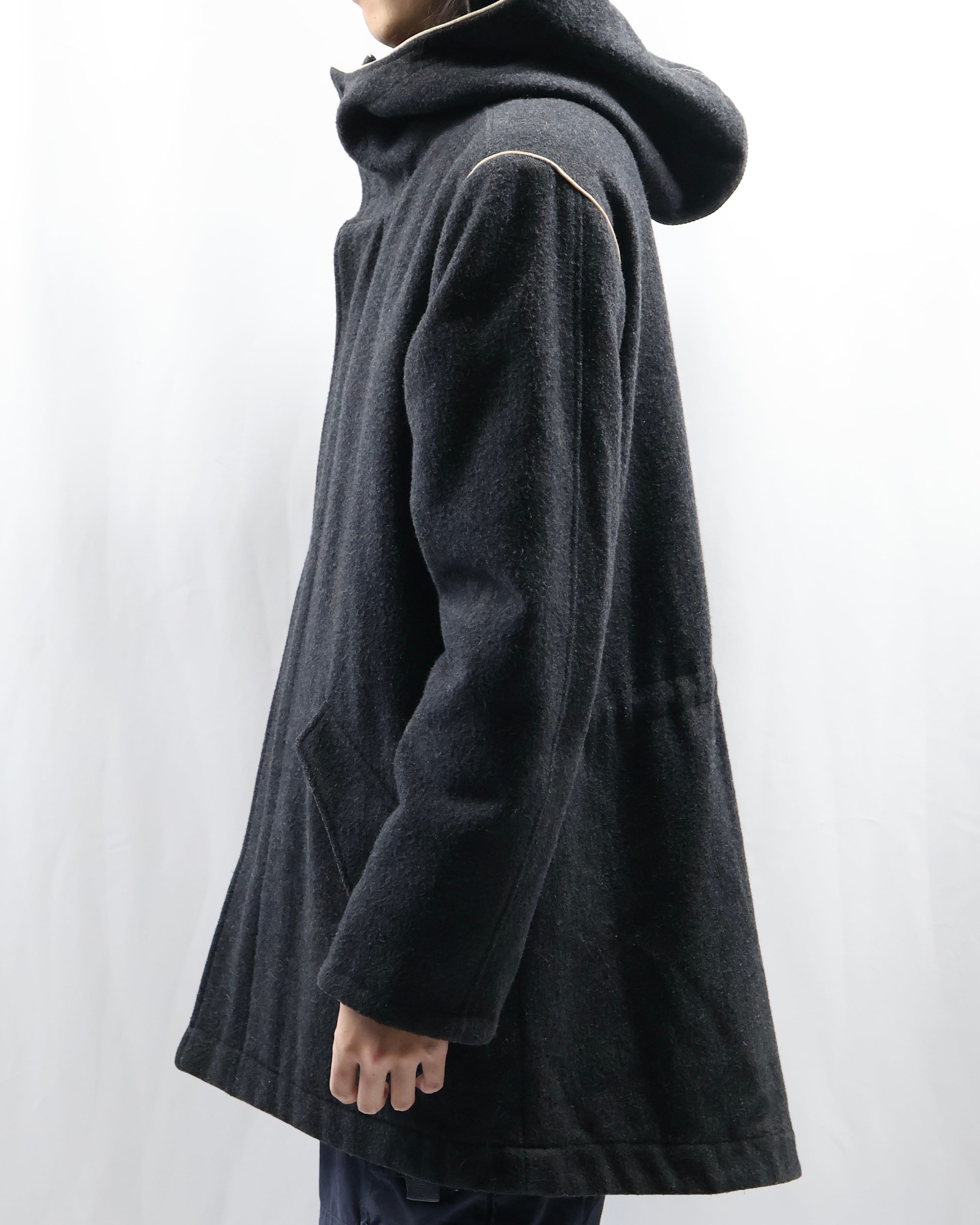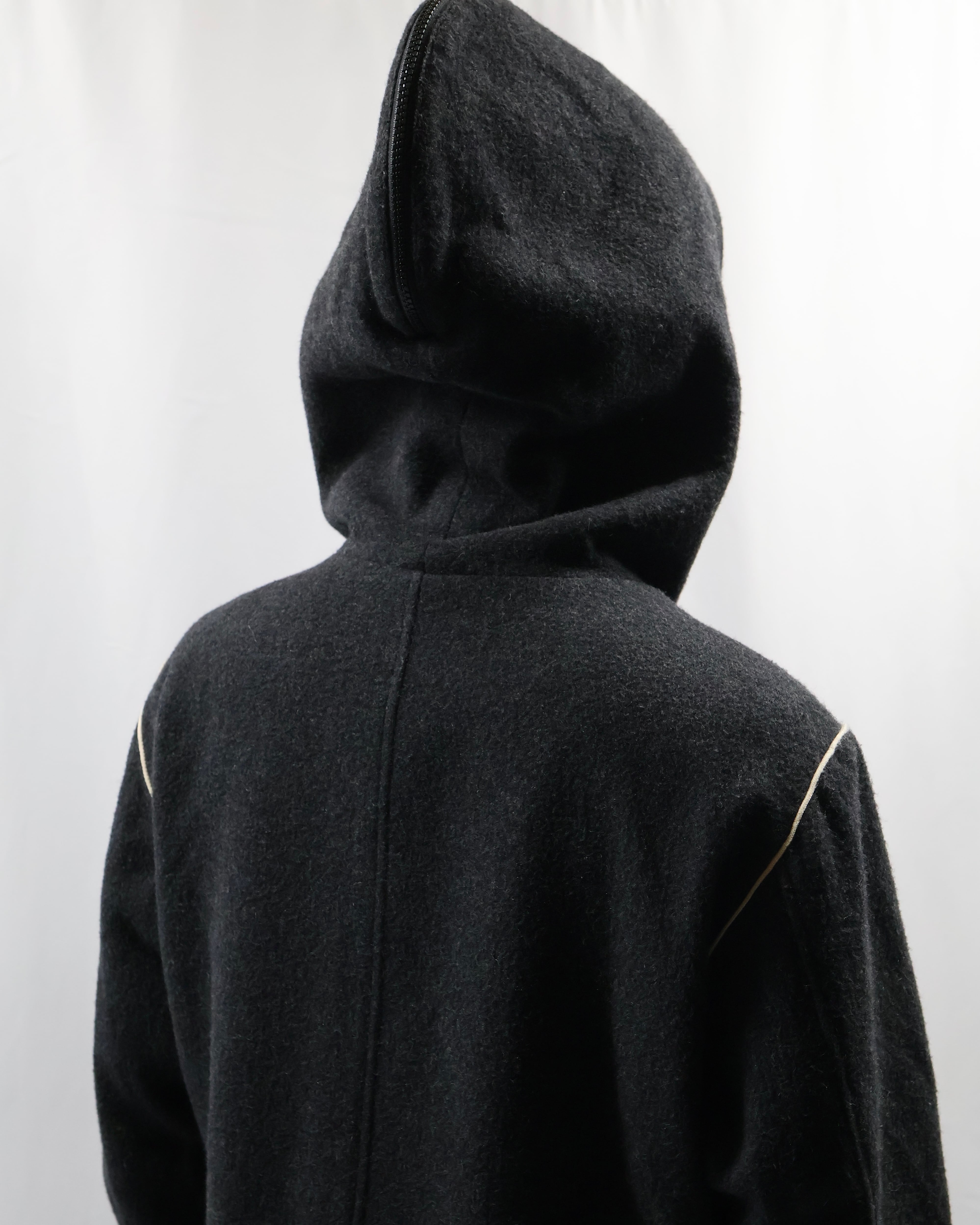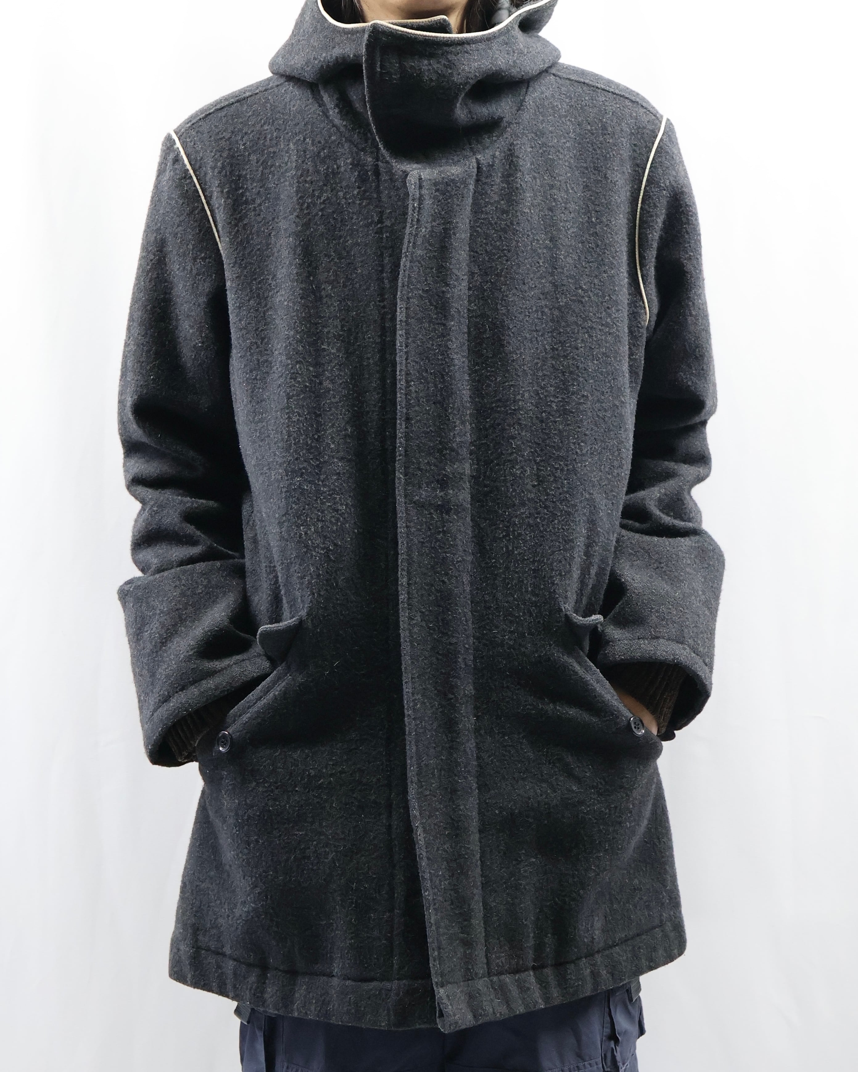 起毛感のある生地感と落ち着いたチャコールカラーが洗練された雰囲気。フードのジップを開けてセーラカラーでの着用も可能。