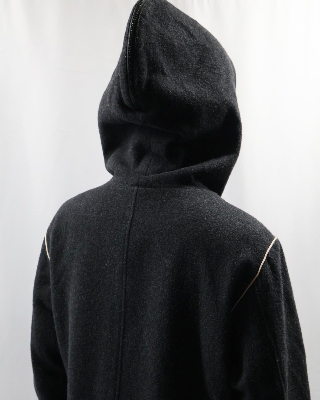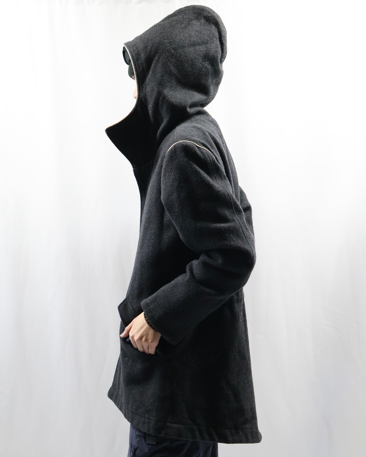 重厚感のあるウール素材を使用した、ミニマルデザインのフーデッドハーフコート