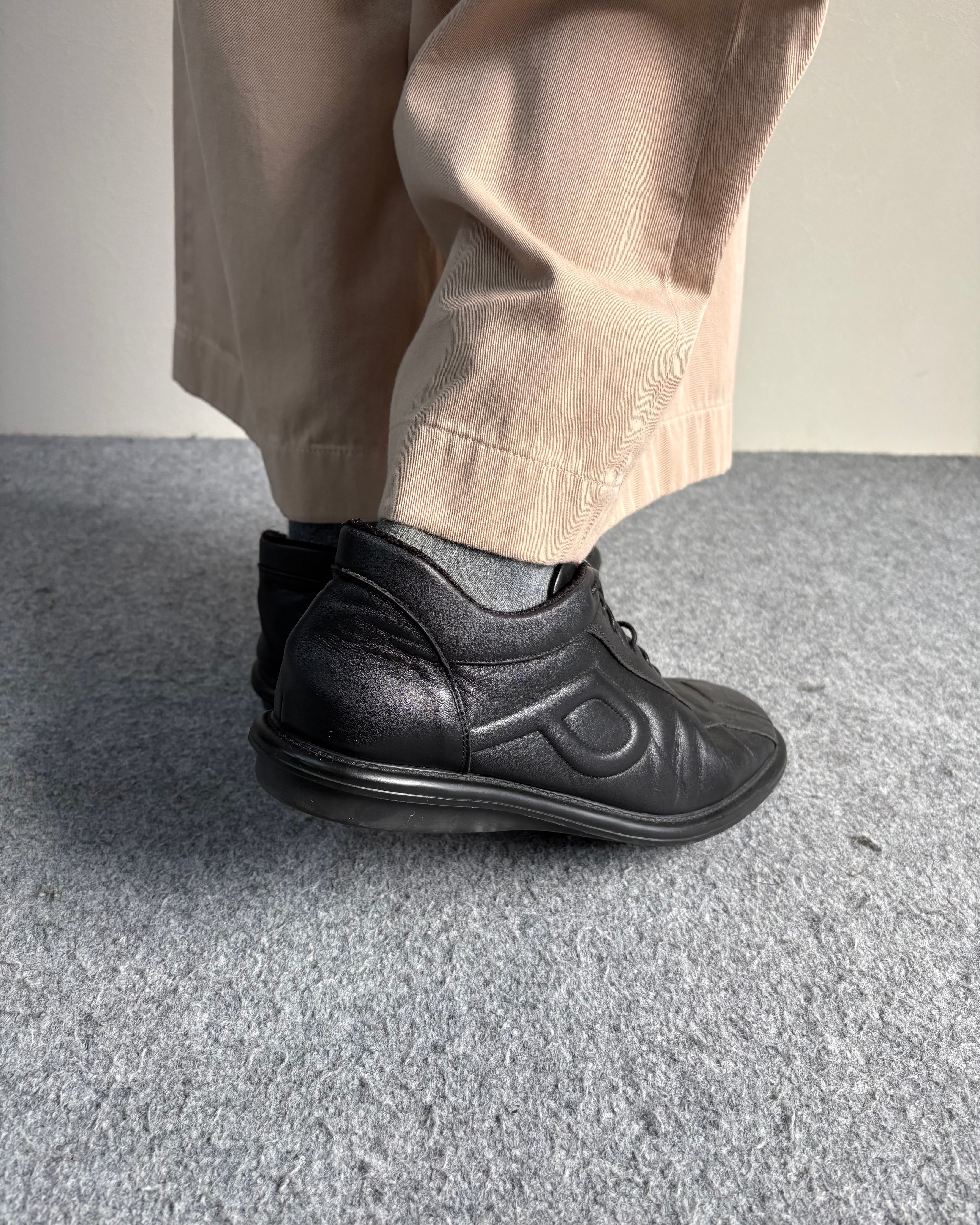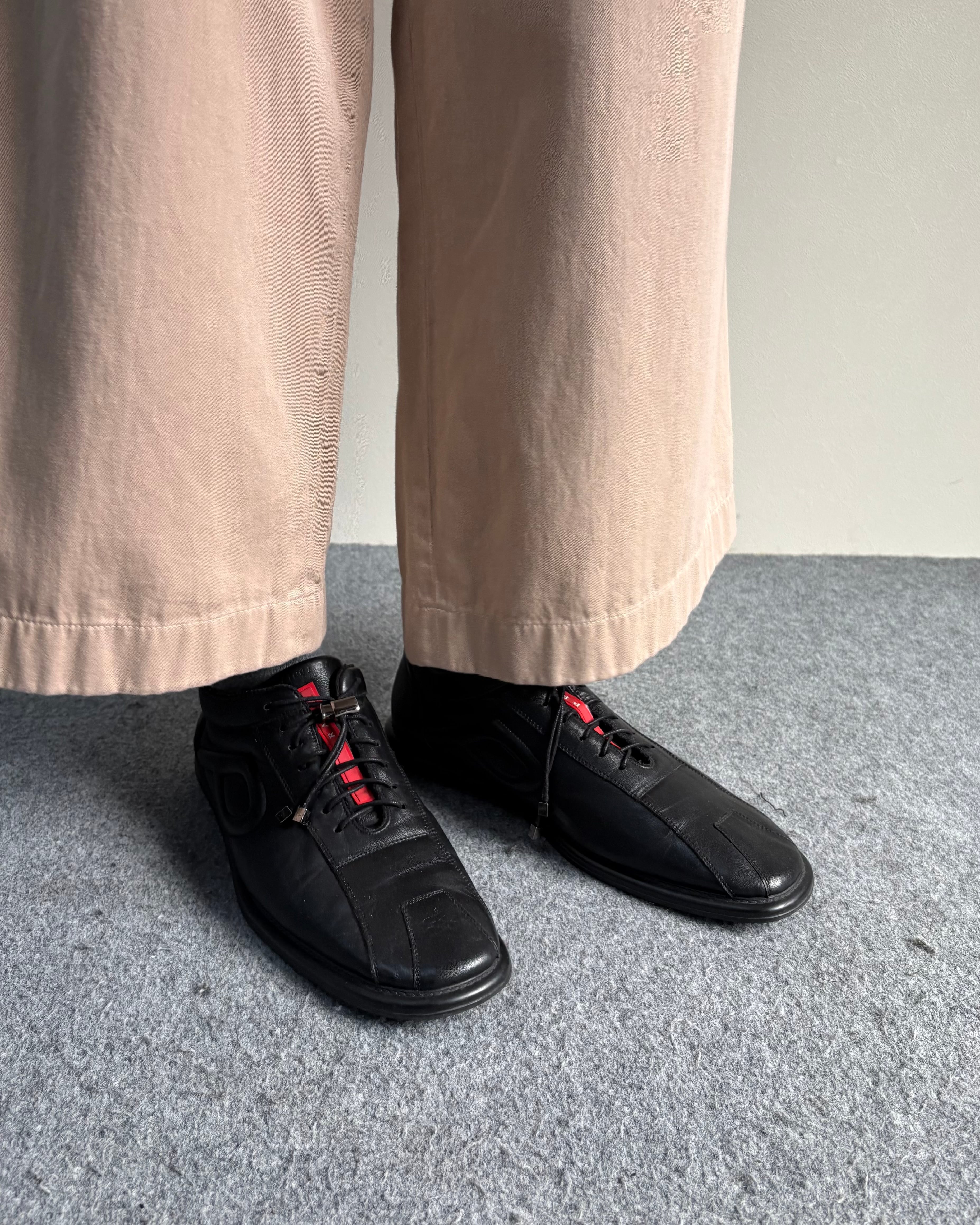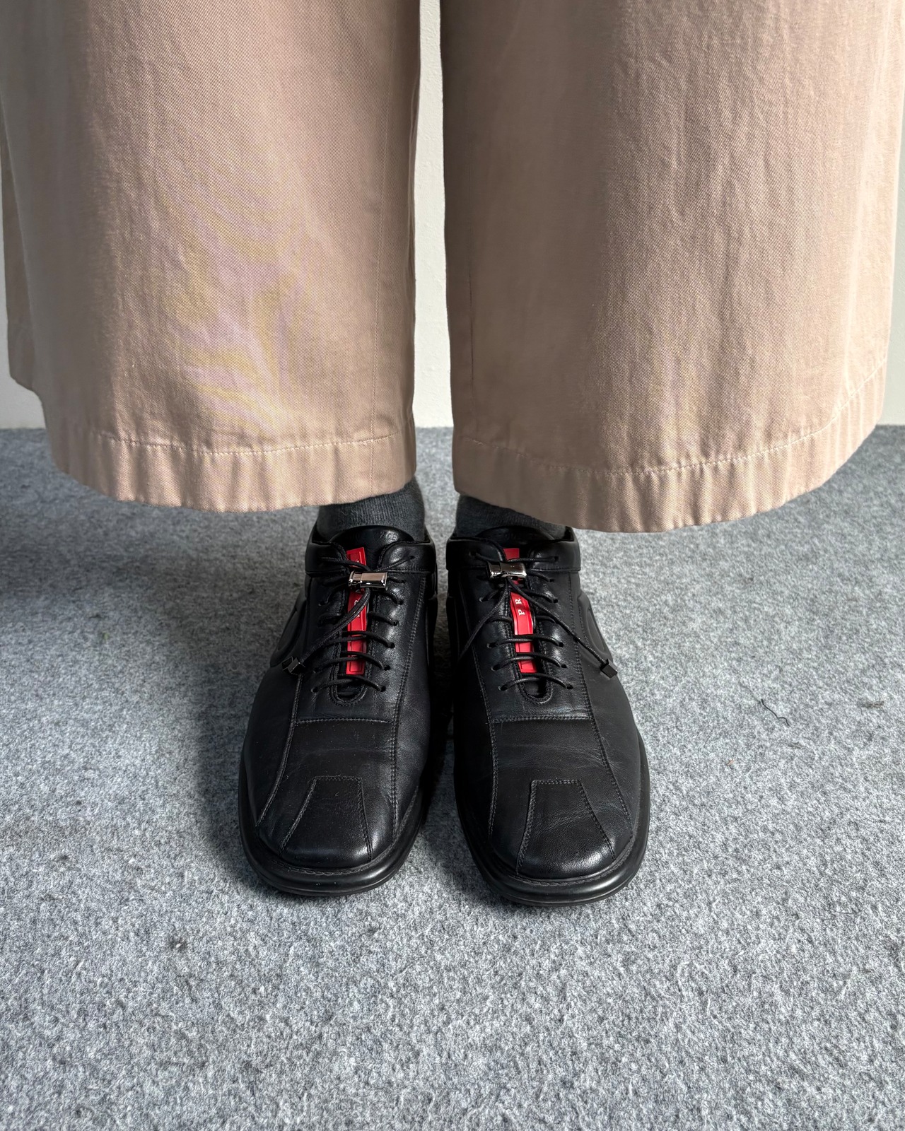 プラダスポーツ特有のレザーとメッシュを組み合わせたモードなデザイン。シューレースはドローコード仕様で着脱もしやすく様々なパンツに合わせられる一足。