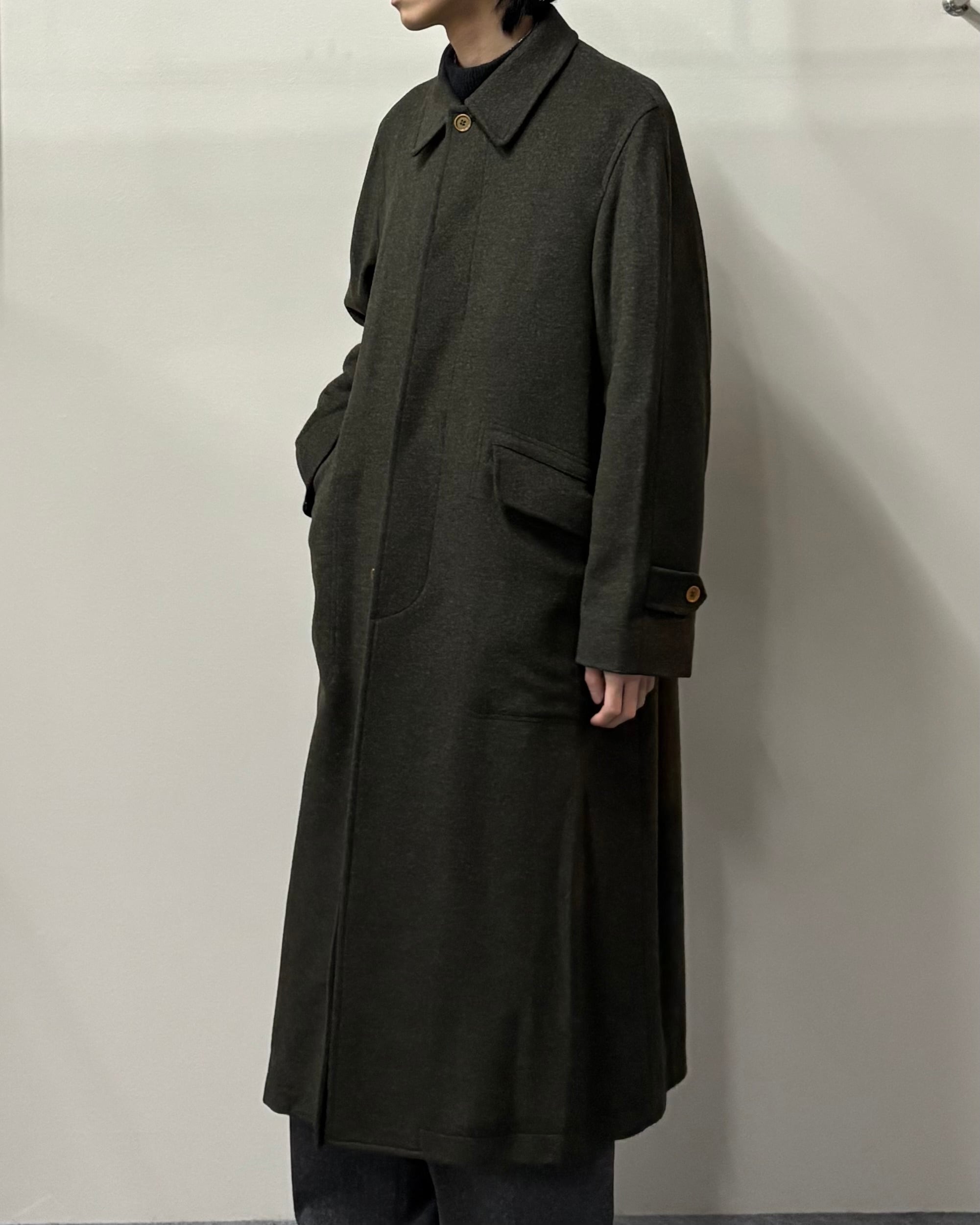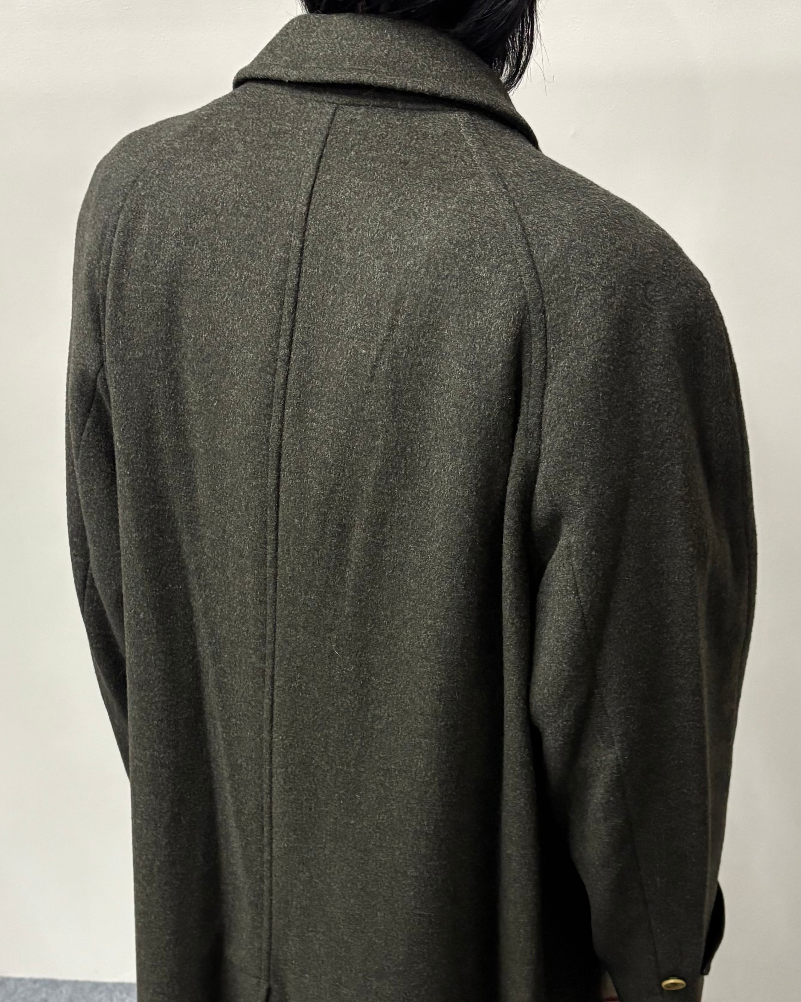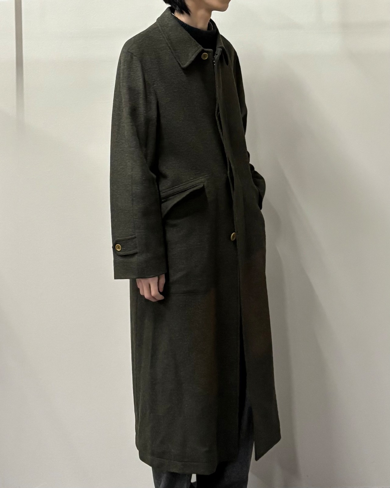 深みのあるダークグリーンの色合いと、ラグランスリーブと比翼仕立てのクリーンなデザインが落ち着いた雰囲気を演出する一着。