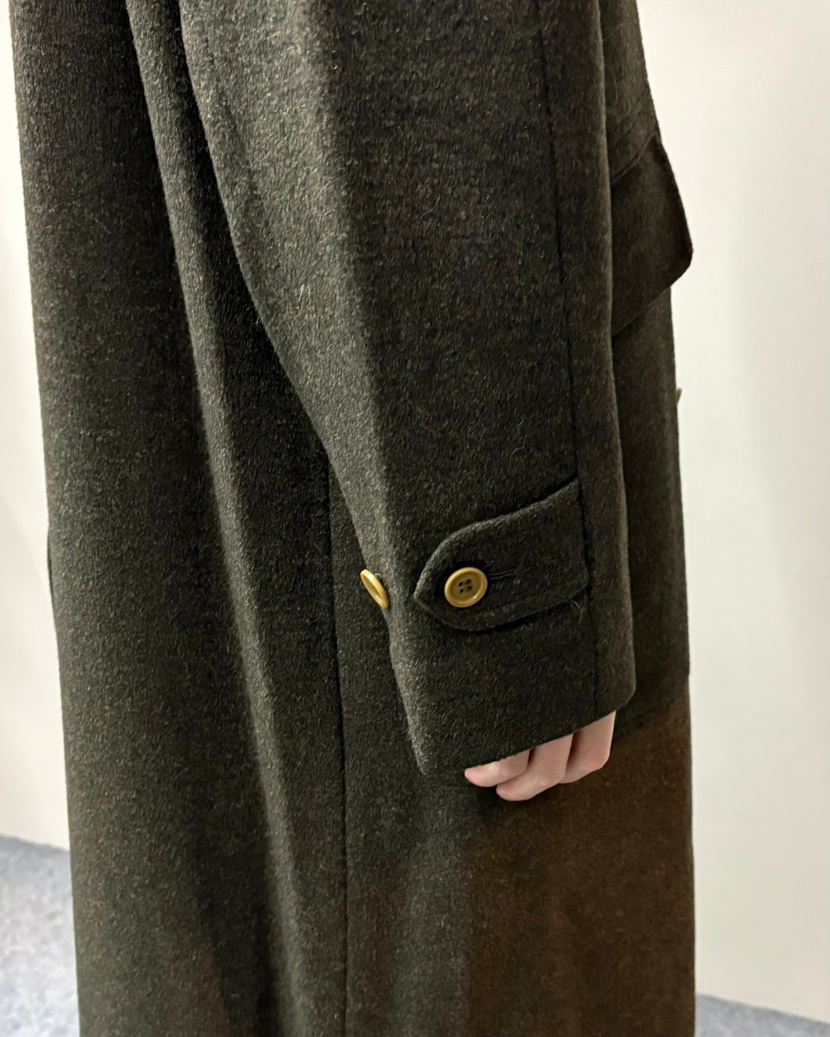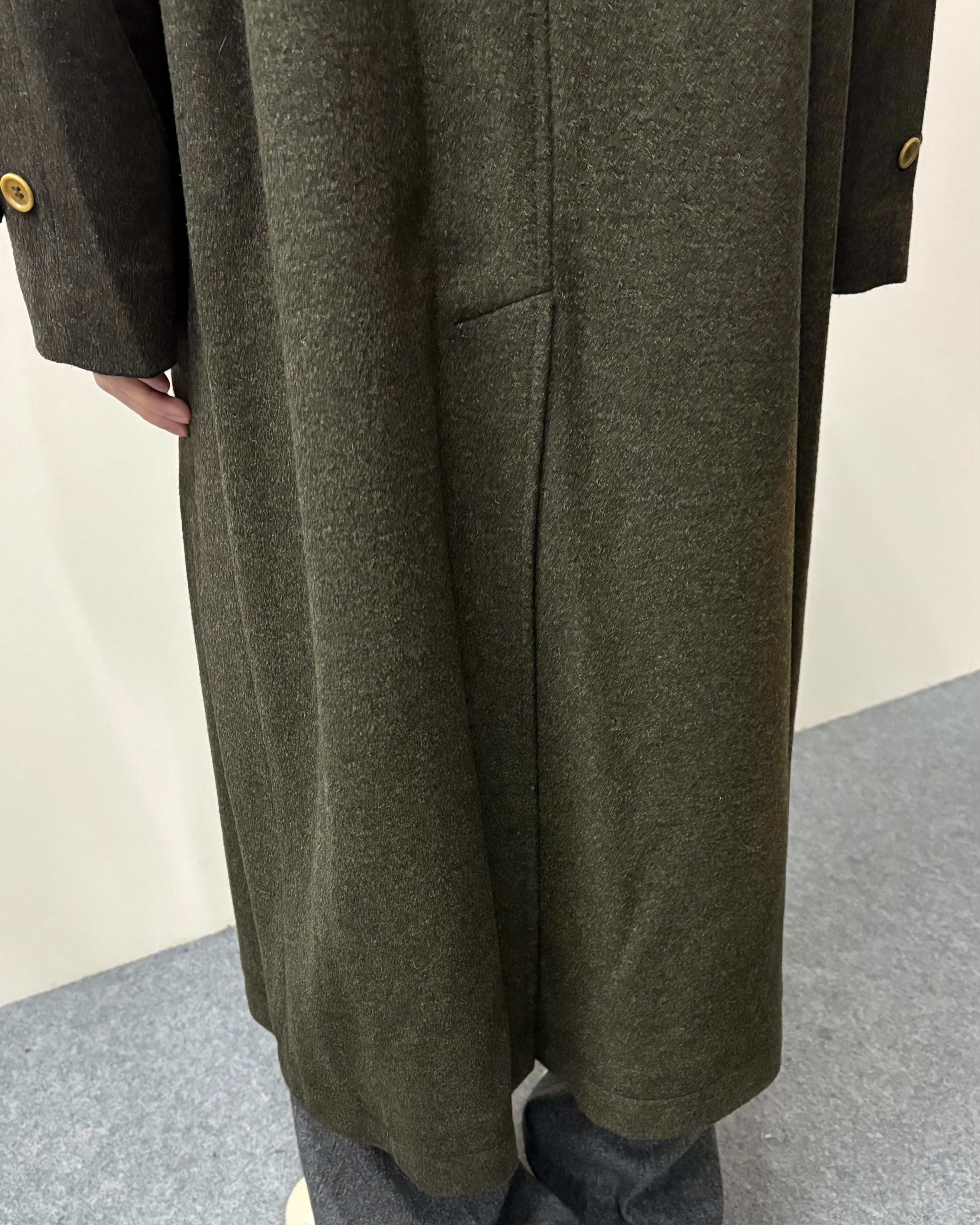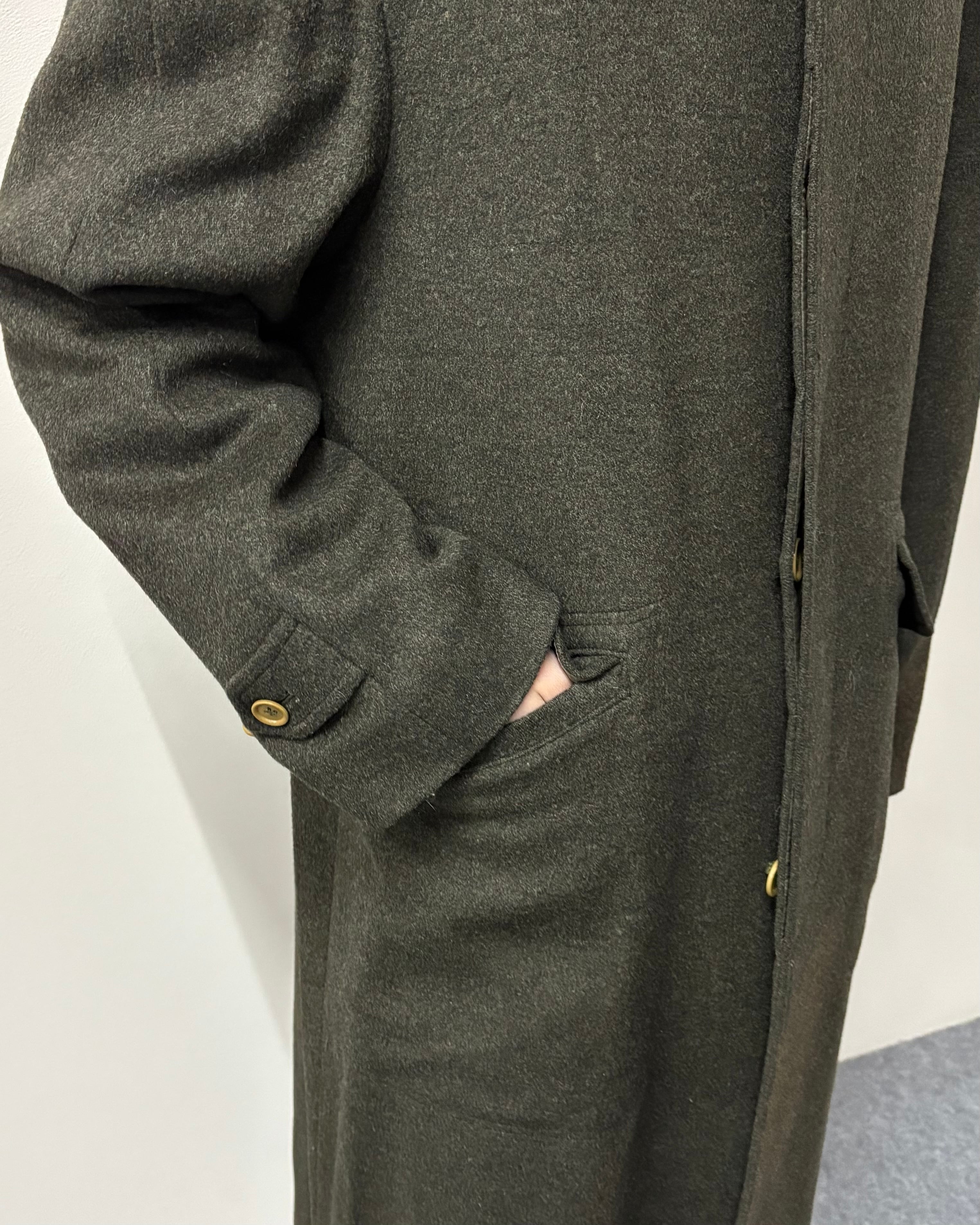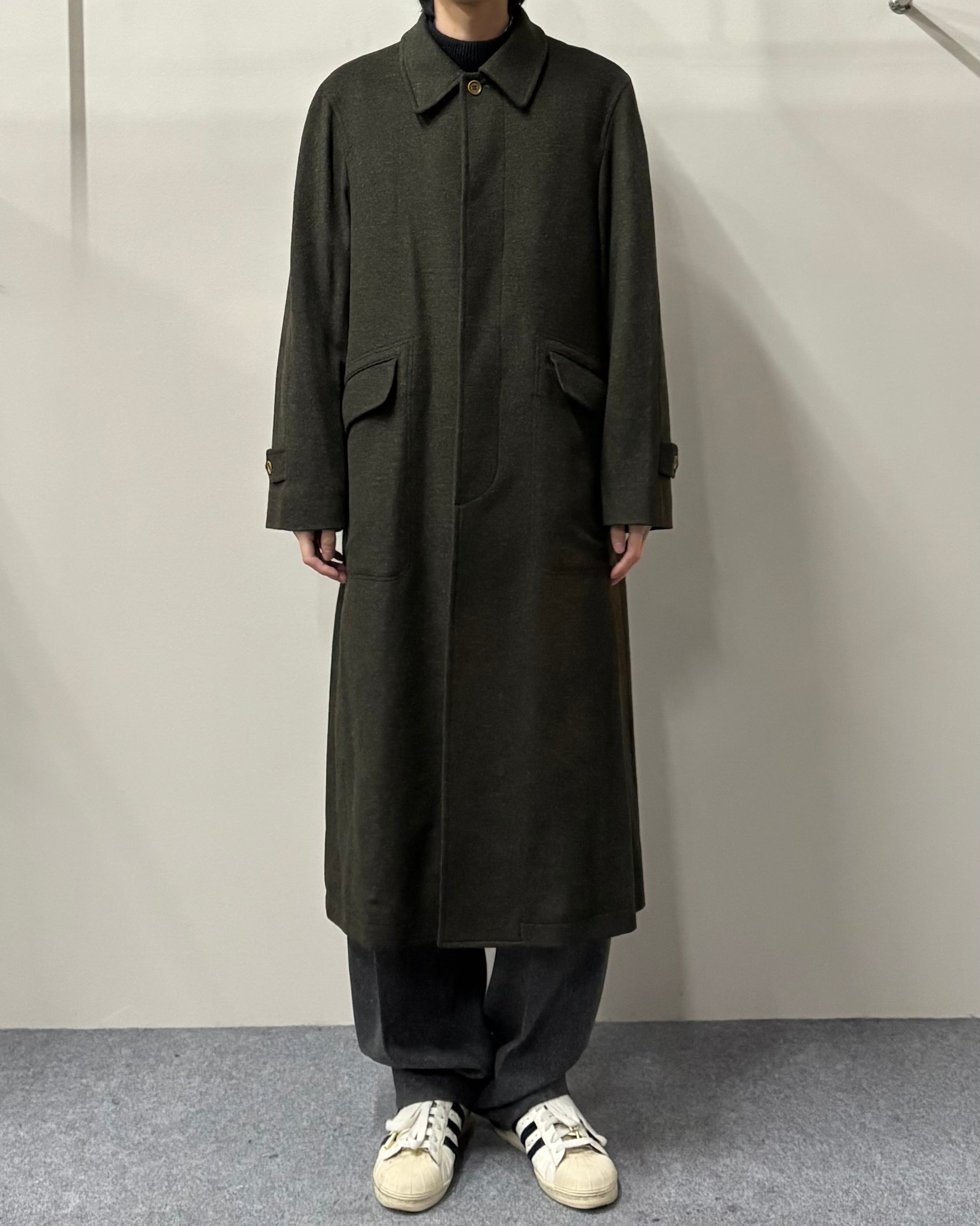 深みのあるダークグリーンの色合いと、ラグランスリーブと比翼仕立てのクリーンなデザインが落ち着いた雰囲気を演出する一着。