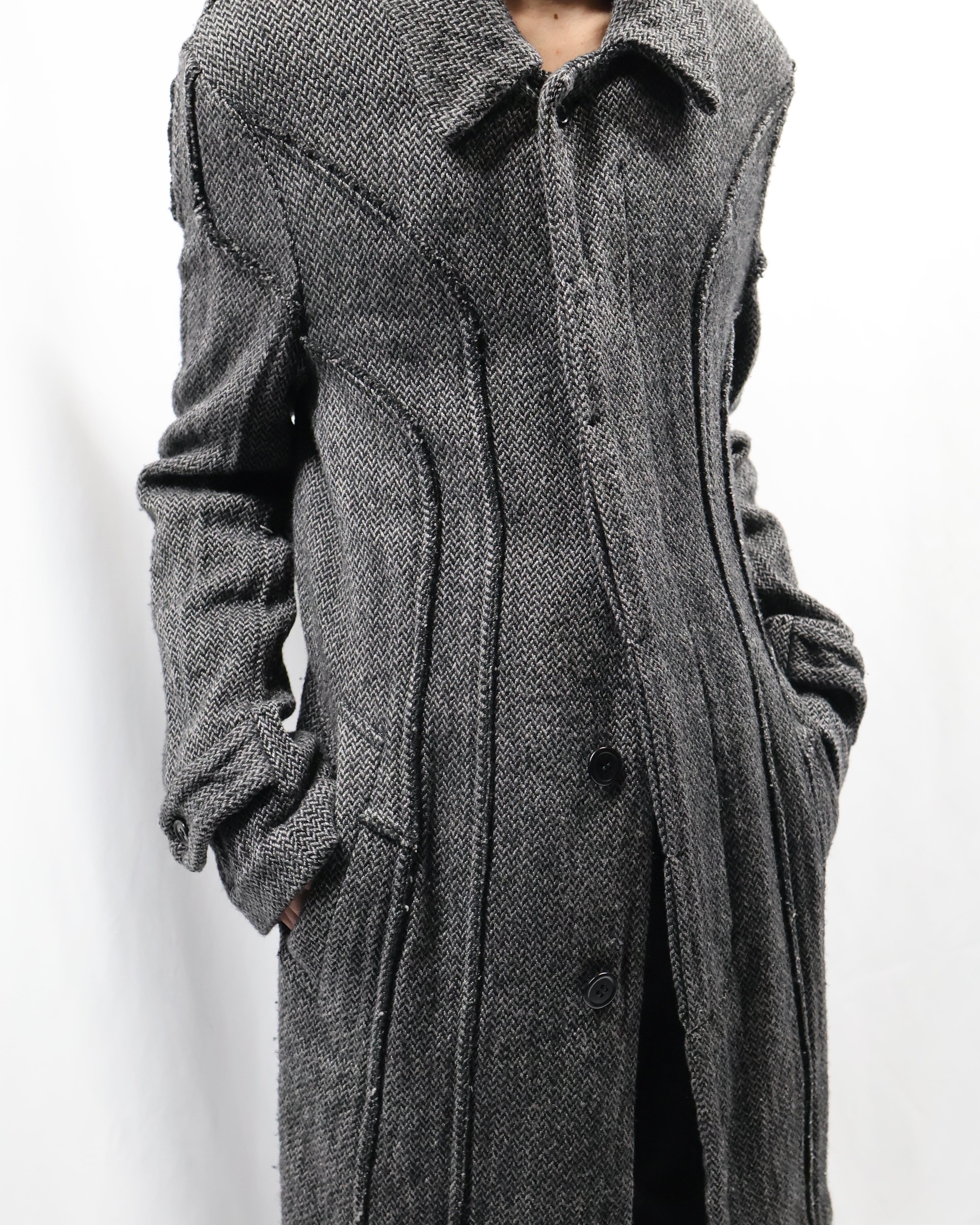 知る人ぞ知る名品。ギャルソンのカーブ期を代表するような独特なカッティングデザイン。とことんギャルソンで固めるも良し、デザインの効いたコートとして面白く合わせるもよし。飽きの来ないカラーリングで、長く使っていただけるコート。