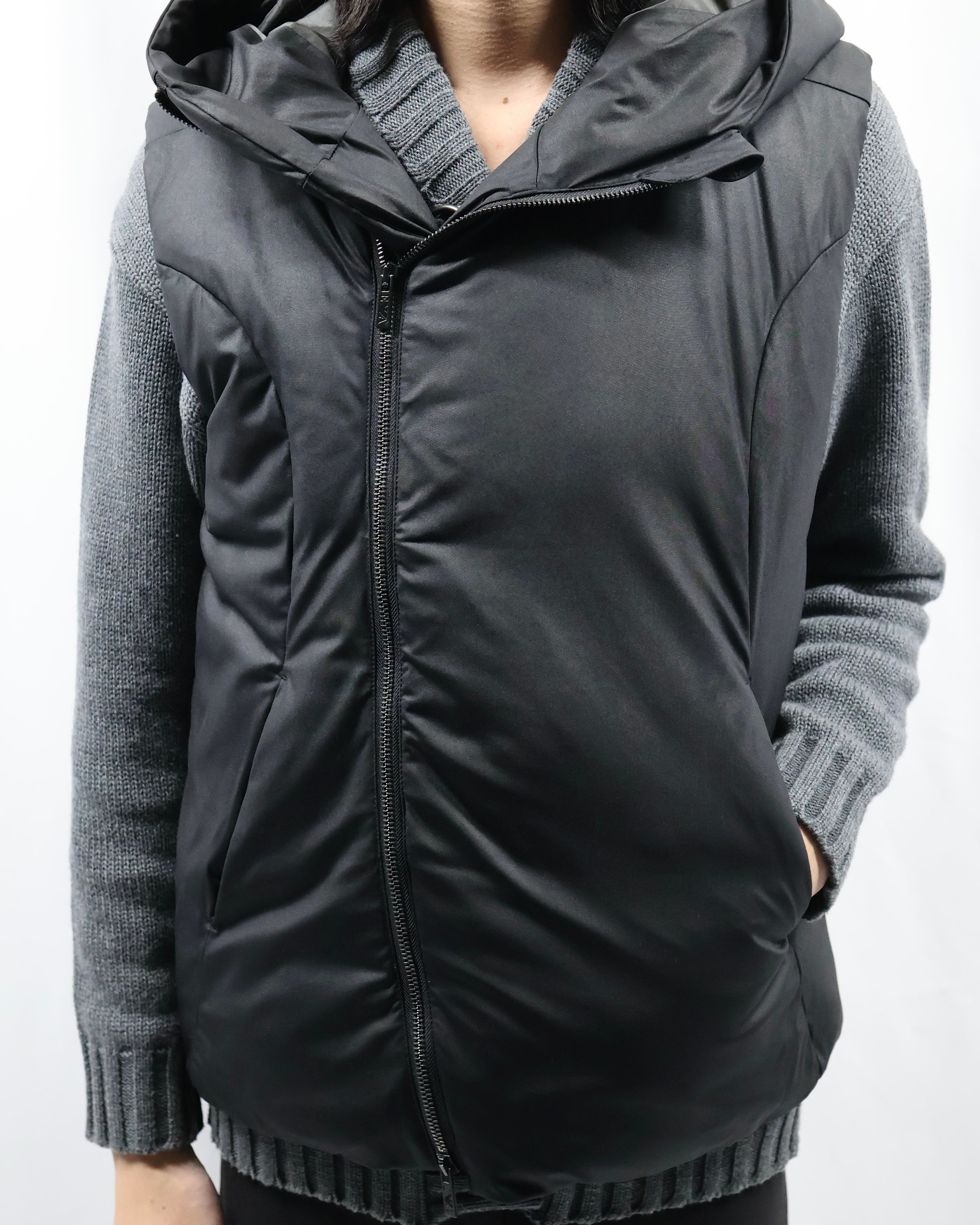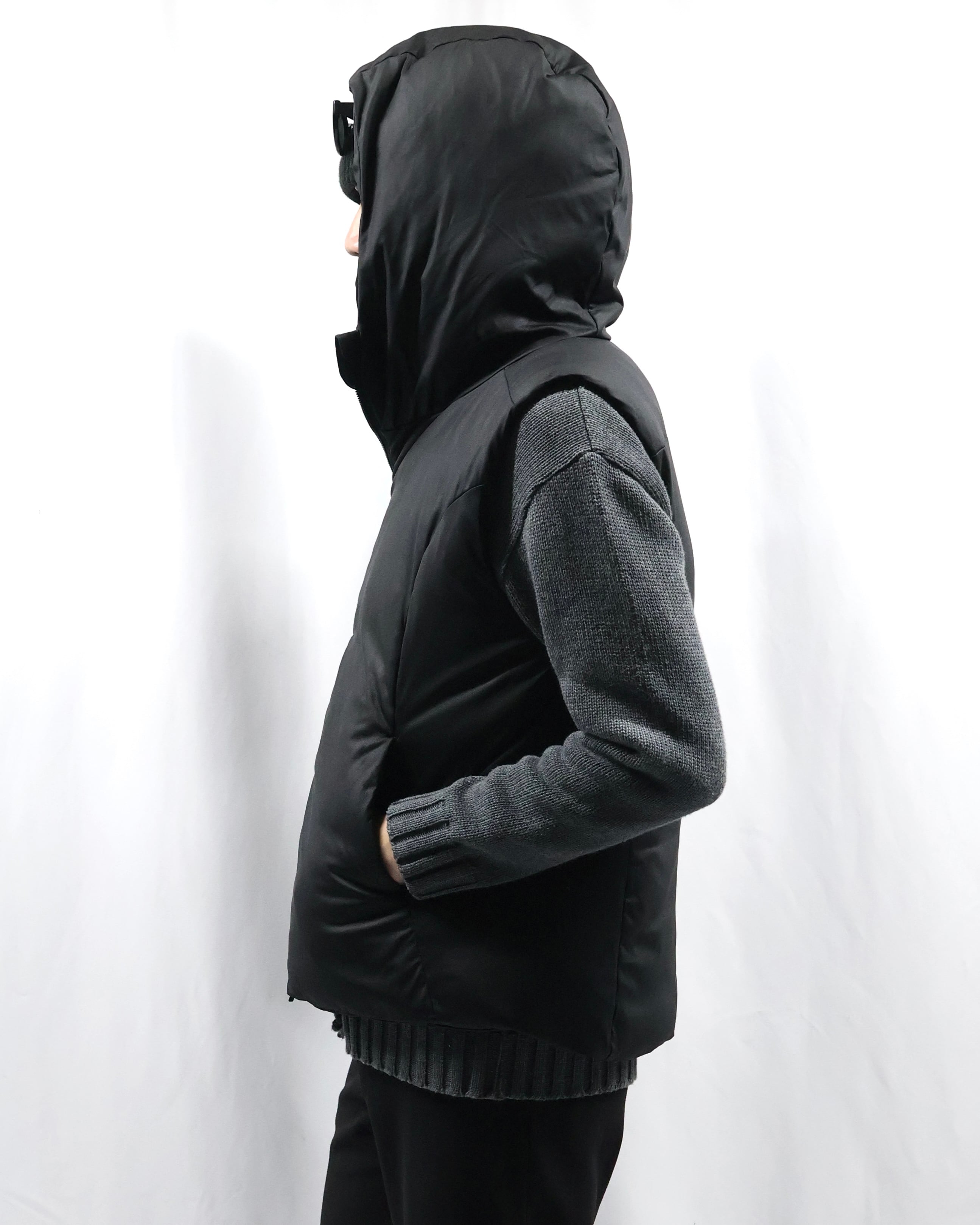 程よくボリューム感があり、防寒はもちろん、ファッションアイテムとしても使える、汎用性の高い一着。ベストなのでそこまでボリュームが出過ぎずに、ストリートにも、モードにも落とし込めます。変形のジップや程よく大きいフードなど、ギミックも多く、ぜひお勧めしたいダウンベストです。
