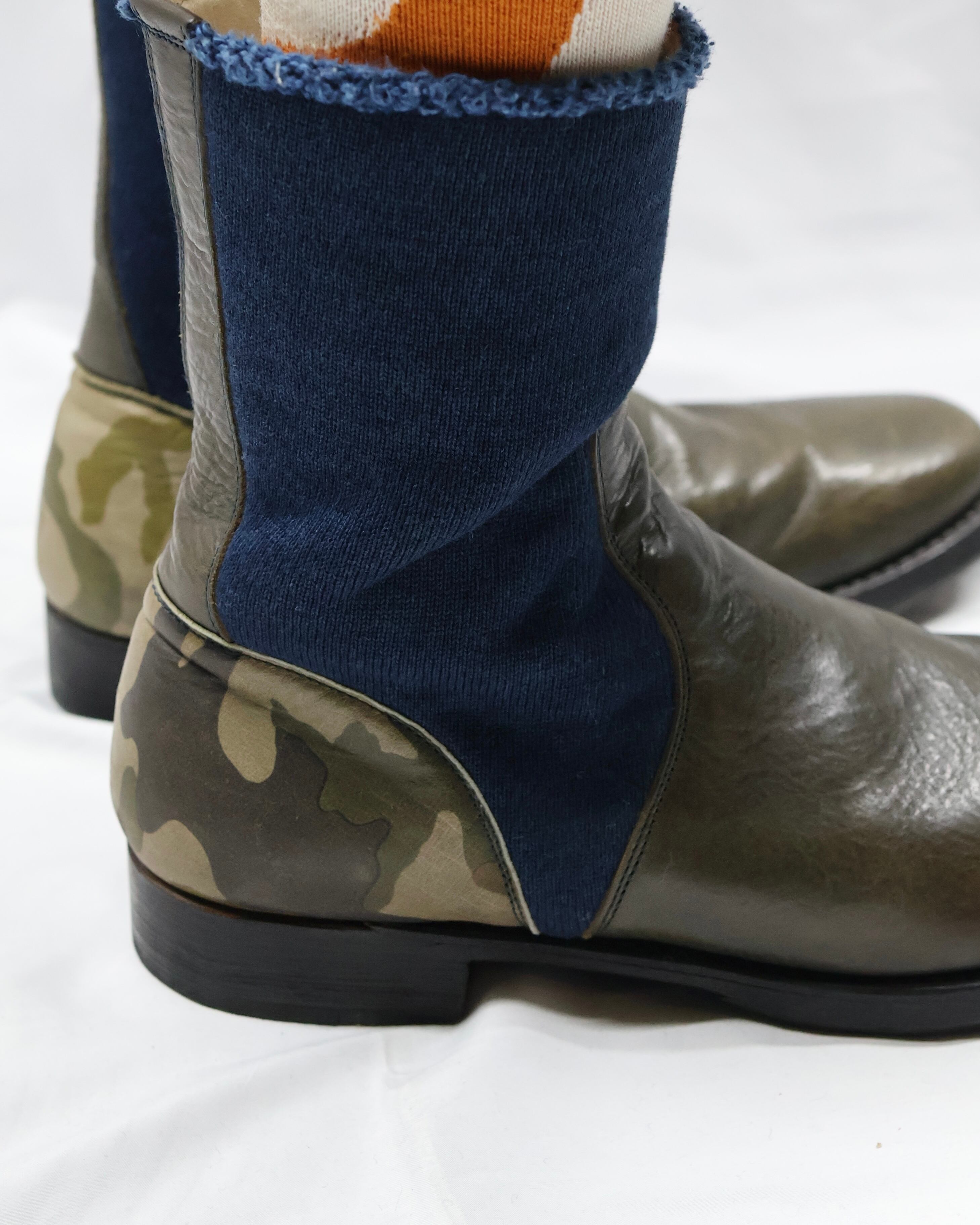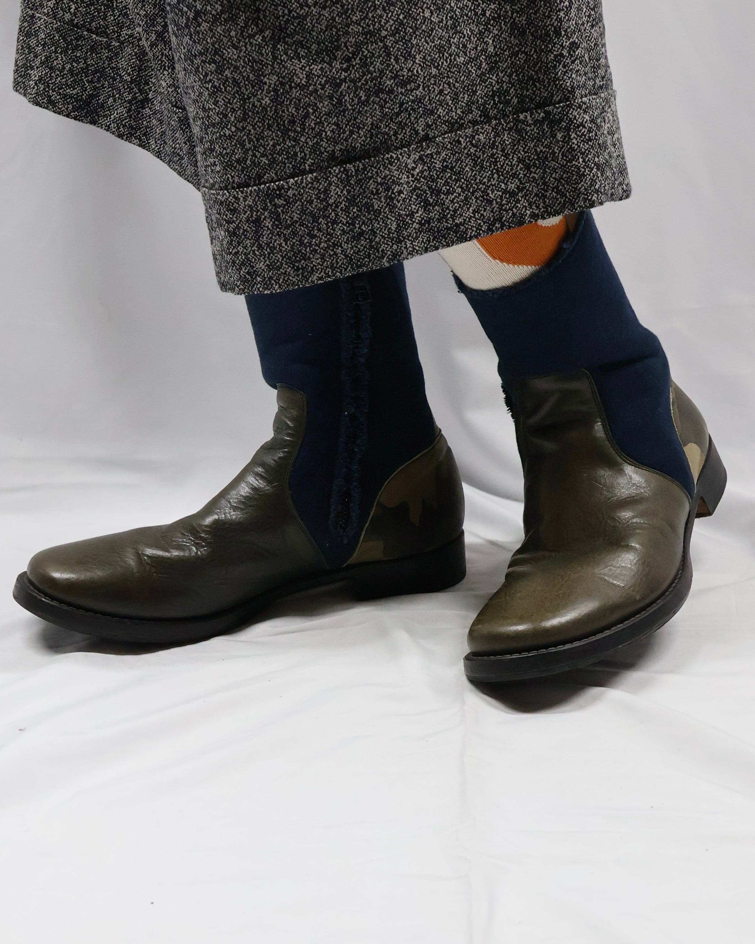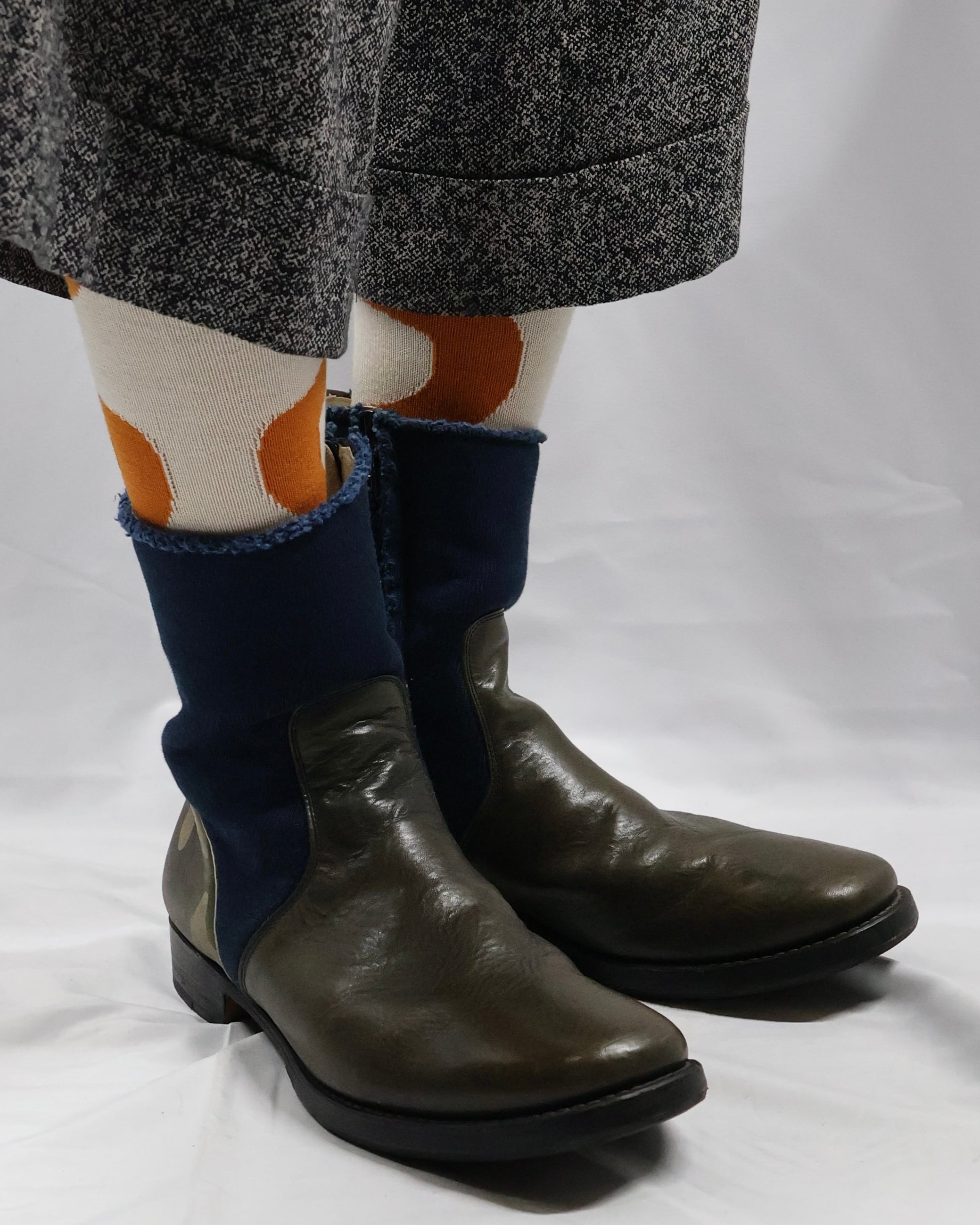wjkらしいシルエットやデザインで、ギミックがあってキレイに履けるようなブーツを探している方におすすめ。ブラウンもいい色味で上品かつ、クラシック。ホースの部分はリブ編みで、カジュアルらしさもプラス。春先はショーツなどと合わせていただきたいシューズ。