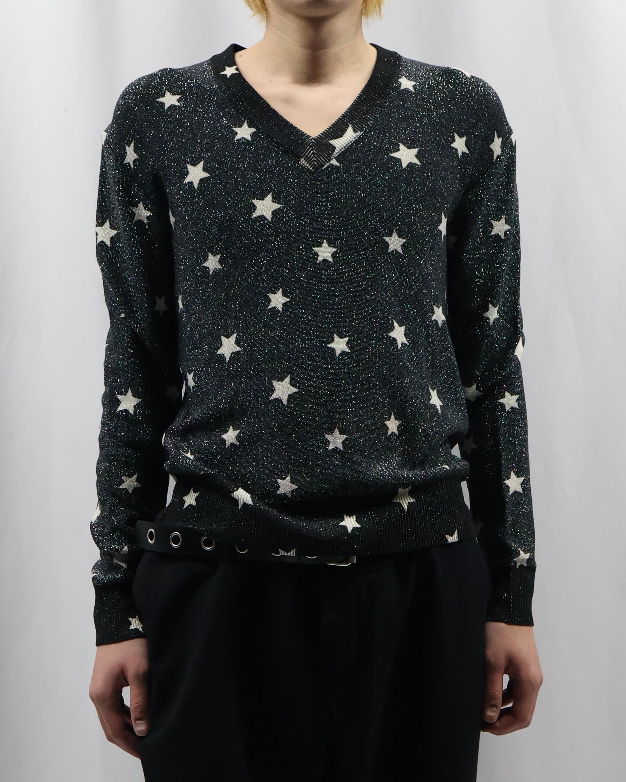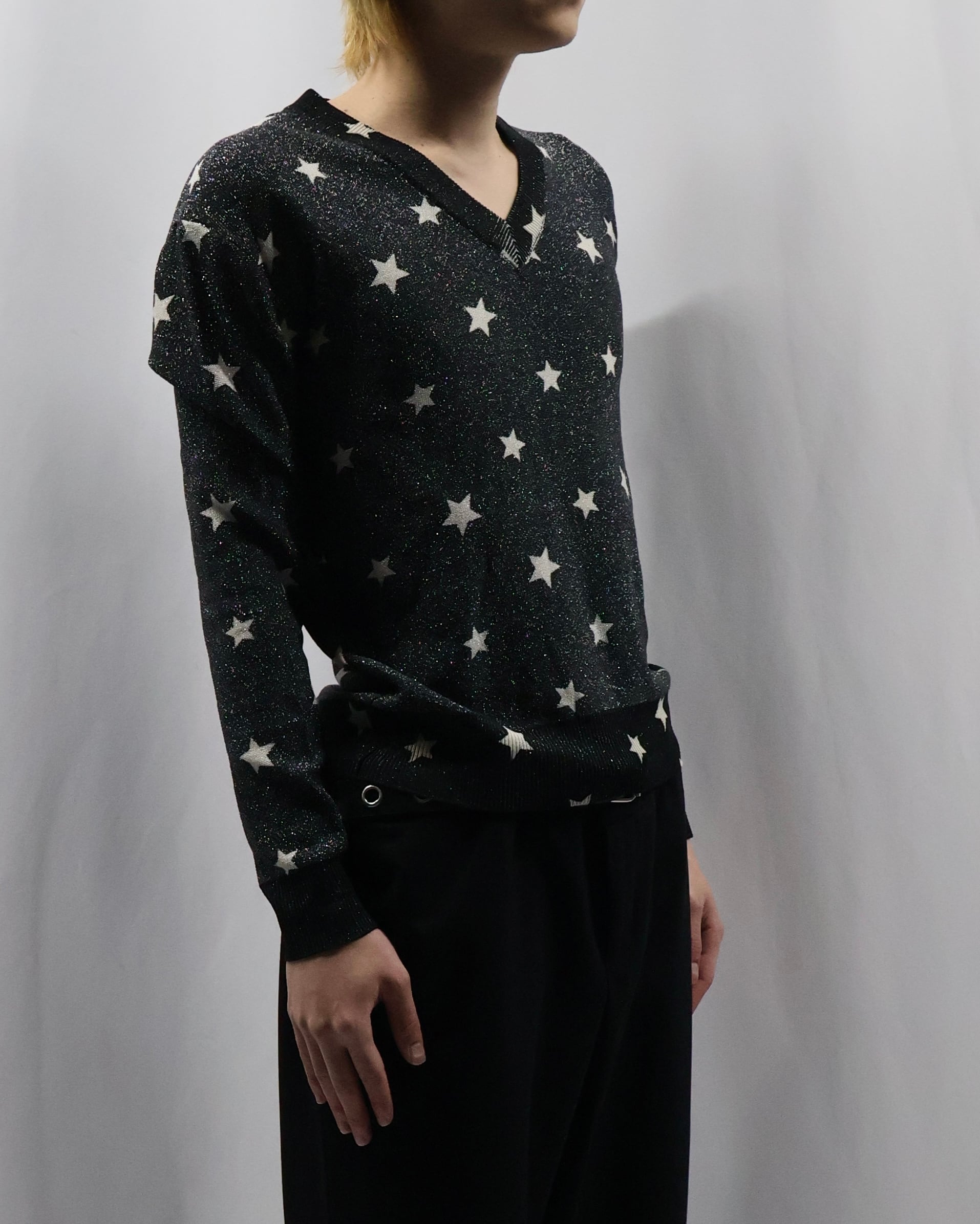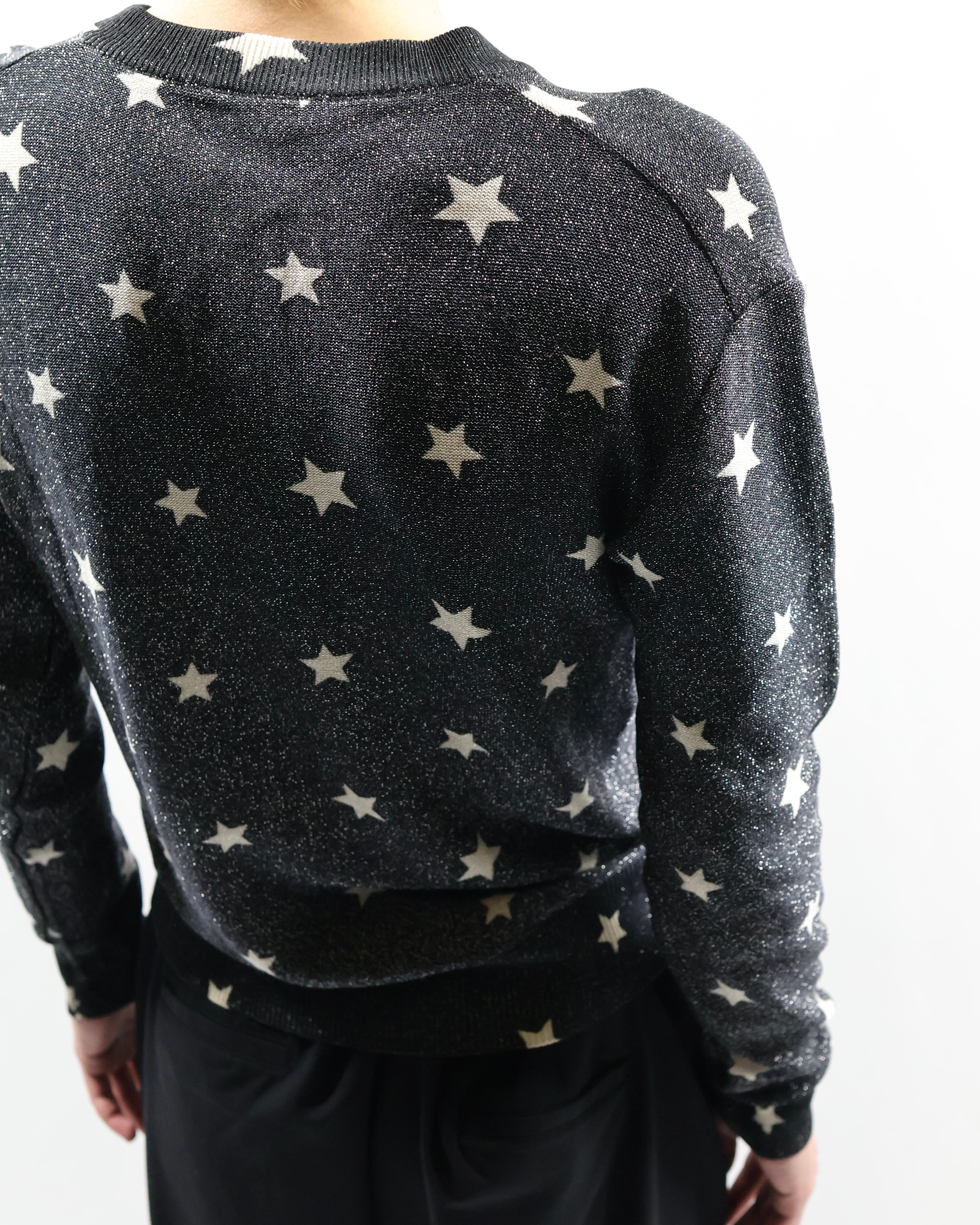 モノトーンでラメと星のデザインが際立つ薄めのニット。インナーに差し込むだけでかなりファッショナブルになり、コーデの主役としておすすめ。春先は一枚で、秋冬はレイヤードとして柄をちらっと見せるだけでもインパクトがあり、薄いため着膨れもせずモードでシャープな雰囲気も崩さずに着ていただけます。