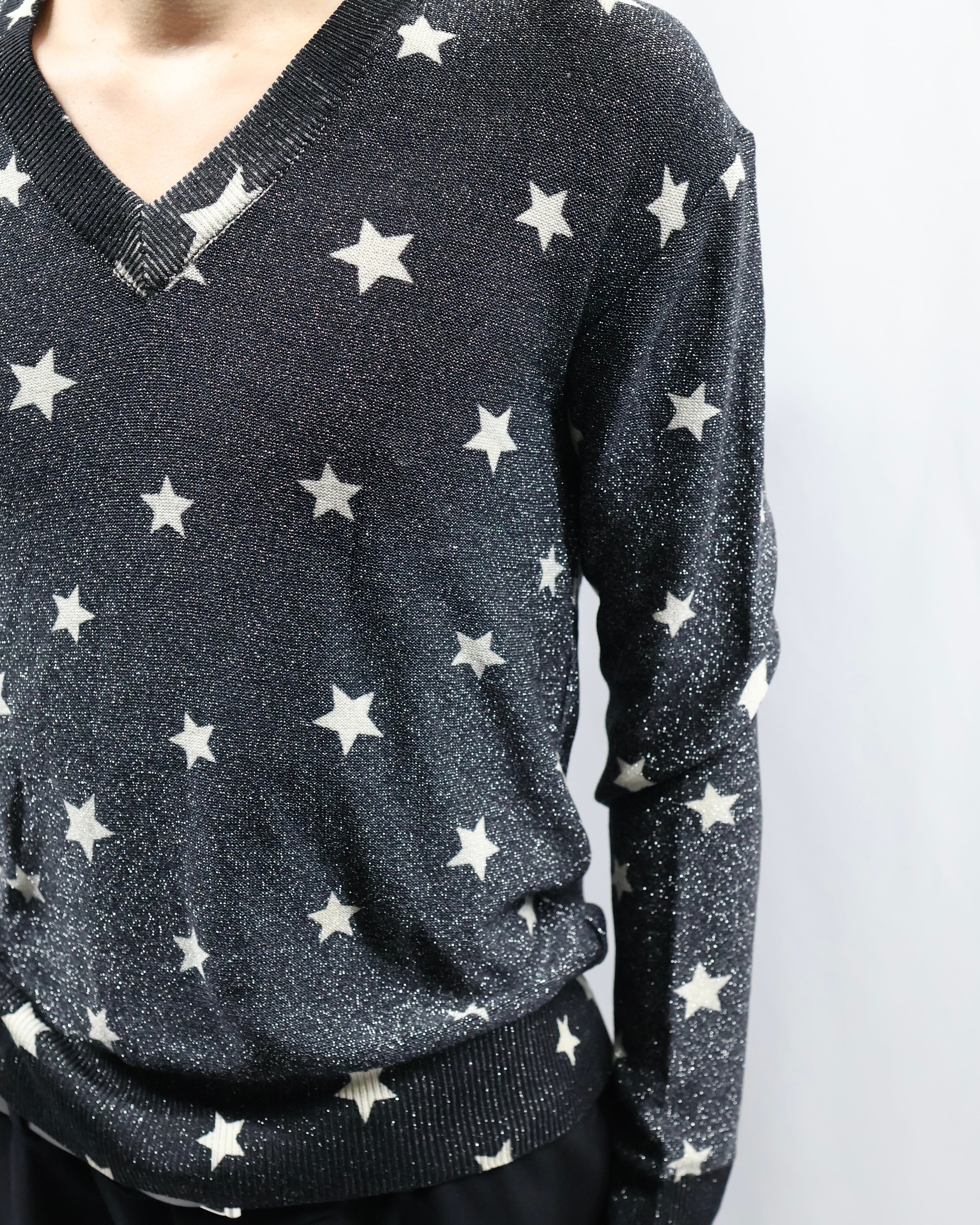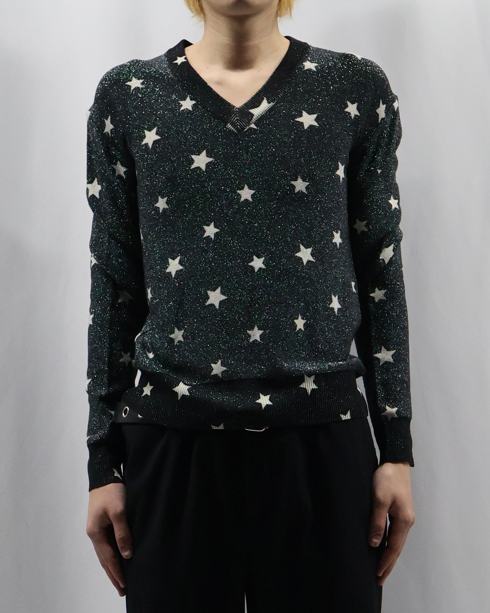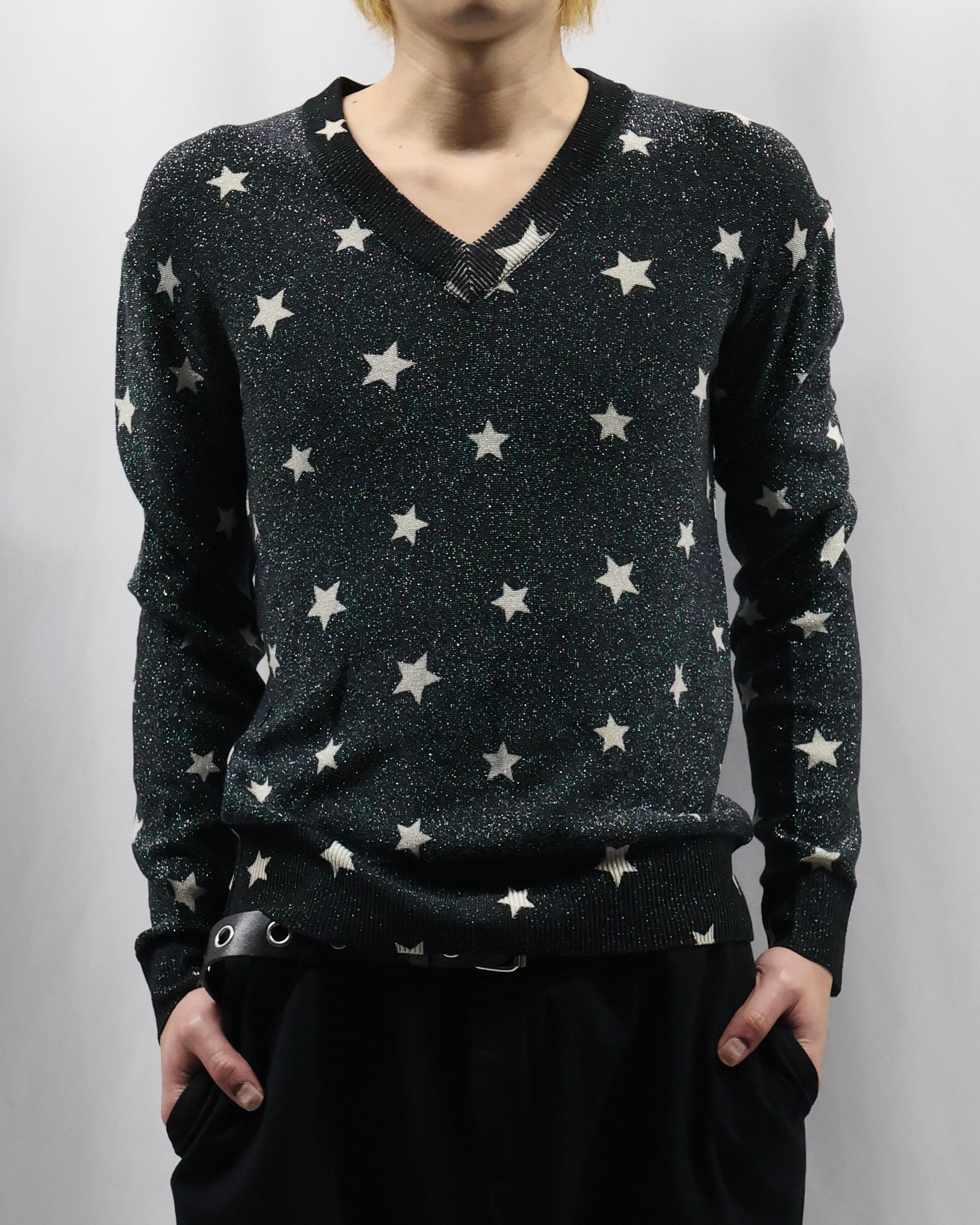 モノトーンでラメと星のデザインが際立つ薄めのニット。インナーに差し込むだけでかなりファッショナブルになり、コーデの主役としておすすめ。春先は一枚で、秋冬はレイヤードとして柄をちらっと見せるだけでもインパクトがあり、薄いため着膨れもせずモードでシャープな雰囲気も崩さずに着ていただけます。