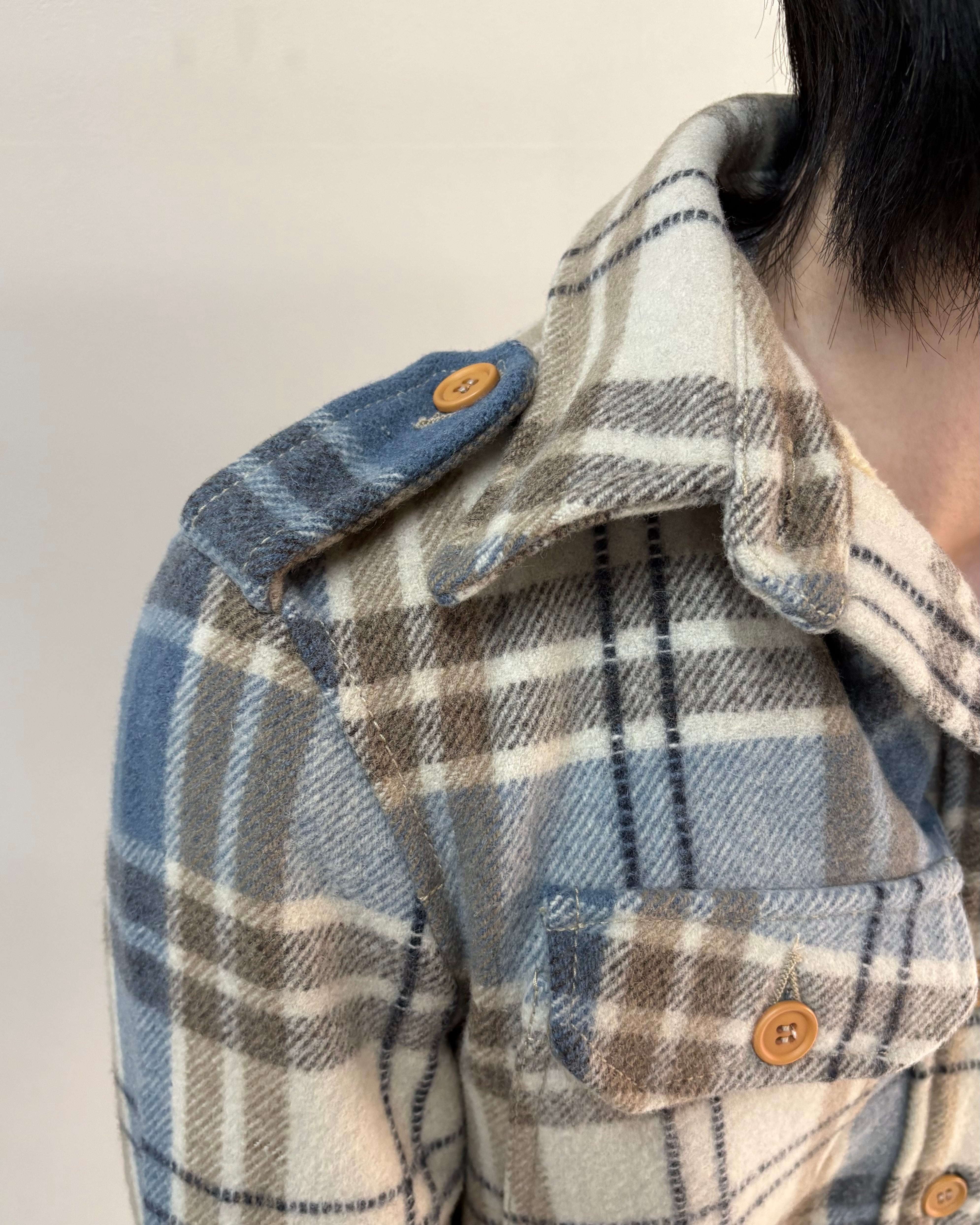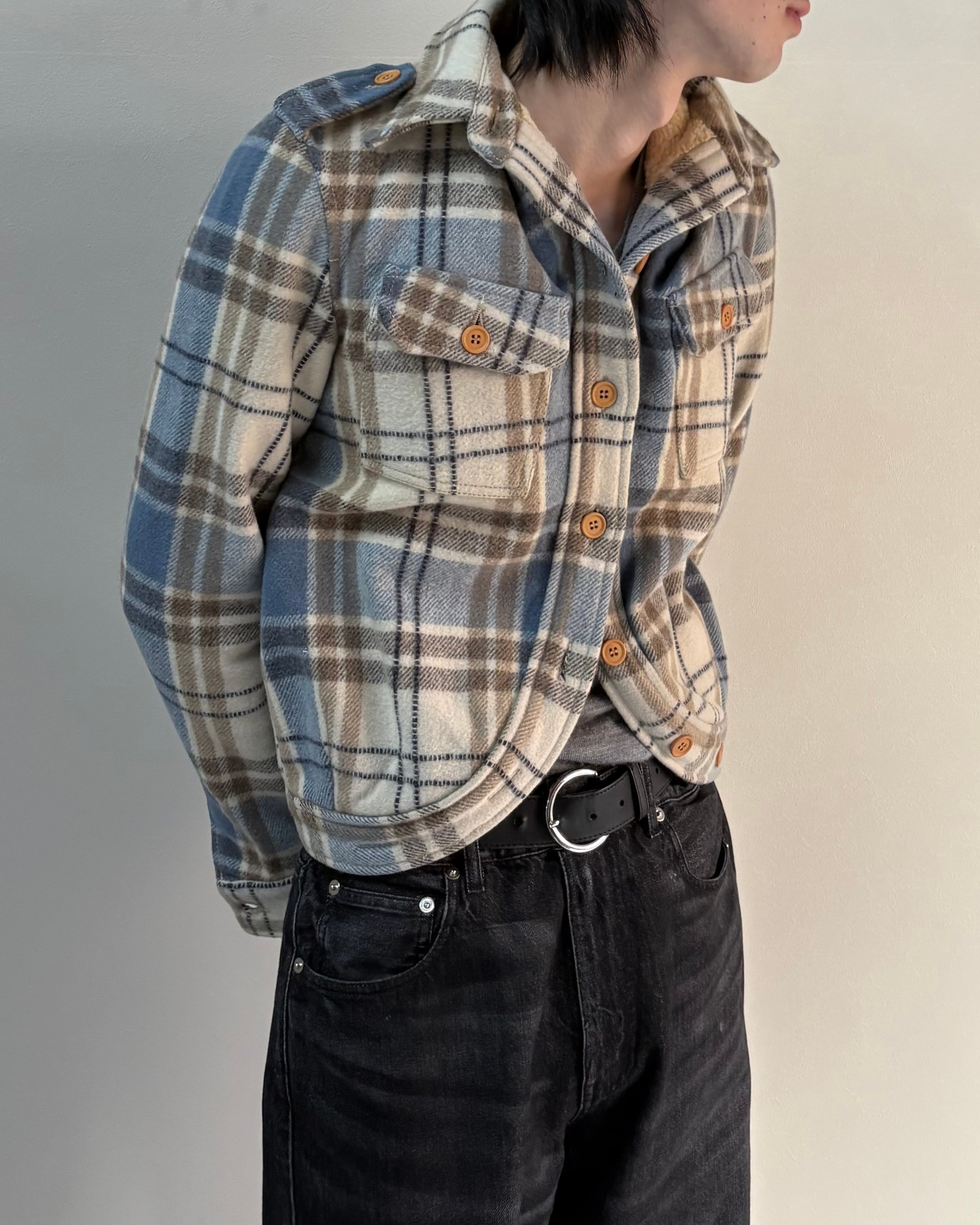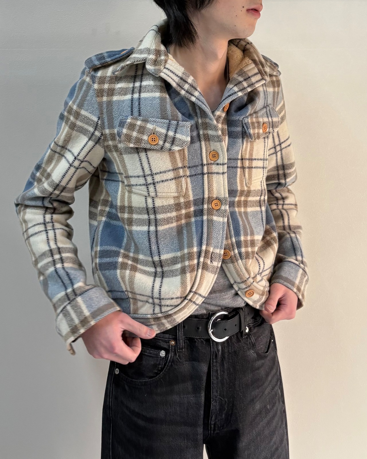 エポーレットやチェックの配色により、紳士な雰囲気も出せれる唯一無二な1着