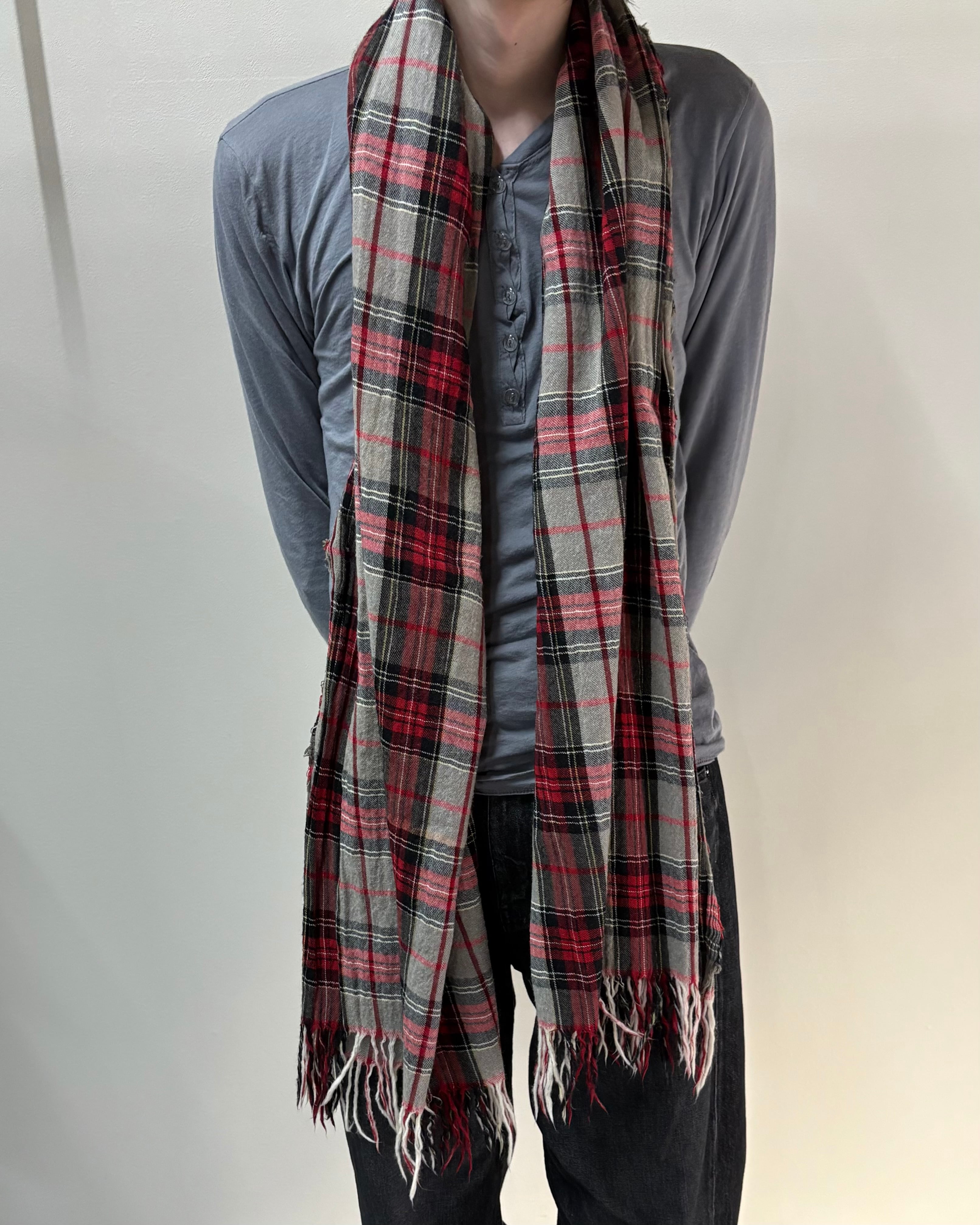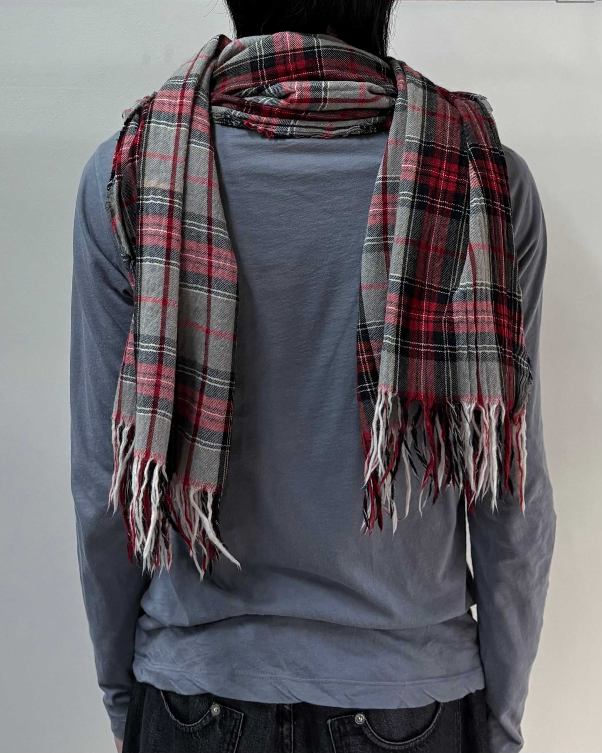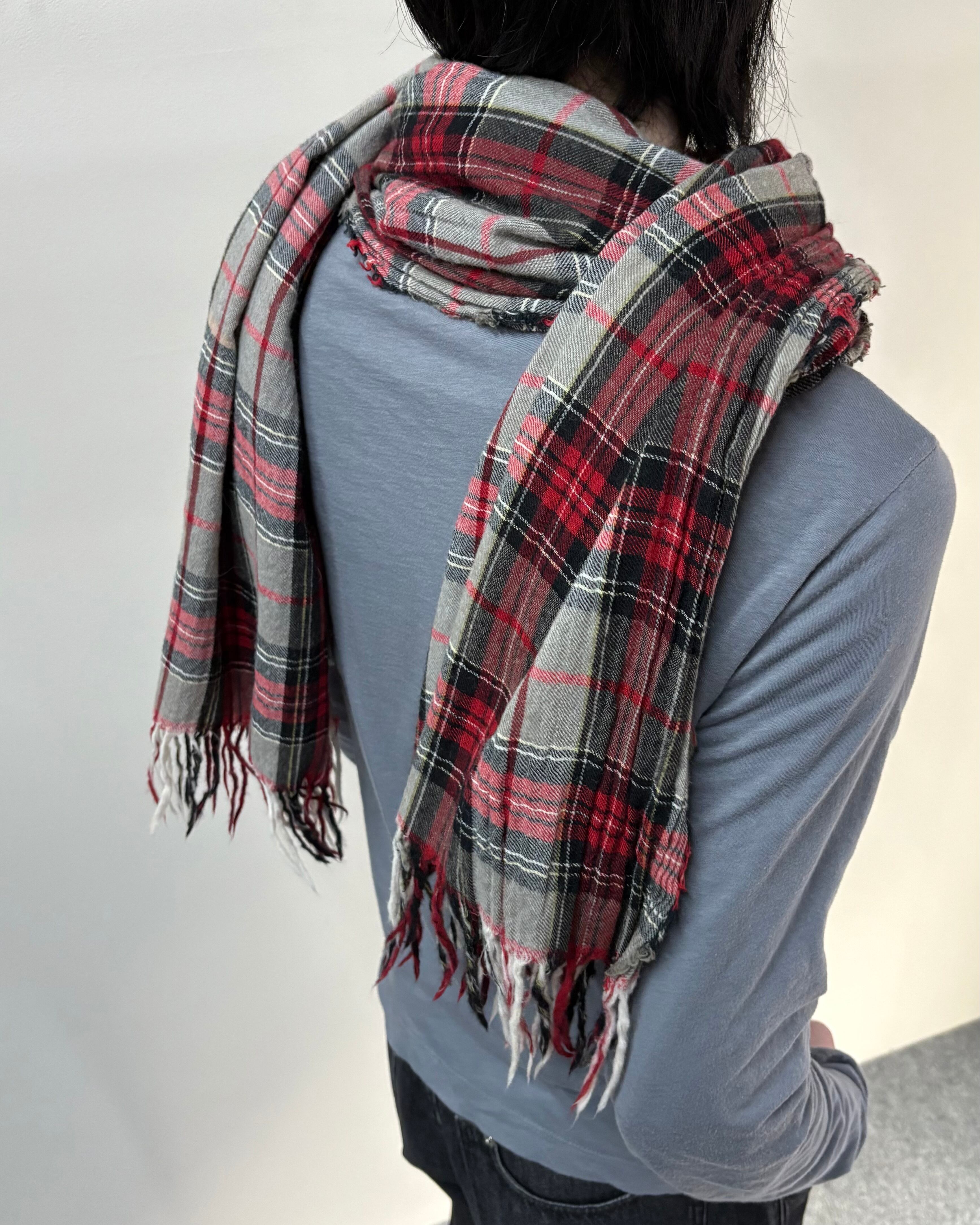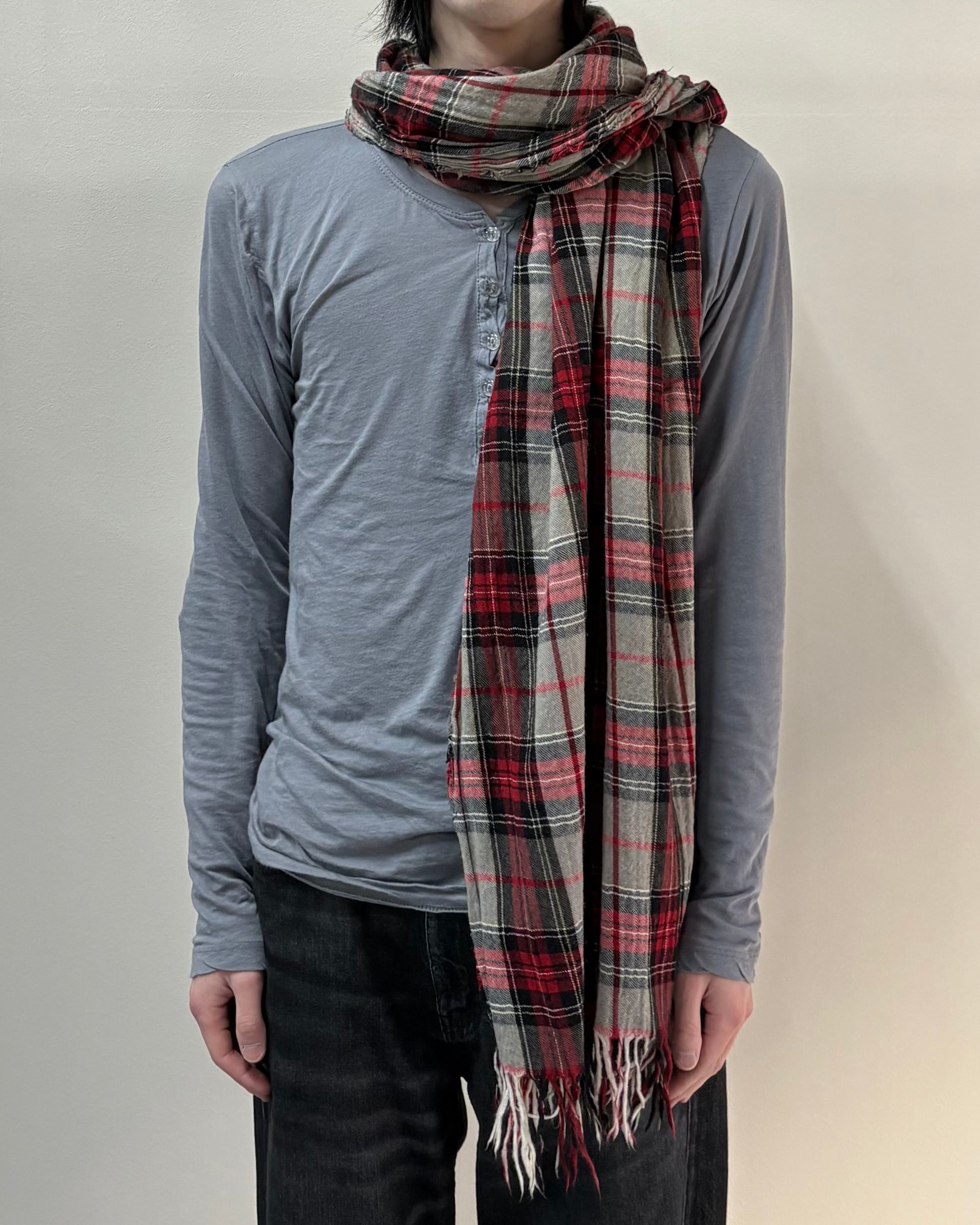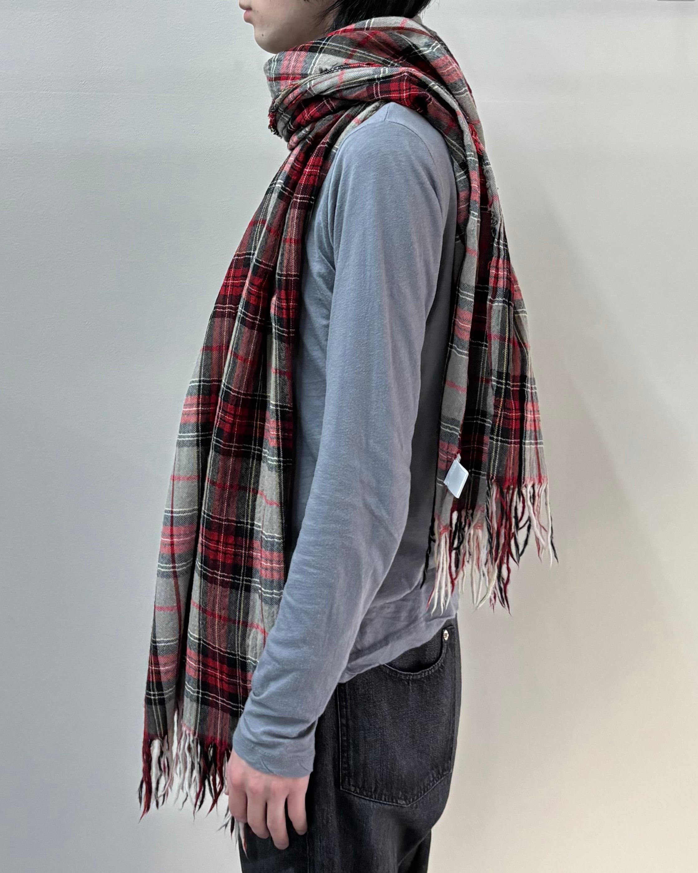 レッド、グレー、ベージュを基調としたクラシックなタータンチェックに、ブランド特有の洗練されたバランス感が加わった一本。大判の為巻き方次第で印象を変えられるアイテム。