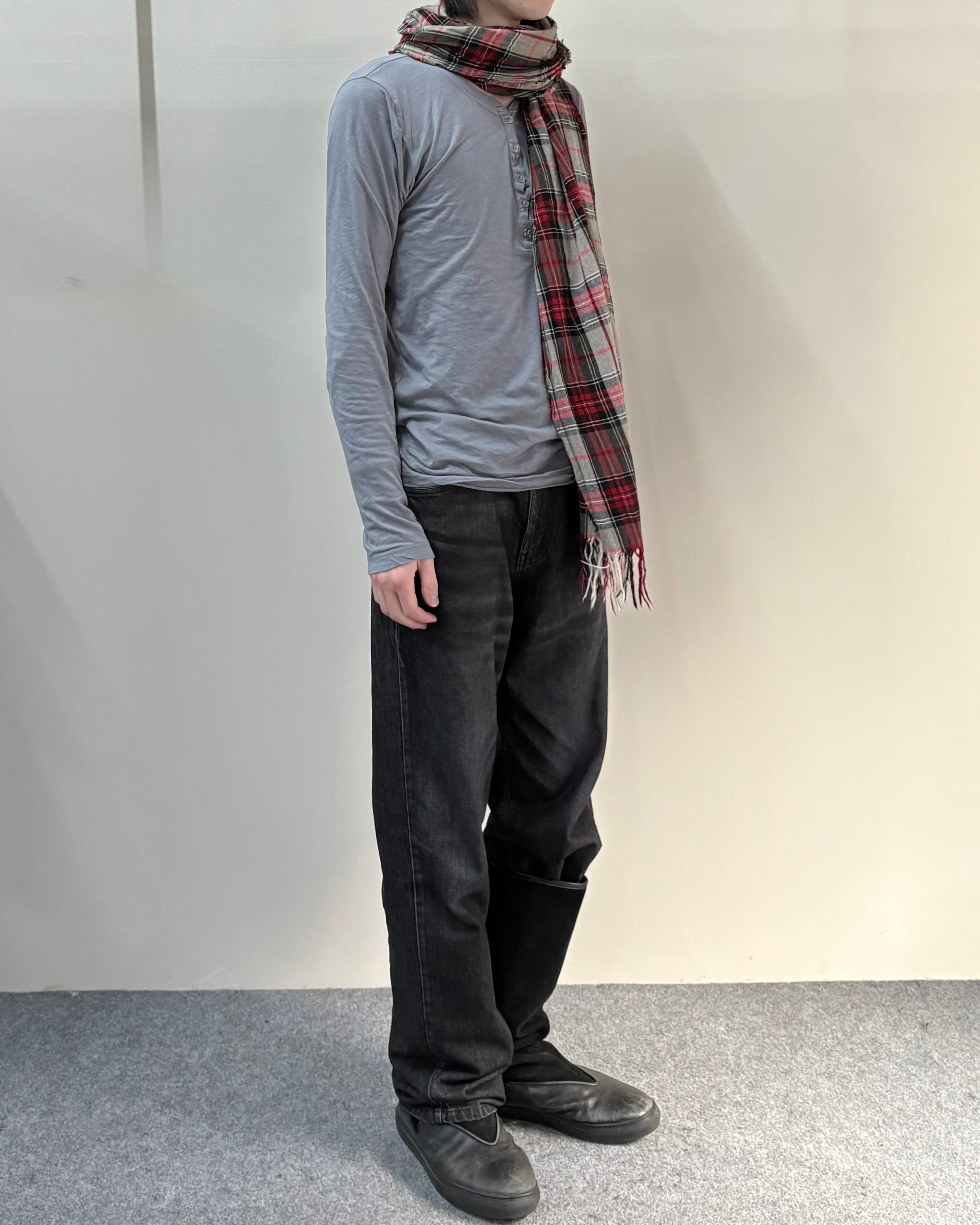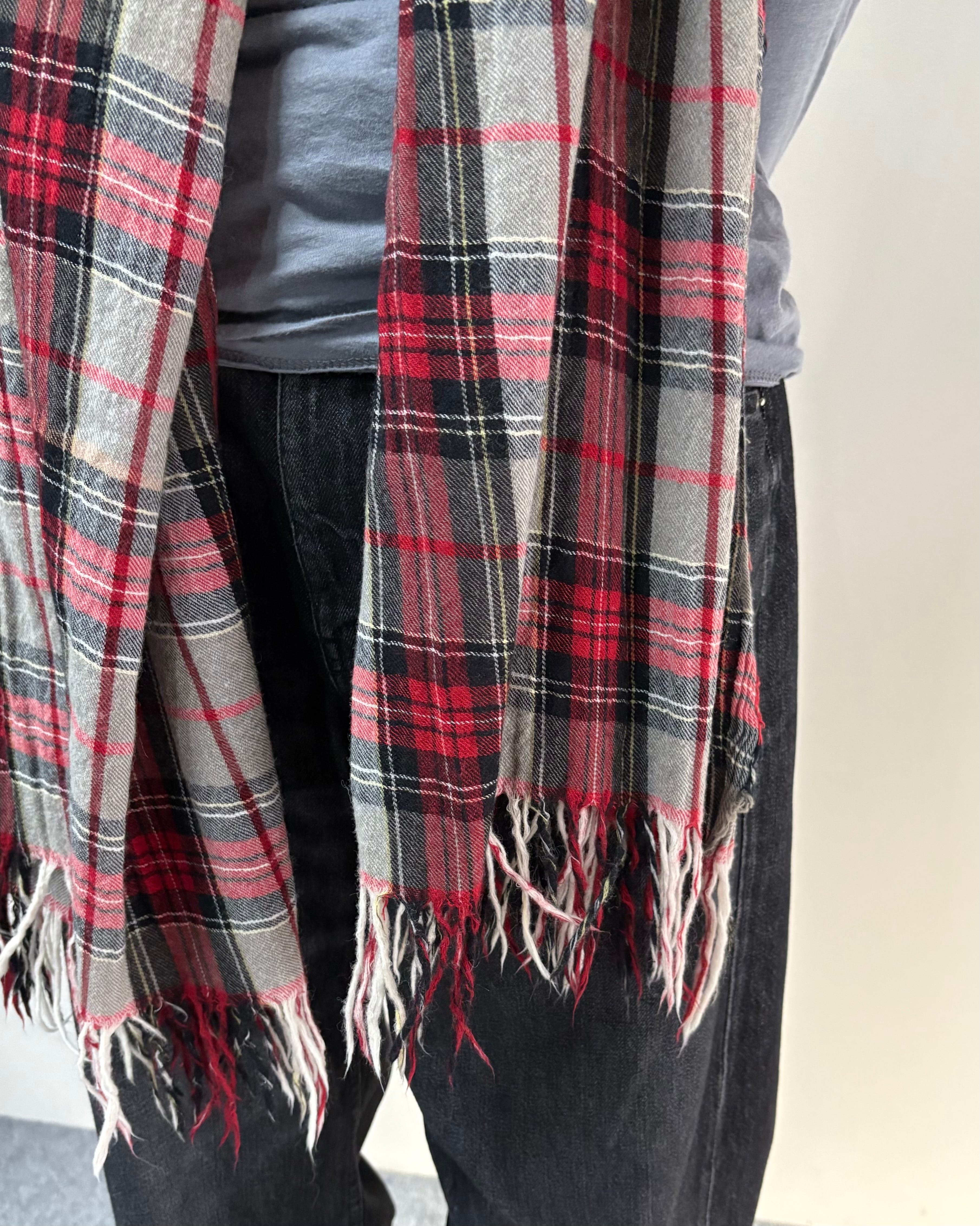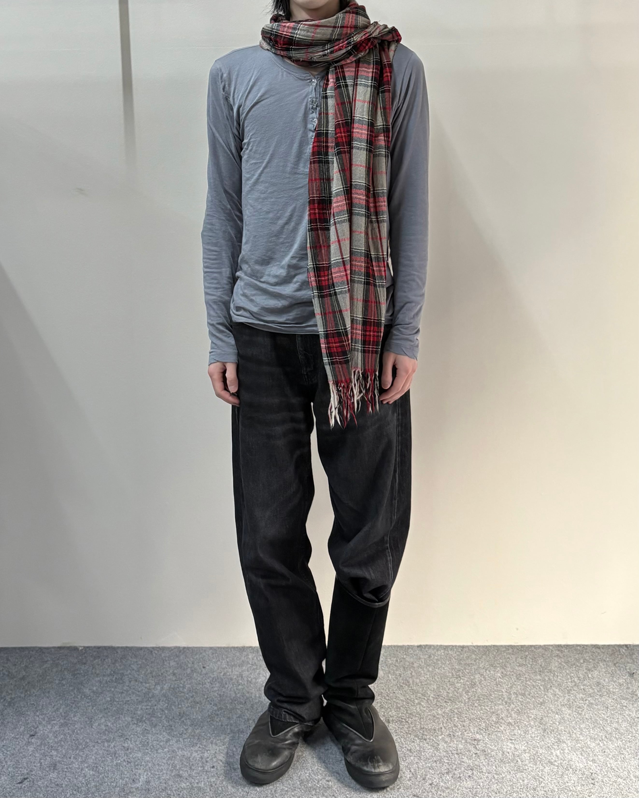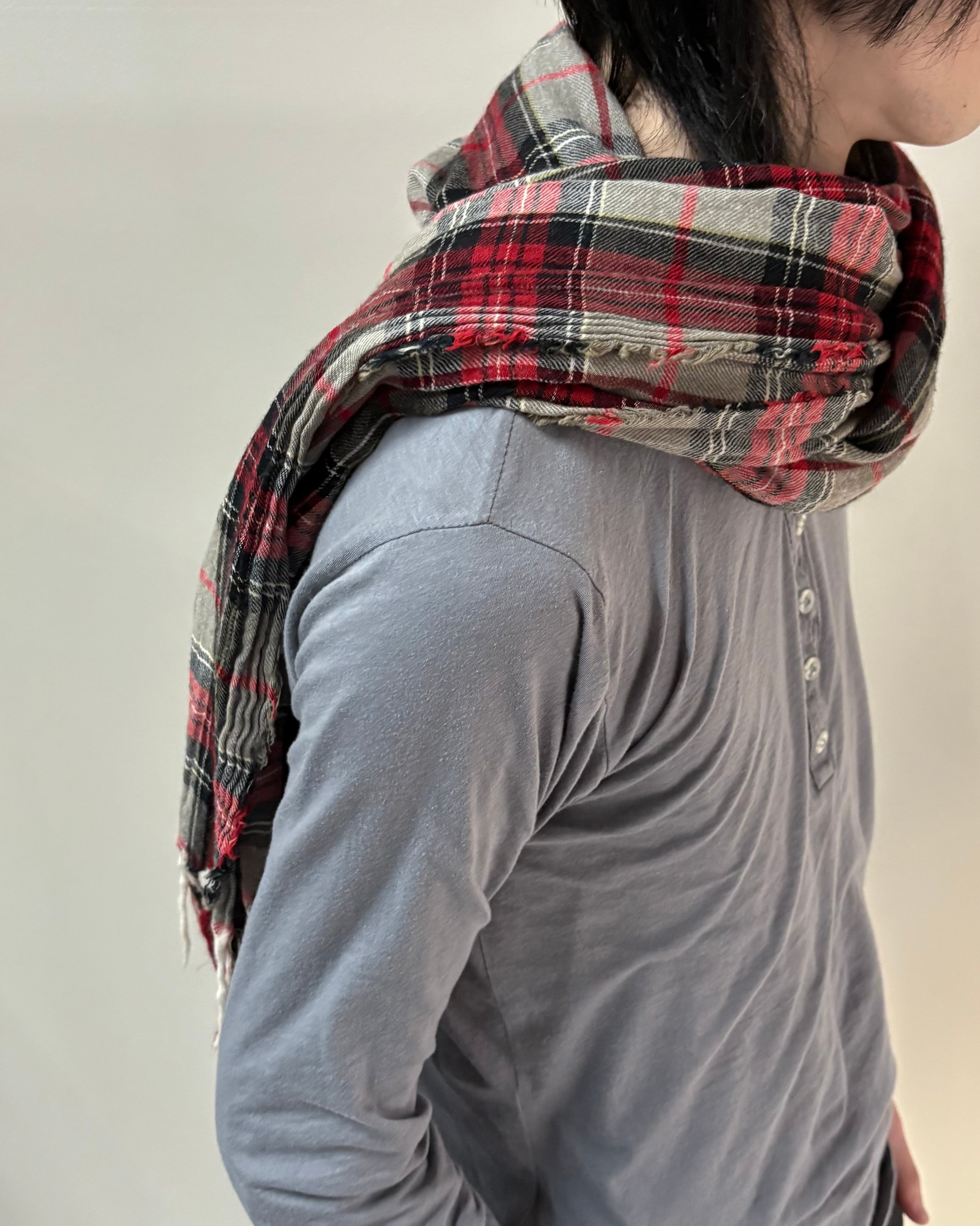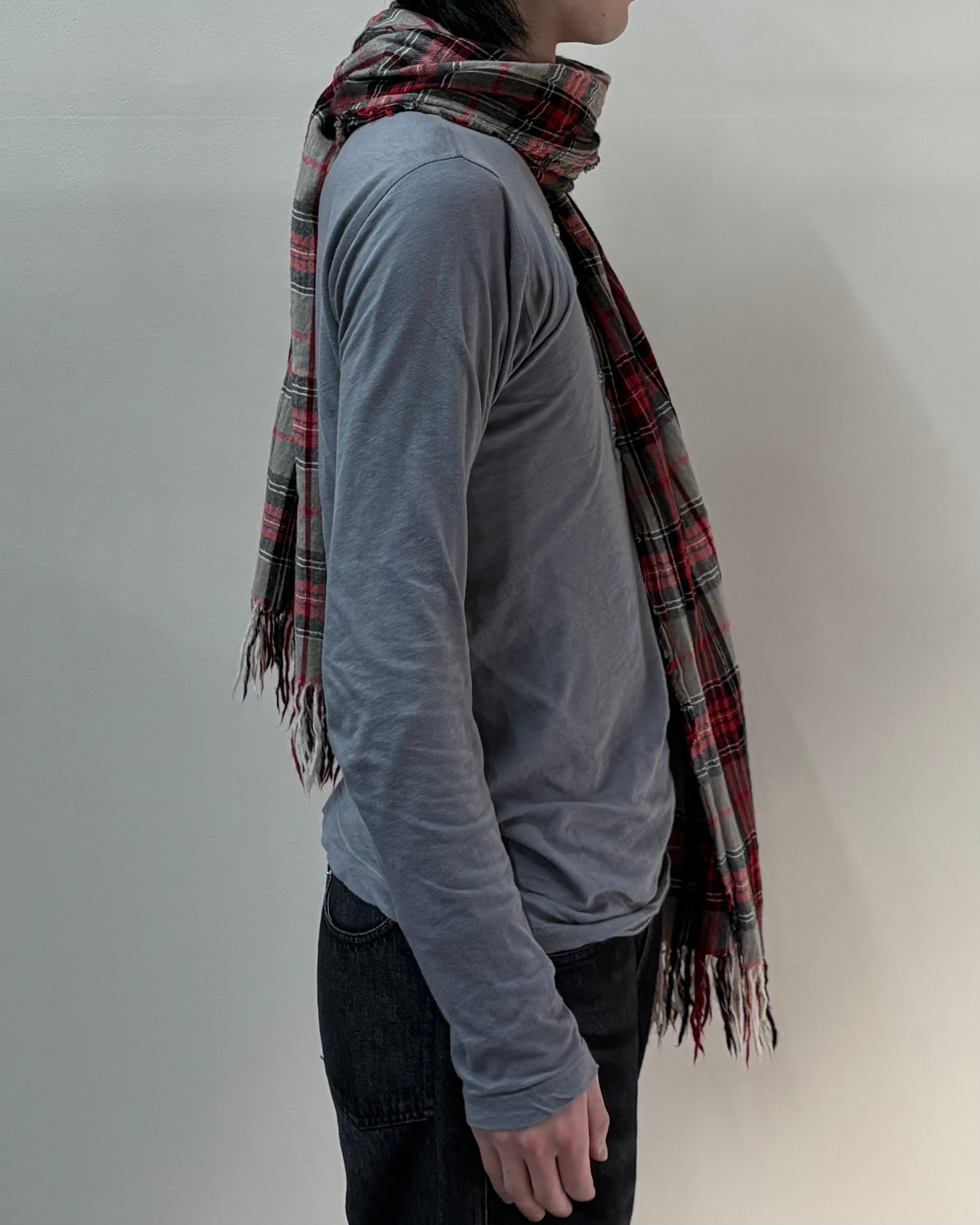 レッド、グレー、ベージュを基調としたクラシックなタータンチェックに、ブランド特有の洗練されたバランス感が加わった一本。大判の為巻き方次第で印象を変えられるアイテム。