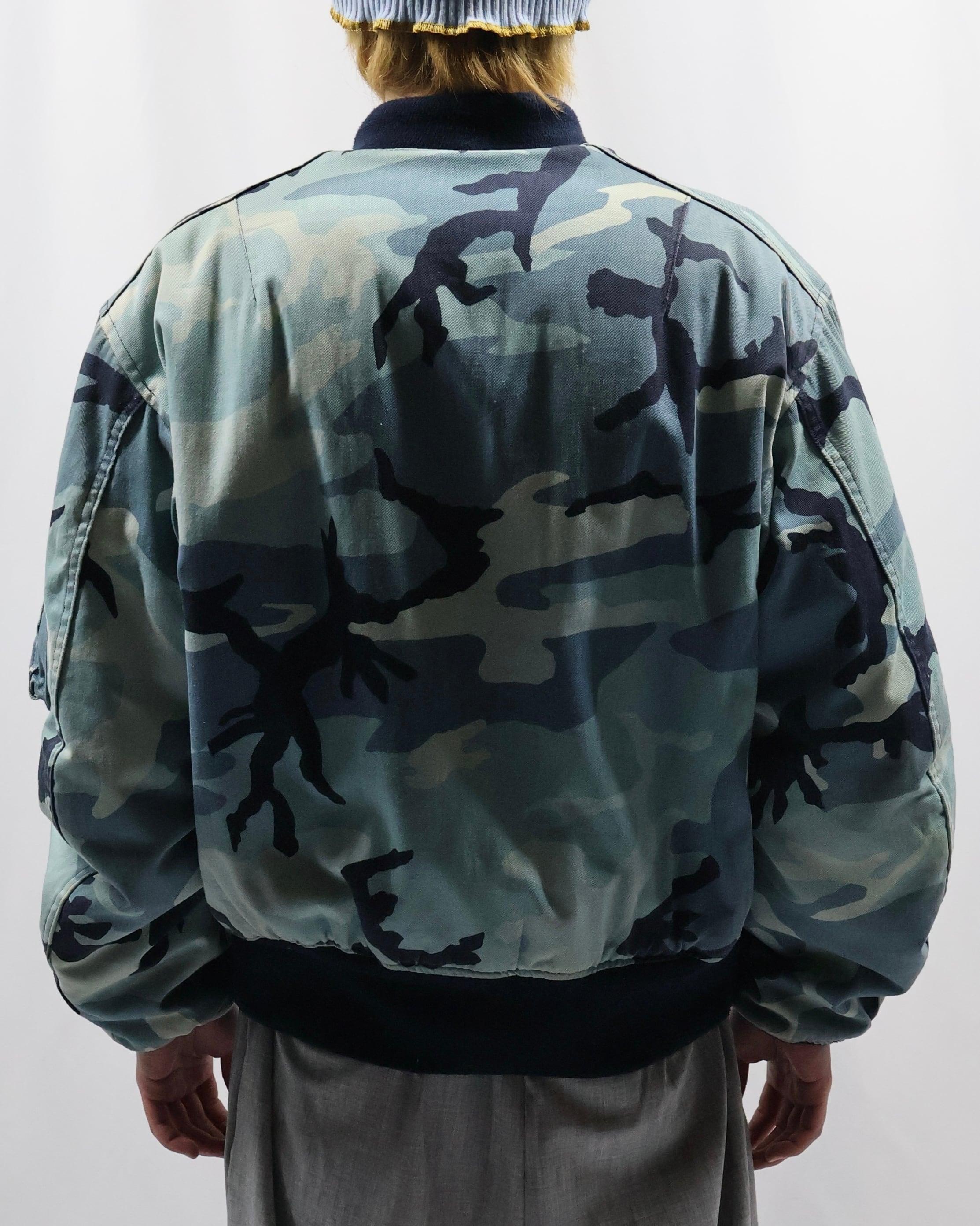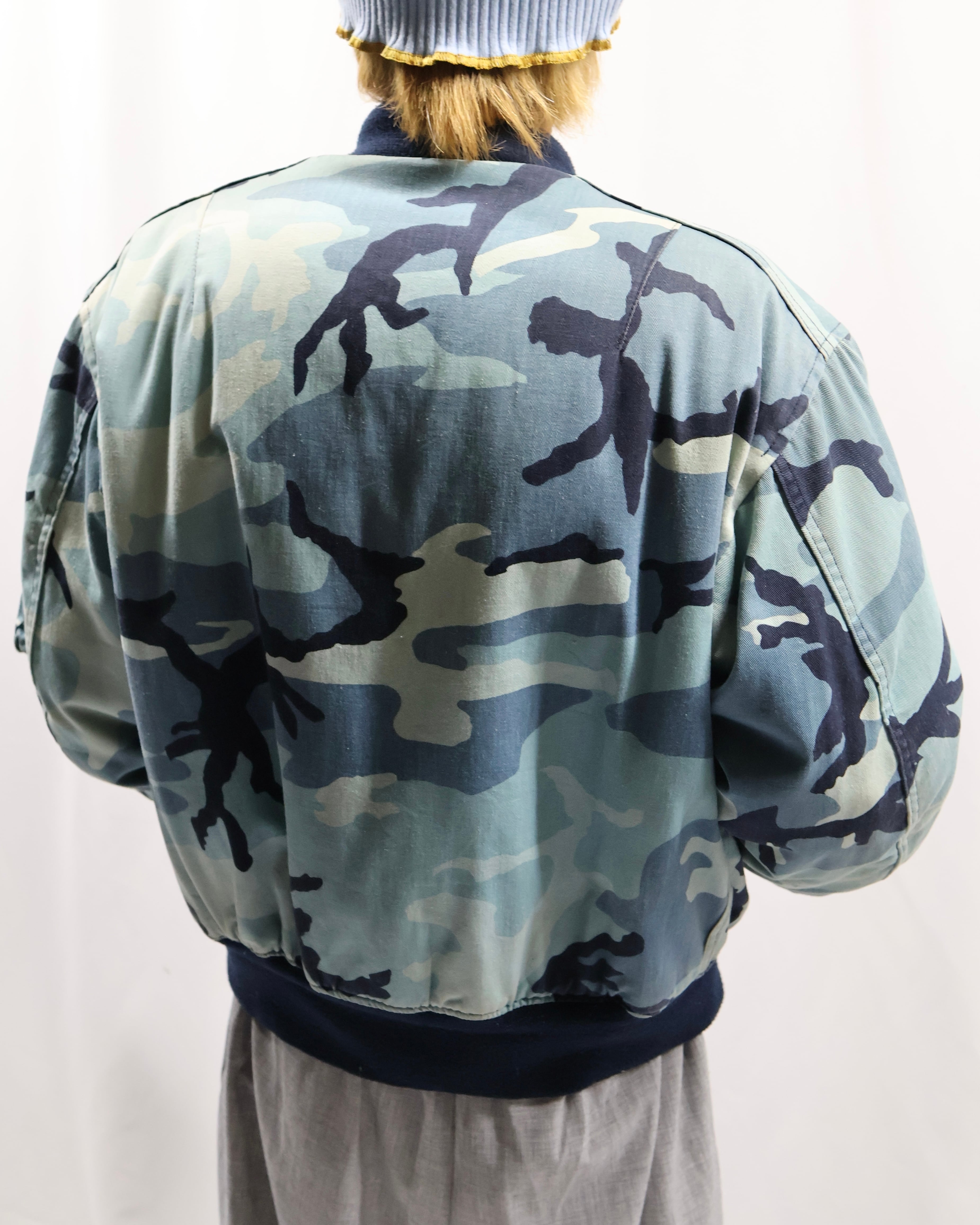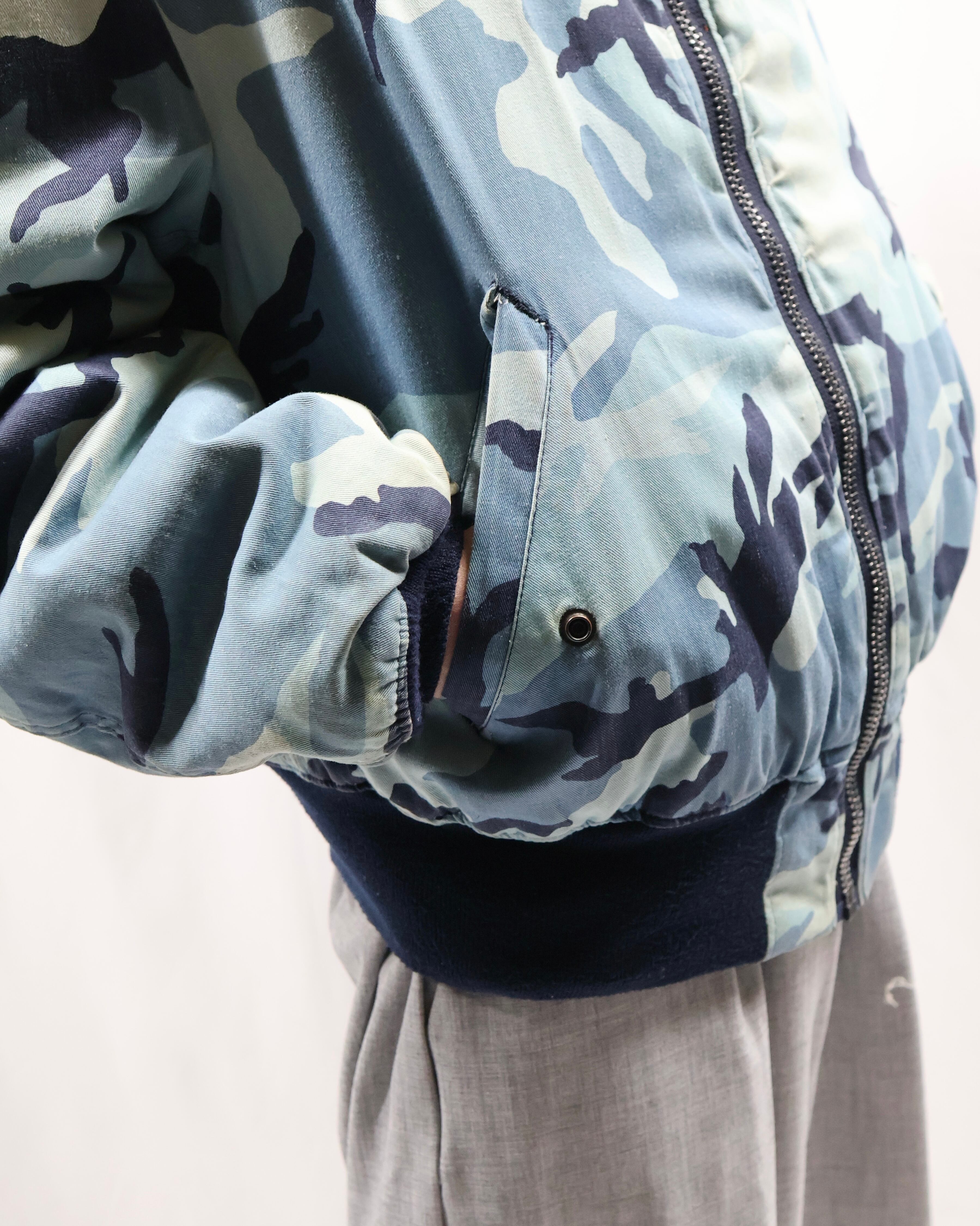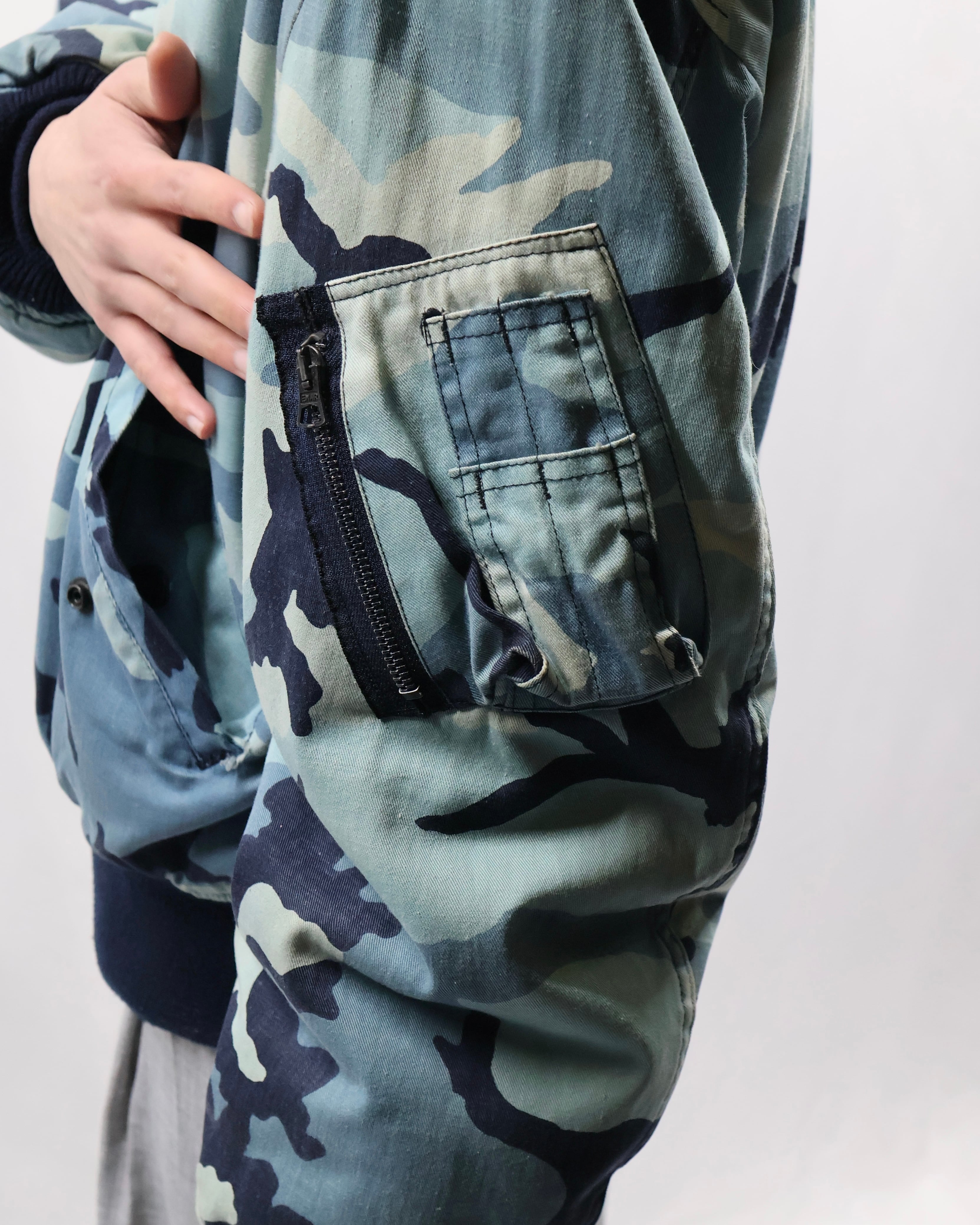 ミリタリーの珍しいデザインのMA-1で玄人な雰囲気を醸し出す一枚。ボリュームがあるのもgoodで冬の寂しくなりがちなスタイリングに彩りとインパクトを加えてくれます。リバーシブルになっており、暖色のスタイルには裏返して使っていただくと、迷彩の部分が良いアクセントとなり、スタイリングに深みが出ます。