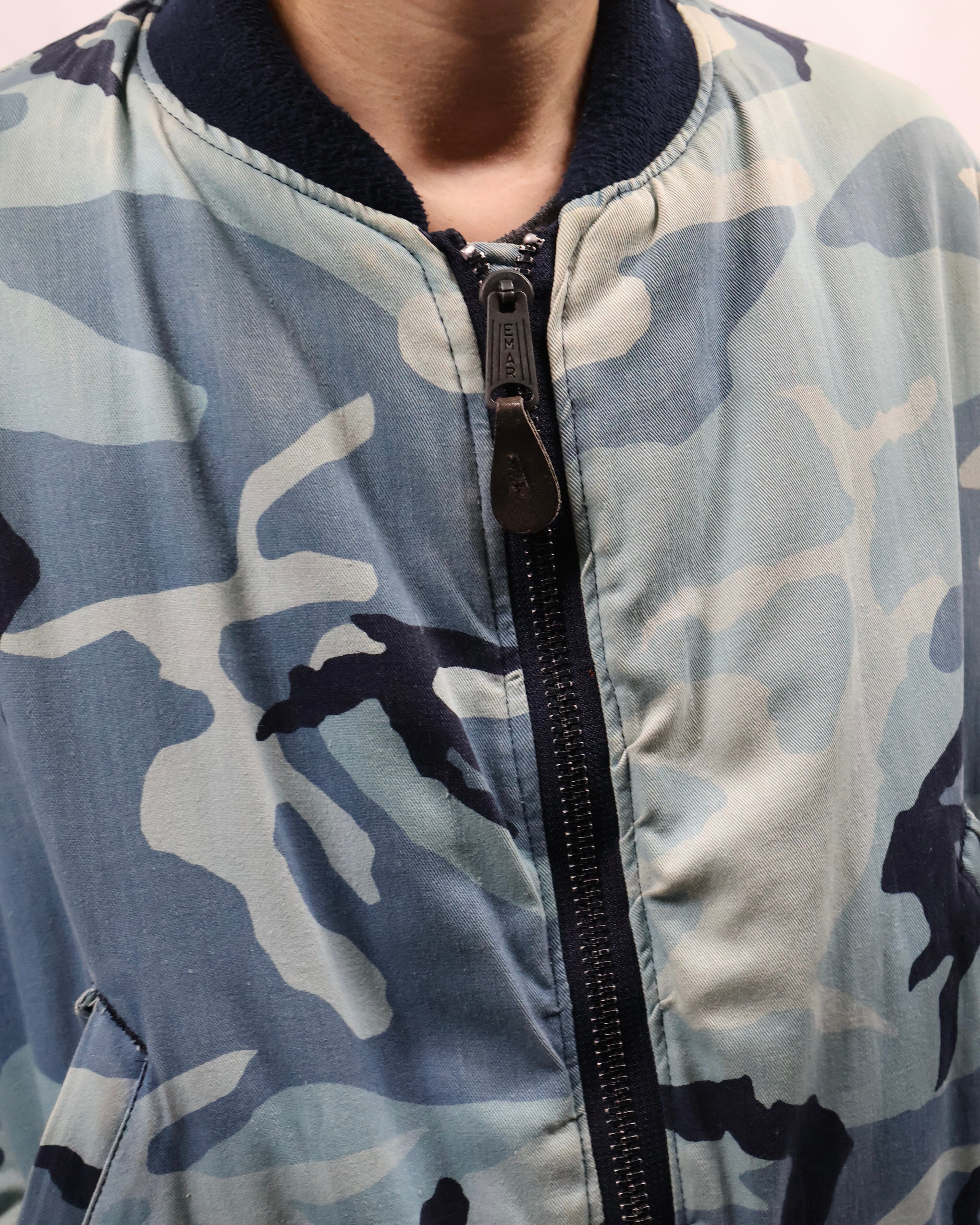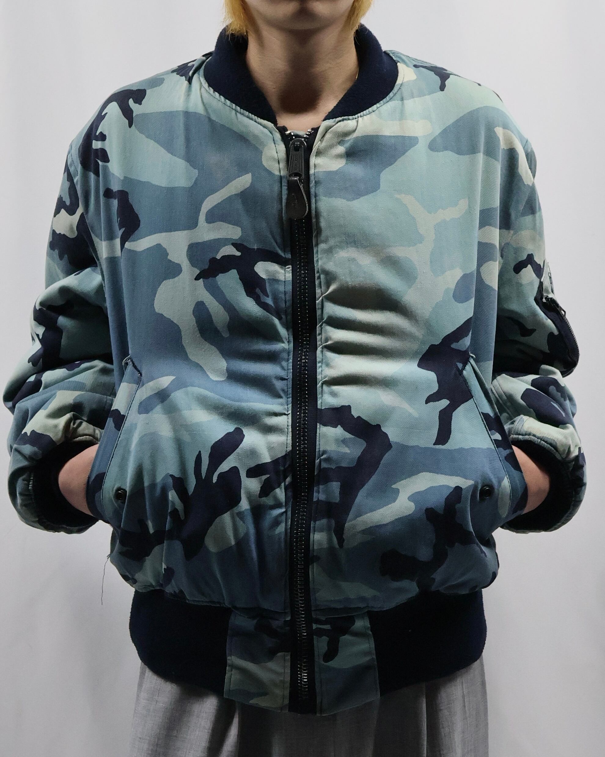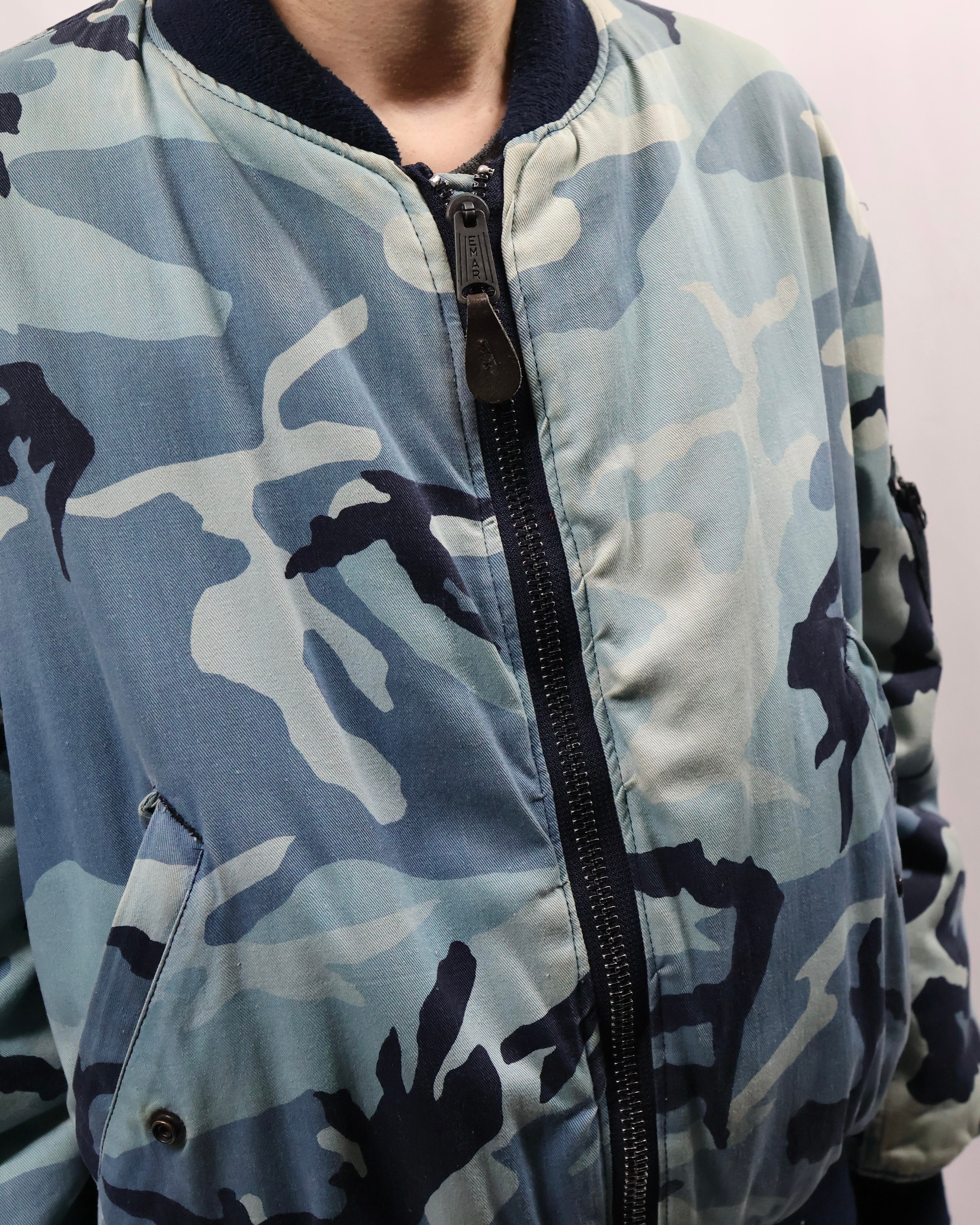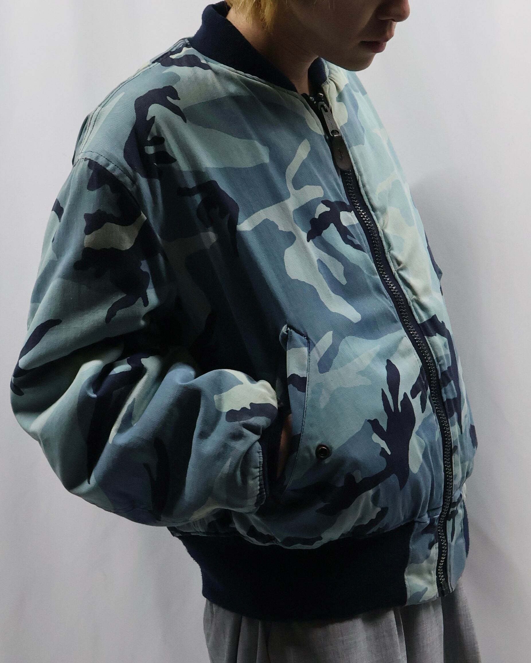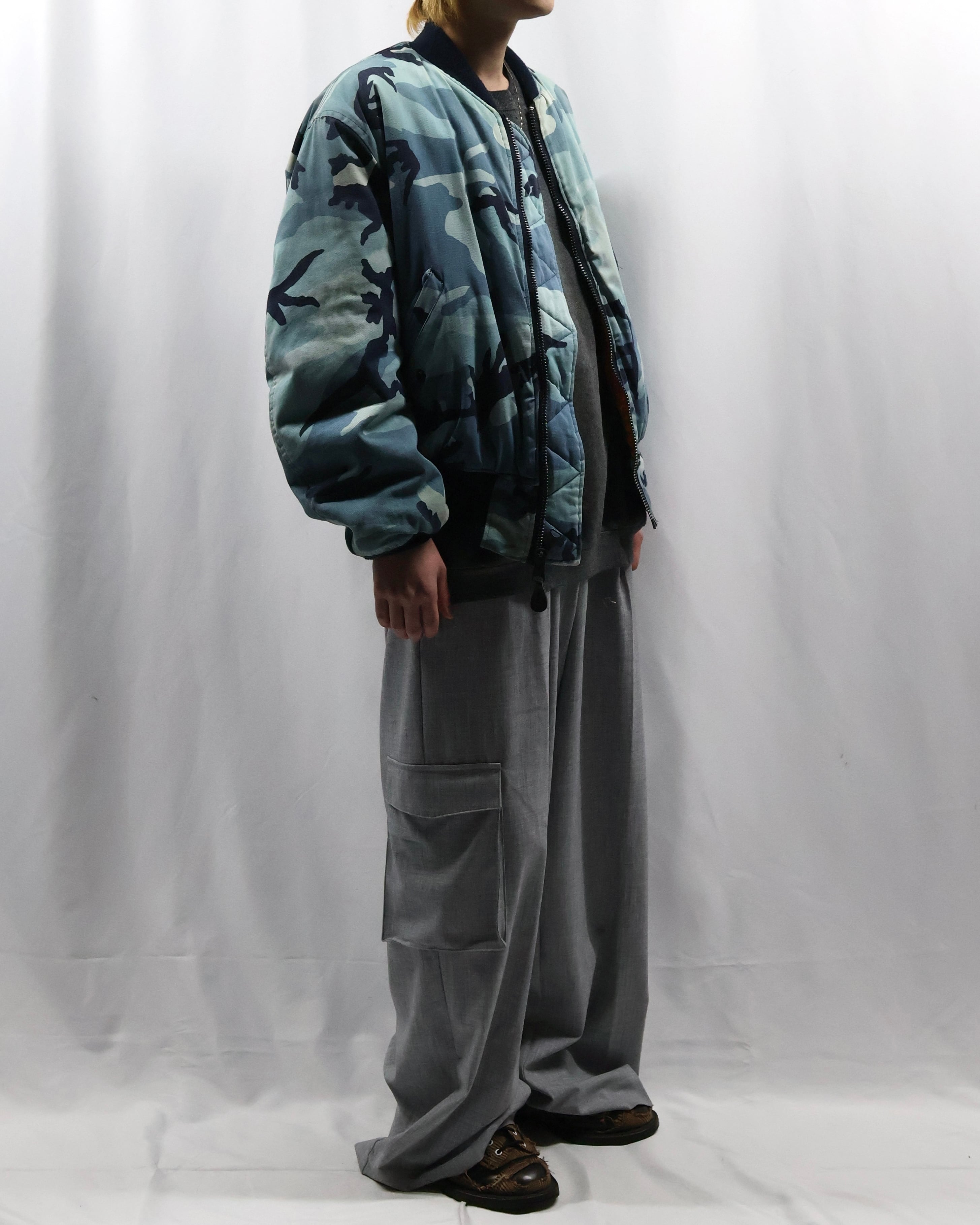 ミリタリーの珍しいデザインのMA-1で玄人な雰囲気を醸し出す一枚。ボリュームがあるのもgoodで冬の寂しくなりがちなスタイリングに彩りとインパクトを加えてくれます。リバーシブルになっており、暖色のスタイルには裏返して使っていただくと、迷彩の部分が良いアクセントとなり、スタイリングに深みが出ます。