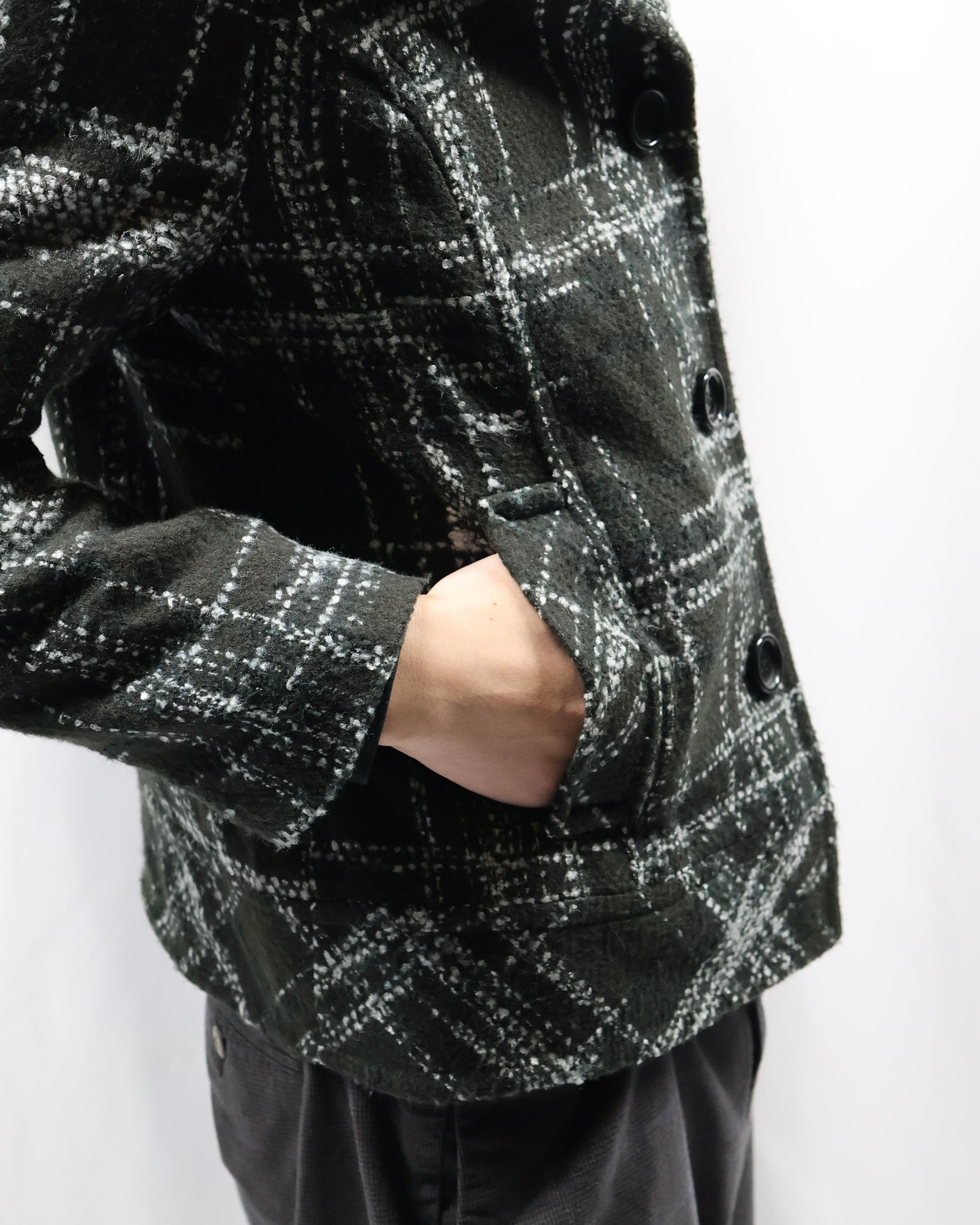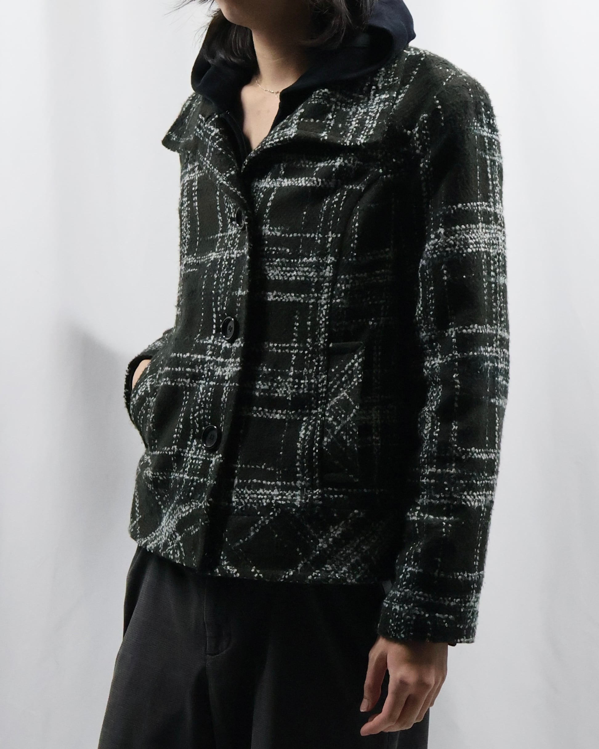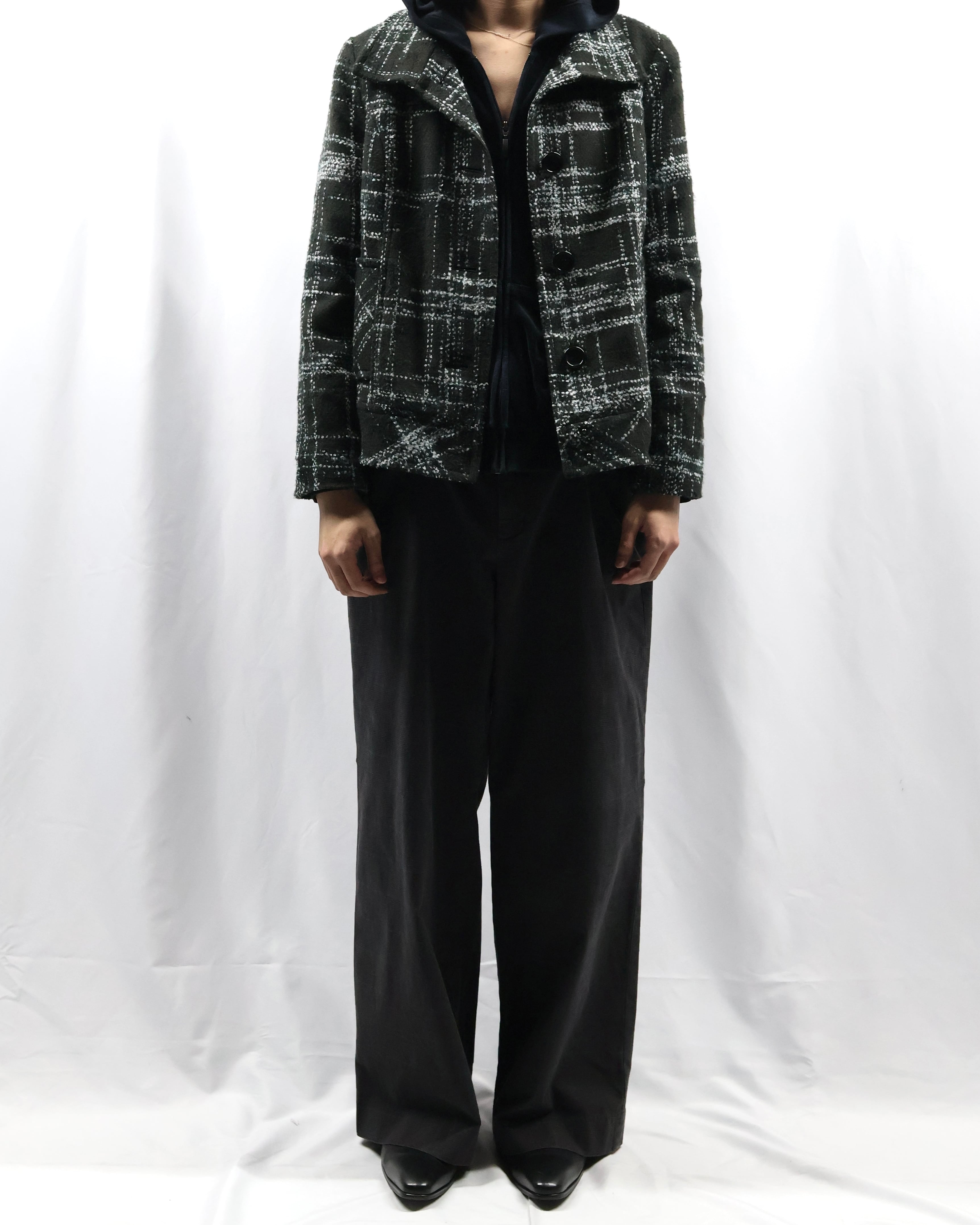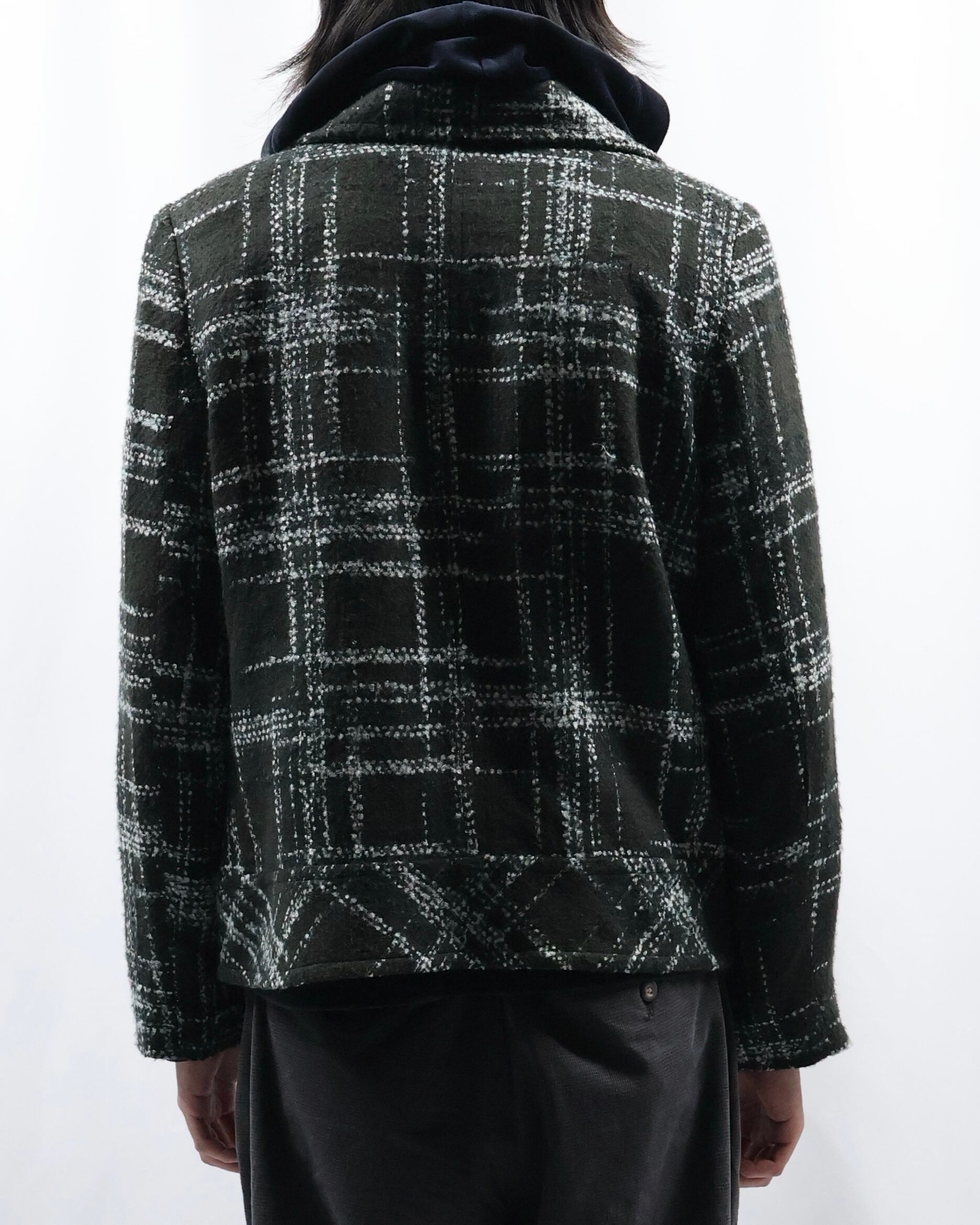 短丈のツイードライクなデザインのジャケット。落ち着いた色味ではありながら短丈でトレンディなシルエット、インナーとしてもライトアウターとしても使えるジャケットです。タイトなサイジングがコーデにメリハリを与え、洗練された雰囲気を演出します。