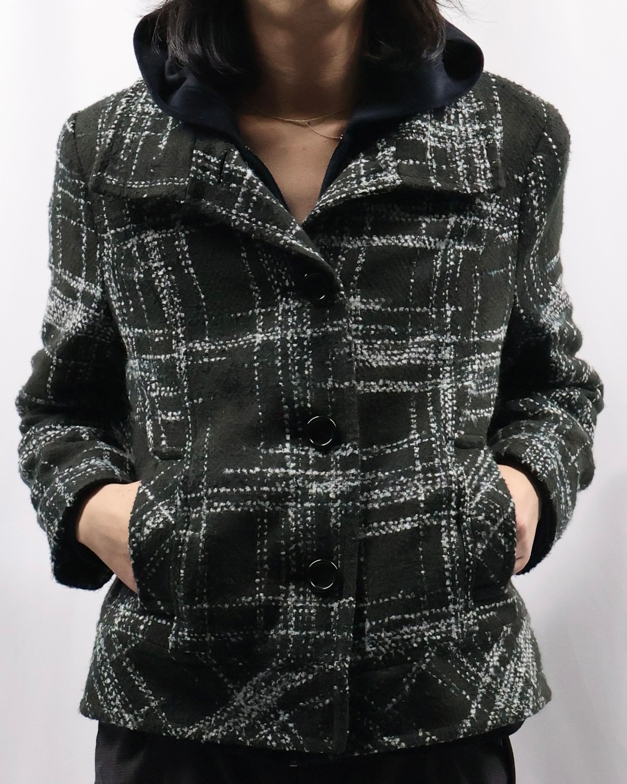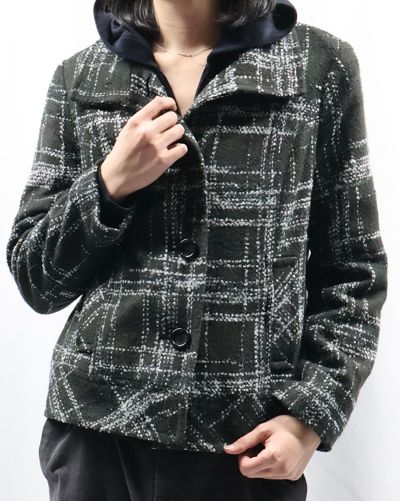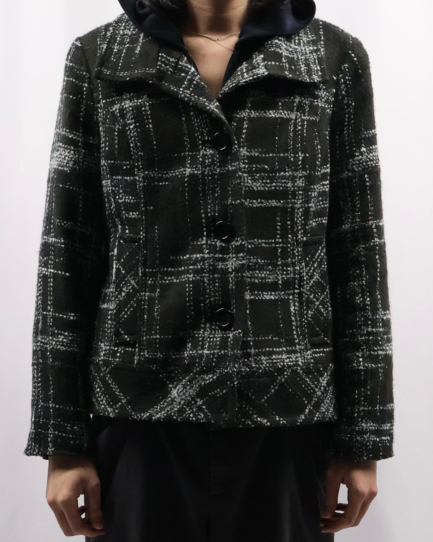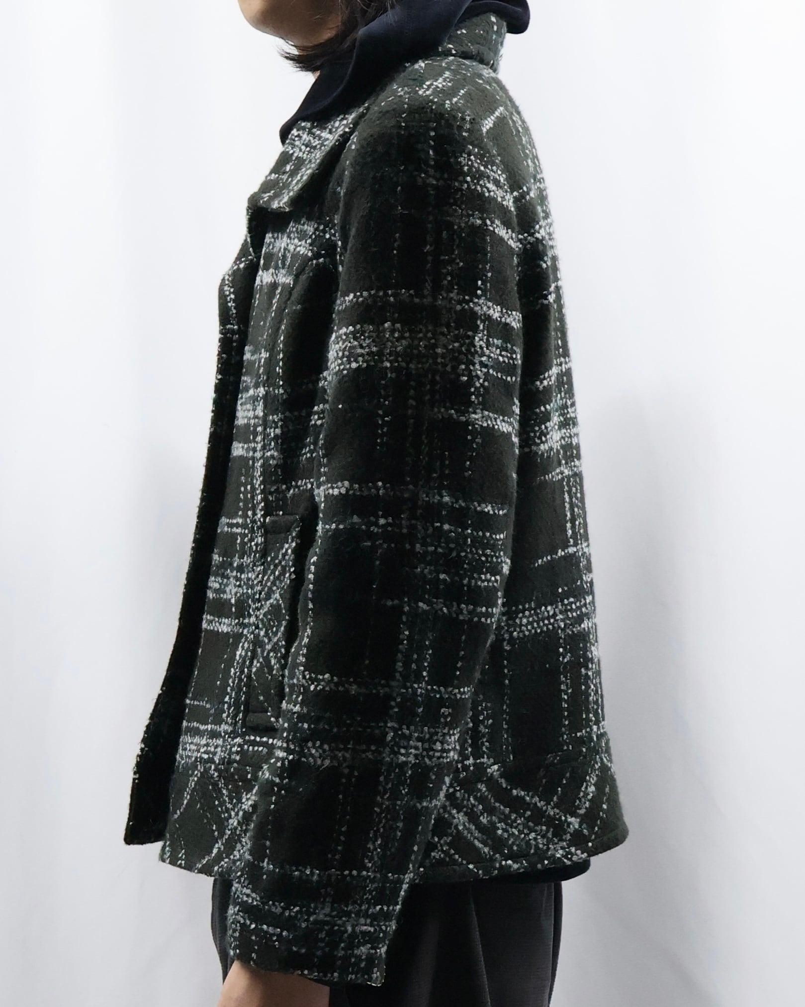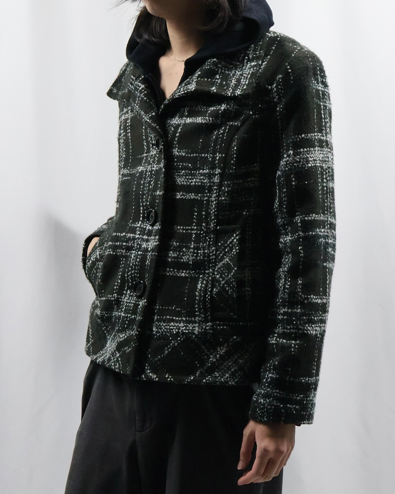 短丈のツイードライクなデザインのジャケット。落ち着いた色味ではありながら短丈でトレンディなシルエット、インナーとしてもライトアウターとしても使えるジャケットです。タイトなサイジングがコーデにメリハリを与え、洗練された雰囲気を演出します。