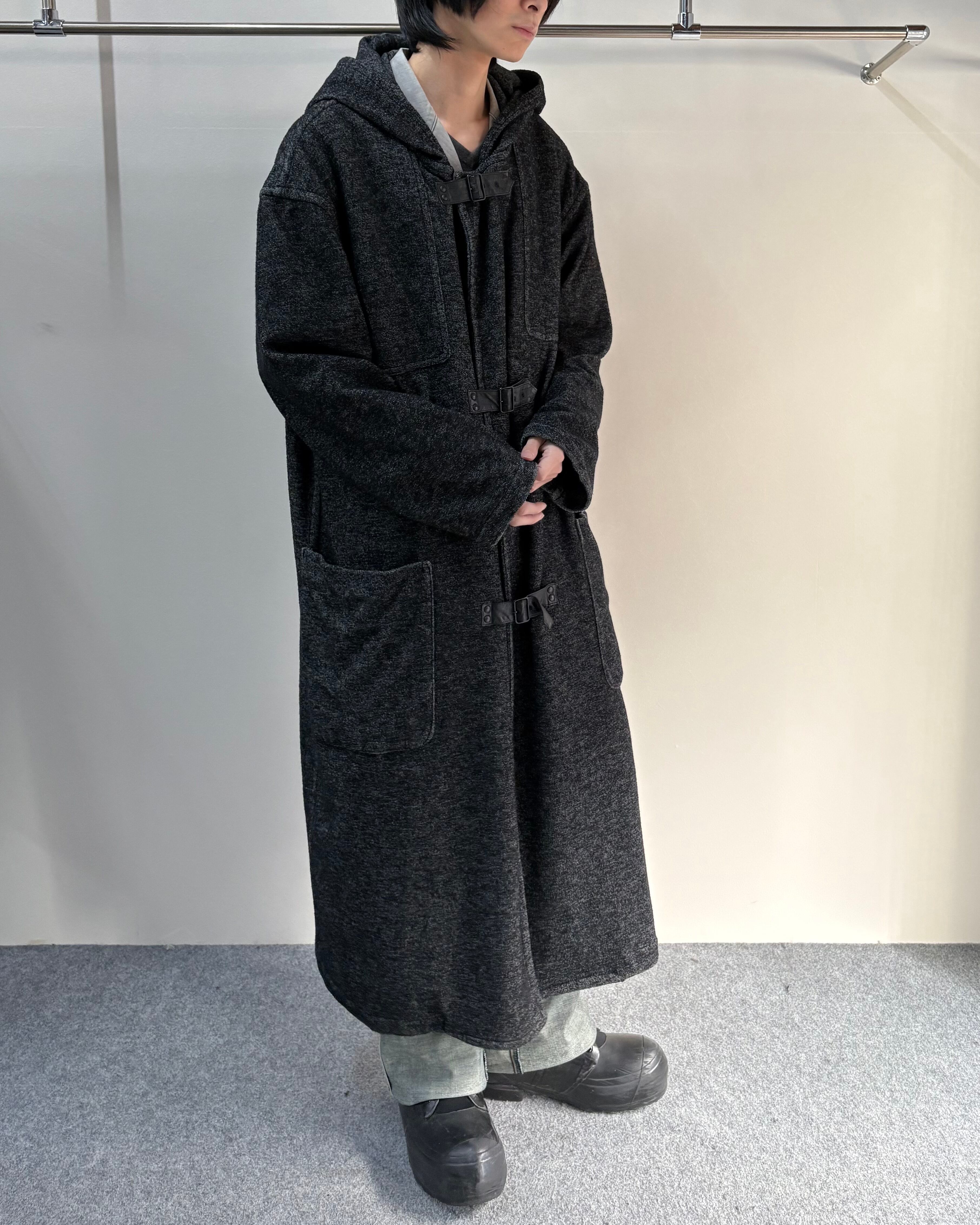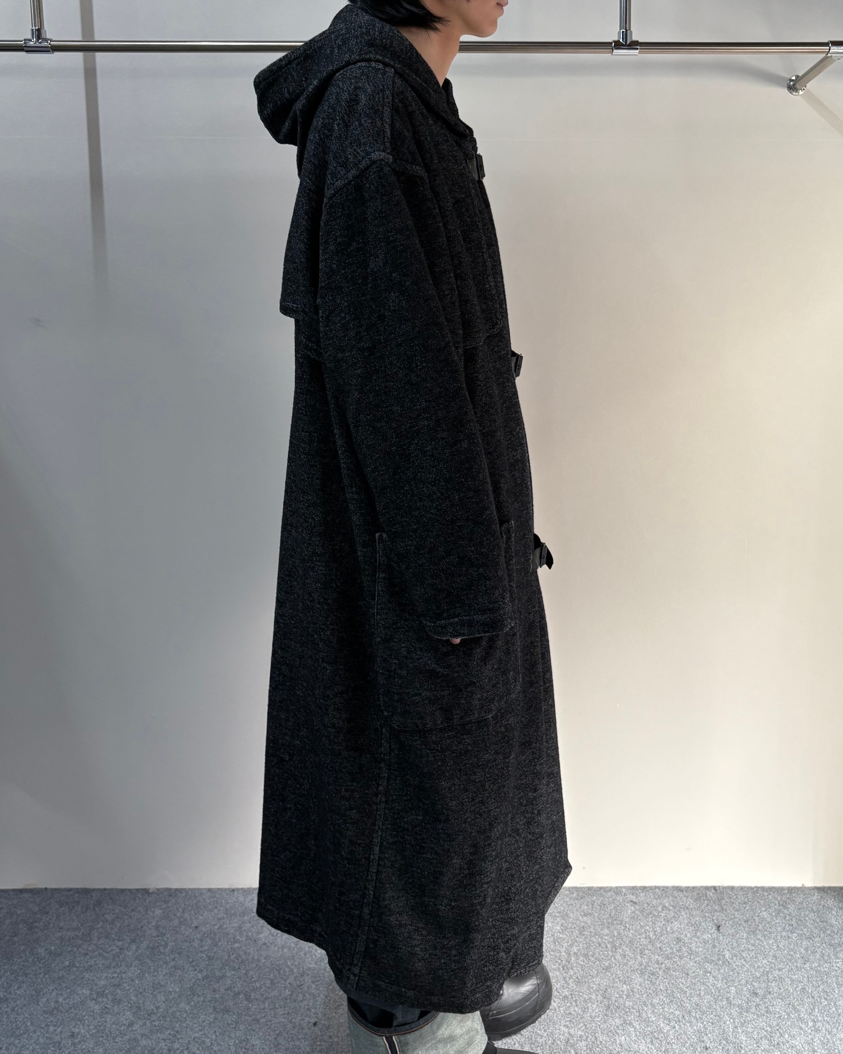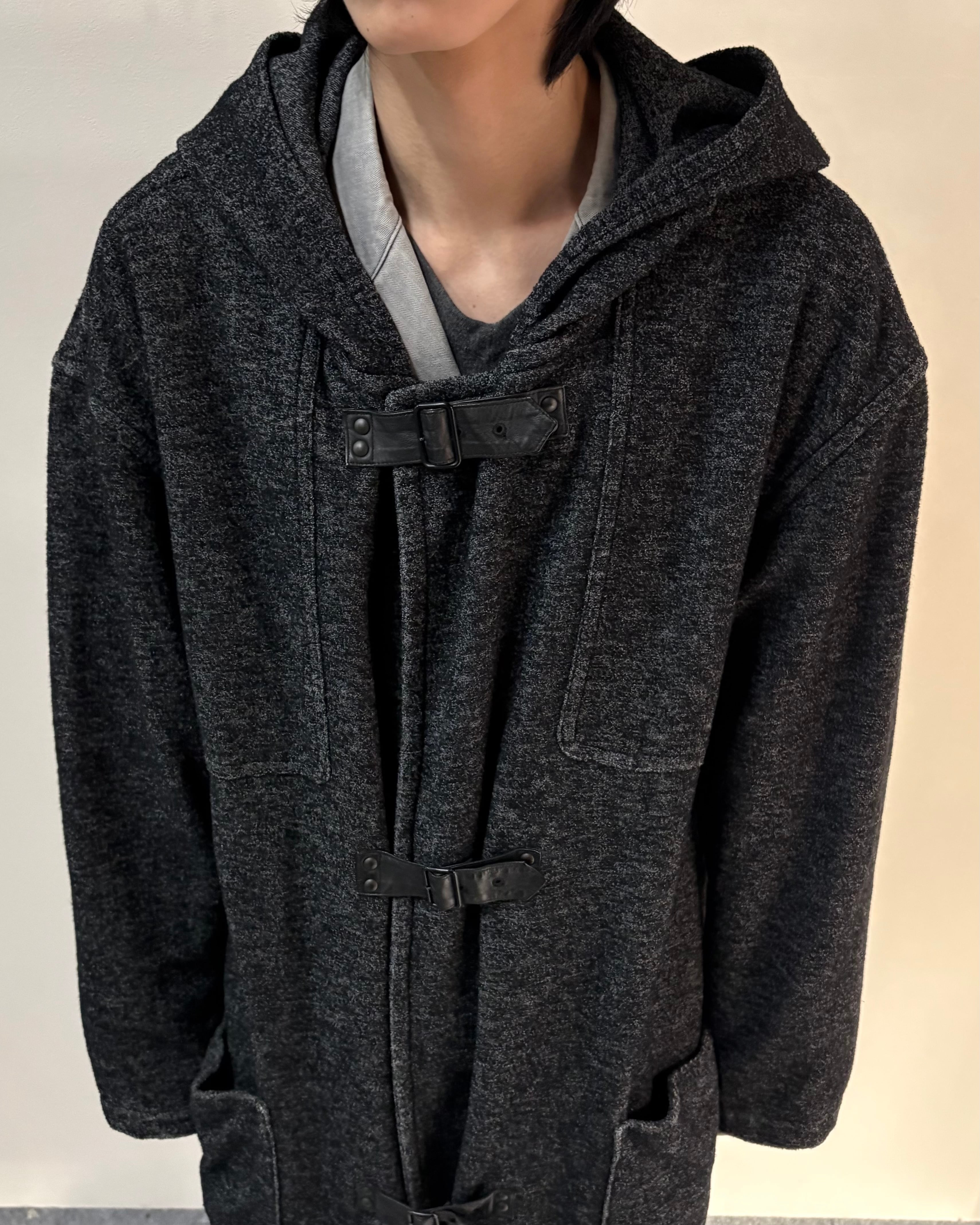 メランジ調のダークトーンファブリックを使用し、クラシックなダッフルコートを再解釈したゴルチエらしい一着。
