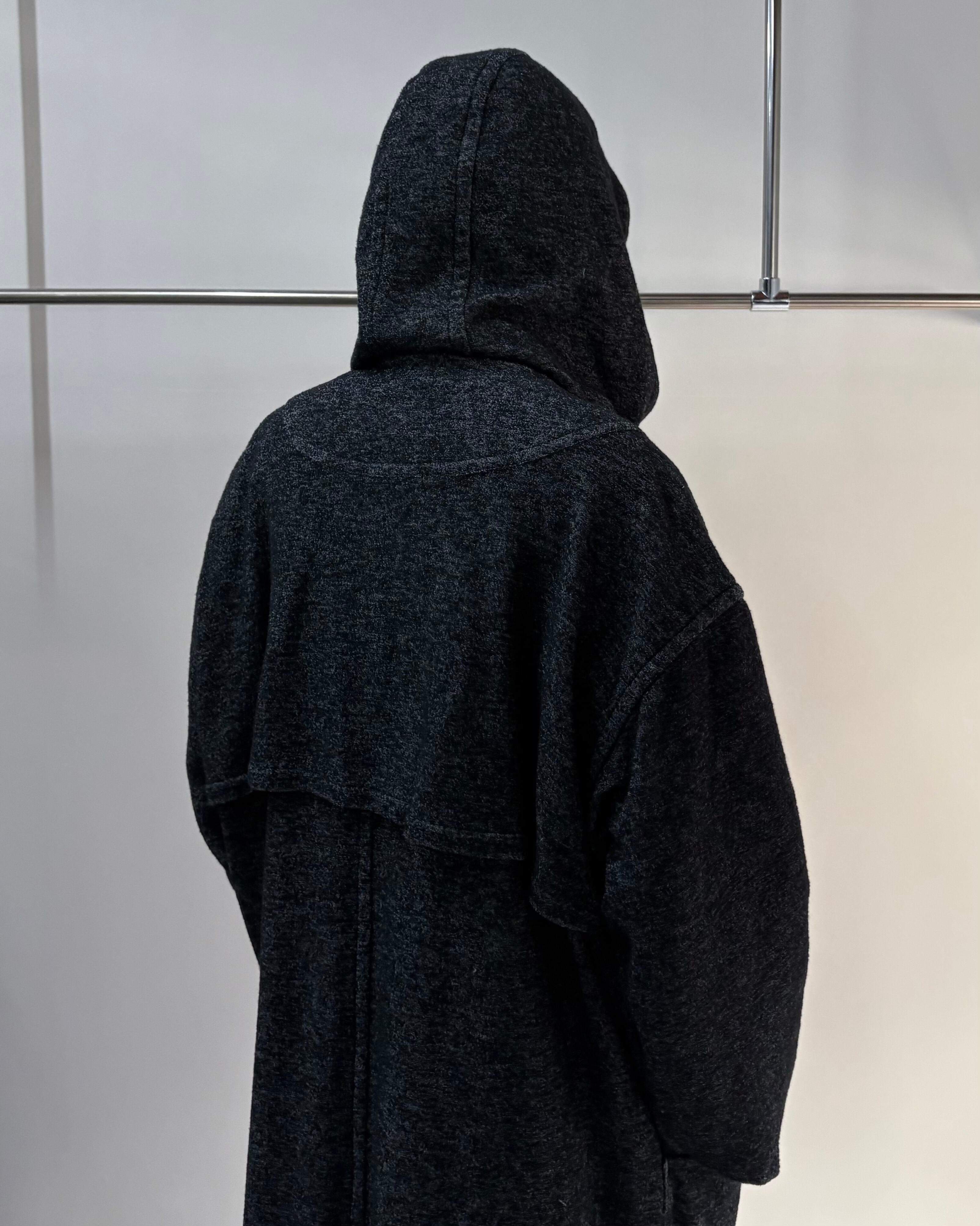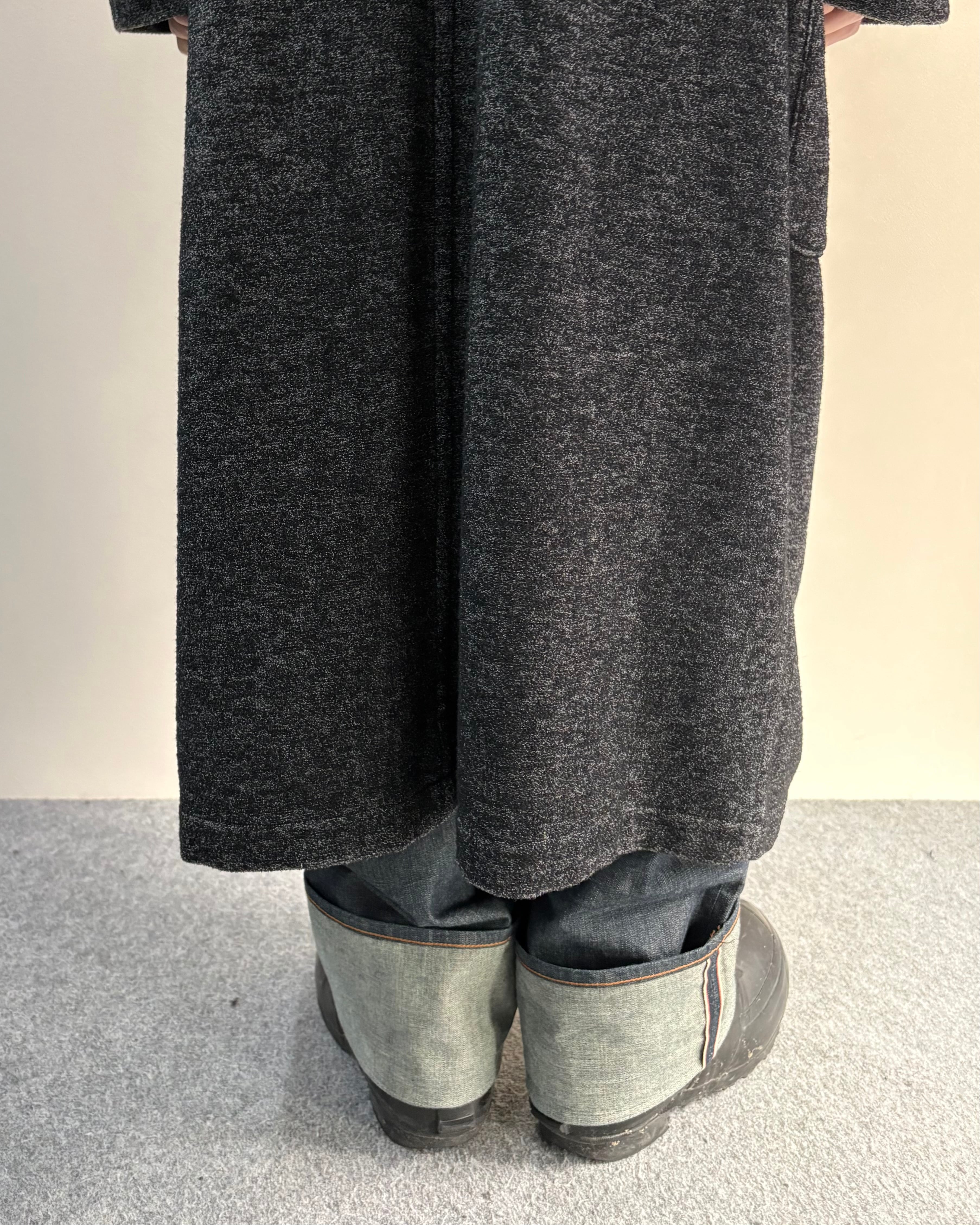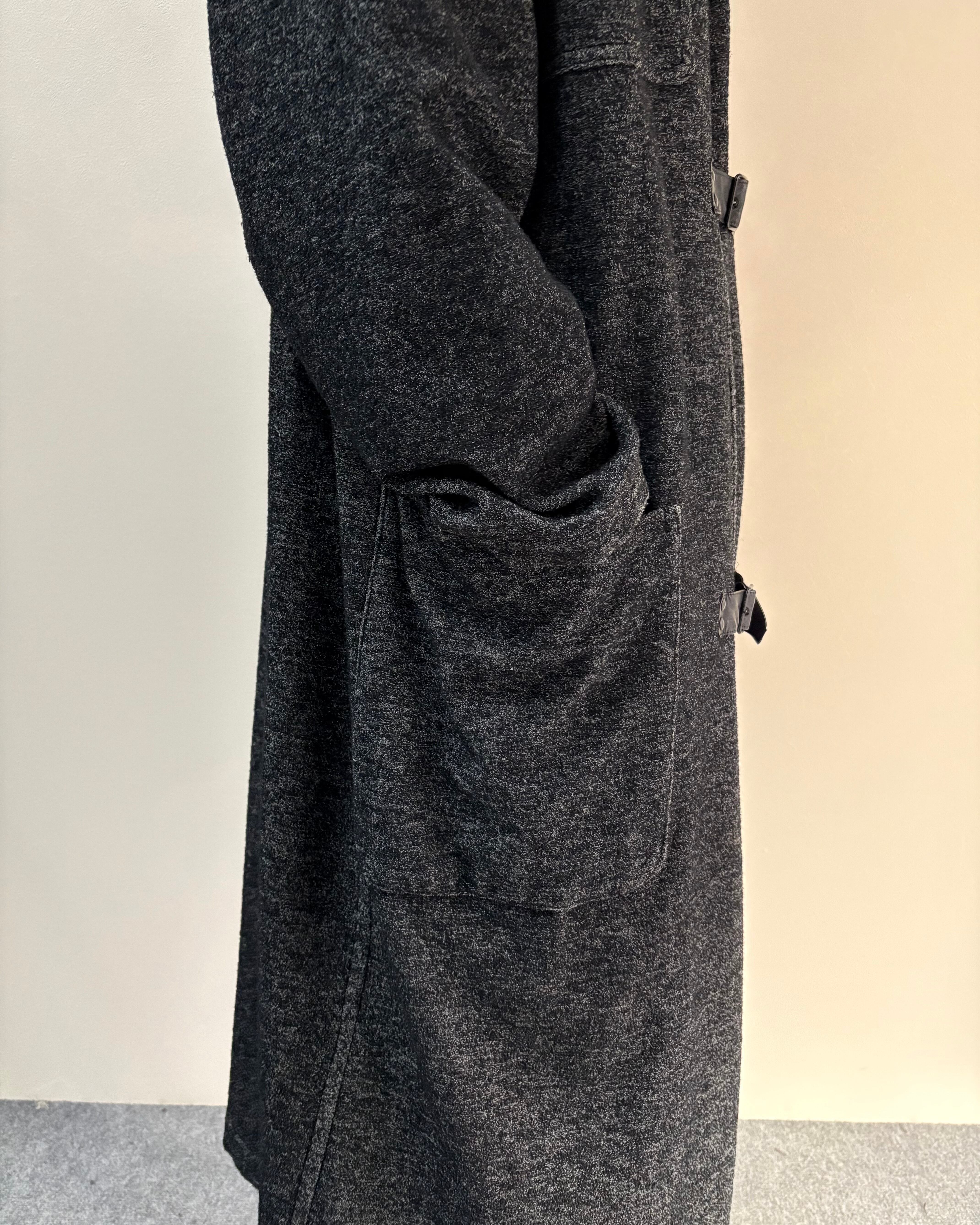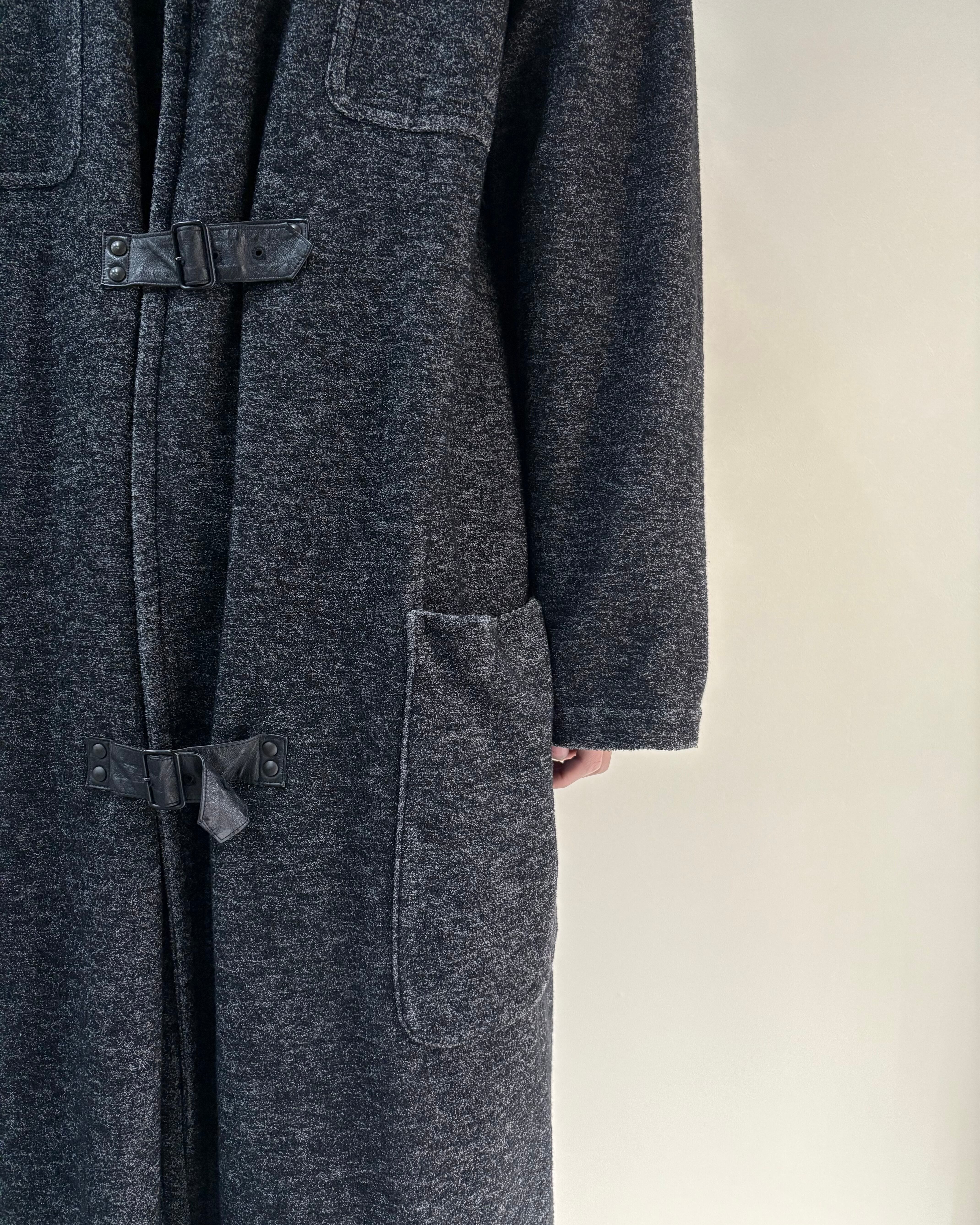メランジ調のダークトーンファブリックを使用し、クラシックなダッフルコートを再解釈したゴルチエらしい一着。