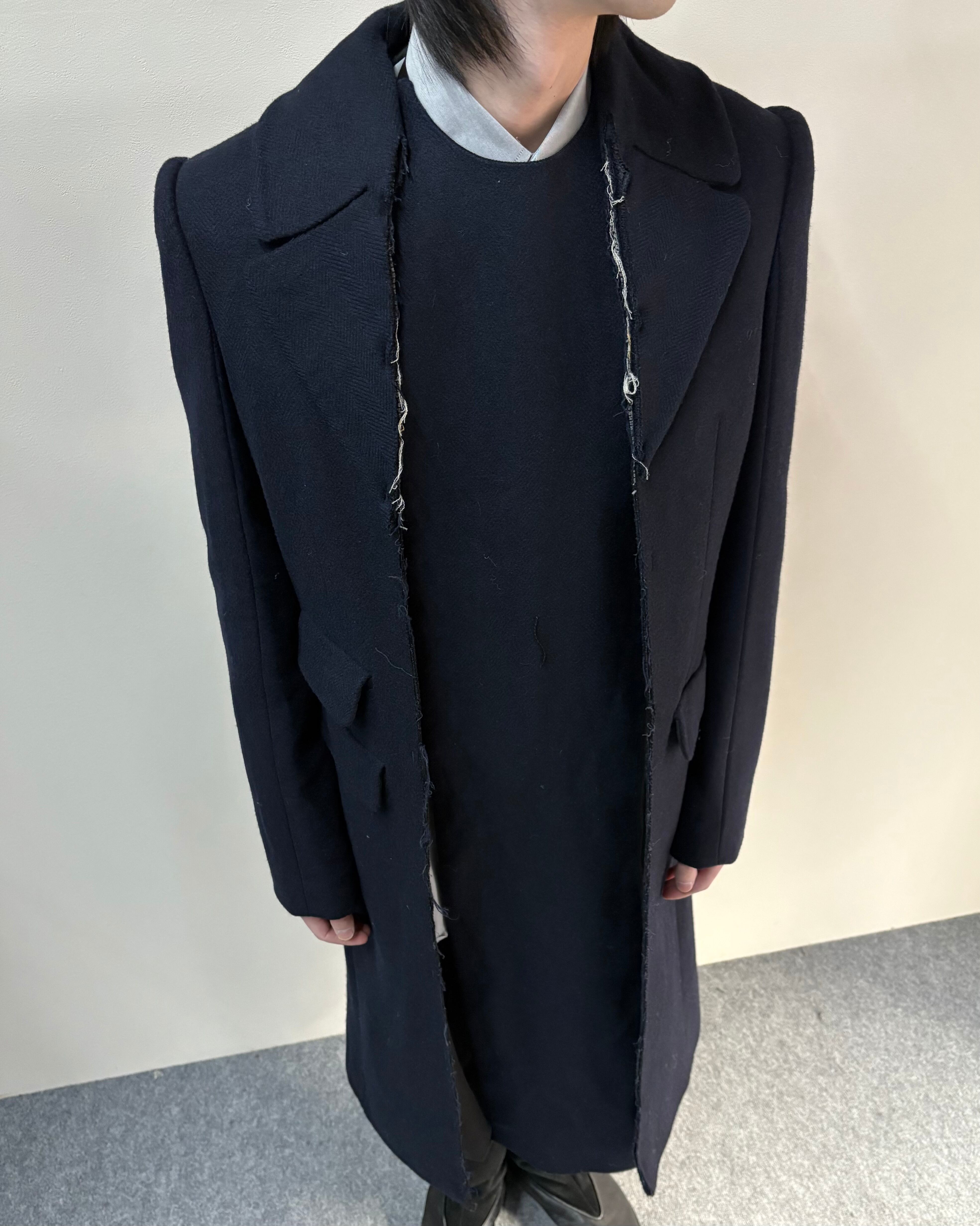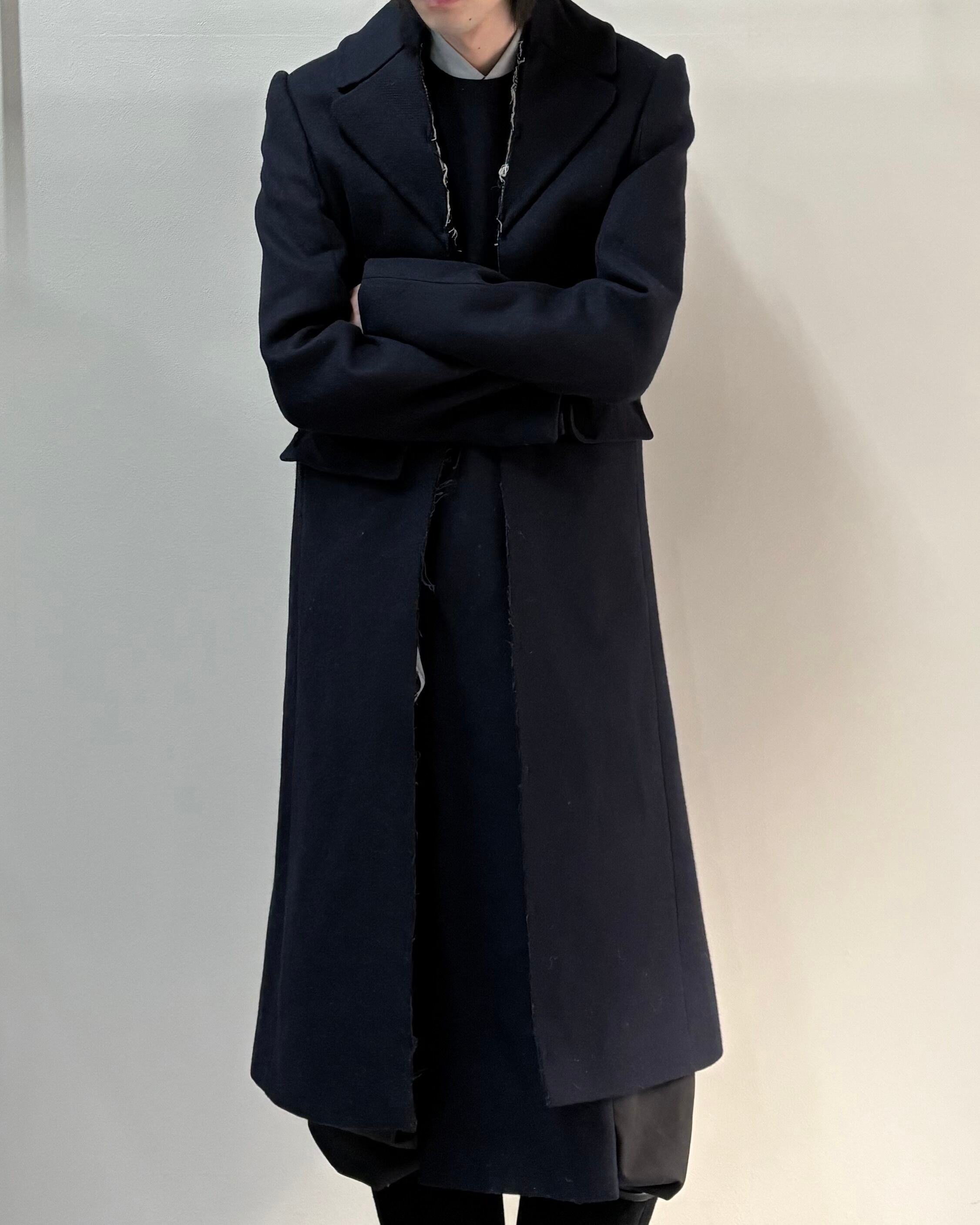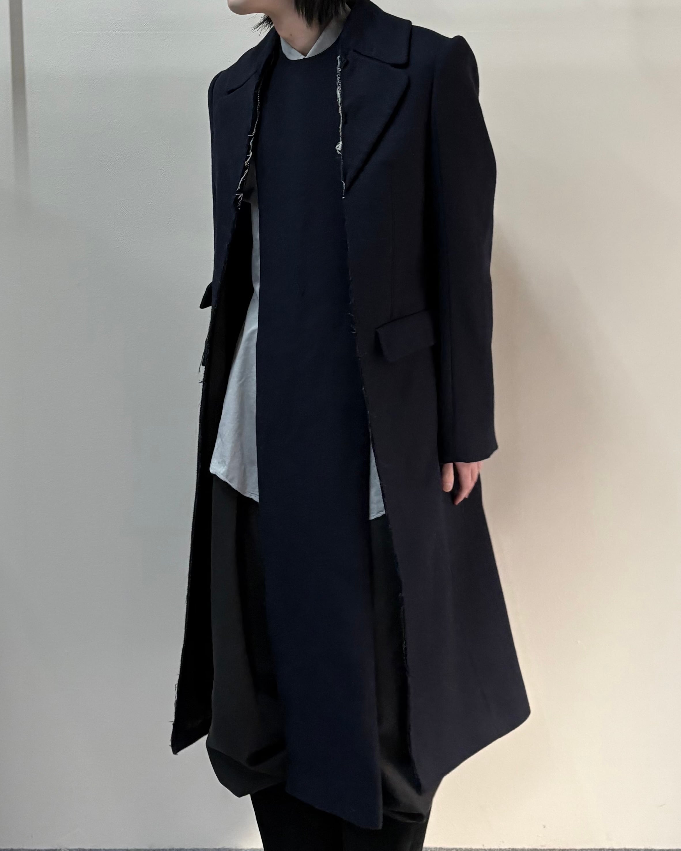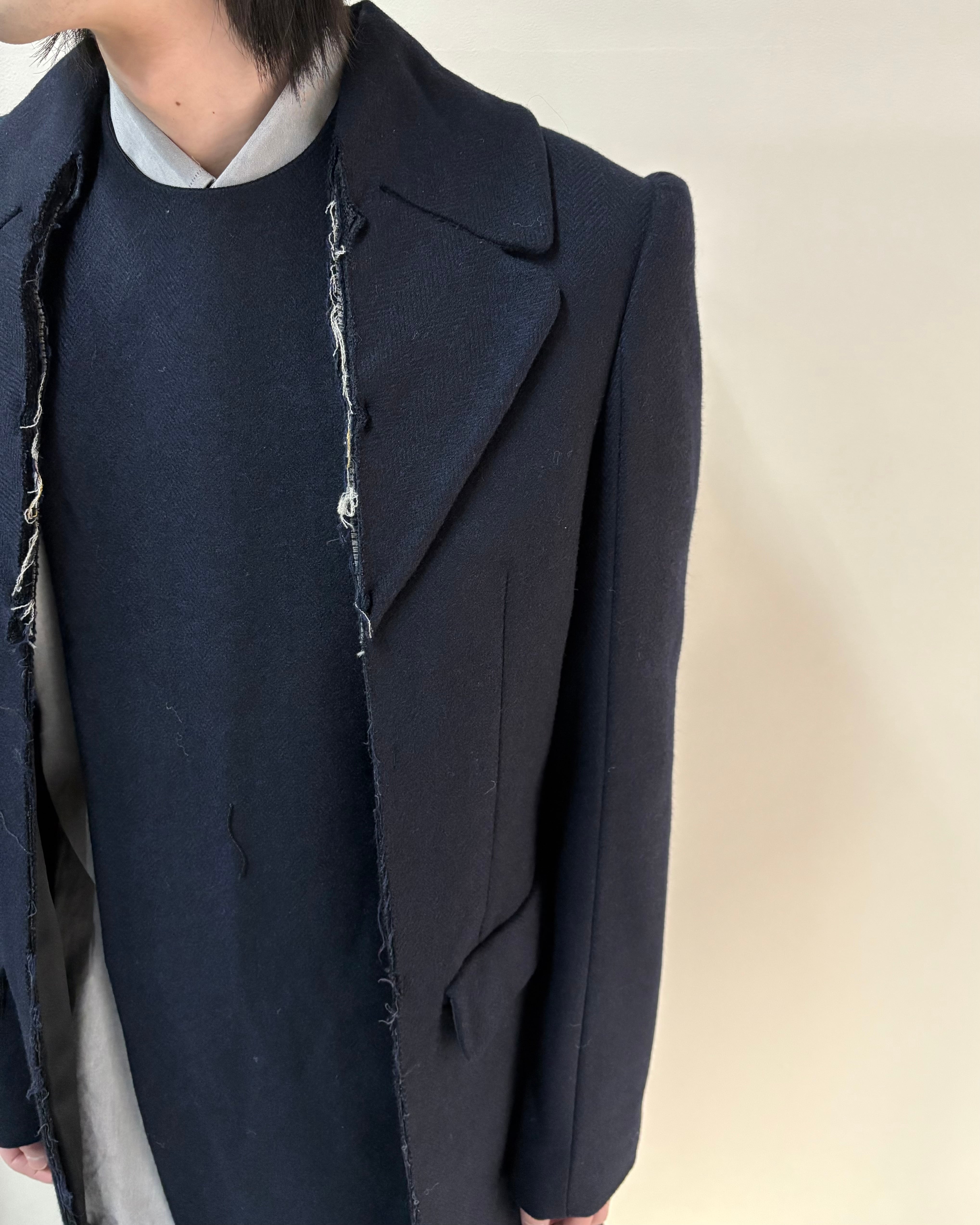 フロントからラペル、裾にかけて施されたカットオフ仕様は、縫製の痕跡や生地の断面をあえて露出させ、服が「作られたものである」という事実を可視化している。