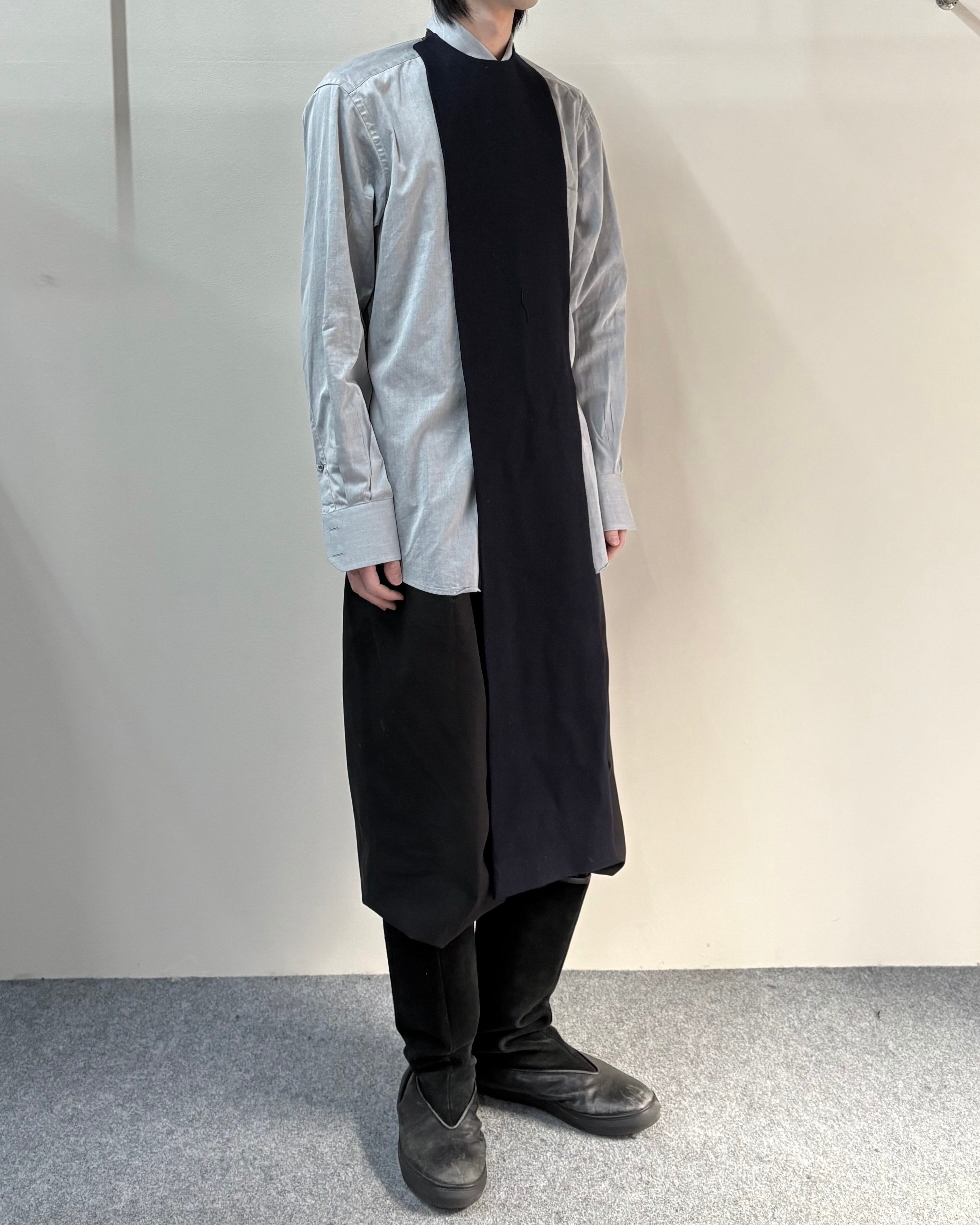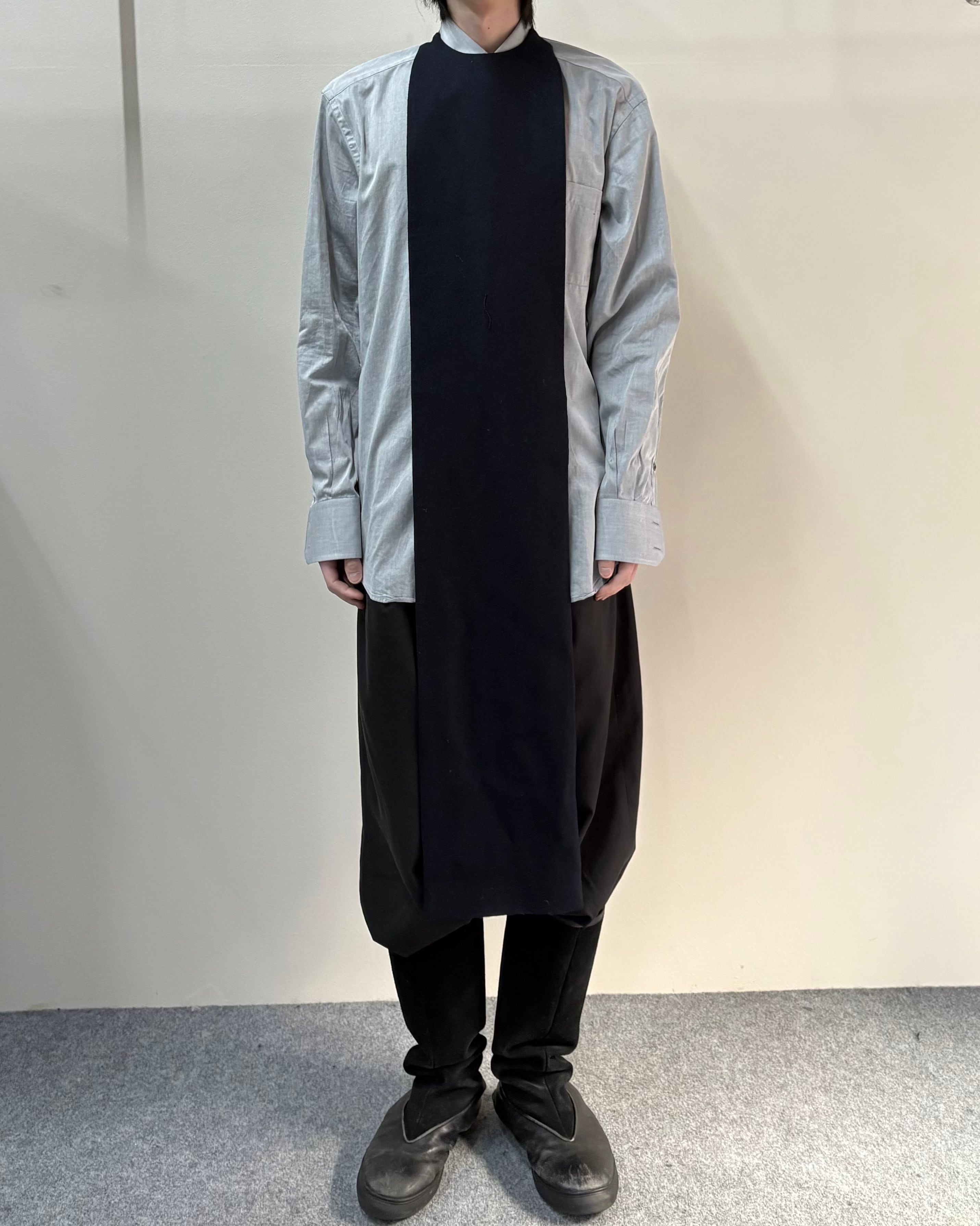 使用されているウール素材は、上質でありながら過度な艶を抑えたヘリンボーン織。クラシックな紳士服の文脈を強く感じさせる生地選定でありながら、その伝統的素材を解体的な手法で再構築することで、既存の価値観を静かに転倒させている。