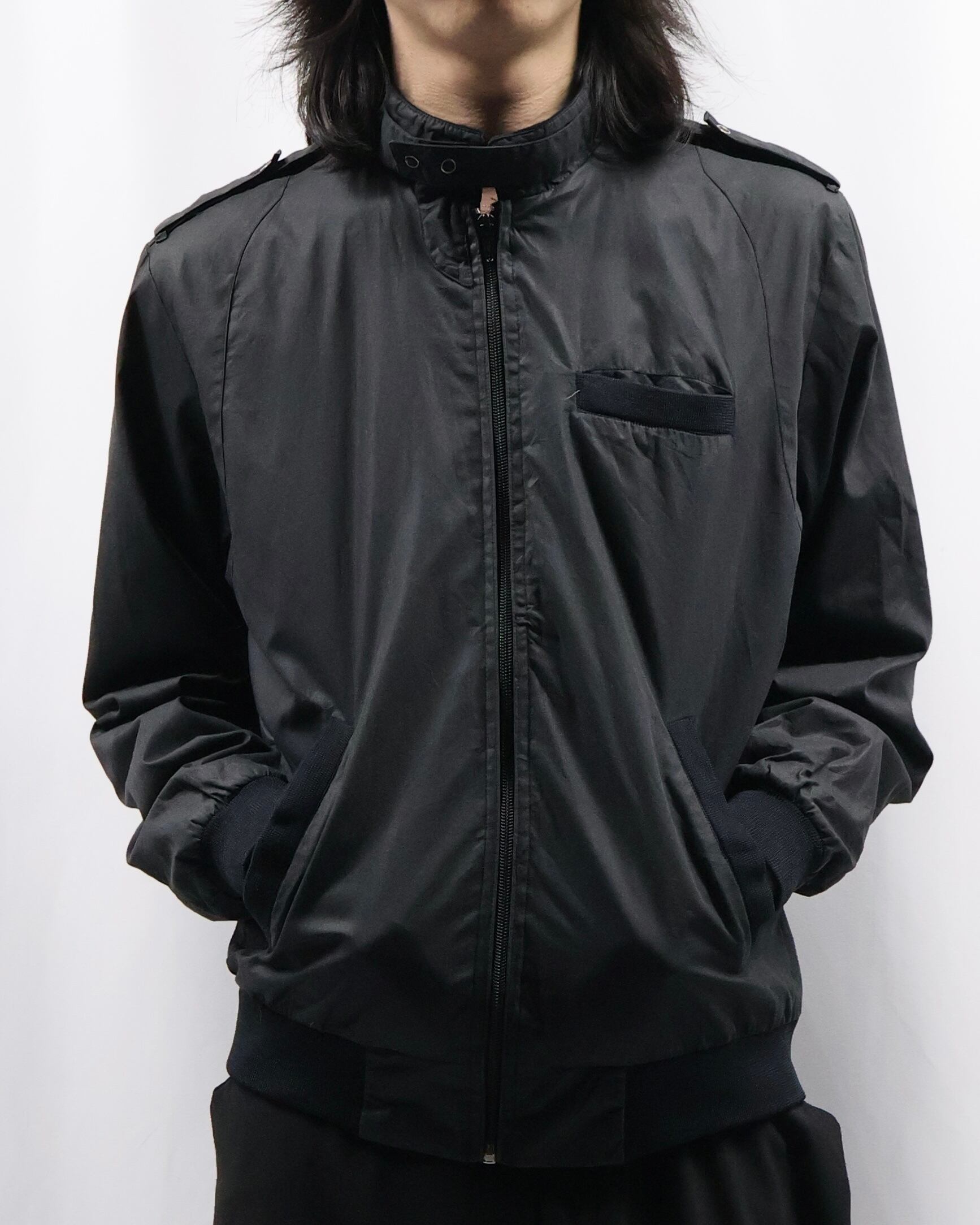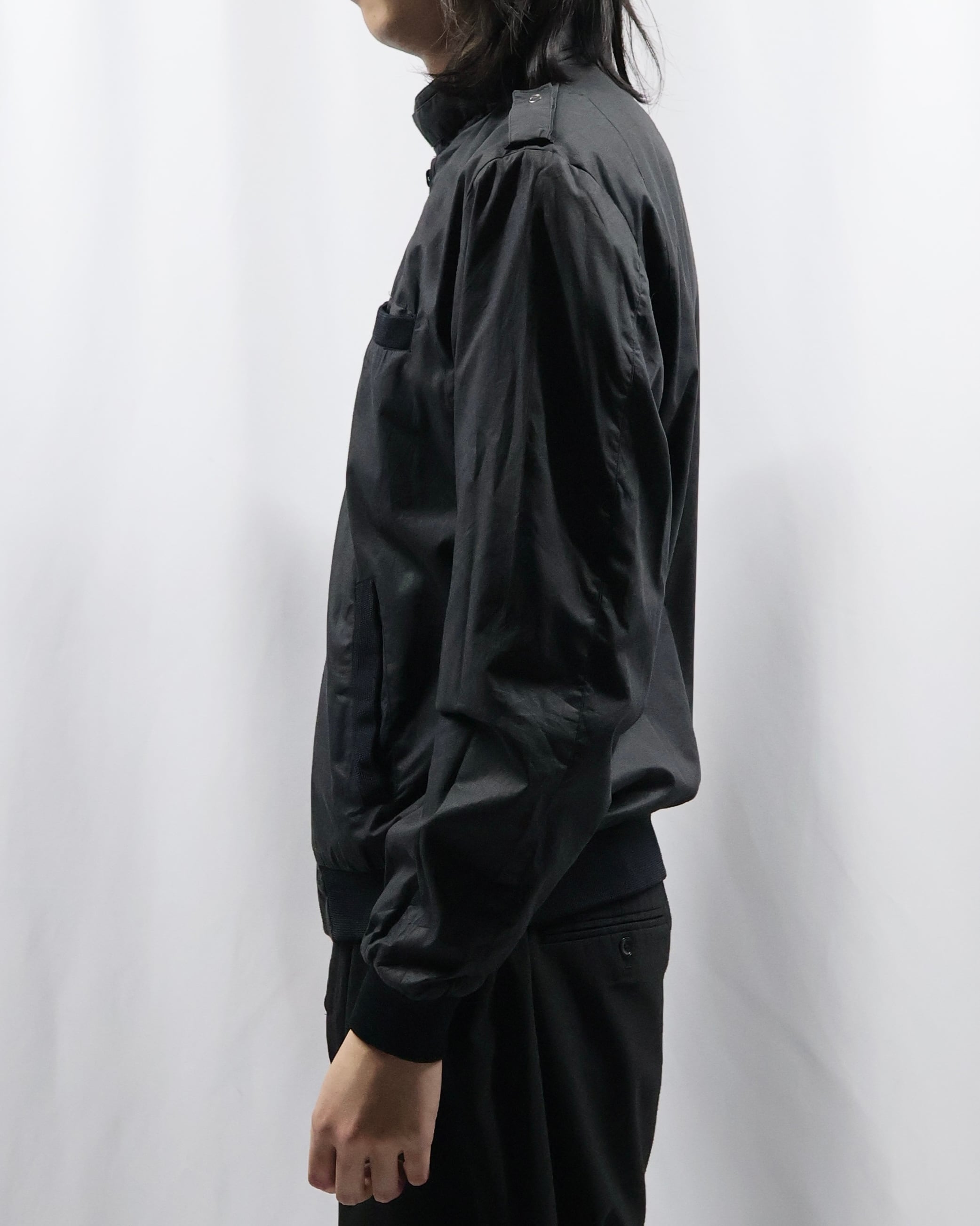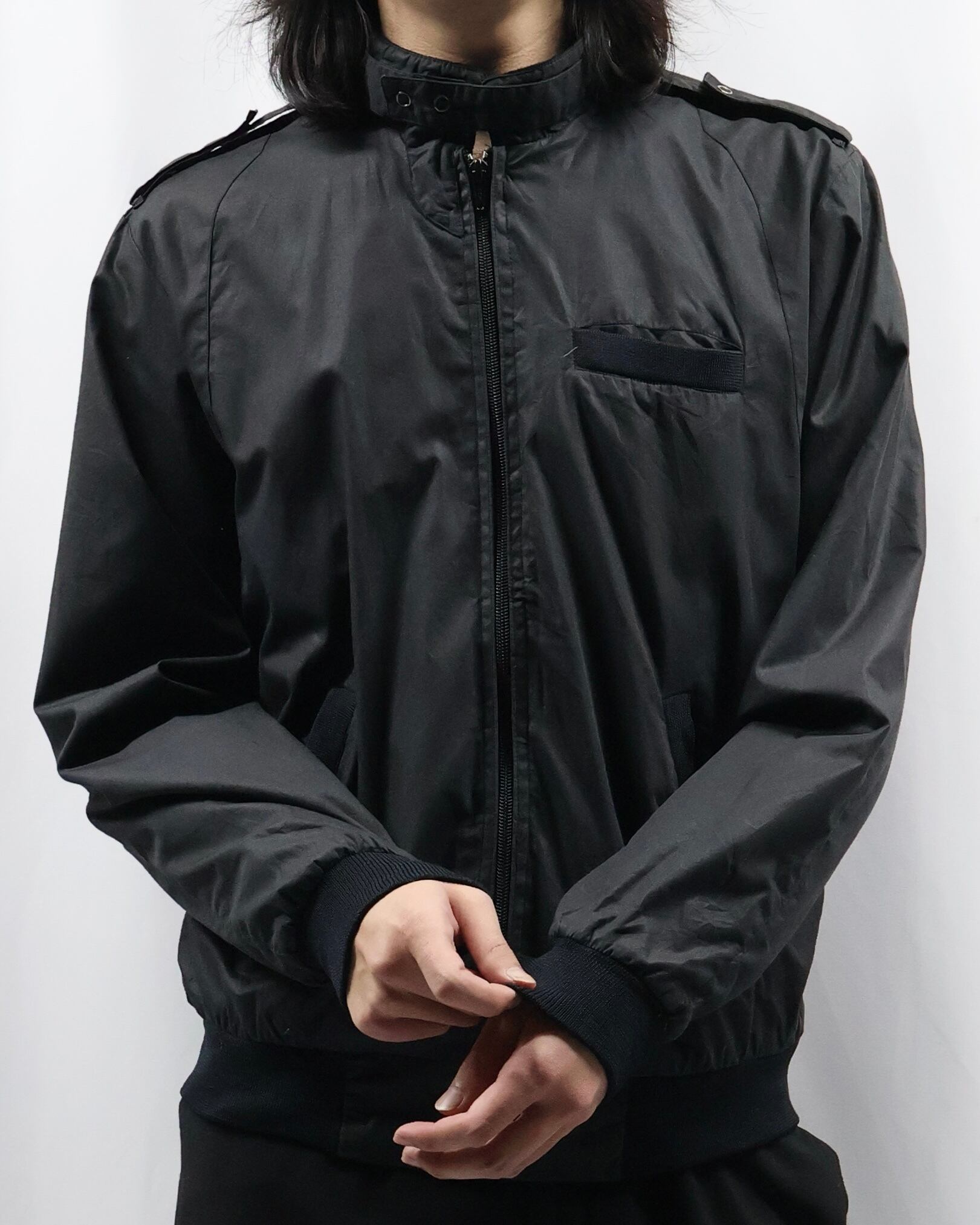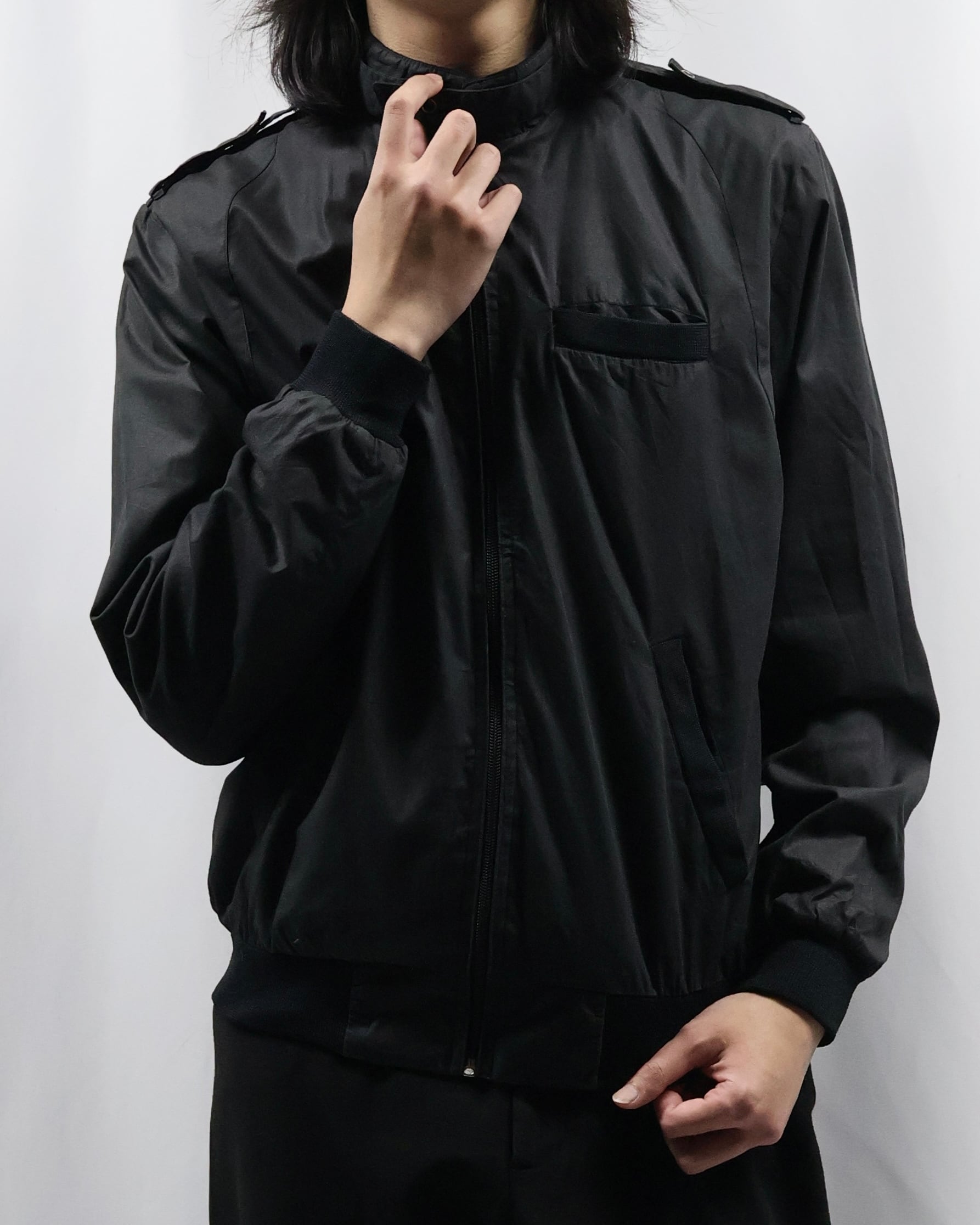 黒の使いやすいコットンポリのライトアウター。面が良いとりあえず一枚羽織ったりインナーに差し込みたくなる一枚。ハイネックでエポレットがついているところがgoodでインナーとして使った時に少しエッジの効いたファッションをすることができる点が良いです。