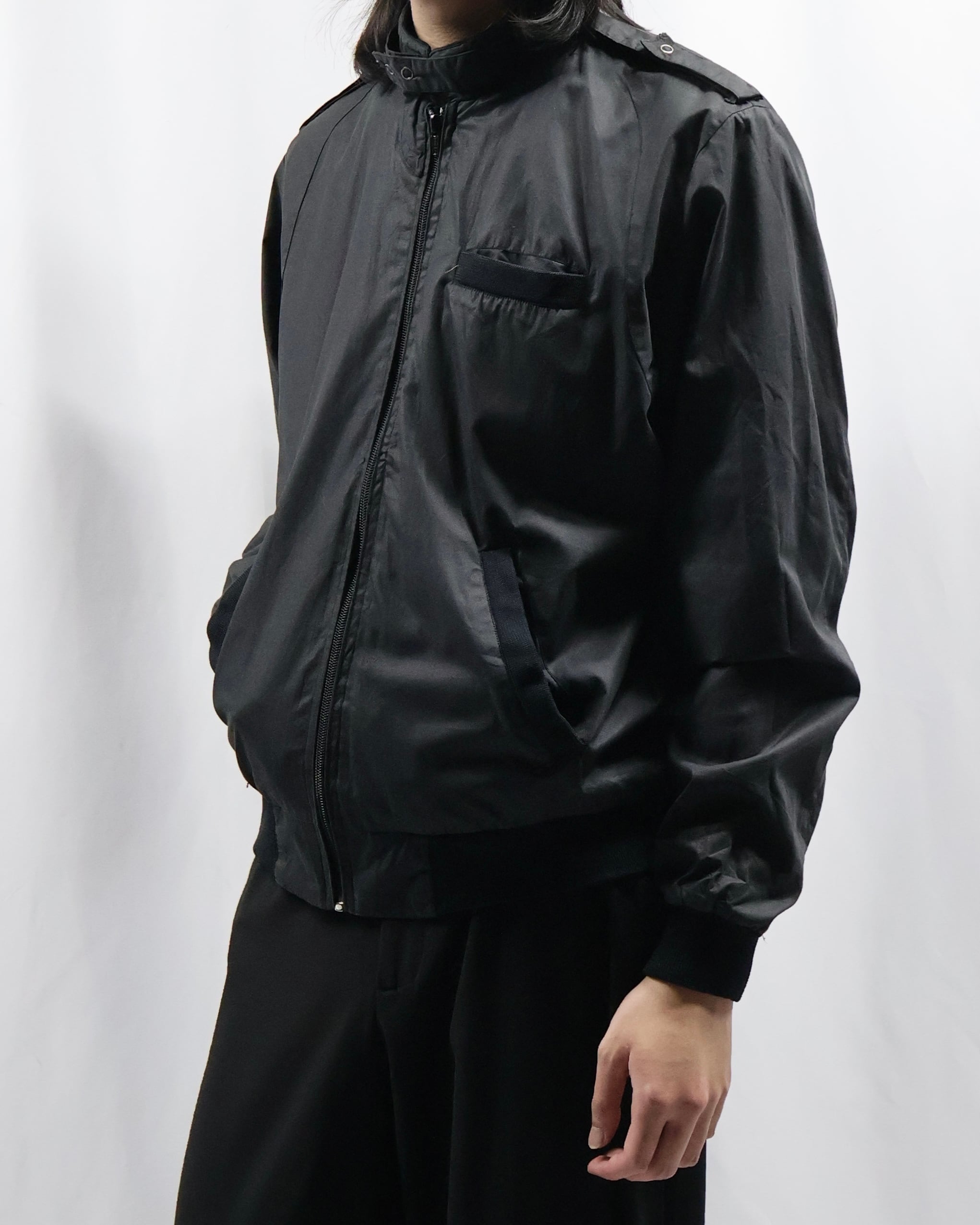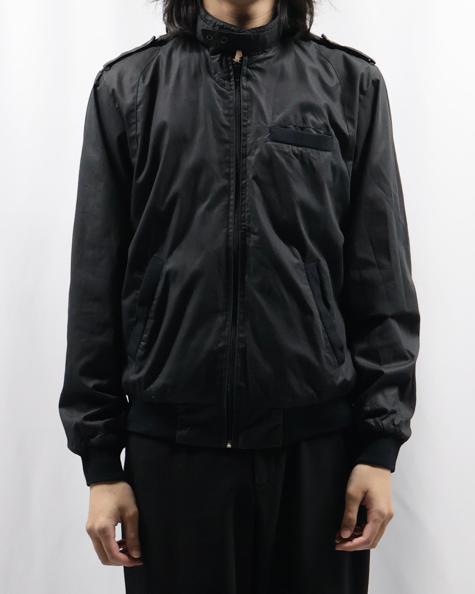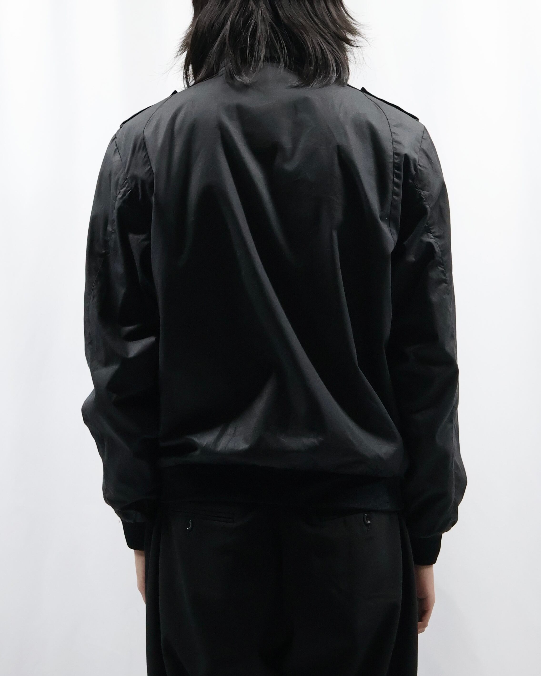 黒の使いやすいコットンポリのライトアウター。面が良いとりあえず一枚羽織ったりインナーに差し込みたくなる一枚。ハイネックでエポレットがついているところがgoodでインナーとして使った時に少しエッジの効いたファッションをすることができる点が良いです。