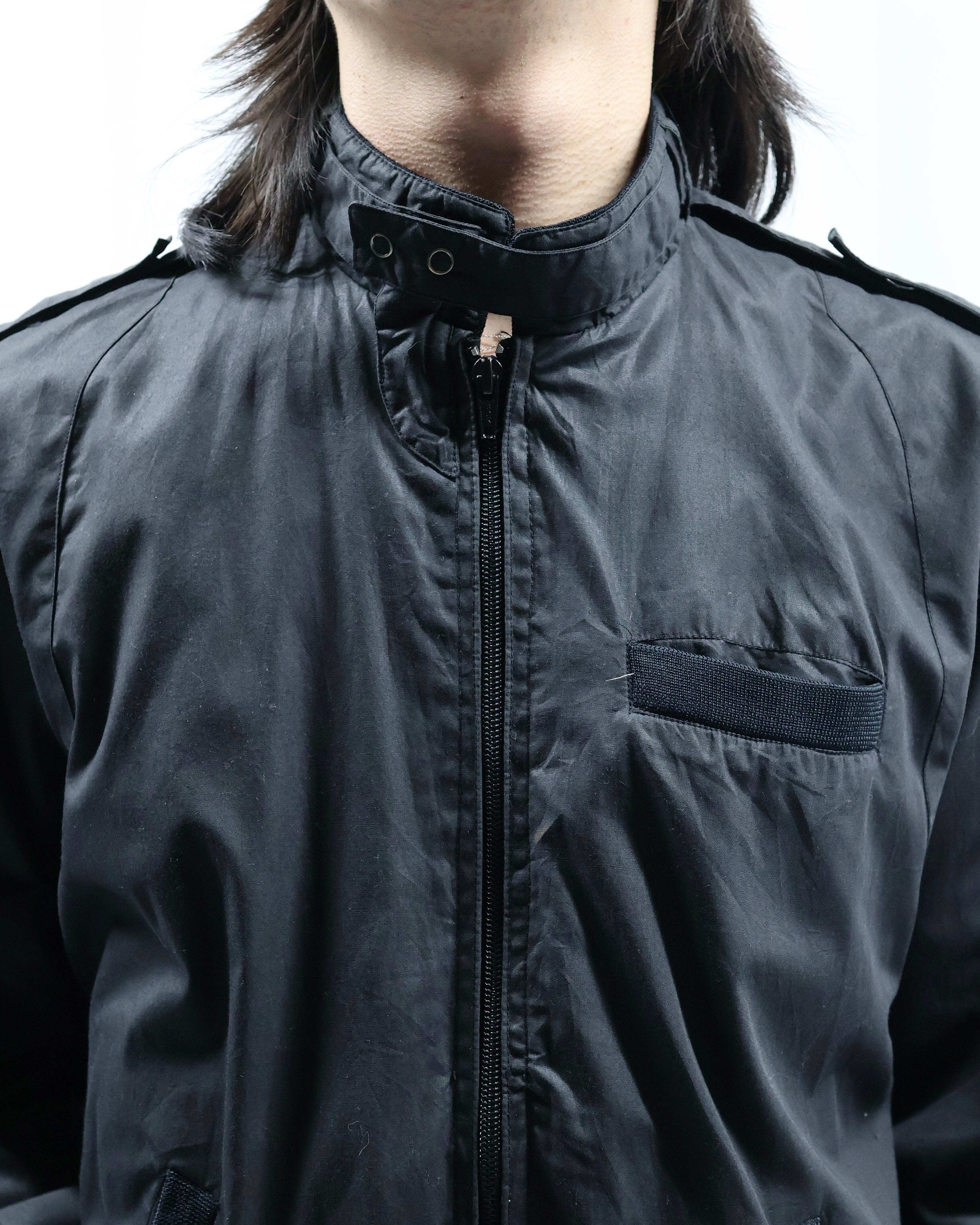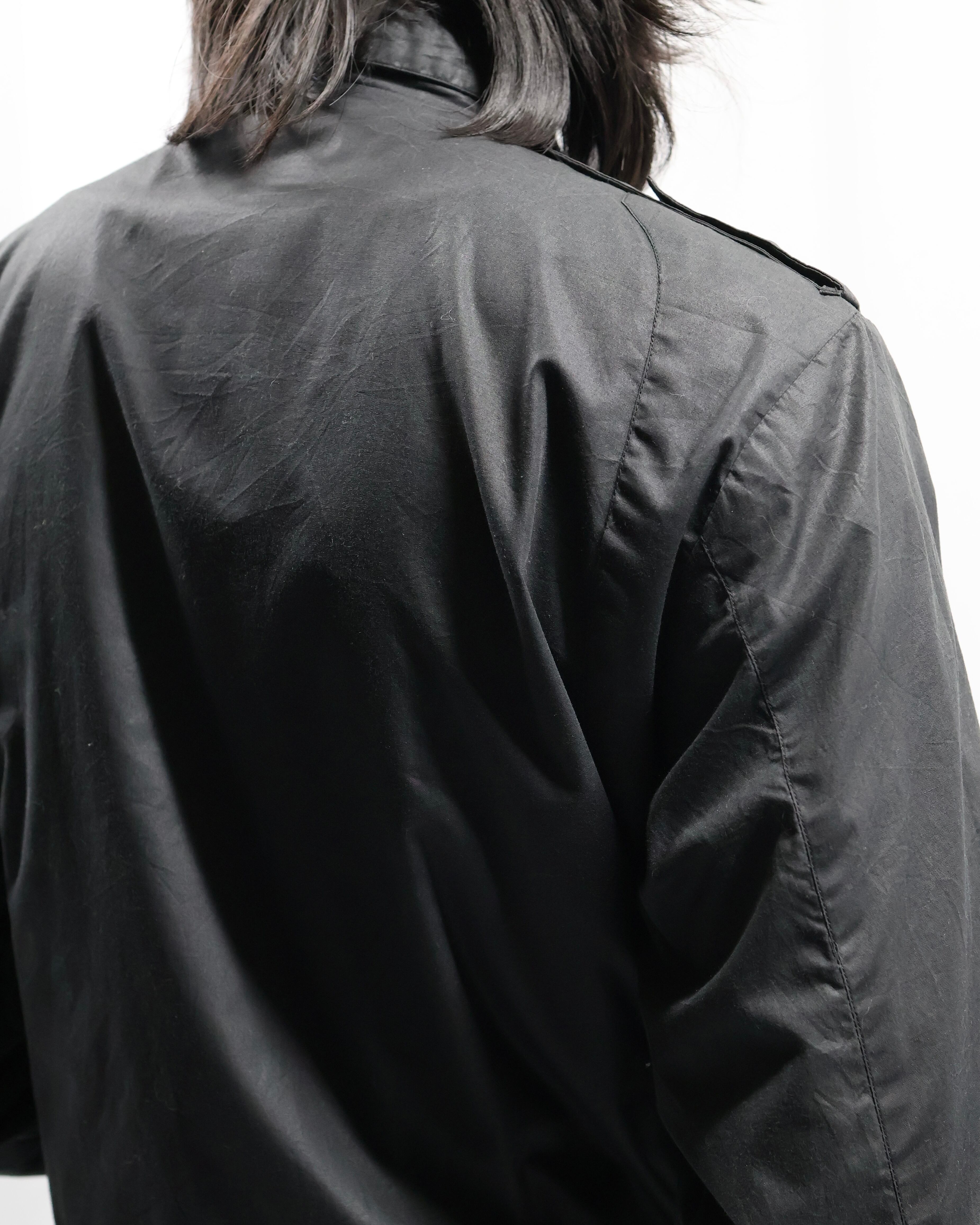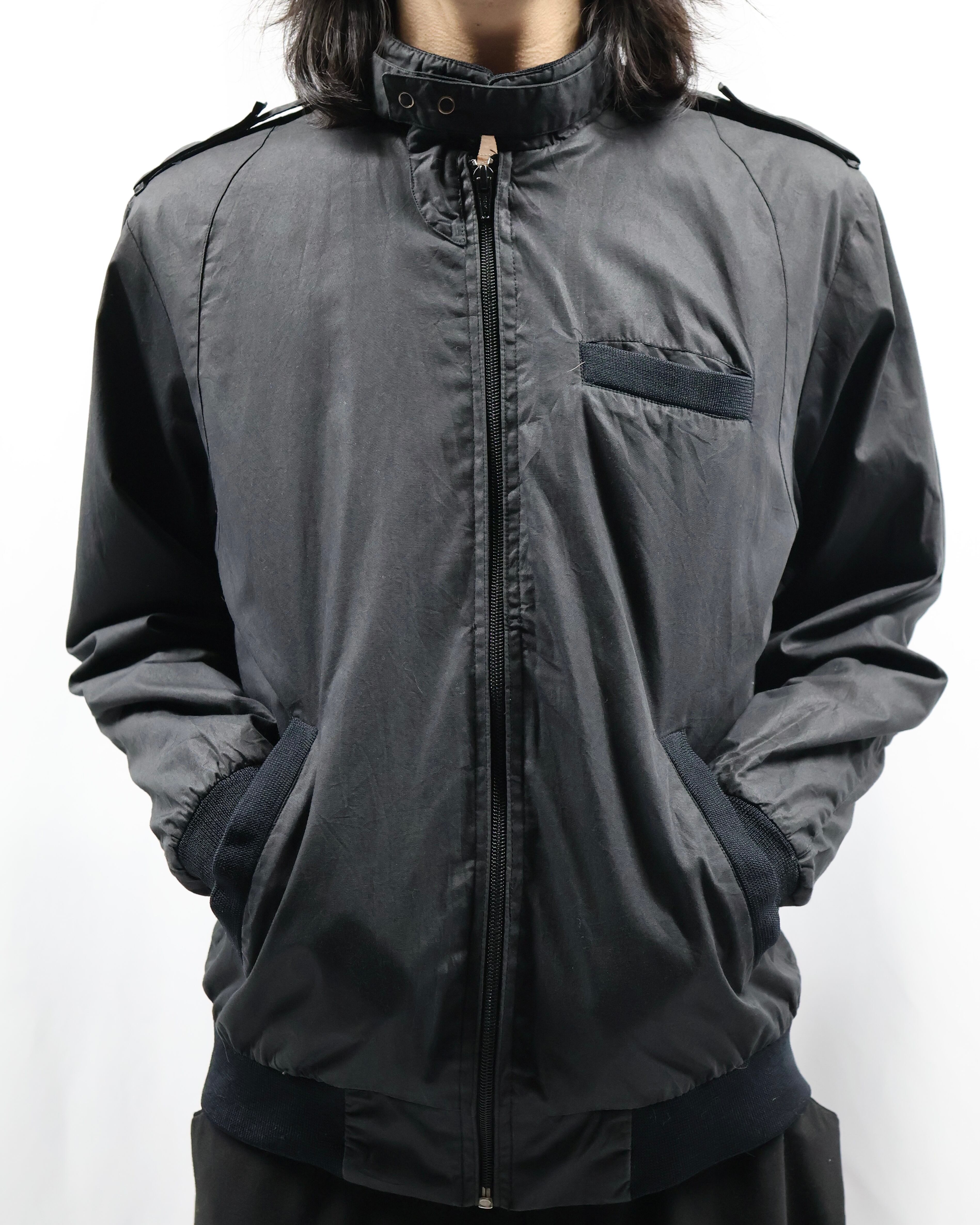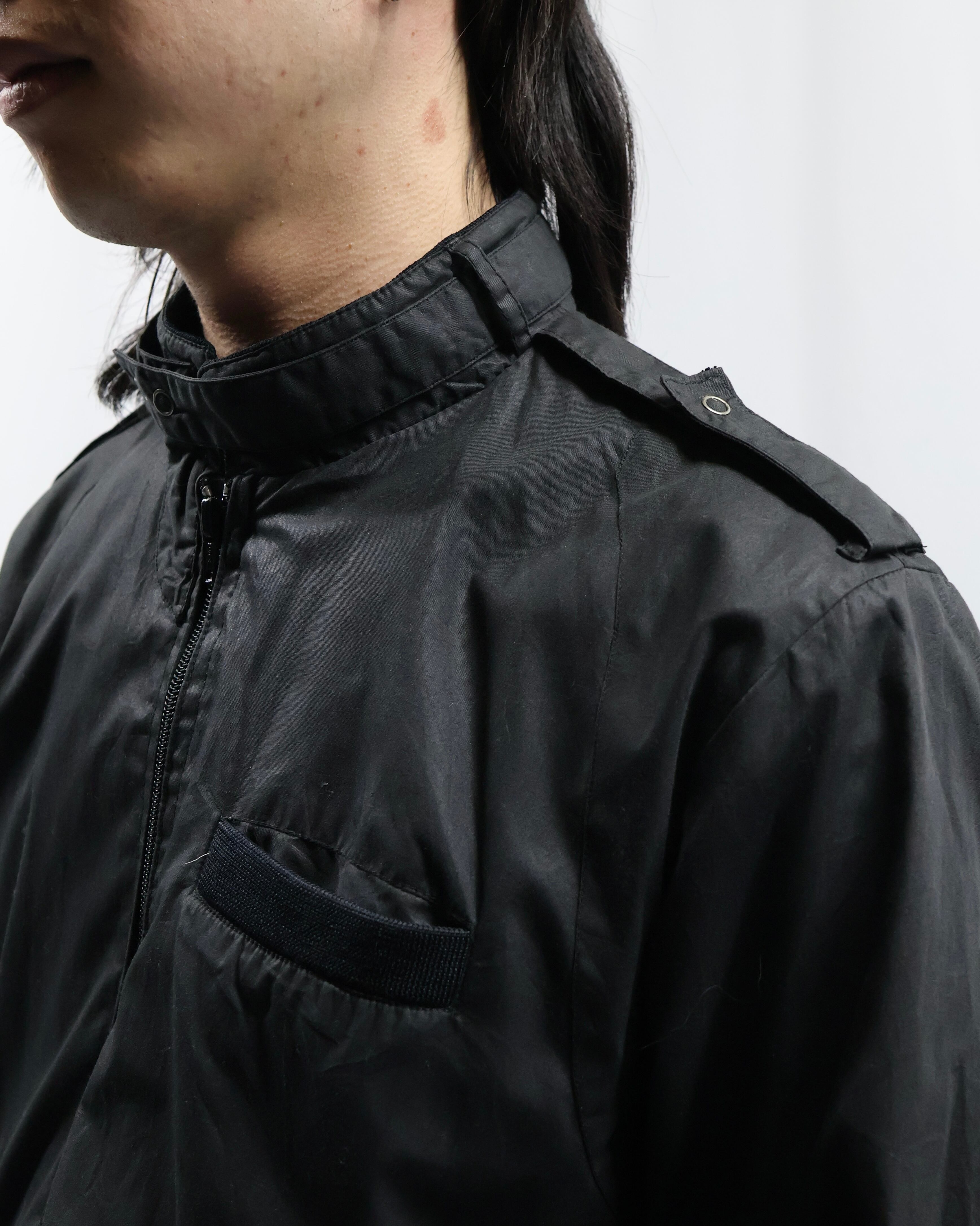 黒の使いやすいコットンポリのライトアウター。面が良いとりあえず一枚羽織ったりインナーに差し込みたくなる一枚。ハイネックでエポレットがついているところがgoodでインナーとして使った時に少しエッジの効いたファッションをすることができる点が良いです。