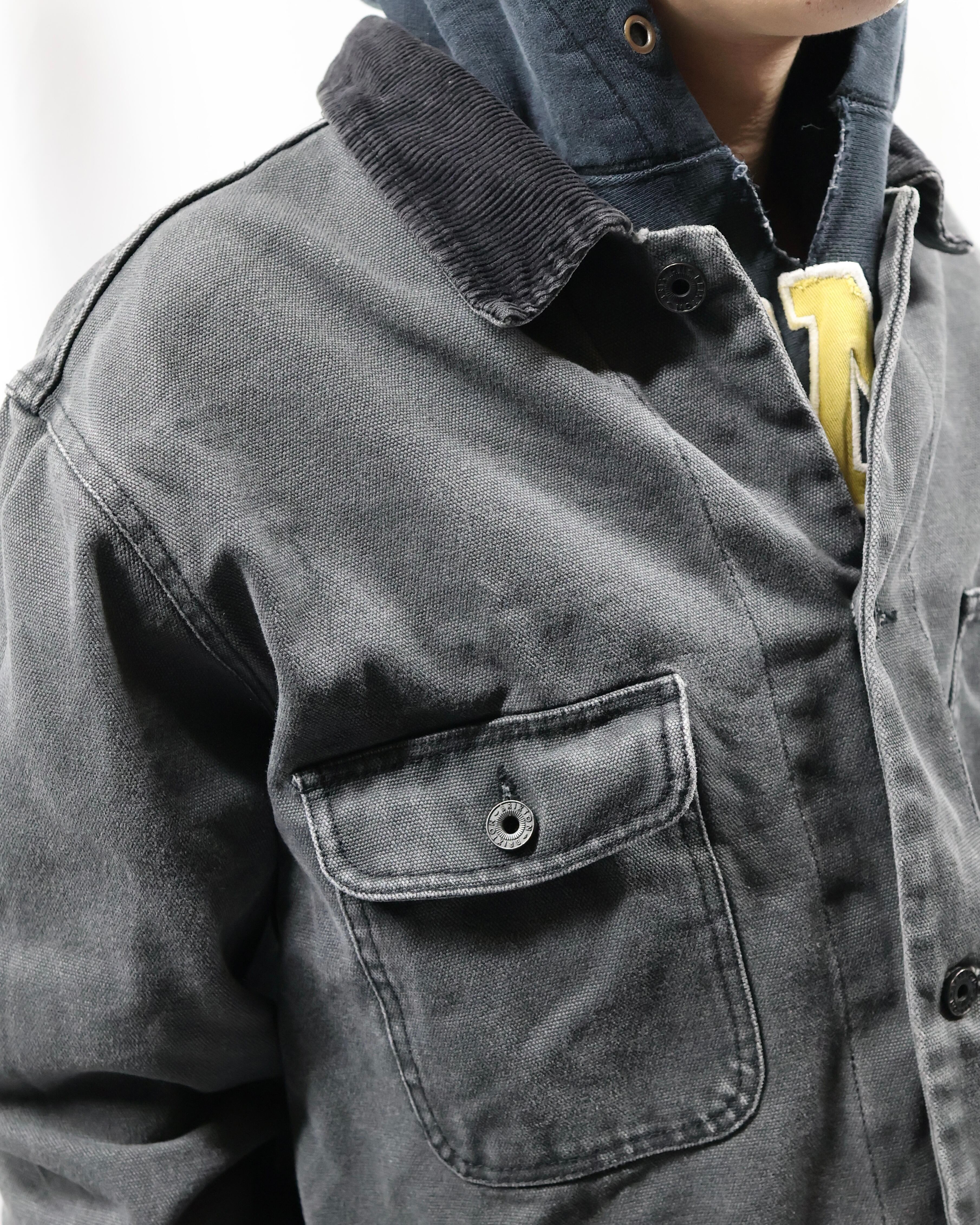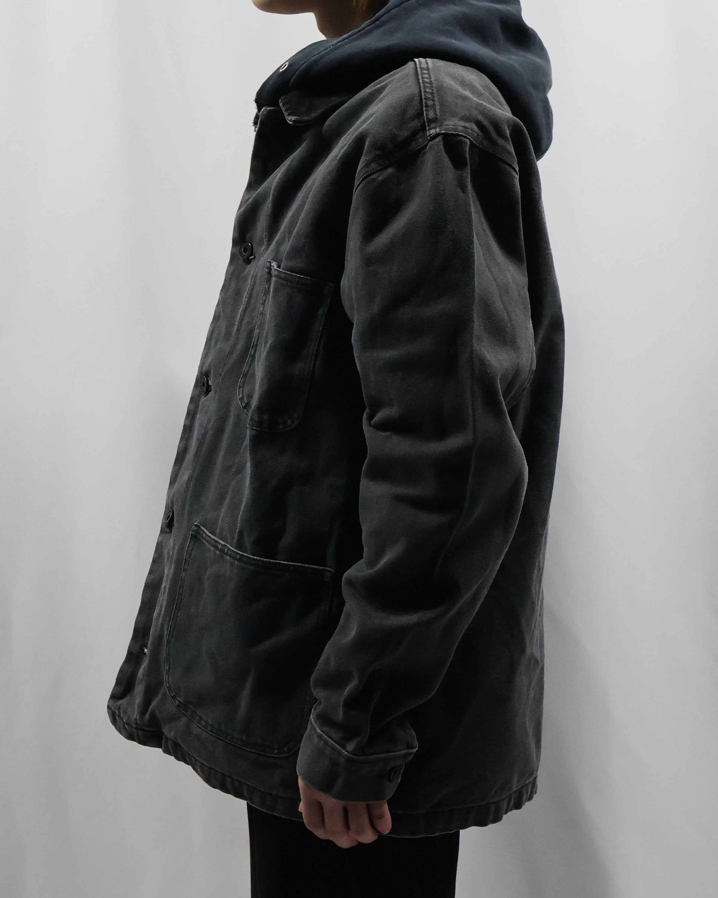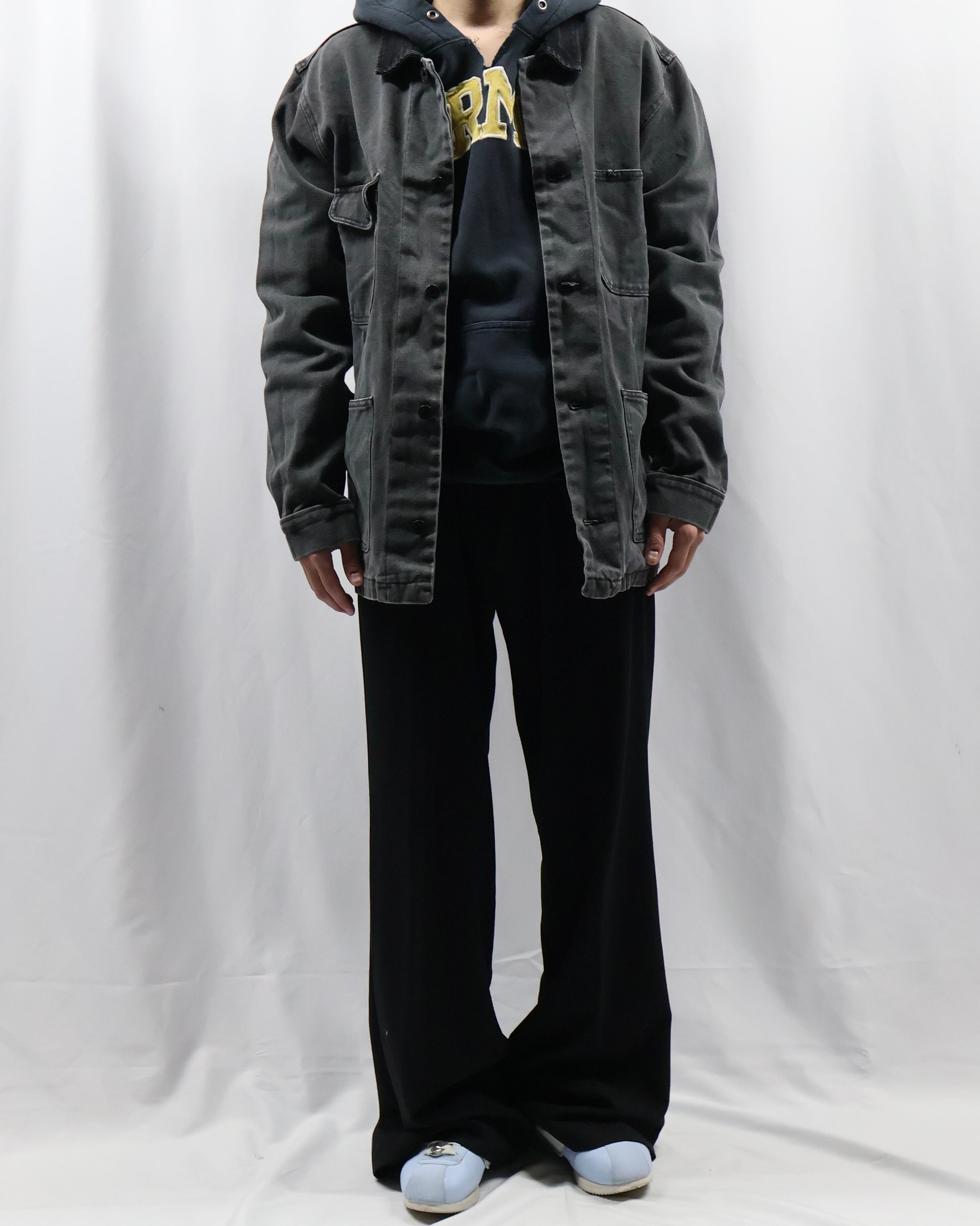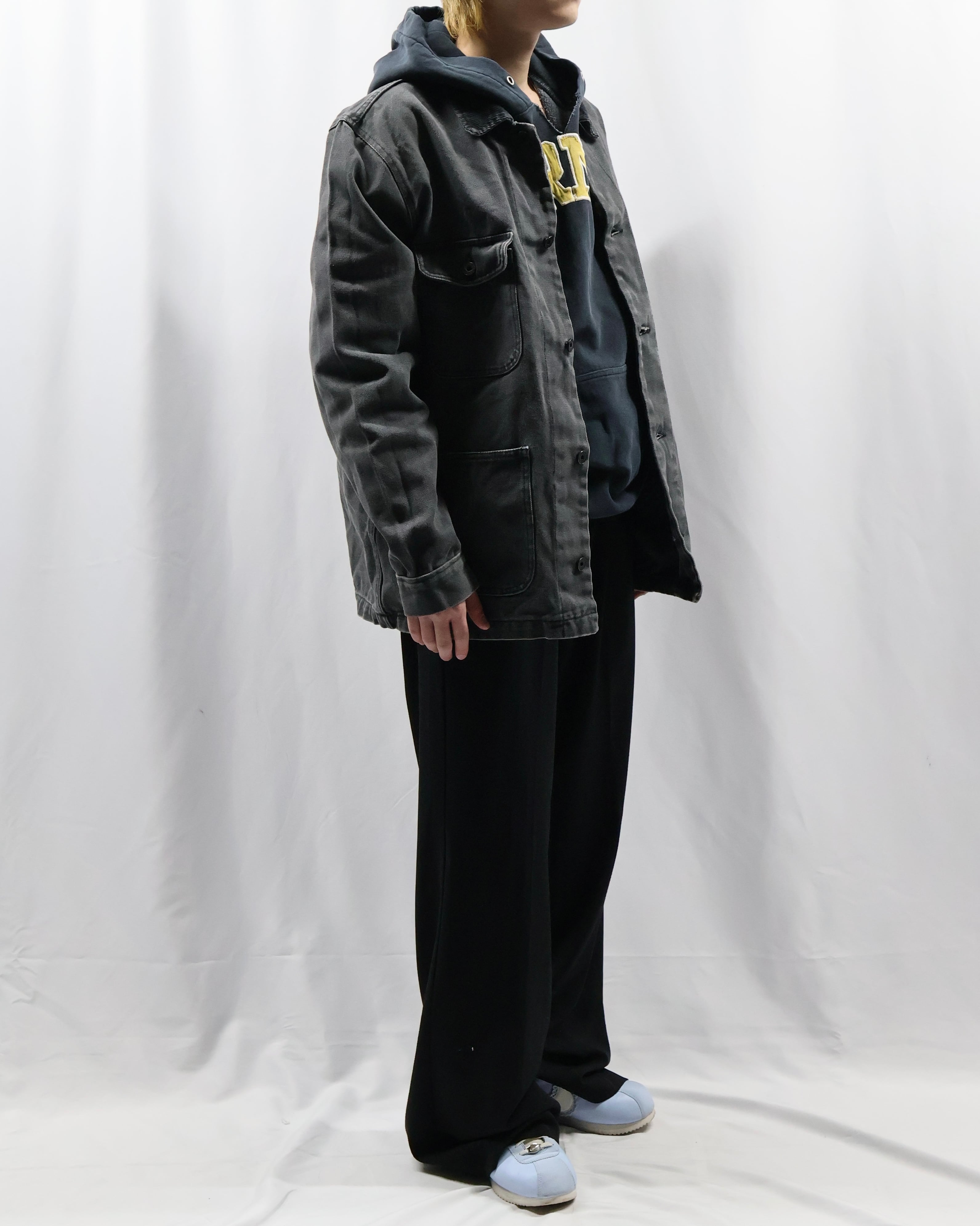 ガシッとした素材感のワークテイストなデニムジャケット。4ポケットで一つだけフラップポケットな点や、サイズ感、カバーオールみのあるデザイン、遊び心のあるディテールで可愛らしさを出したい時におすすめ。色が暗めで甘くなりすぎないのもいいポイント。いんなーとして用いてオーバーコートを羽織るのも面白いです。