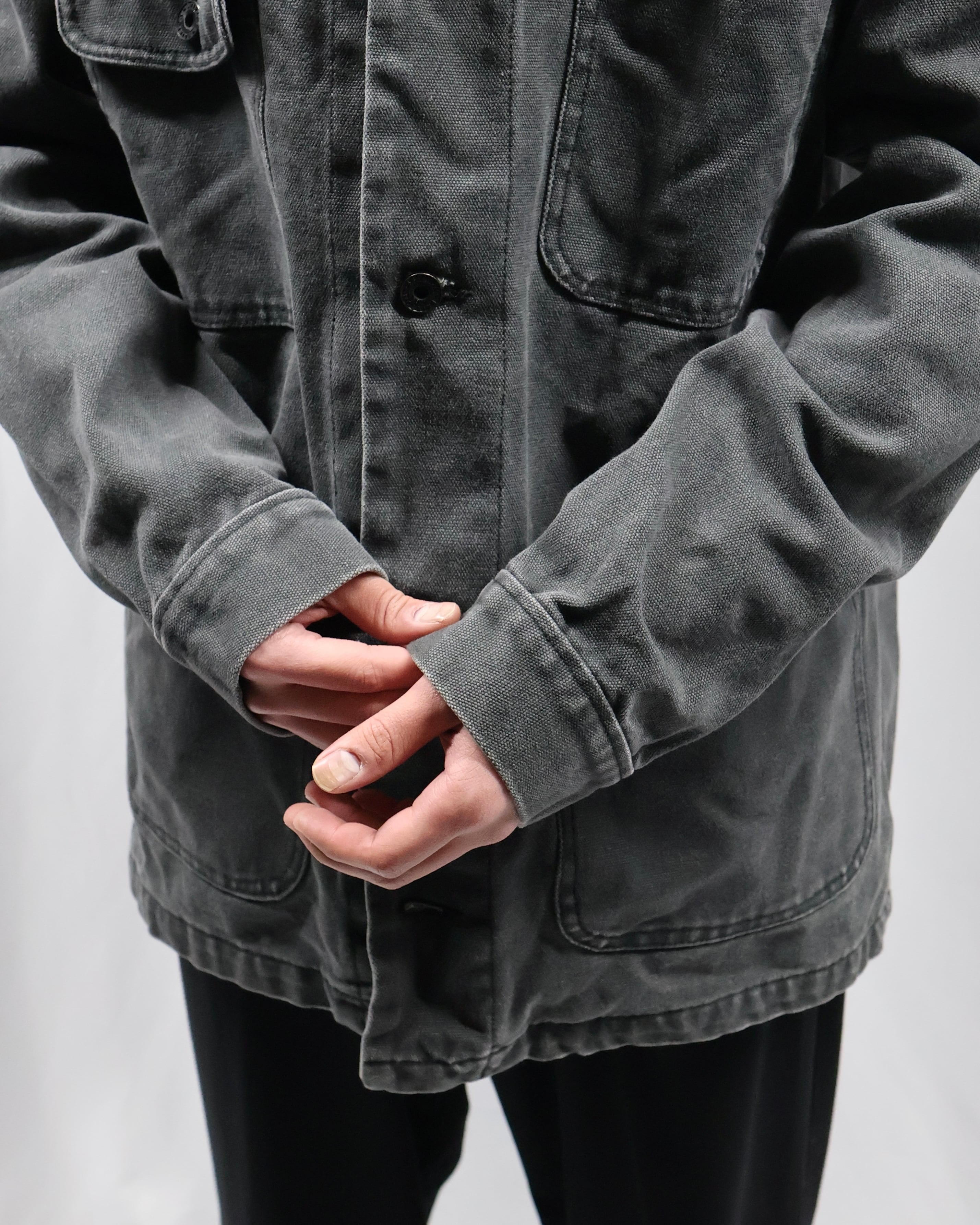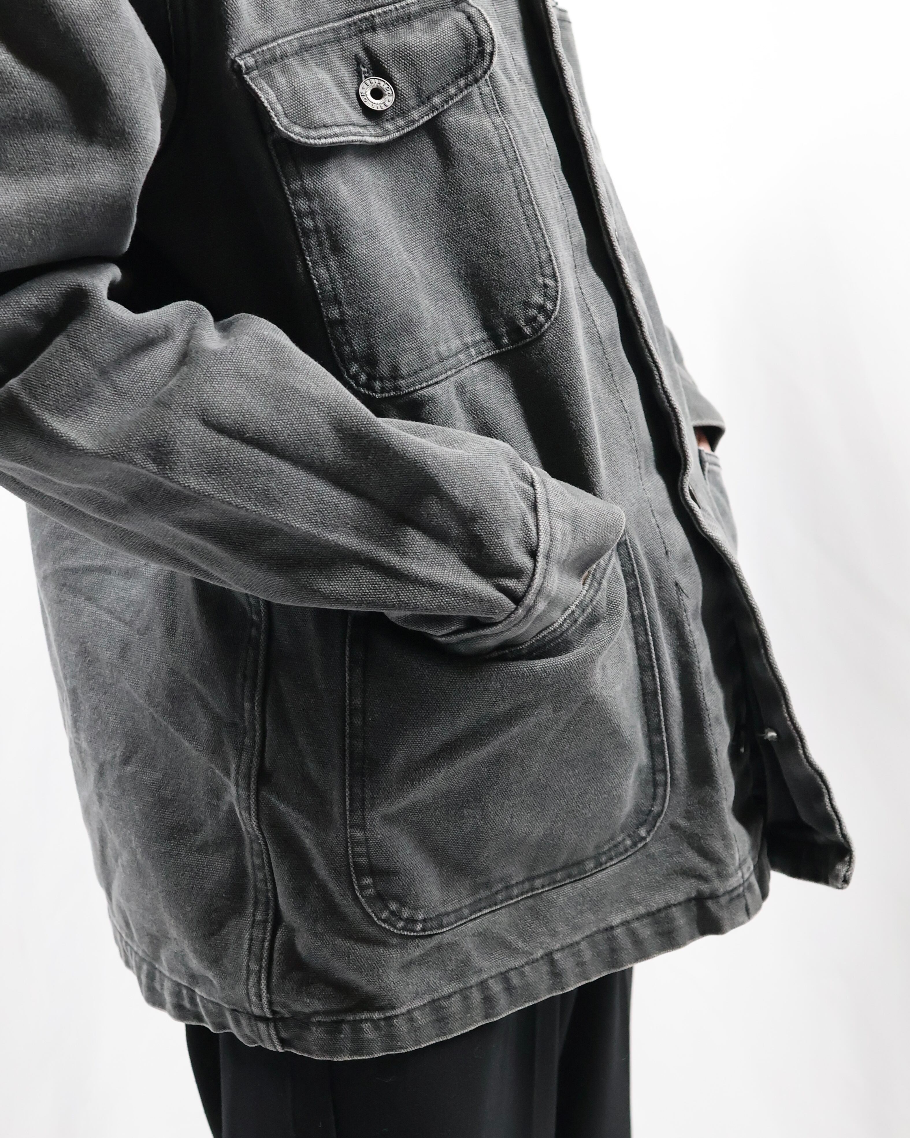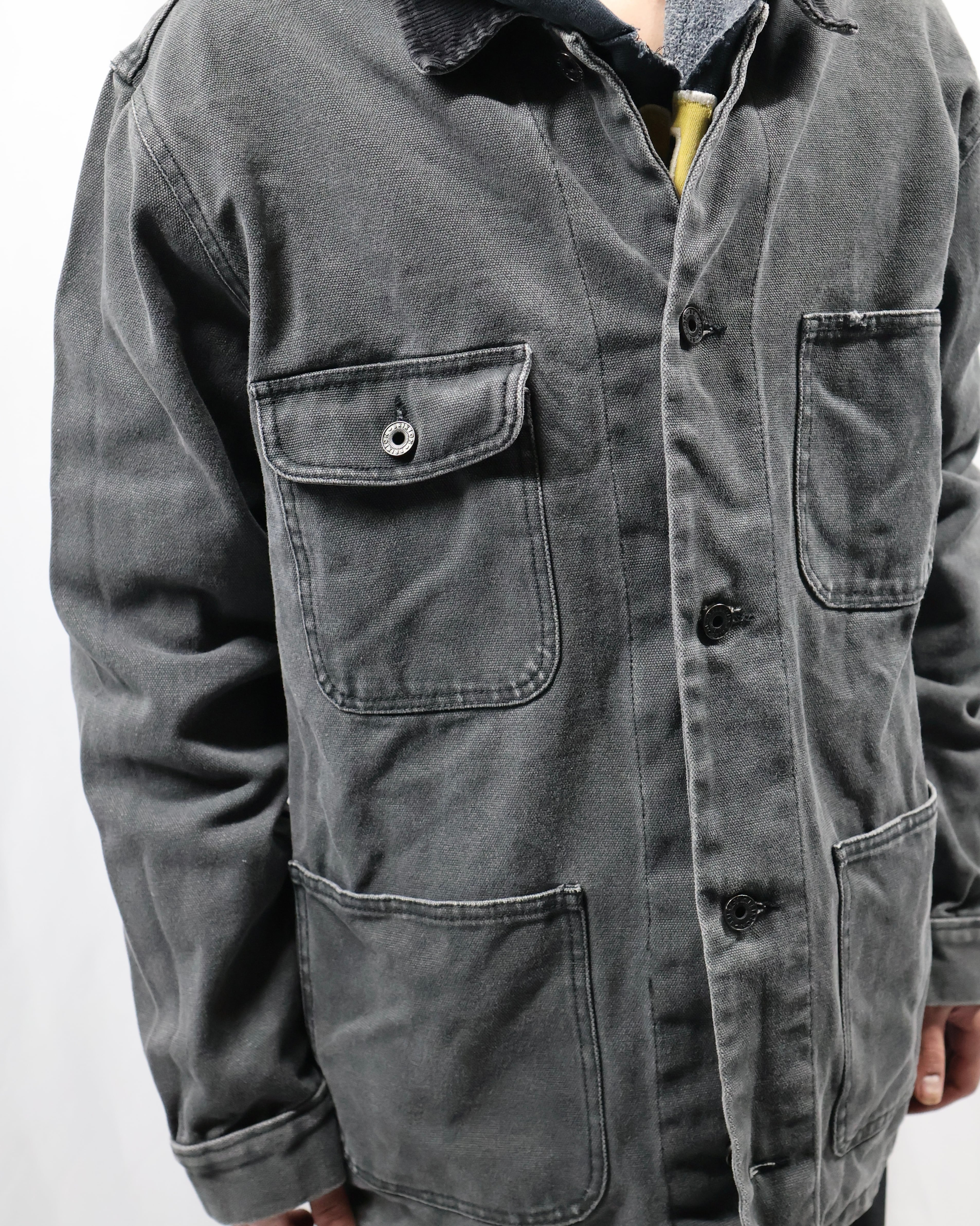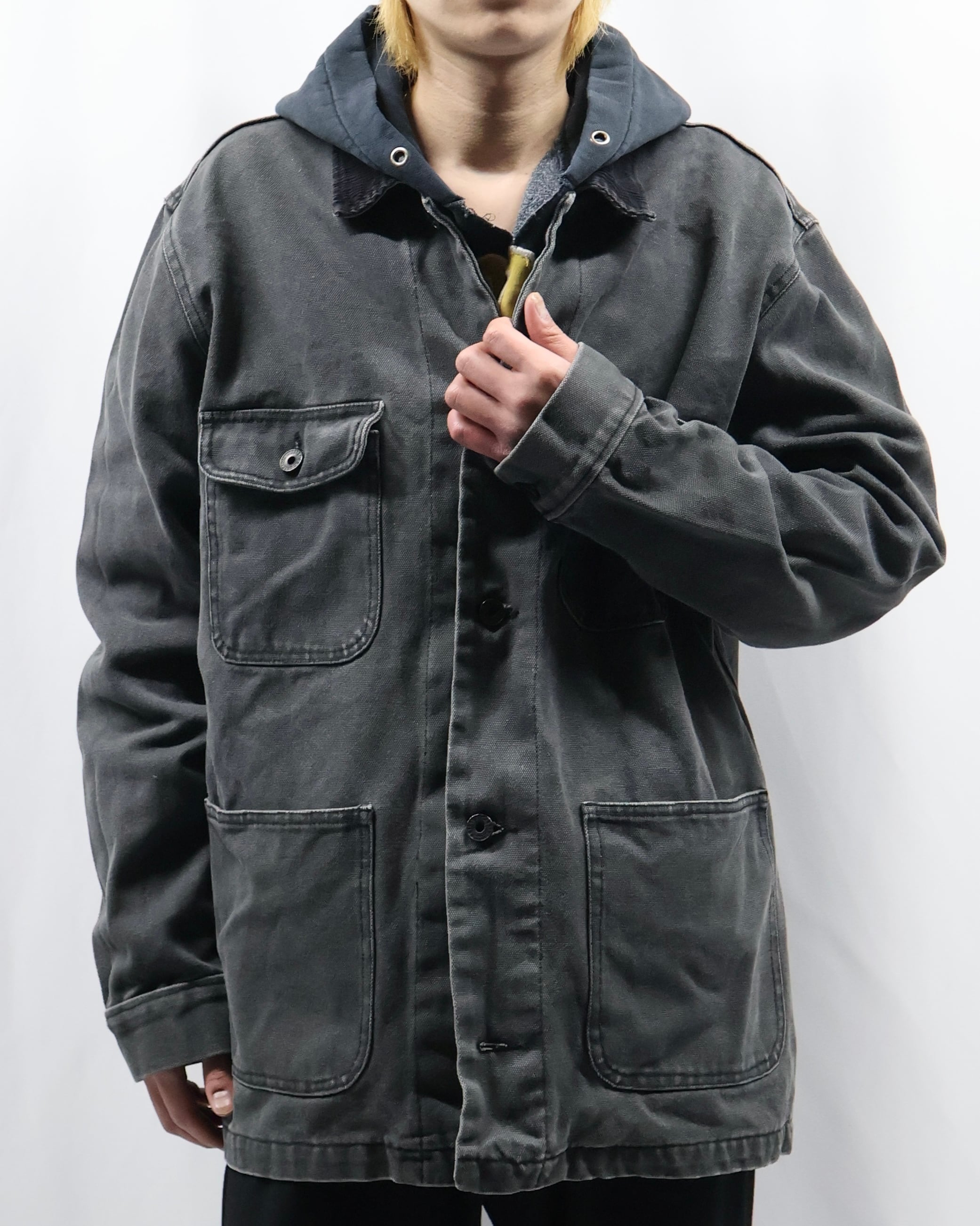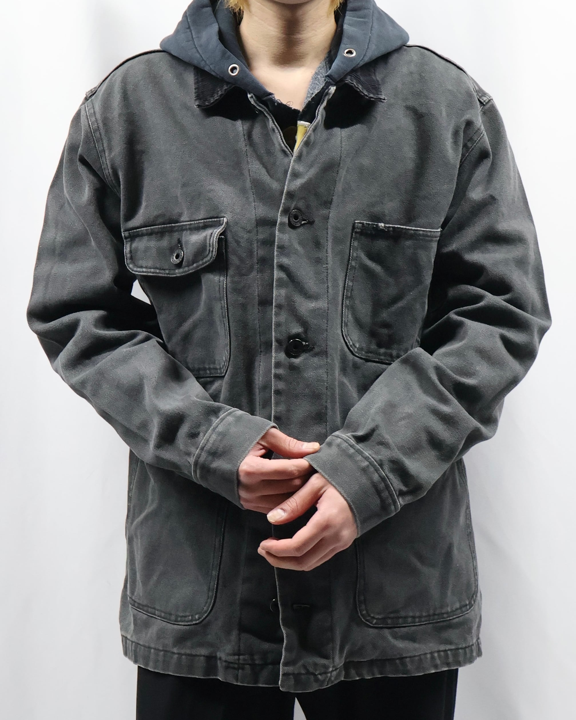 ガシッとした素材感のワークテイストなデニムジャケット。4ポケットで一つだけフラップポケットな点や、サイズ感、カバーオールみのあるデザイン、遊び心のあるディテールで可愛らしさを出したい時におすすめ。色が暗めで甘くなりすぎないのもいいポイント。いんなーとして用いてオーバーコートを羽織るのも面白いです。