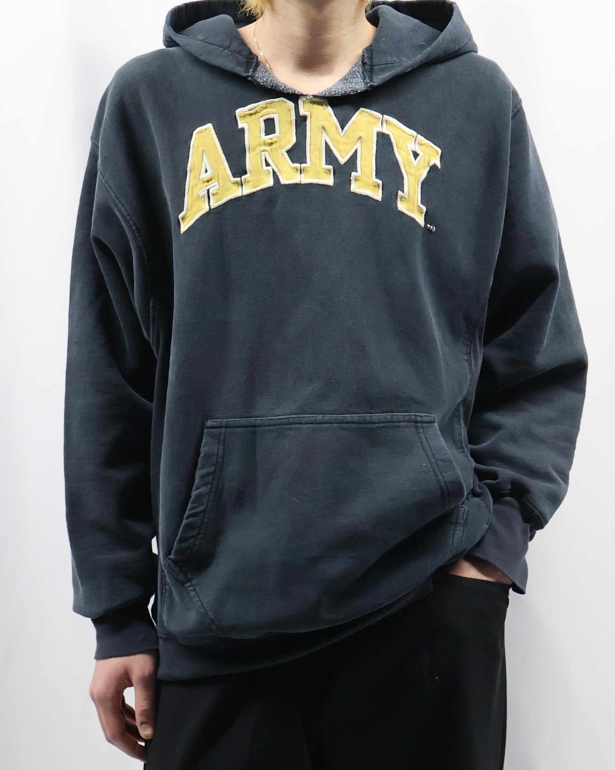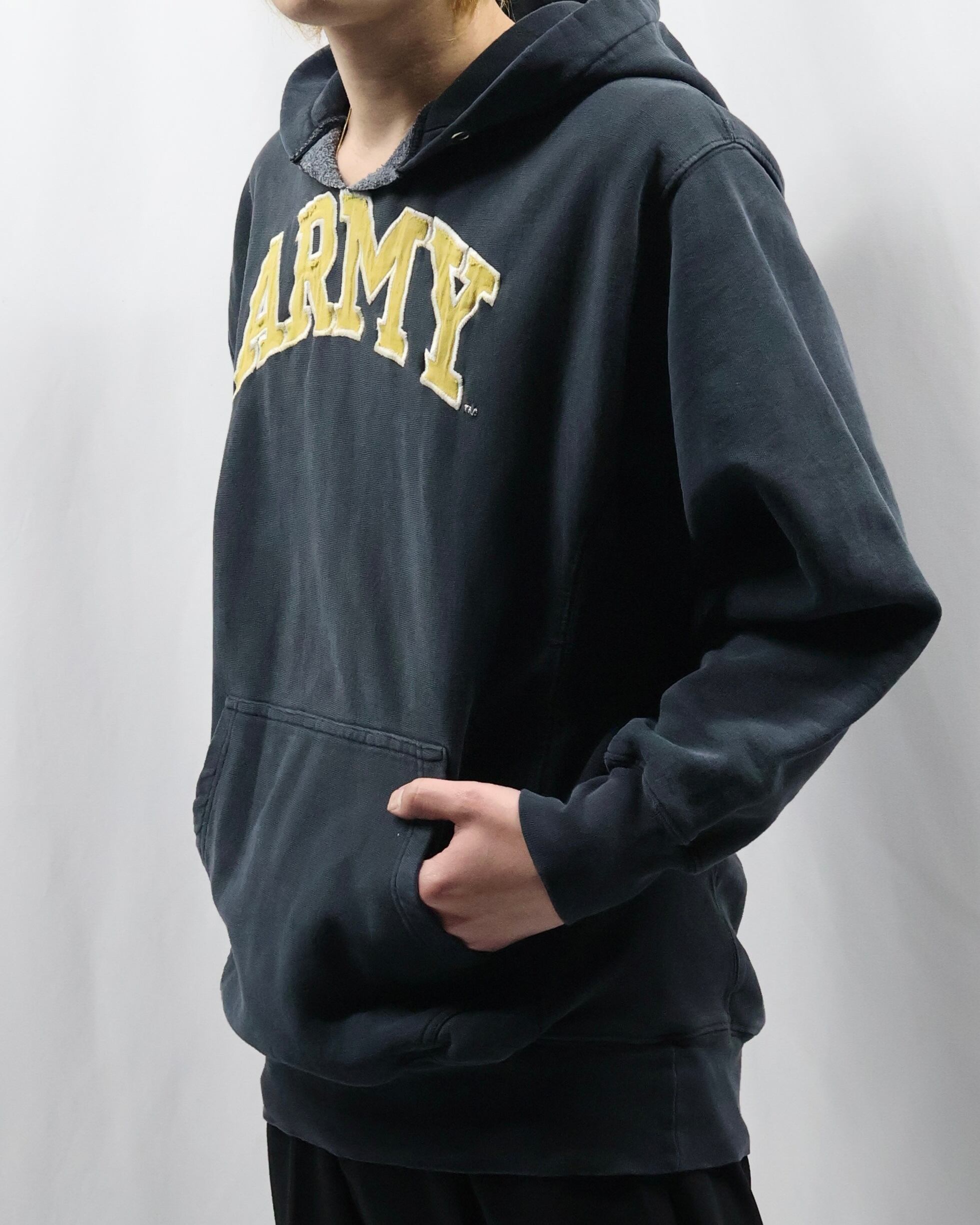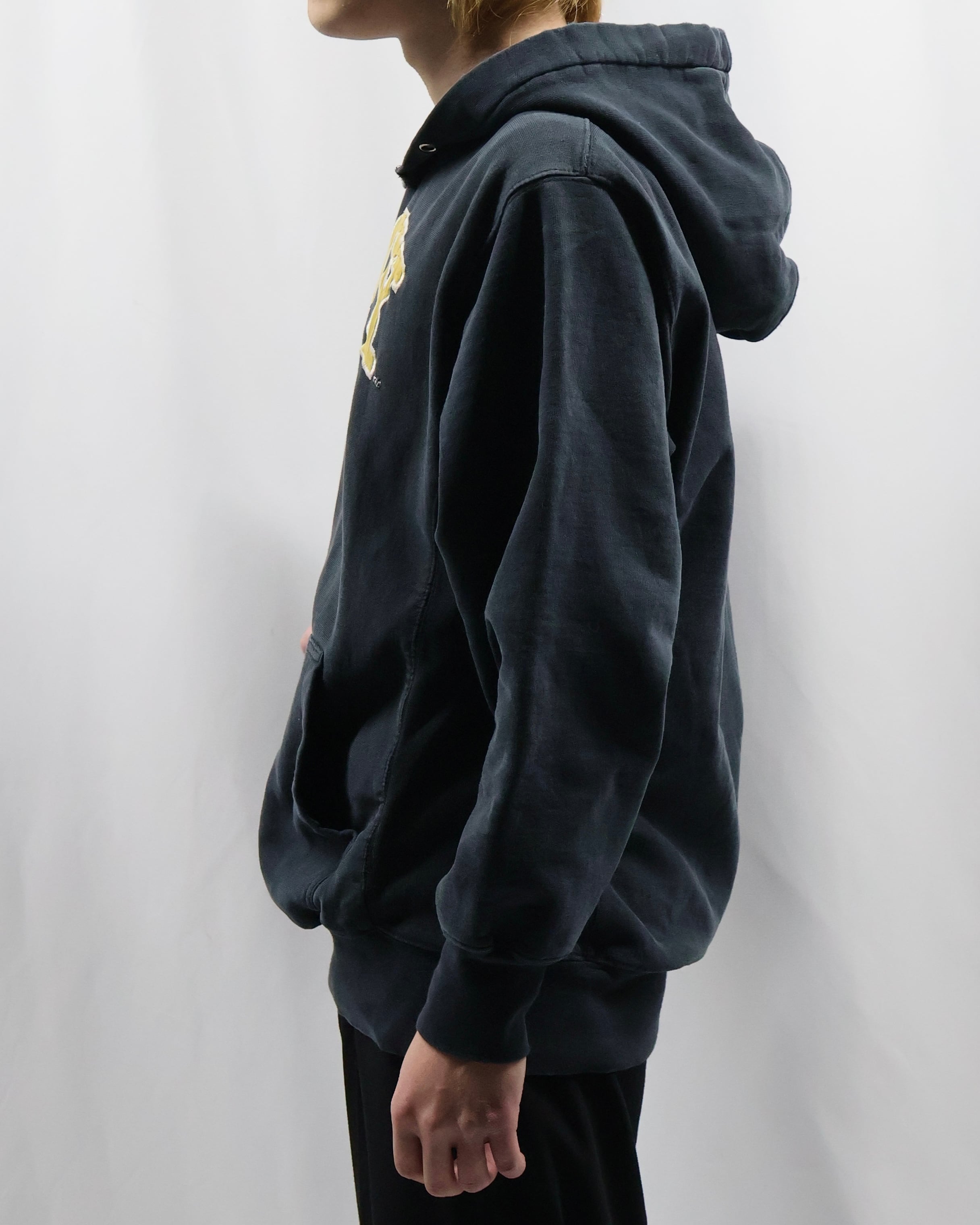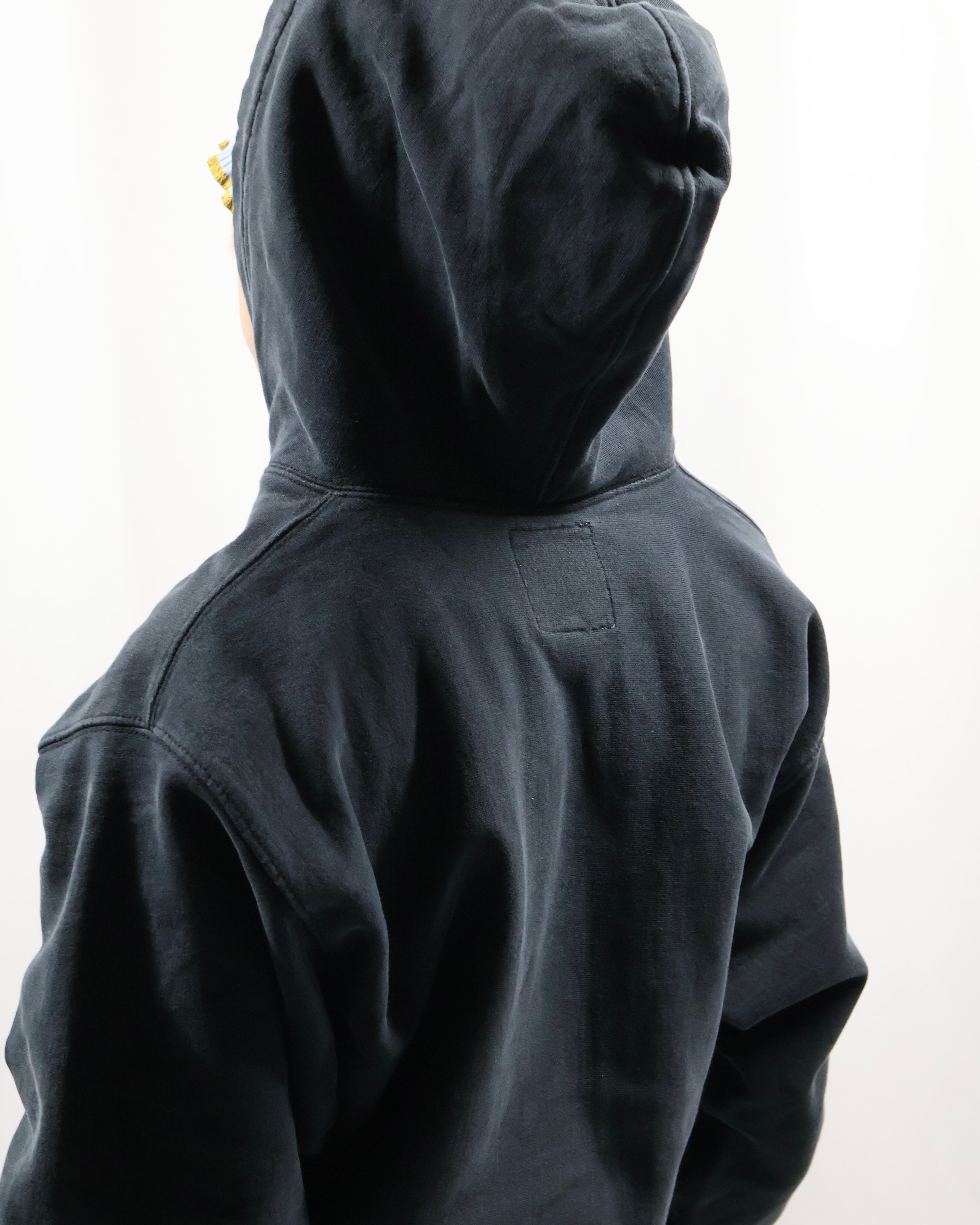 前見頃上部に大きめのロゴデザインが入ったフーディ。ポップでカジュアルをしたい方にぜひお勧めしたい一枚。面白いデザインではありながら一枚できた時のリブや袖の立体感がチープに見えない佇まいを演出します。インナーとして使ってもロゴのデザインが目立ち、キッズ感のある着こなしはもちろん、クラシックなお洋服に差し込むといい意味で他とは一線を画す玄人なファッションを作り出します。