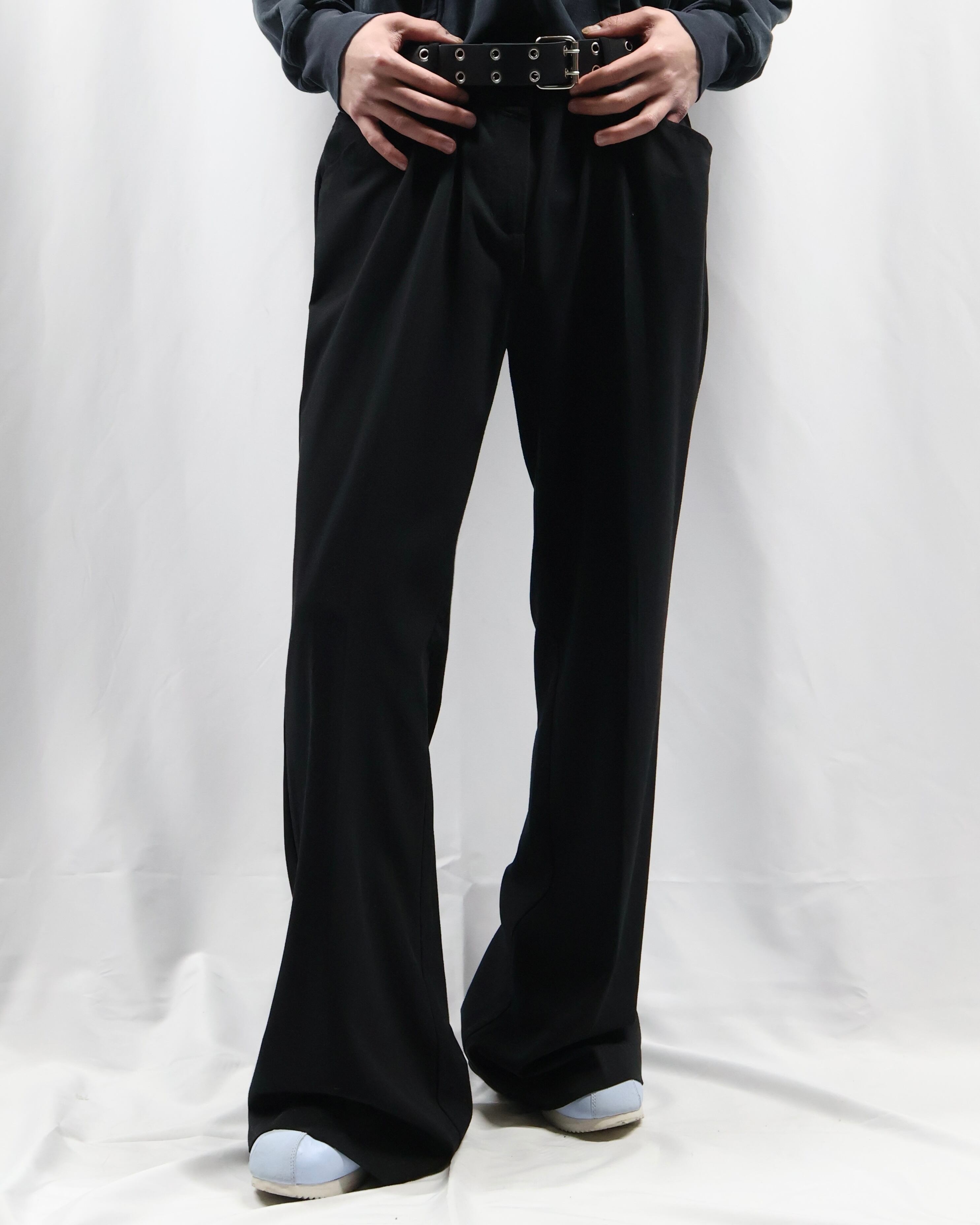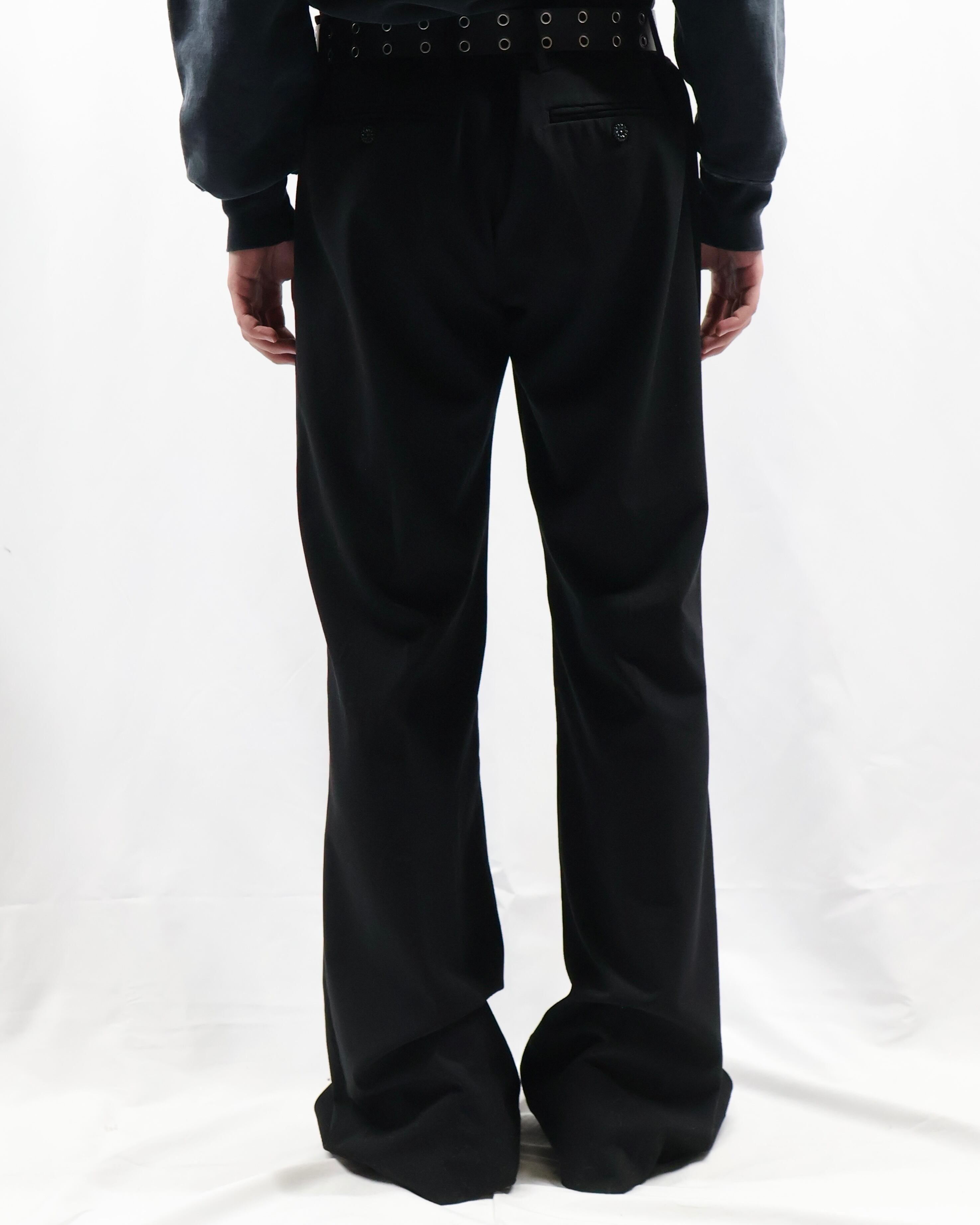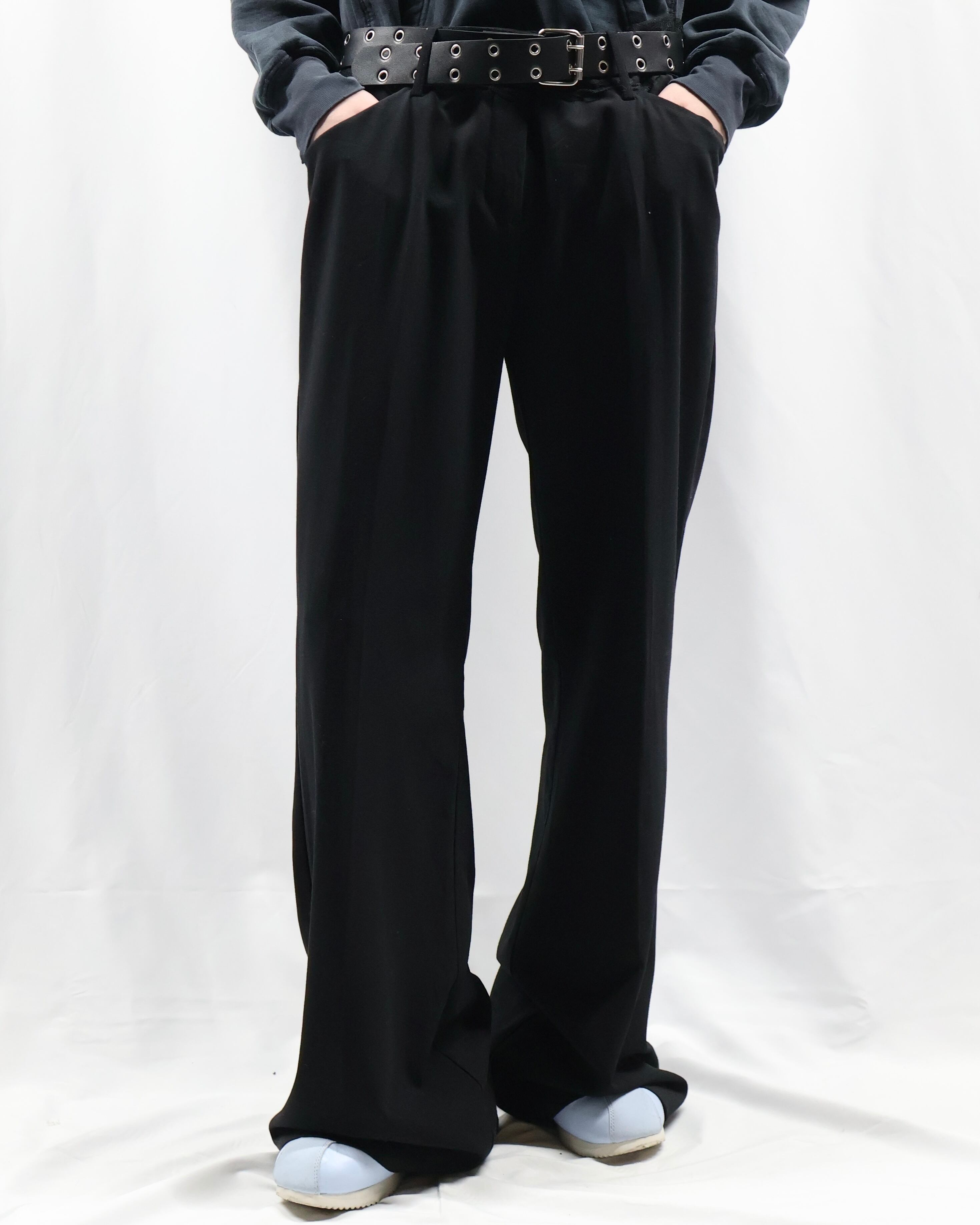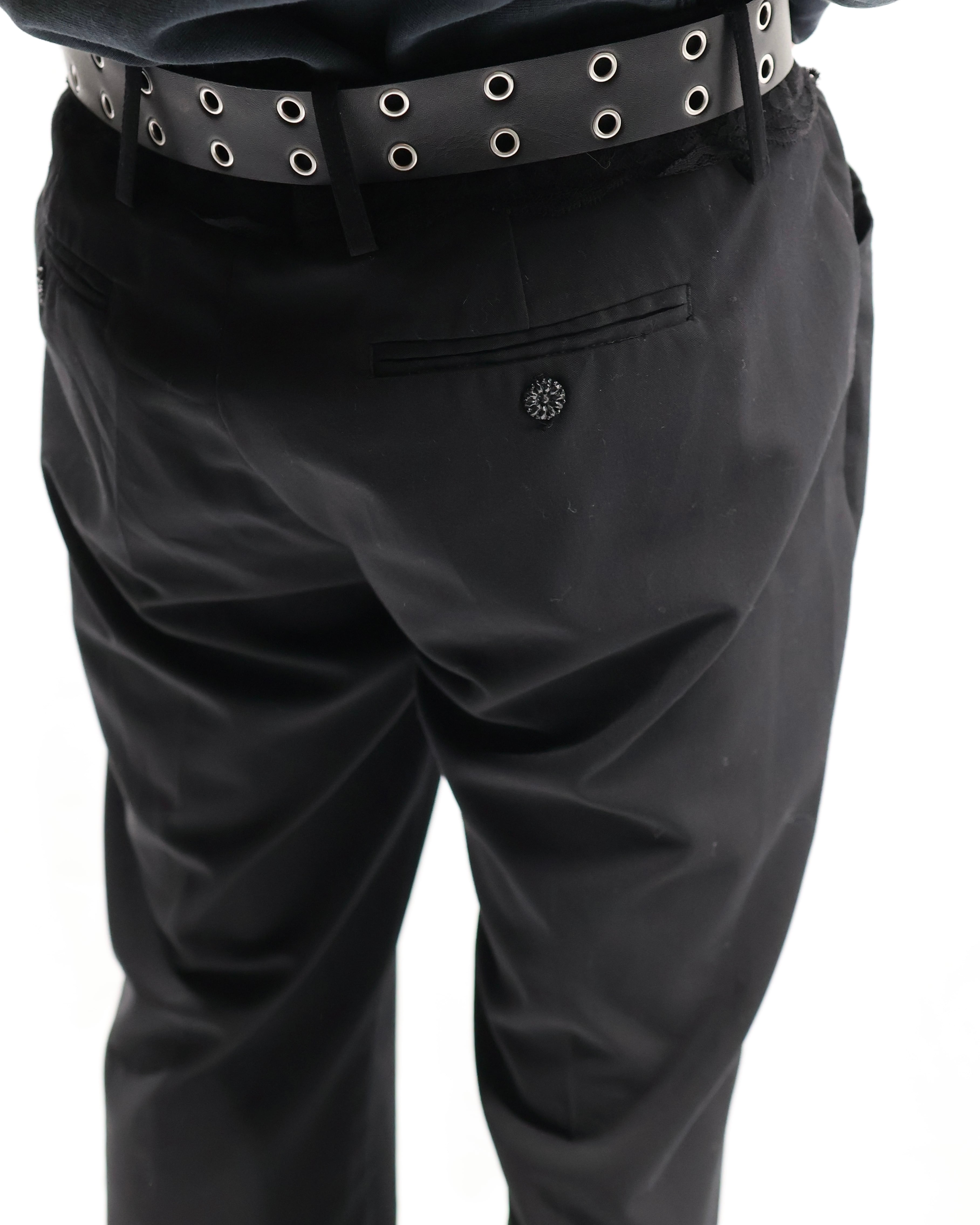 トレンディな細身のシルエットでウエスト部分にレースデザインが施されているスラックス。シルエットはシンプルでウエストにデザインがある、コーディネートにテクニカルな印象を与えてくれるパンツ。タックインして全容を見せてもいいですし、ウエストにかかるほどのトップスと合わせてチラっと見えるほどにして、アクセントとして用いるもgood。普段は綺麗なスラックスとして使っていただけますので、黒のスラックスをお探しの方にもお勧めできます。