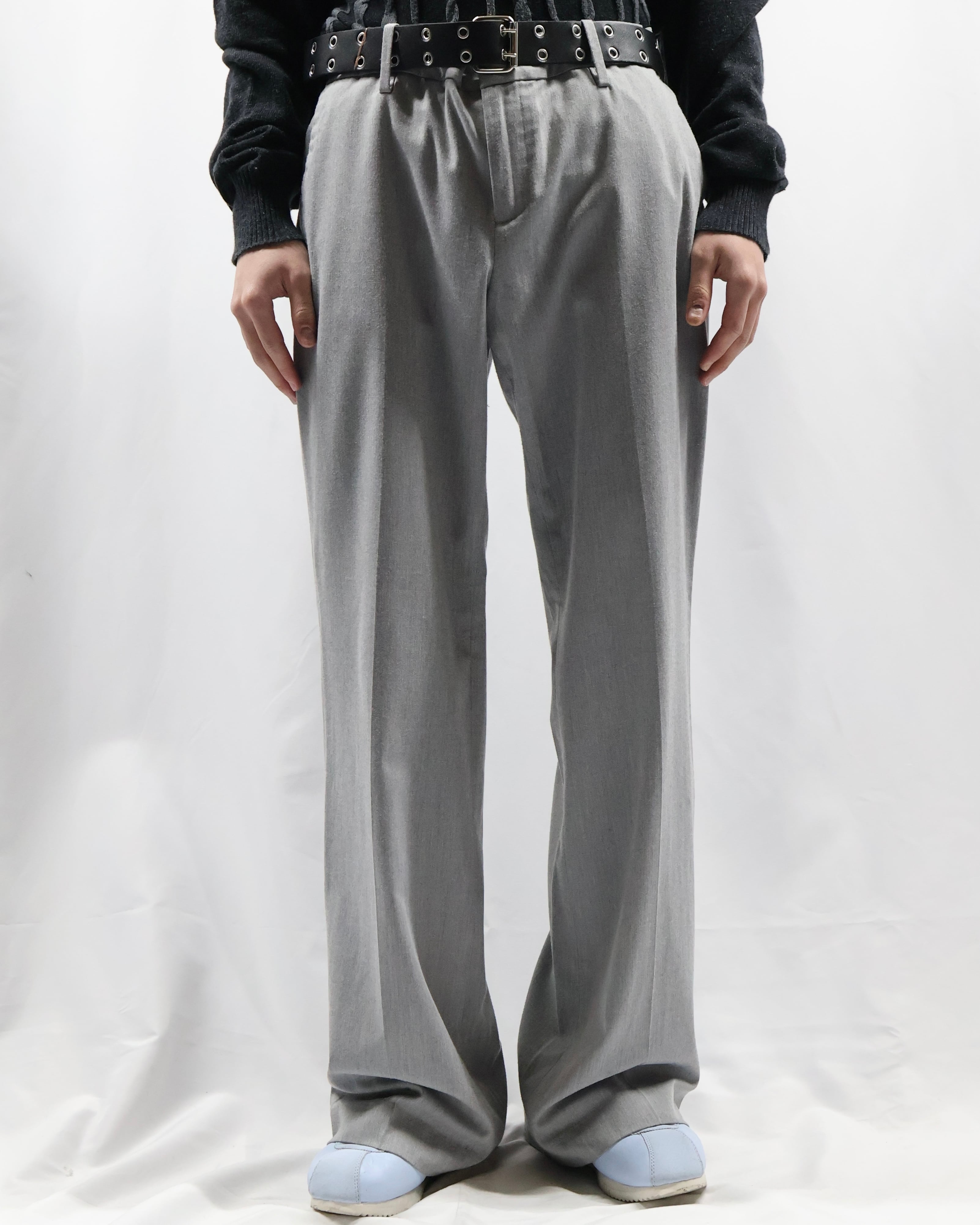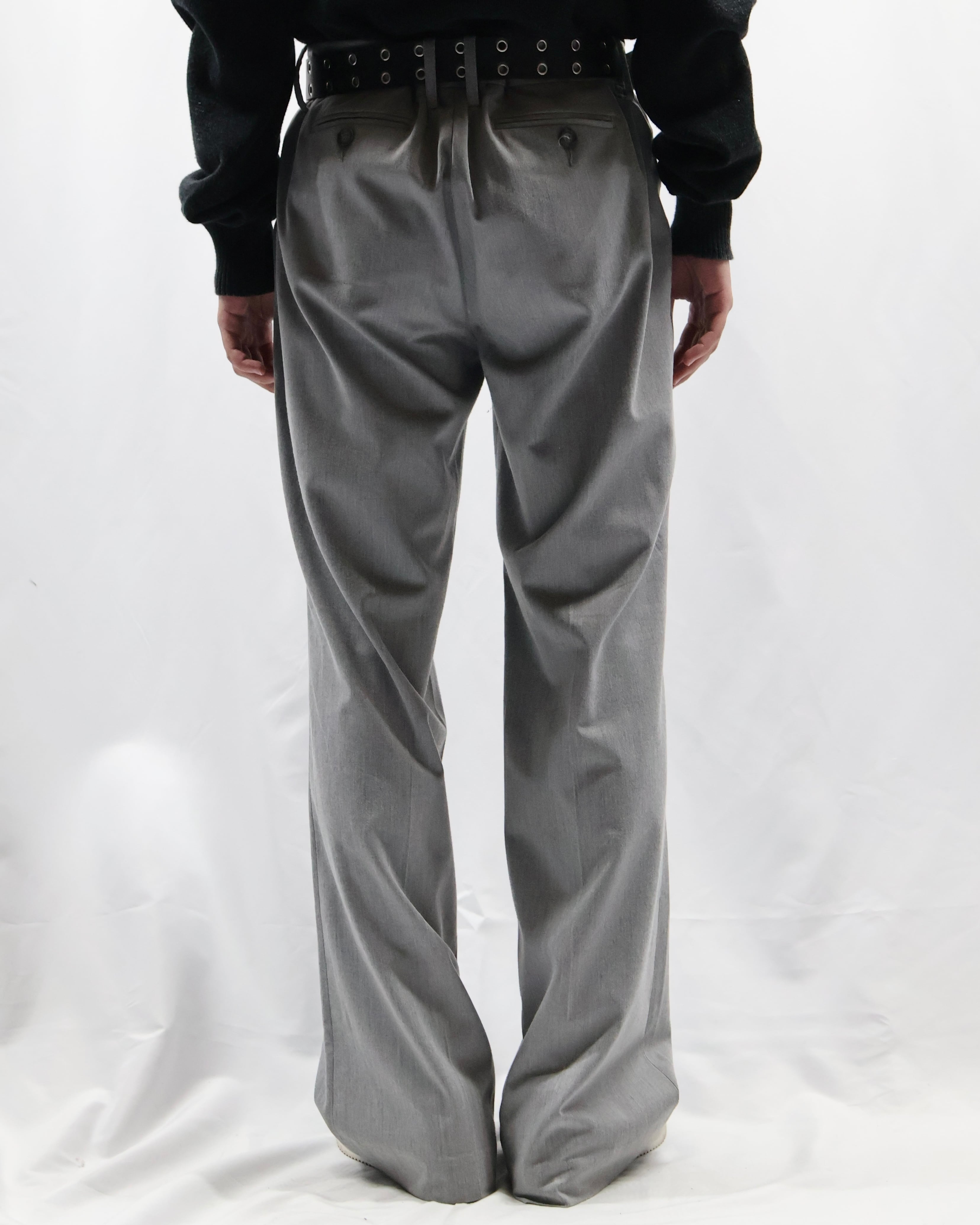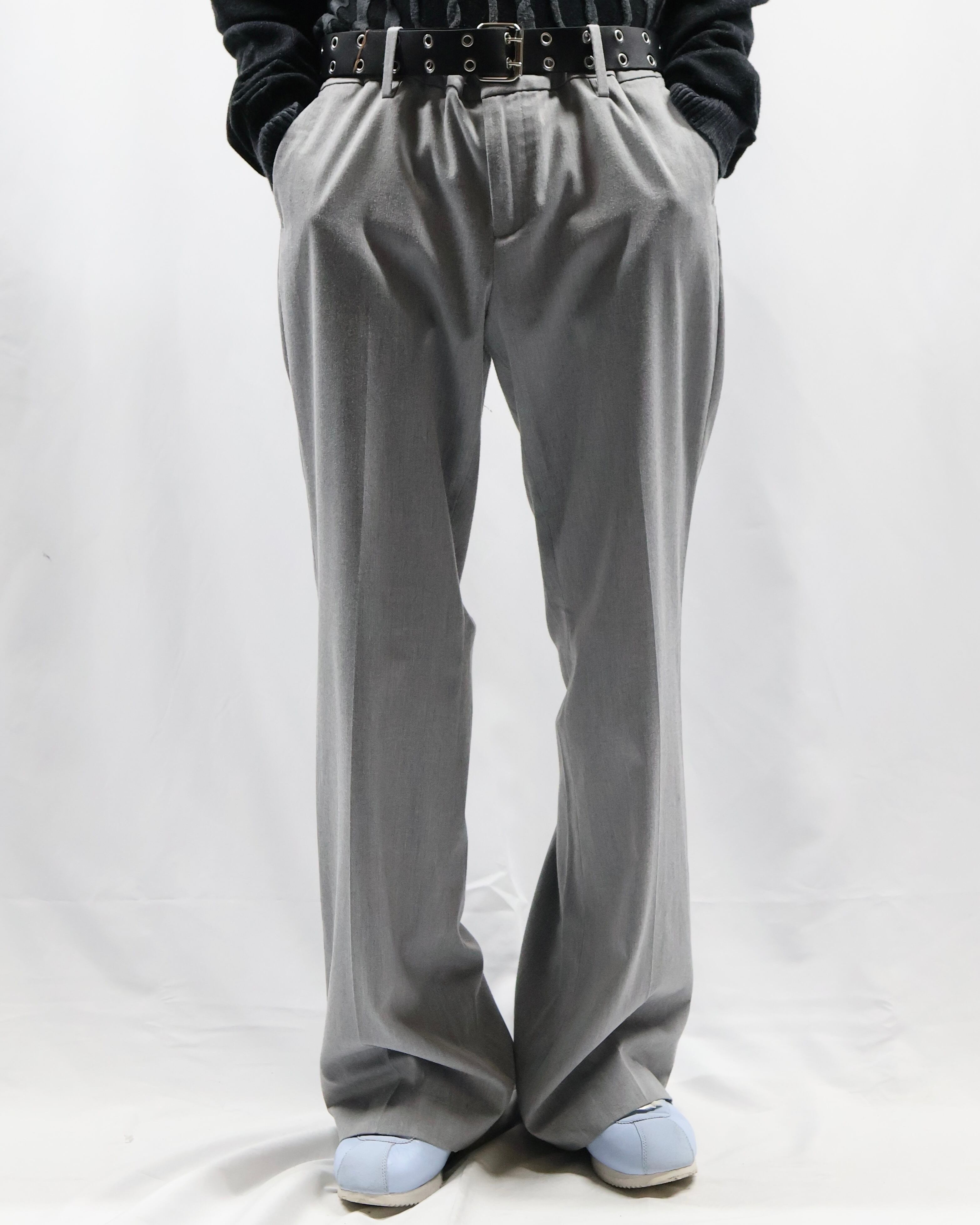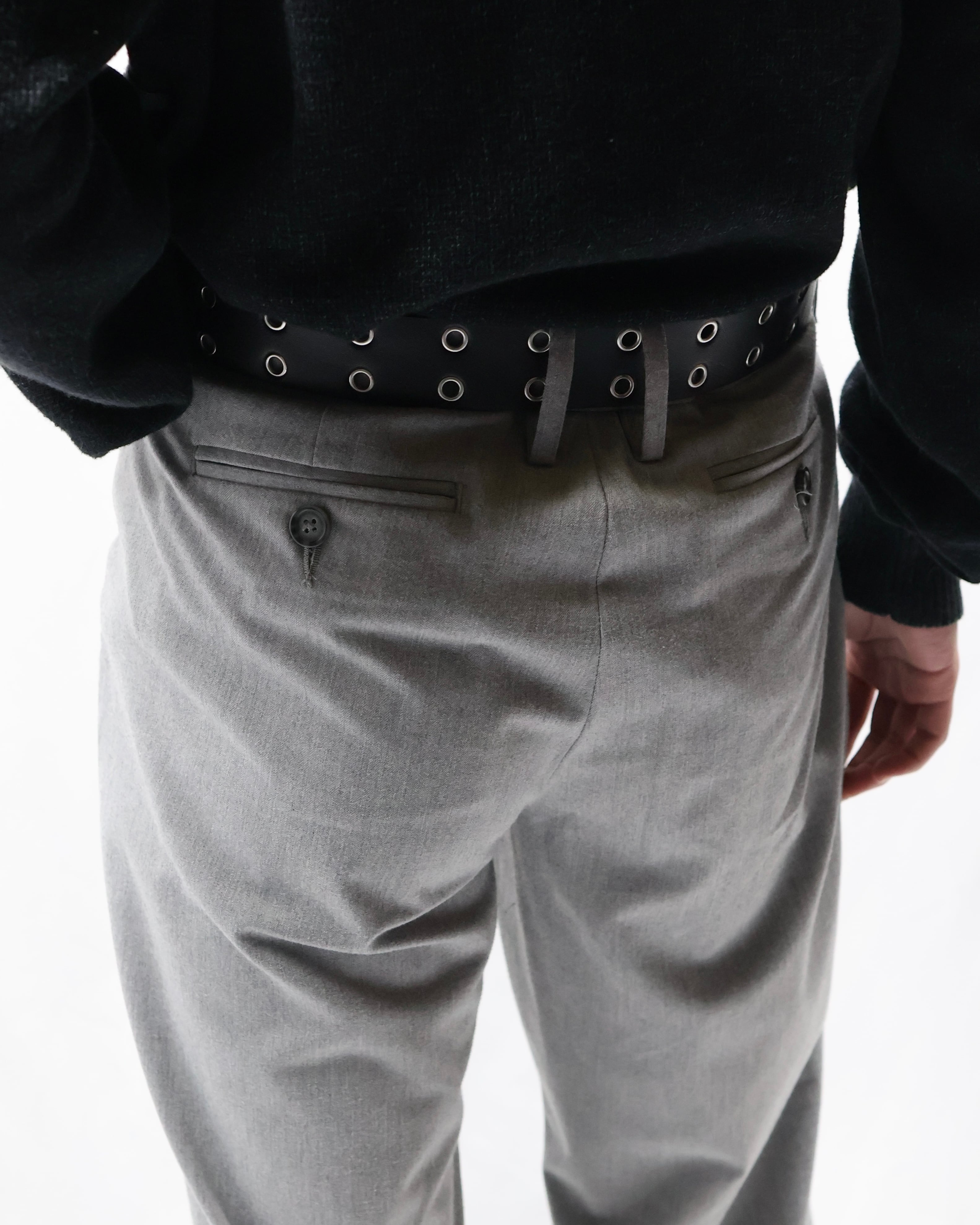 ノータックで何にでも合わせやすいライトグレーのスラックス。足元にストンと落ちる綺麗なトラウザーです。ノータックなことでボトムス以上でも以下でもない、ベースをしっかりと作り上げてくれるとりあえず一枚履いておきたいパンツ。ライトグレーというカラーがオールシーズンに馴染む色合いで様々な場所に連れていきたくなります。