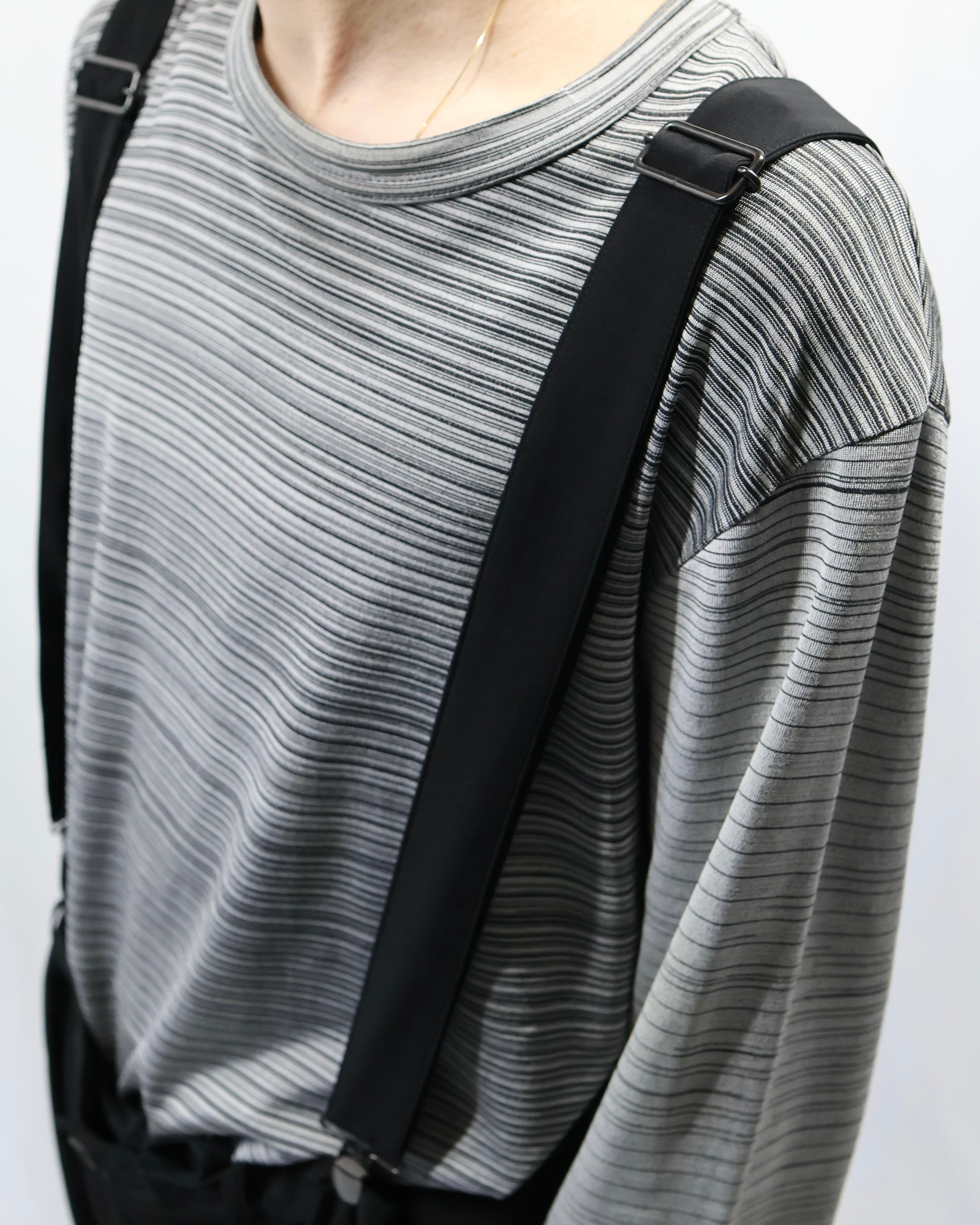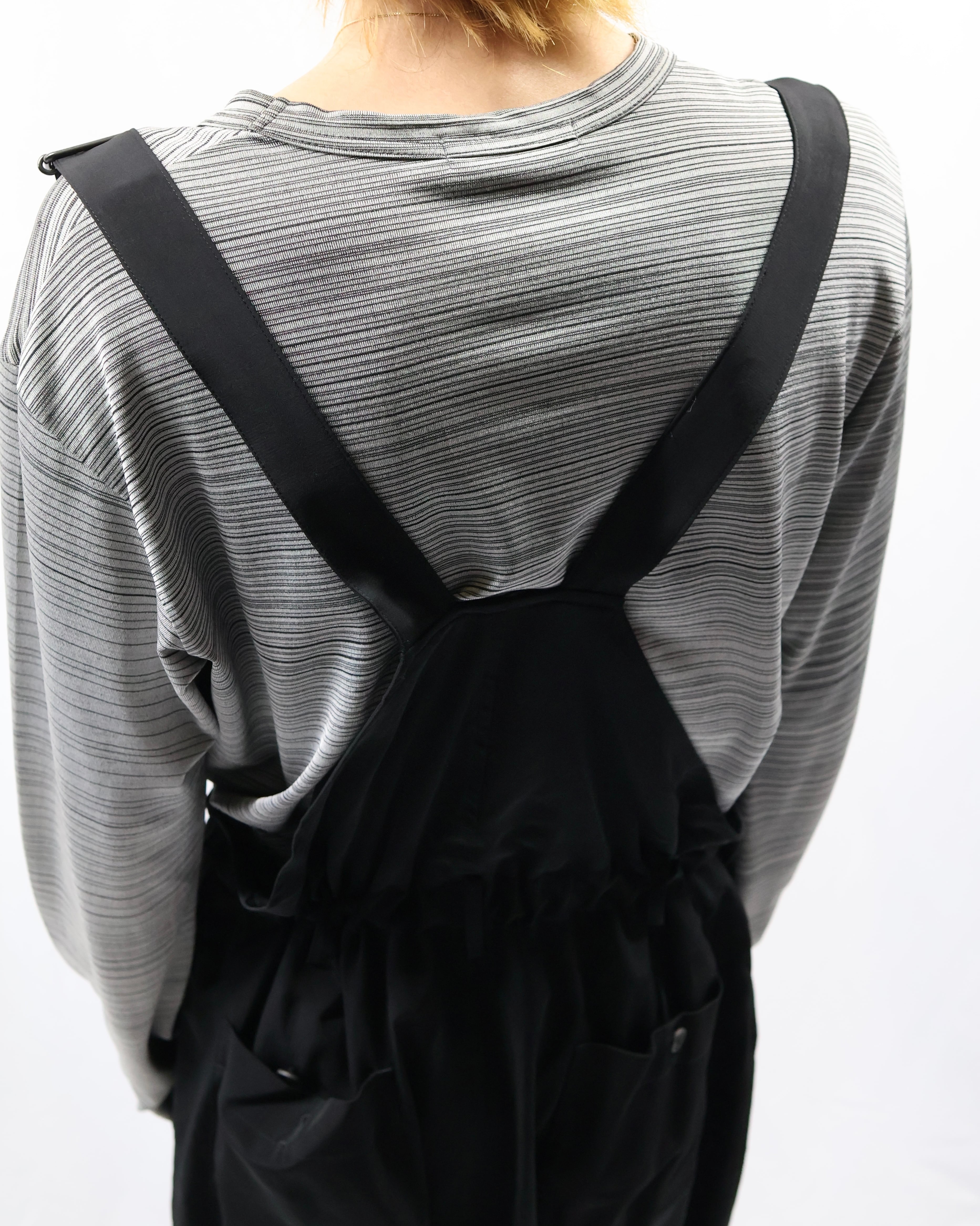 素材感とデザインがモードな雰囲気を演出する、サスペンダーパンツ。パラシュートパンツのようなシルエットに見え、変わり種のパンツとして普通のパンツは持っているが、シルエットの良さは残しつつ面白いものを履きたい方におすすめ。意外とトップスを選ぶこともなくコートからブルゾン、シャツ、ロンTなど多岐に渡って使用いただけます。サスペンダーを下ろしてカジュアルに着ても良いです。