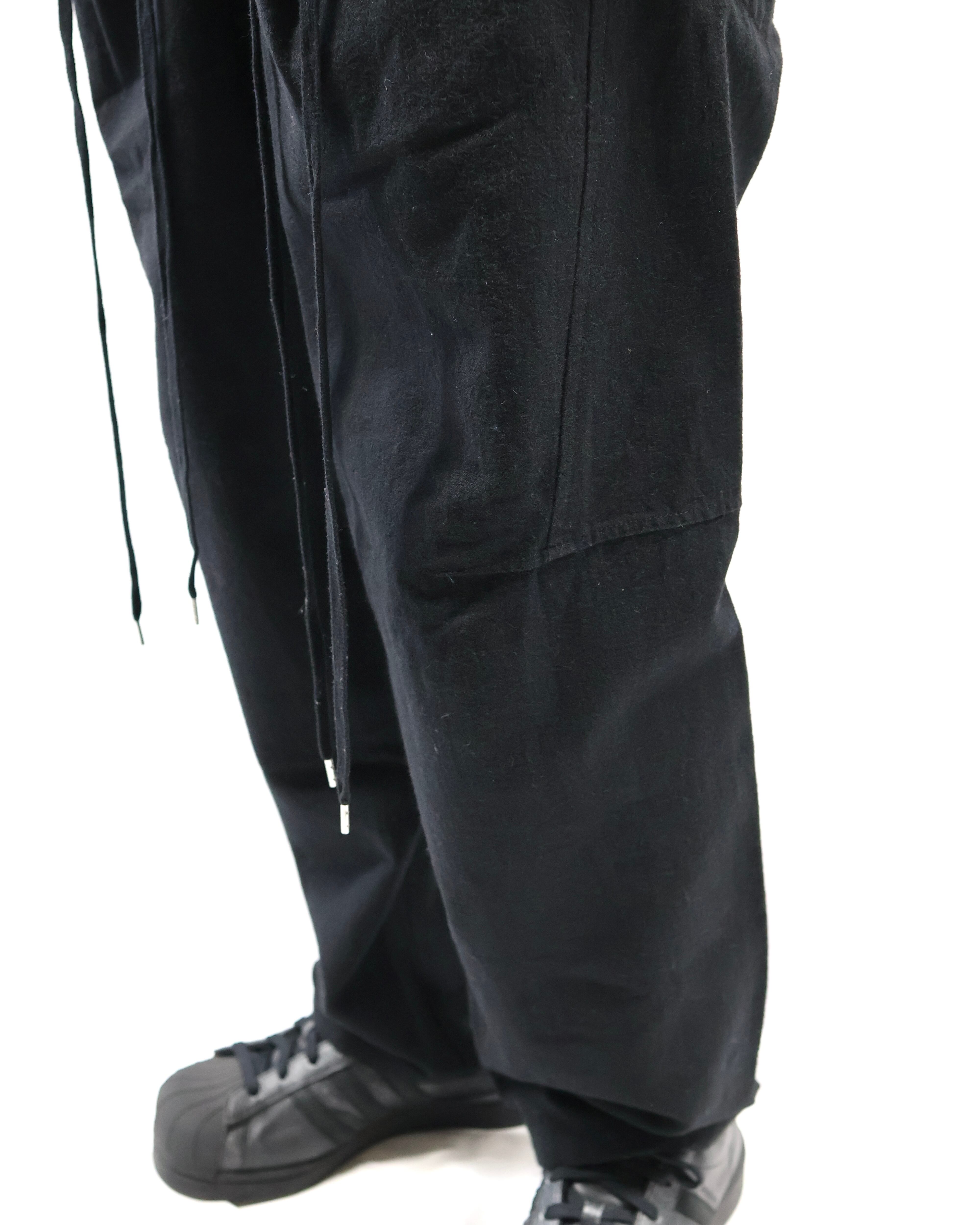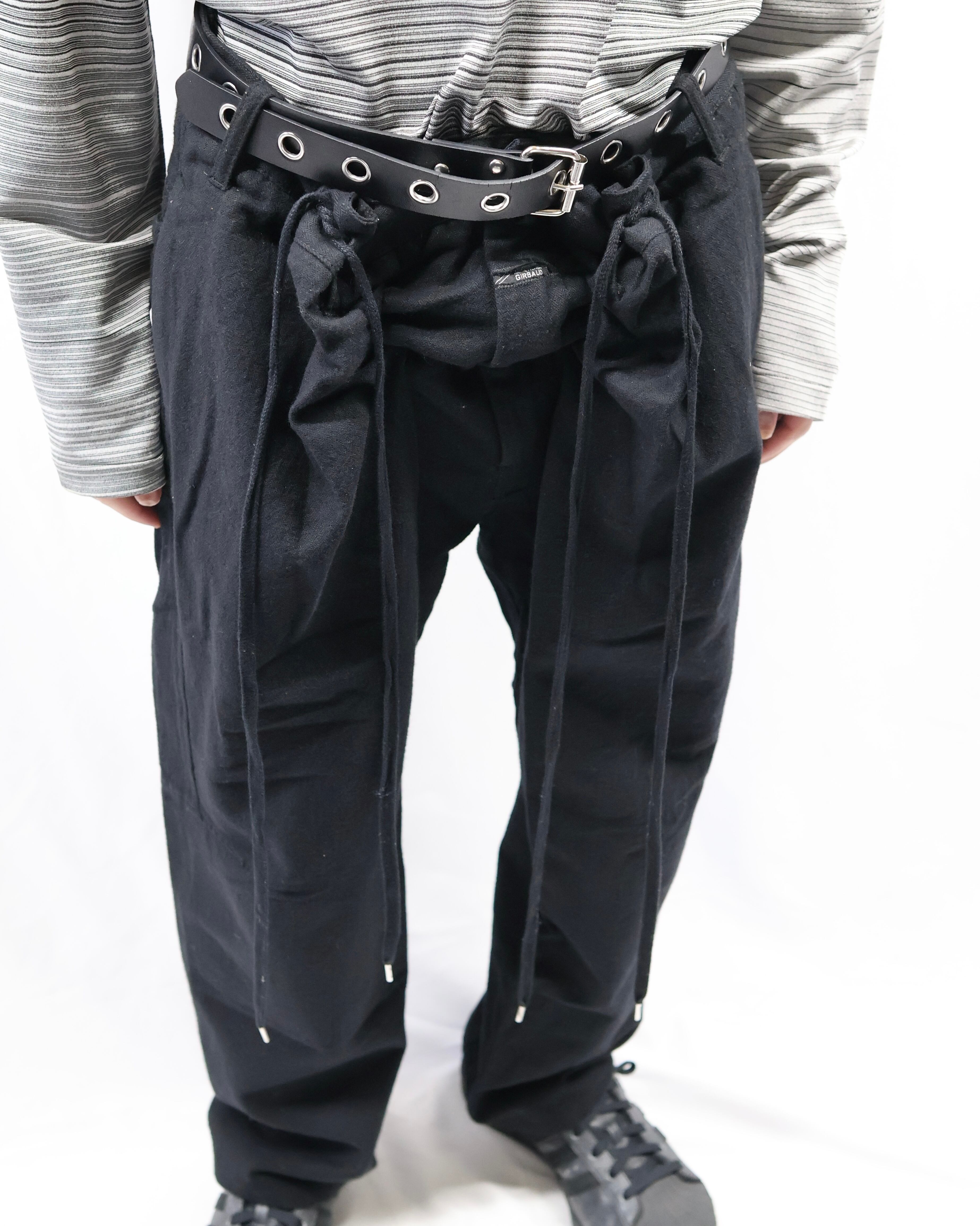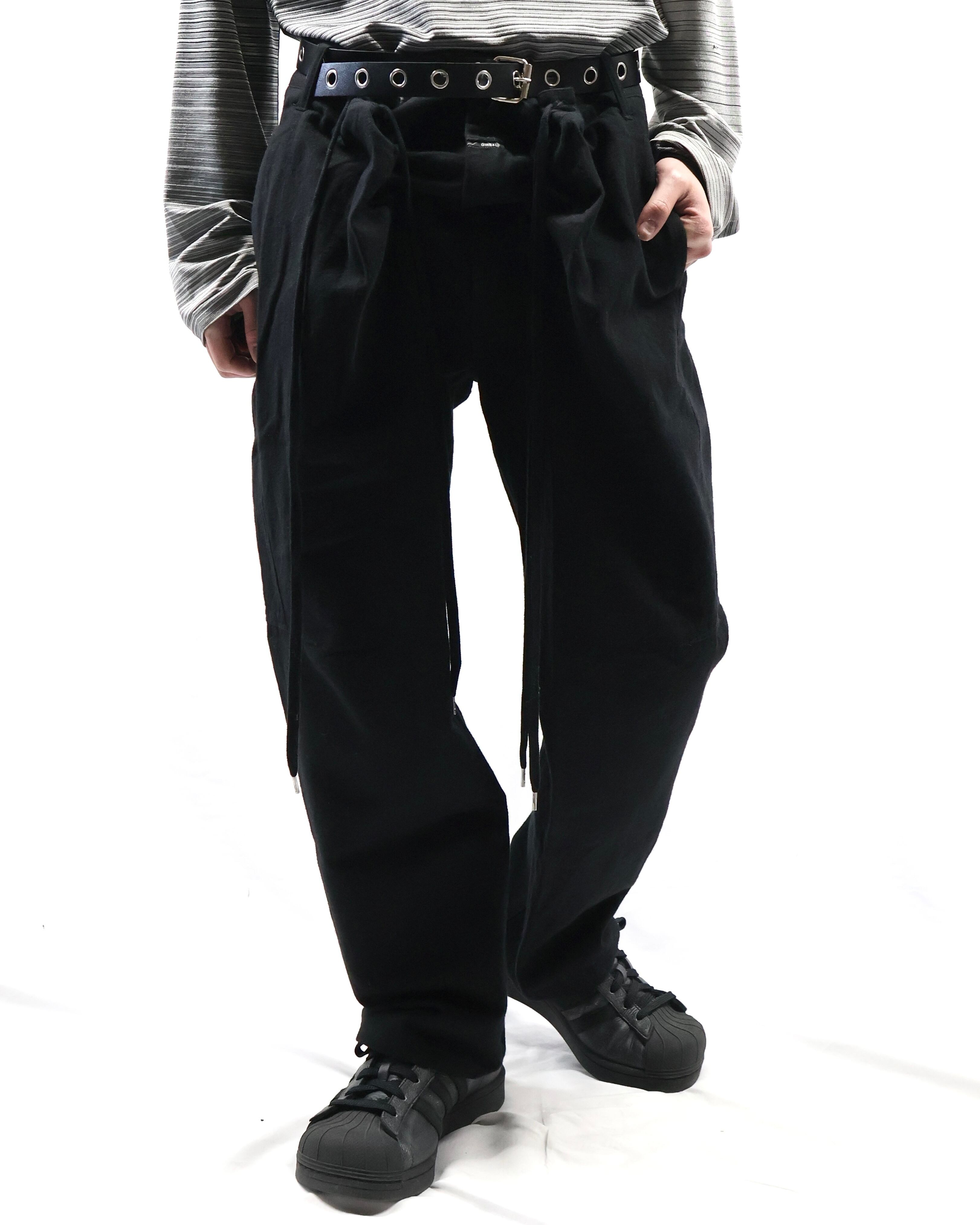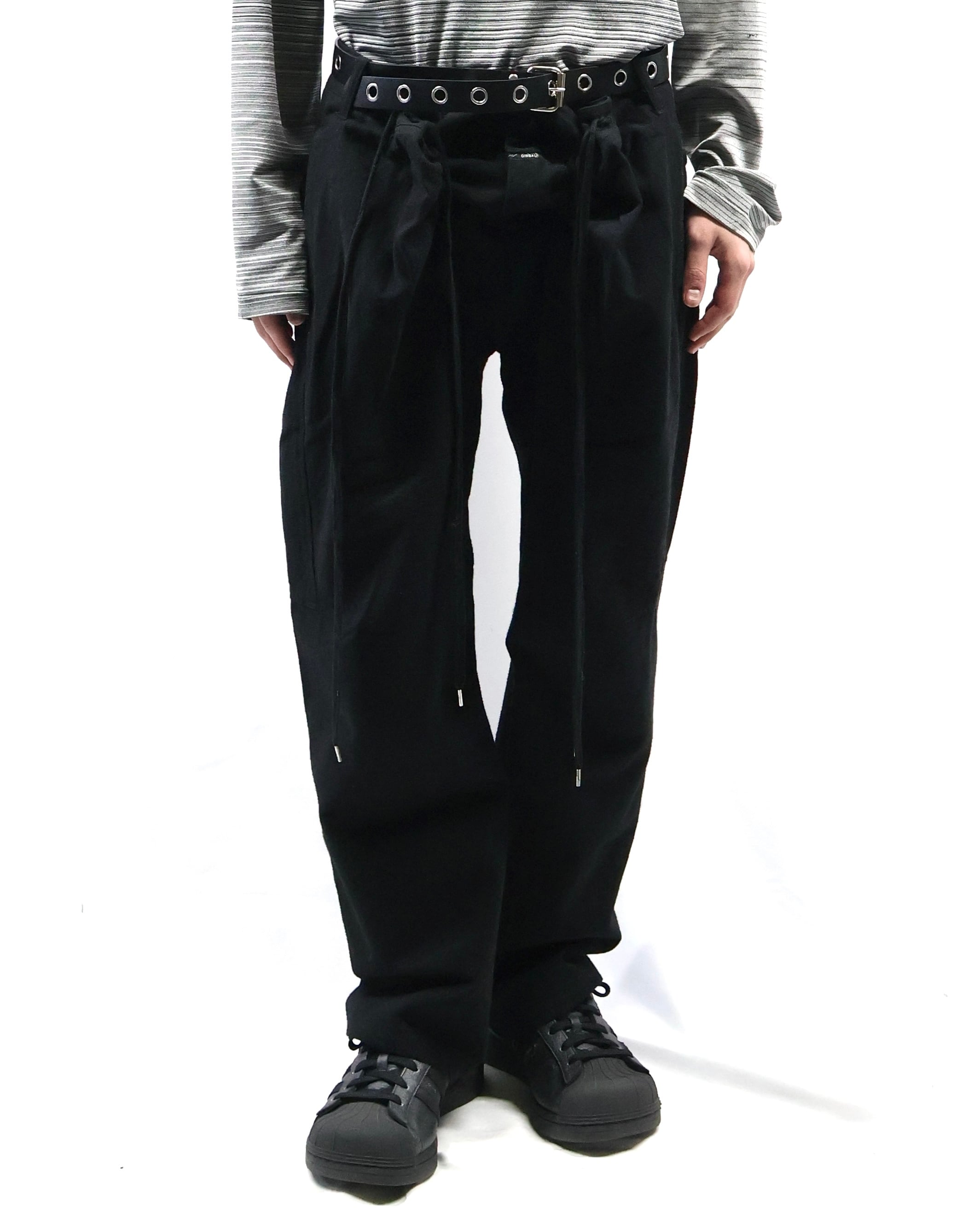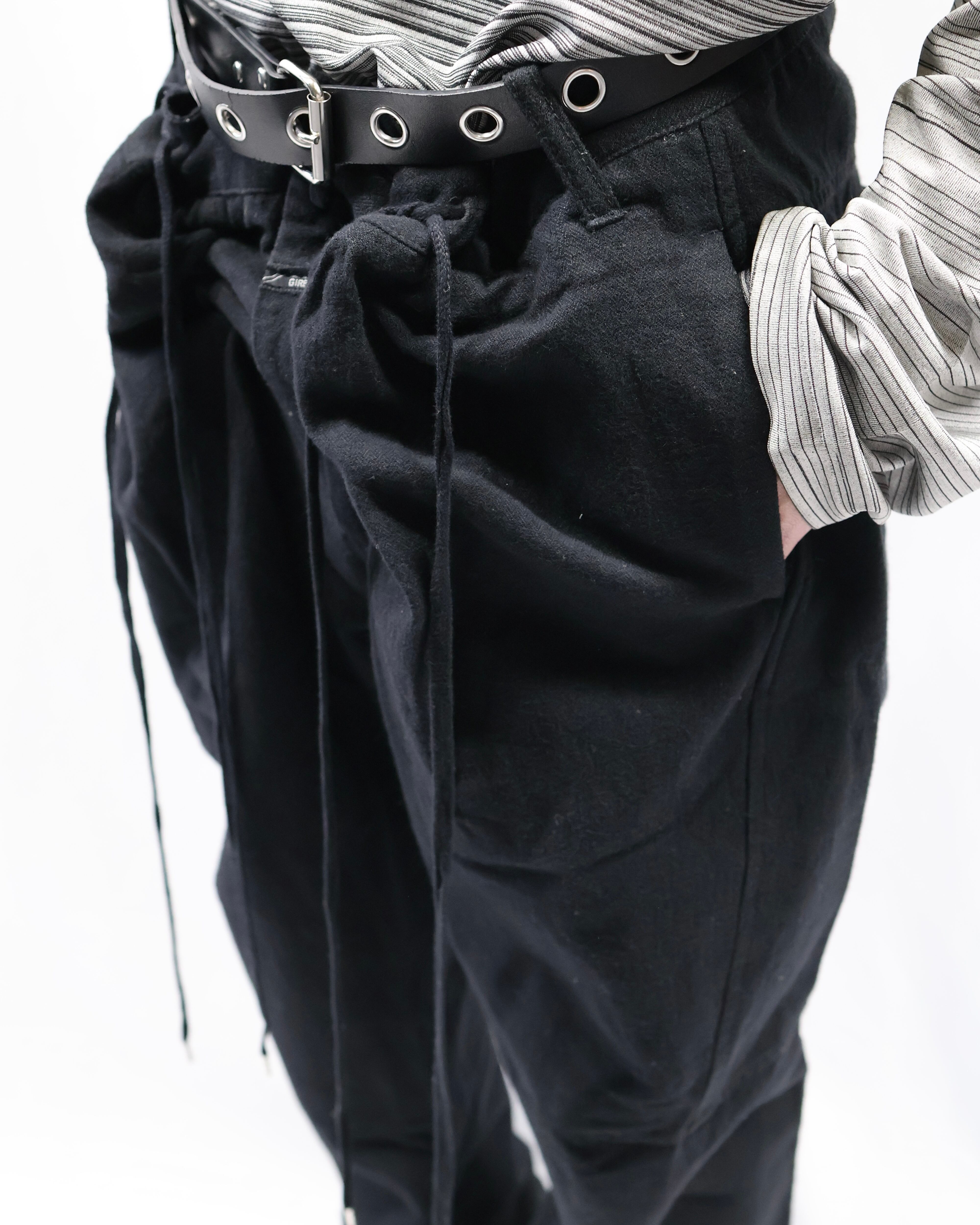 ウエスト部分のディテールが面白いテーパードウールパンツ。デザインに目が行くもののシンプルに細身の綺麗なシルエットでウールのジャケットとセットアップライクで着ていただき、パンツを主体としたコーディネートを組んでいただからと面白いです。ロングトップスと合わせドローコードの部分だけ下から見せるなどのファッションもしていただける、面白みのあるパンツです。