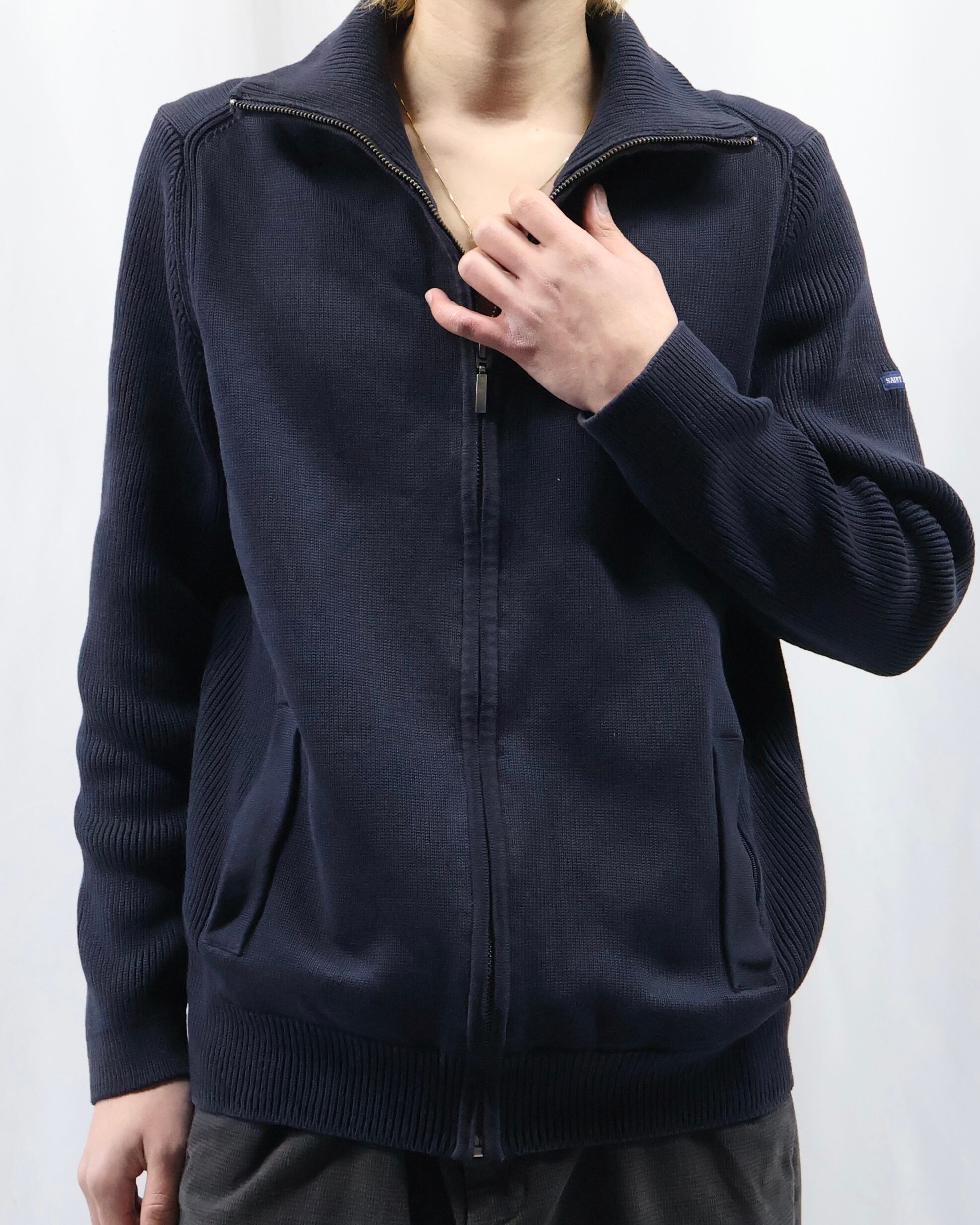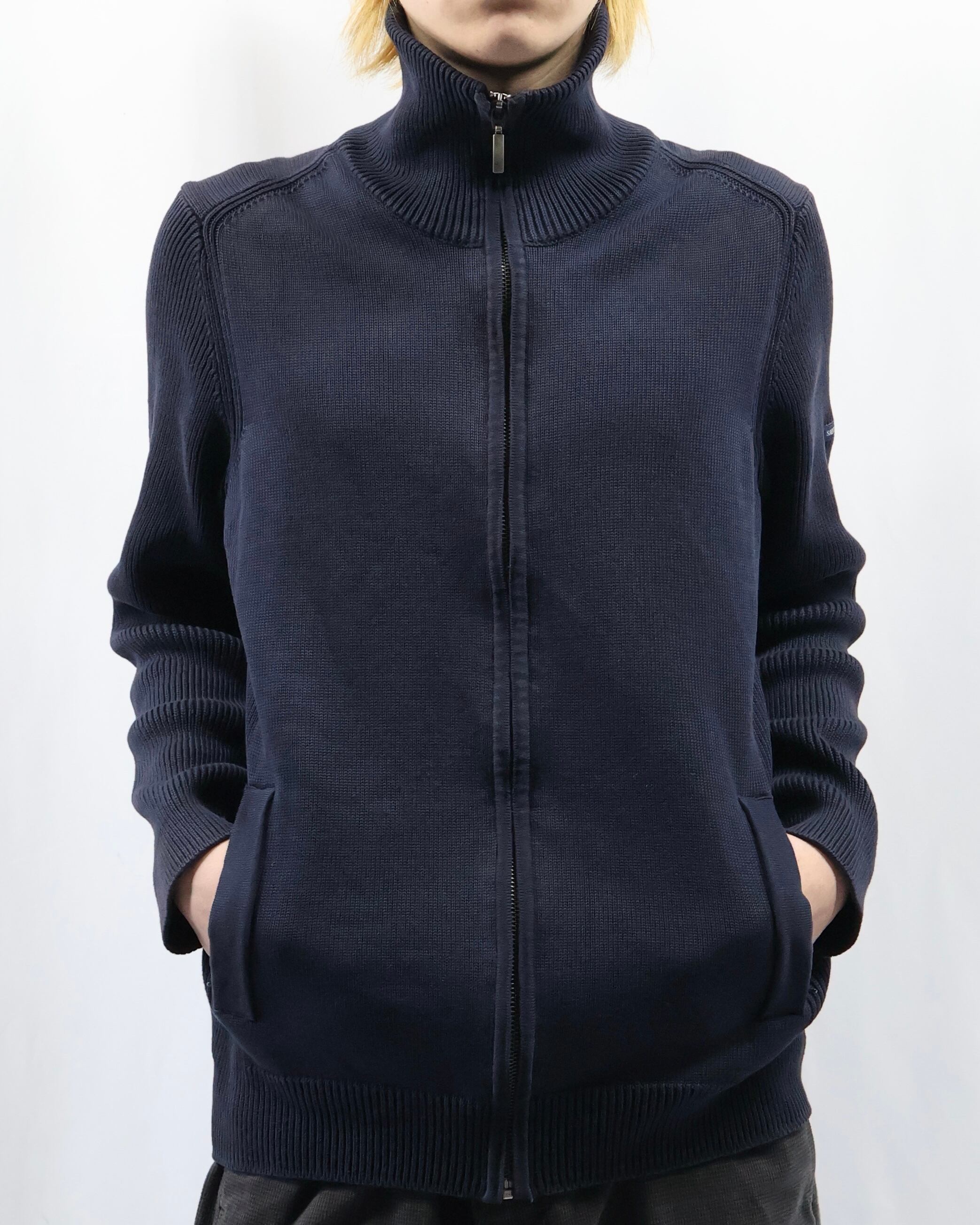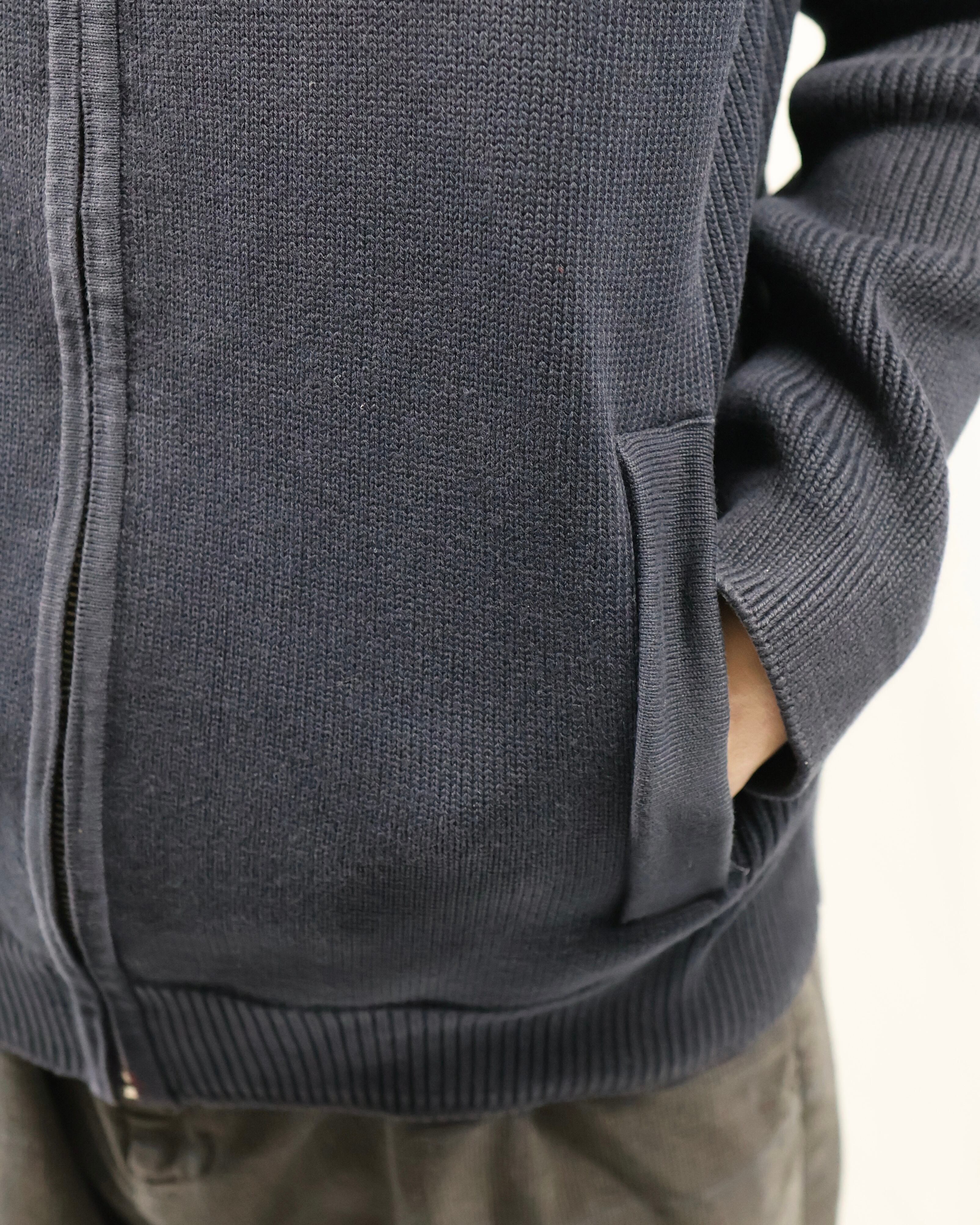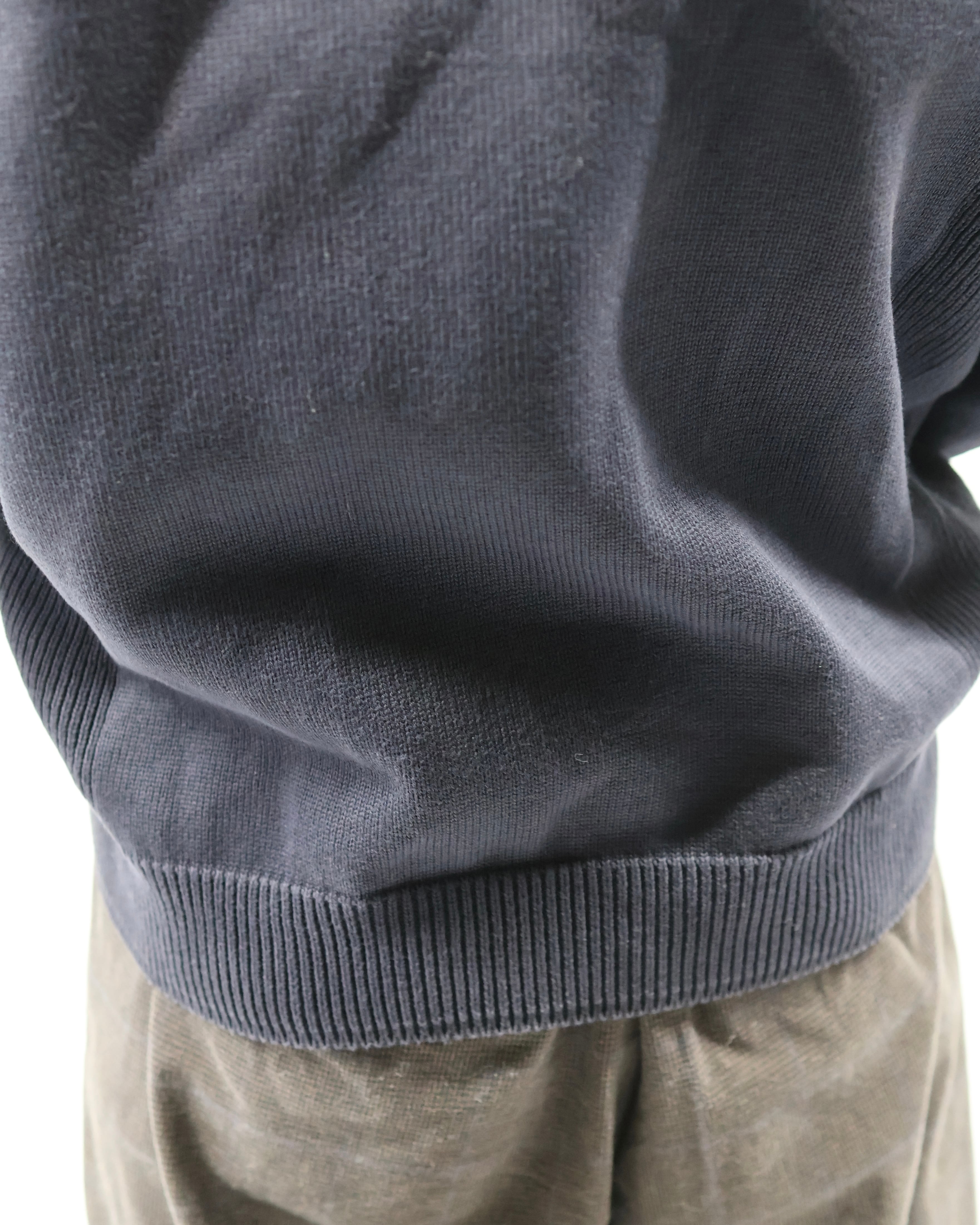 上品な風合いで仕立ての良いドライバーズニット。最近色々なブランドがドライバーズニットを出していますが、デザイナーズのようなディテールで一枚の説得力もあり、タイトなサイジングのためインナーに入れてネックの部分を見せるだけでも充分に存在感を発揮します。ネイビーの色合いもよく、黒やグレーとも違う、クラシックながらもすこし抜け感を与えてくれるようなカラーで色に挑戦したい方におすすめです。